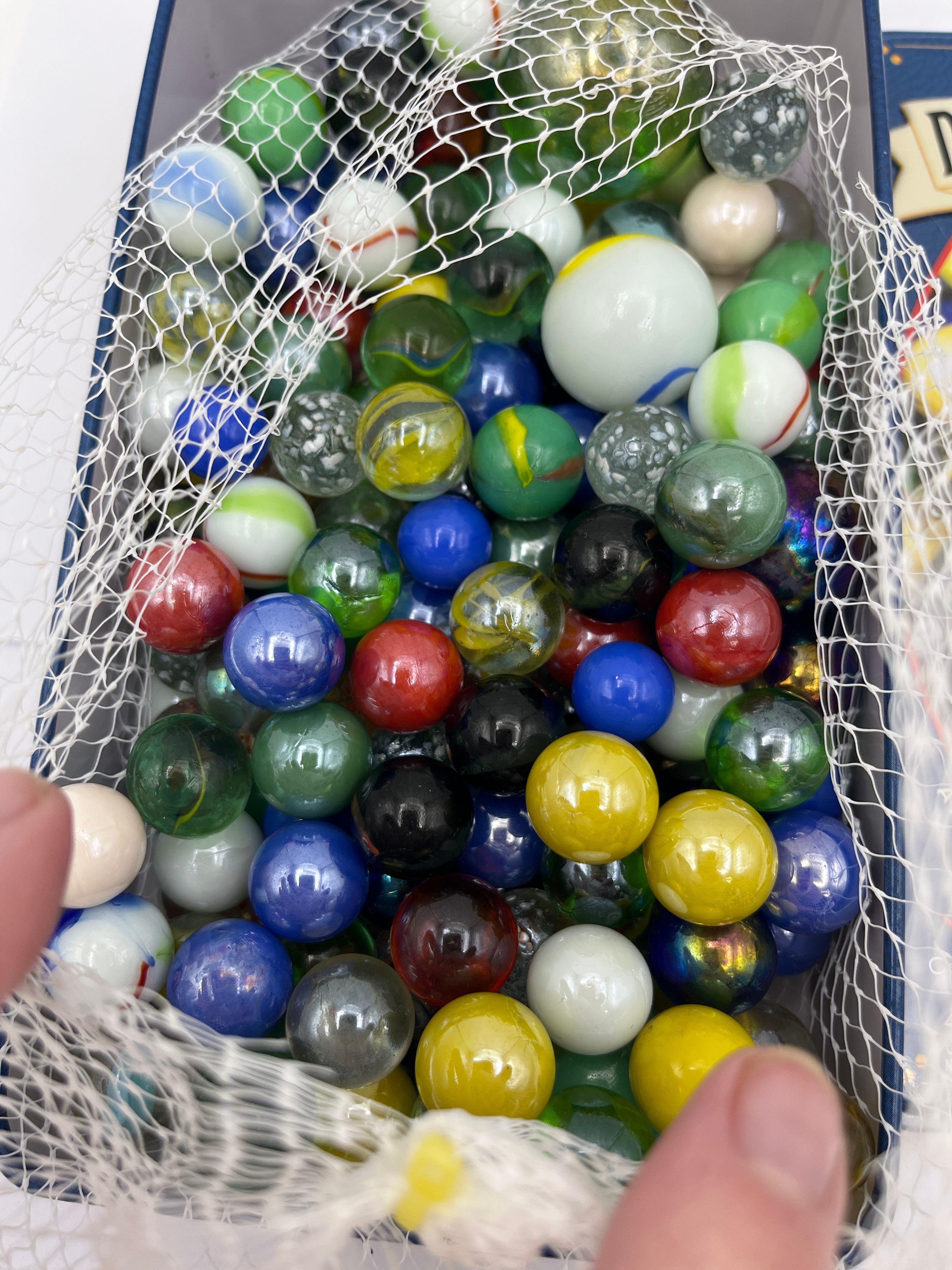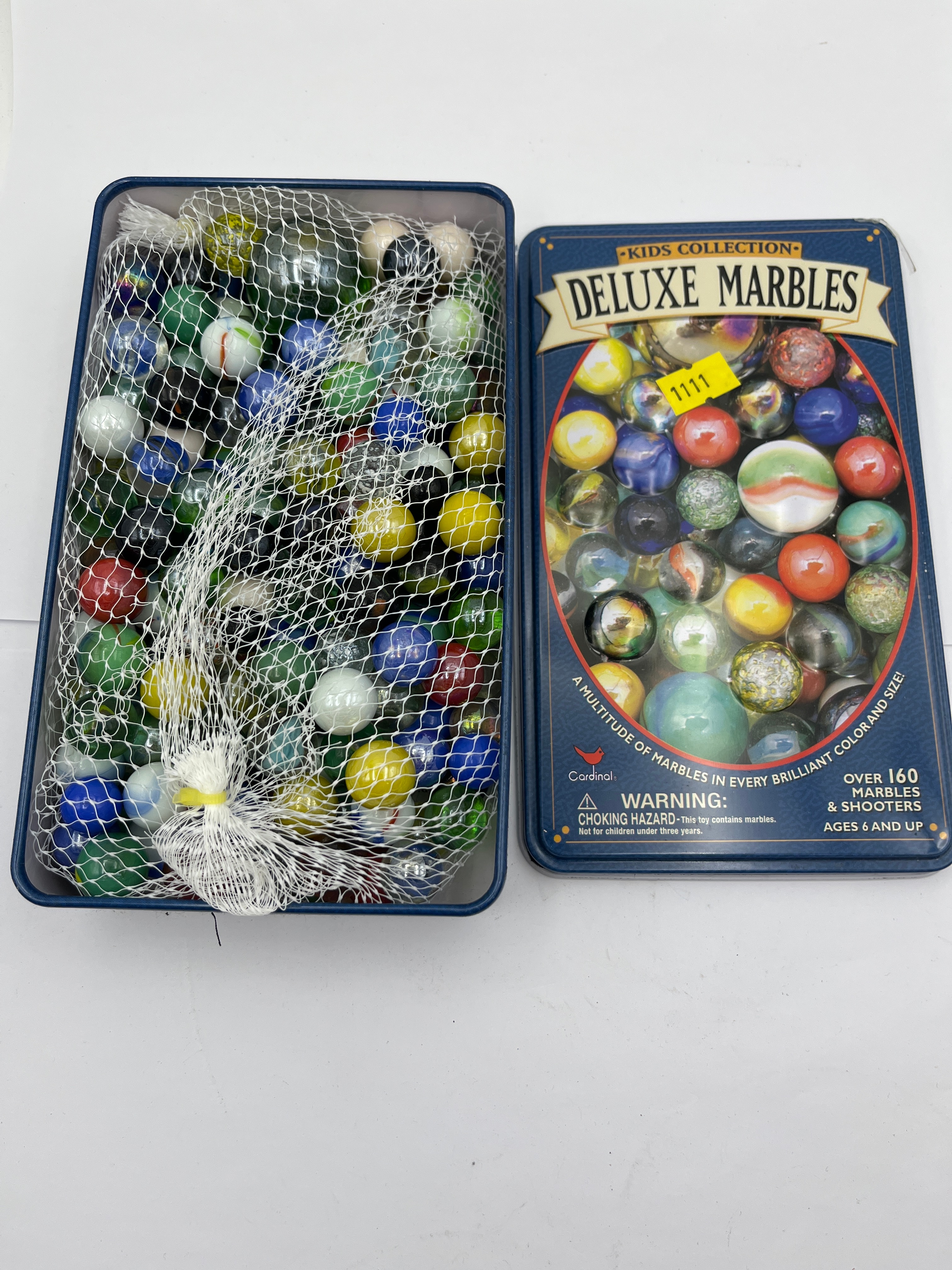 A 2001 Cardinal Kids Collection Deluxe Marbles set, contained within a rectangular metal tin with a pictorial lid. The lid prominently features the brand ‘Cardinal,’ descriptive text ‘A MULTITUDE OF MARBLES IN EVERY BRILLIANT COLOR AND SIZE!’, a ‘WARNING: CHOKING HAZARD’ notice, and indicates ‘OVER 160 MARBLES & SHOOTERS’ for ‘AGES 6 AND UP.’ Inside the tin, a white mesh bag is filled with numerous multi-colored glass marbles of varying sizes and patterns.