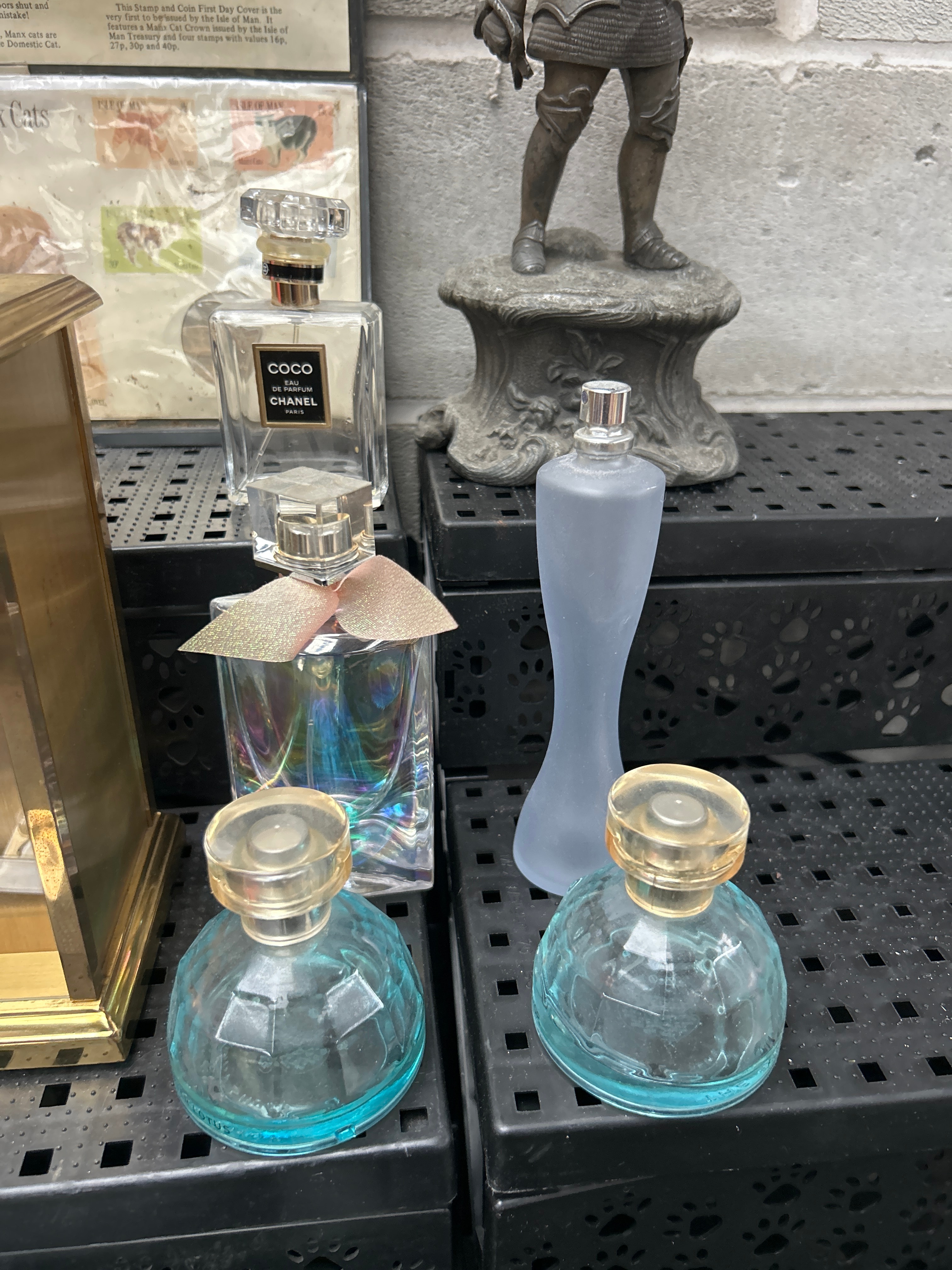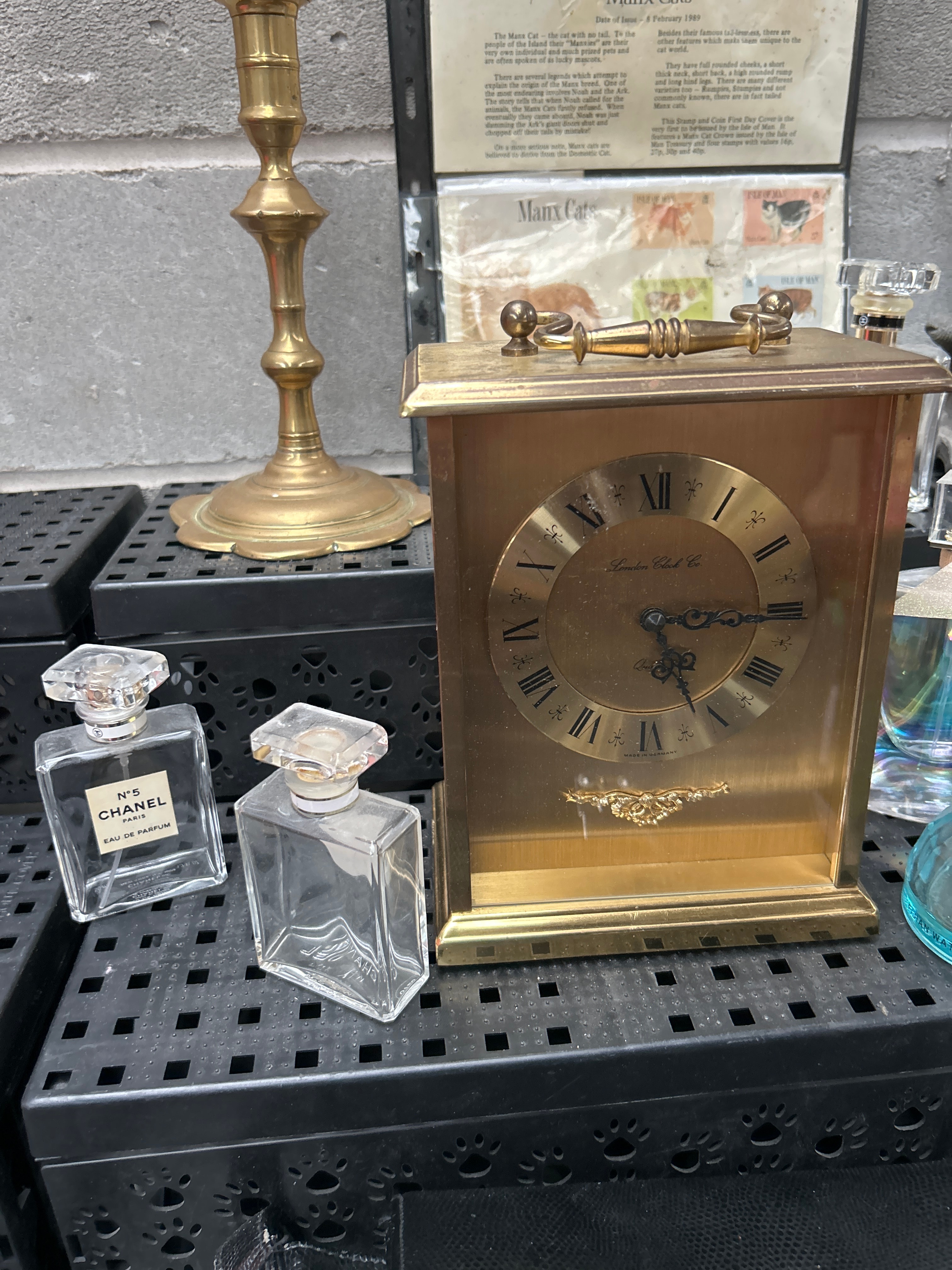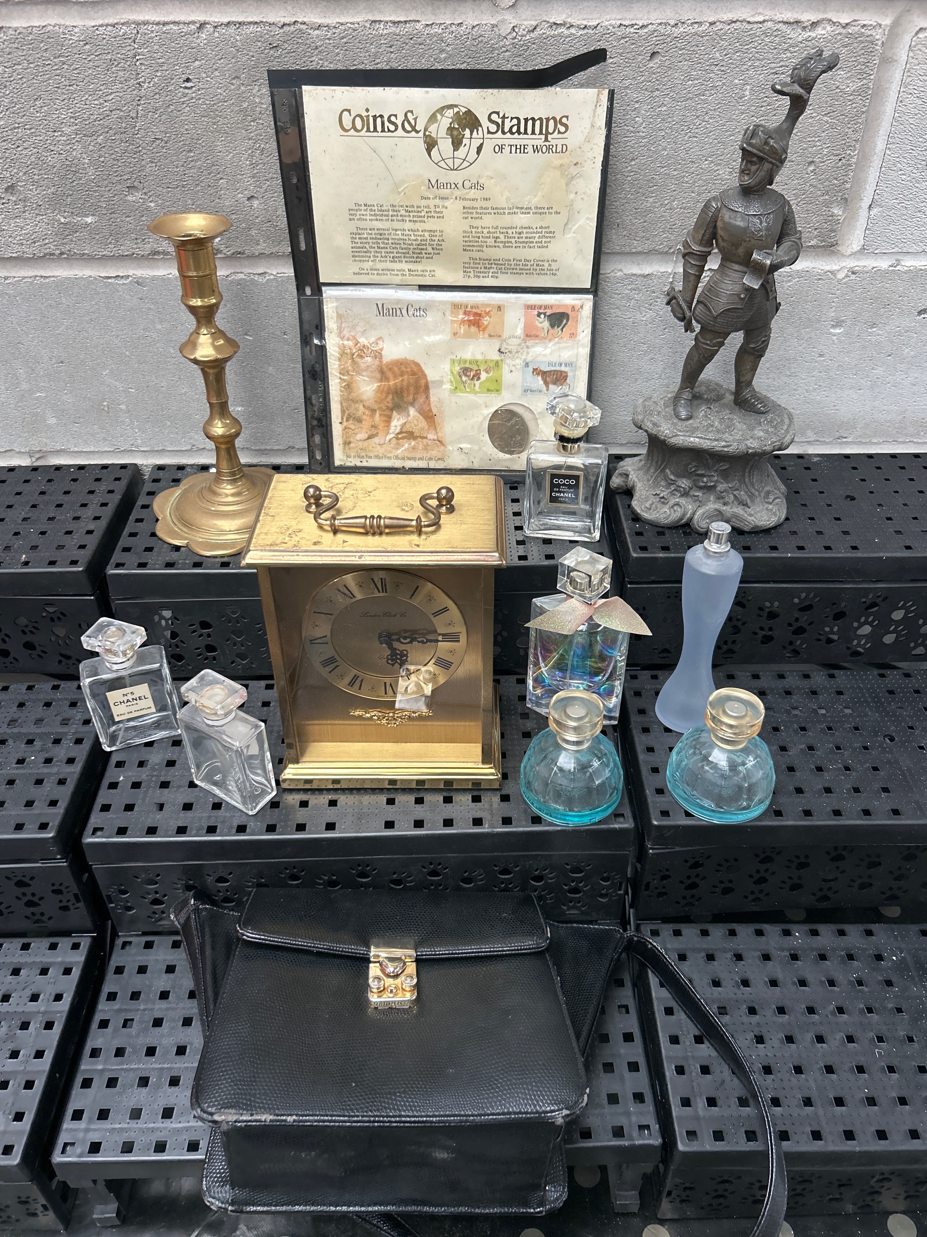 A diverse lot featuring a gilt-metal carriage clock by the London Clock Company, with a Roman numeral dial. Accompanying the clock is a brass candlestick. Also included is a patinated bronze or brass-toned figurine depicting a medieval-style soldier. At the rear, an album page titled “Coins & Stamps of the World,” specifically “Manx Cats,” displays stamps and a coin from the Isle of Man, with a visible “Date of Issue – 8 February 1989.” The lot further comprises a collection of glass perfume bottles, including clear examples from “CHANEL N°5” and “COCO CHANEL,” an iridescent bottle, a frosted blue curvilinear bottle, and two smaller teal-tinted bottles. A black structured handbag, likely leather or faux leather, with a gold-toned clasp closure, completes the lot.