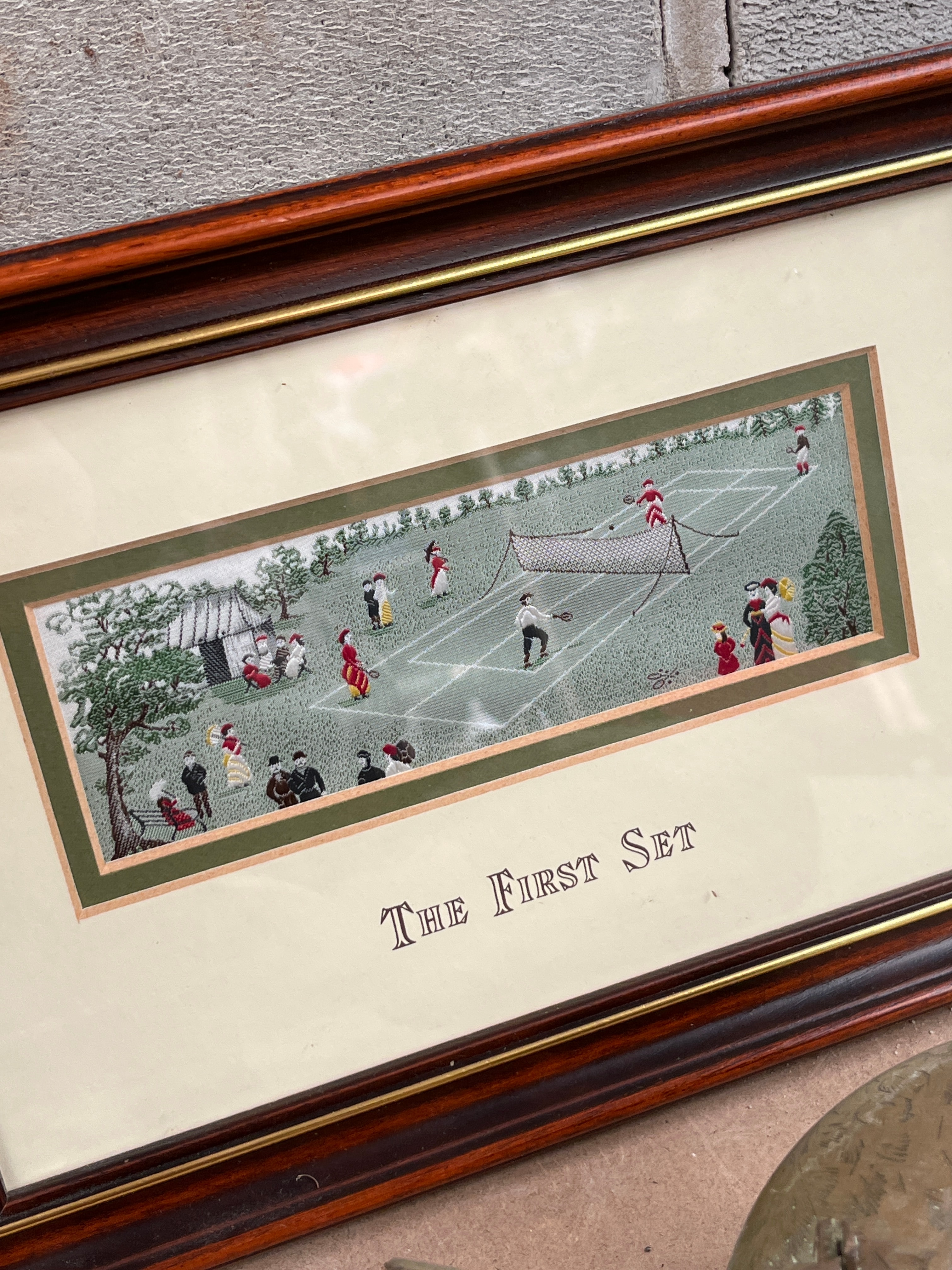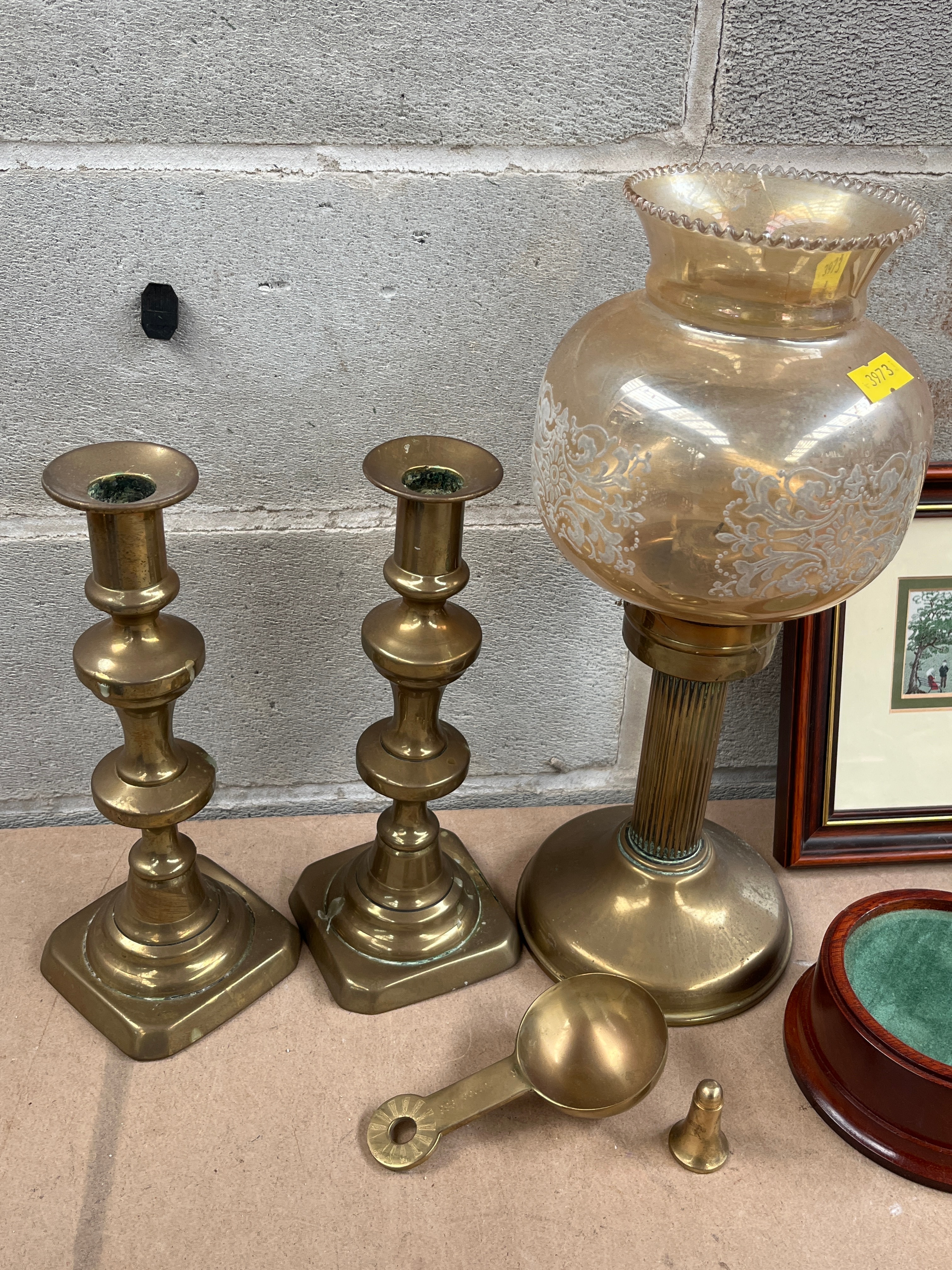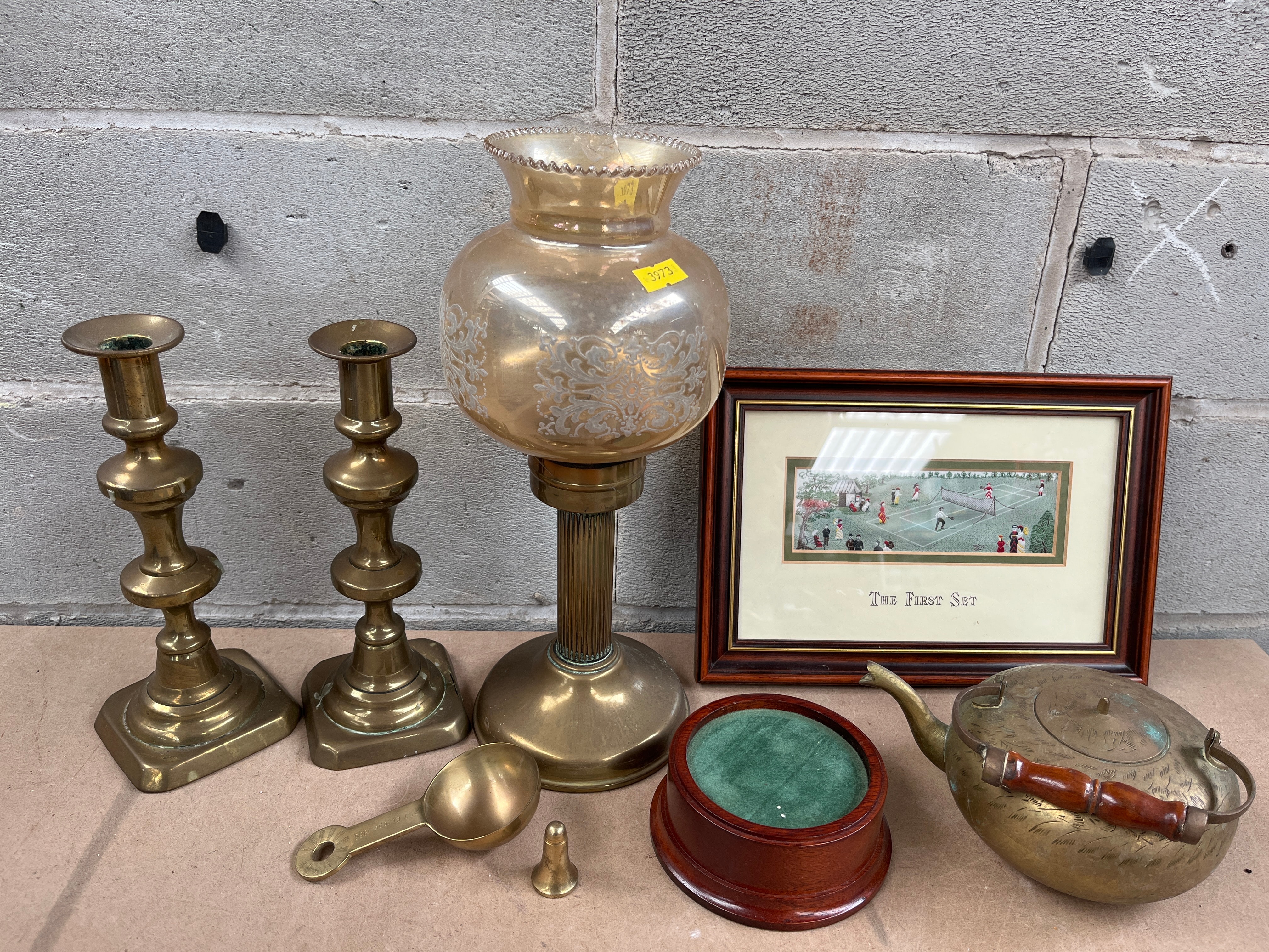 A vintage brass electric table lamp, approximately 12 inches tall, featuring a fluted base supporting a frosted amber glass globe with an etched foliate design. The globe bears a yellow sticker marked ‘9973’. Accompanied by a pair of multi-tiered brass candlesticks with square bases, a heavily tarnished brass kettle with a wooden handle, a small brass scoop, a tiny bell-shaped brass object, a circular polished wooden stand with a recessed green velvet interior, and a framed artwork. The artwork, set in a dark wooden frame with a gold accent and an off-white mat, depicts an outdoor tennis scene with numerous figures in period dress, clearly titled “THE FIRST SET” below the image.