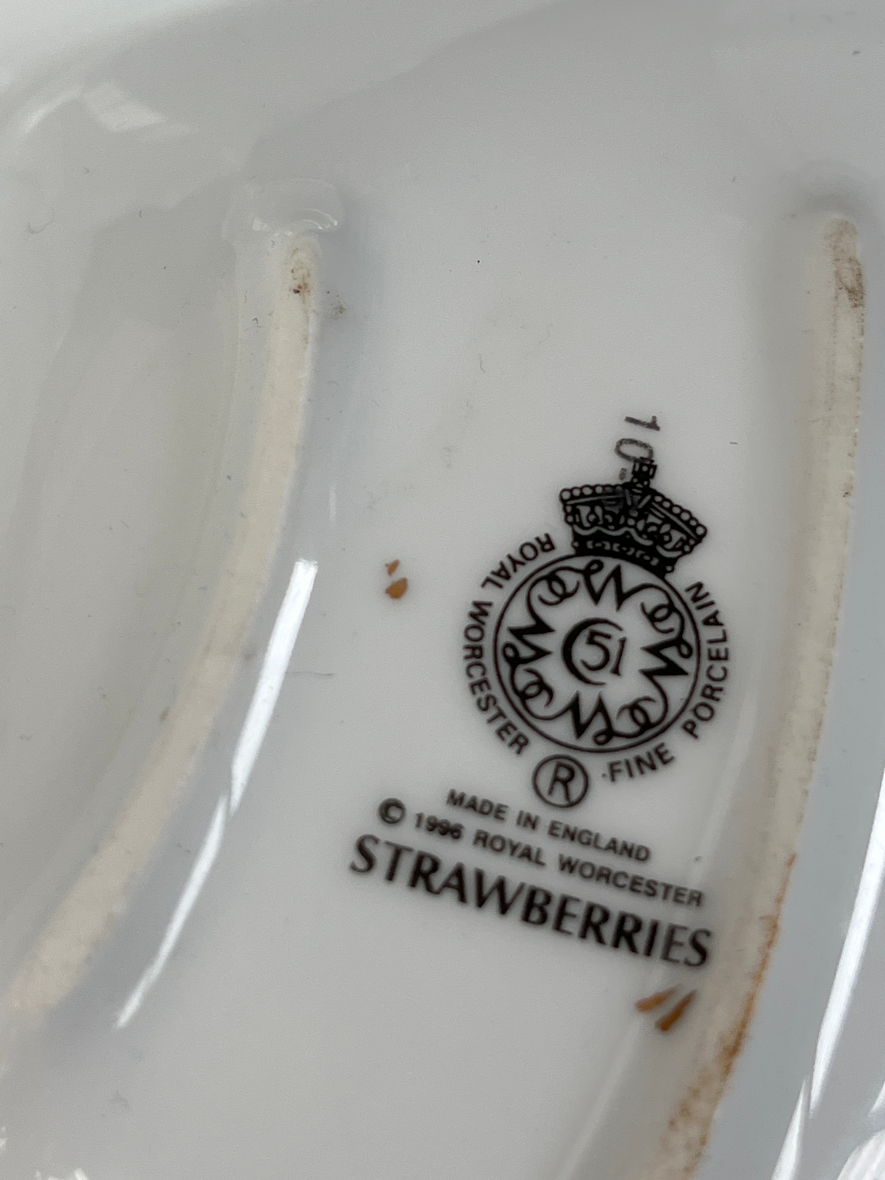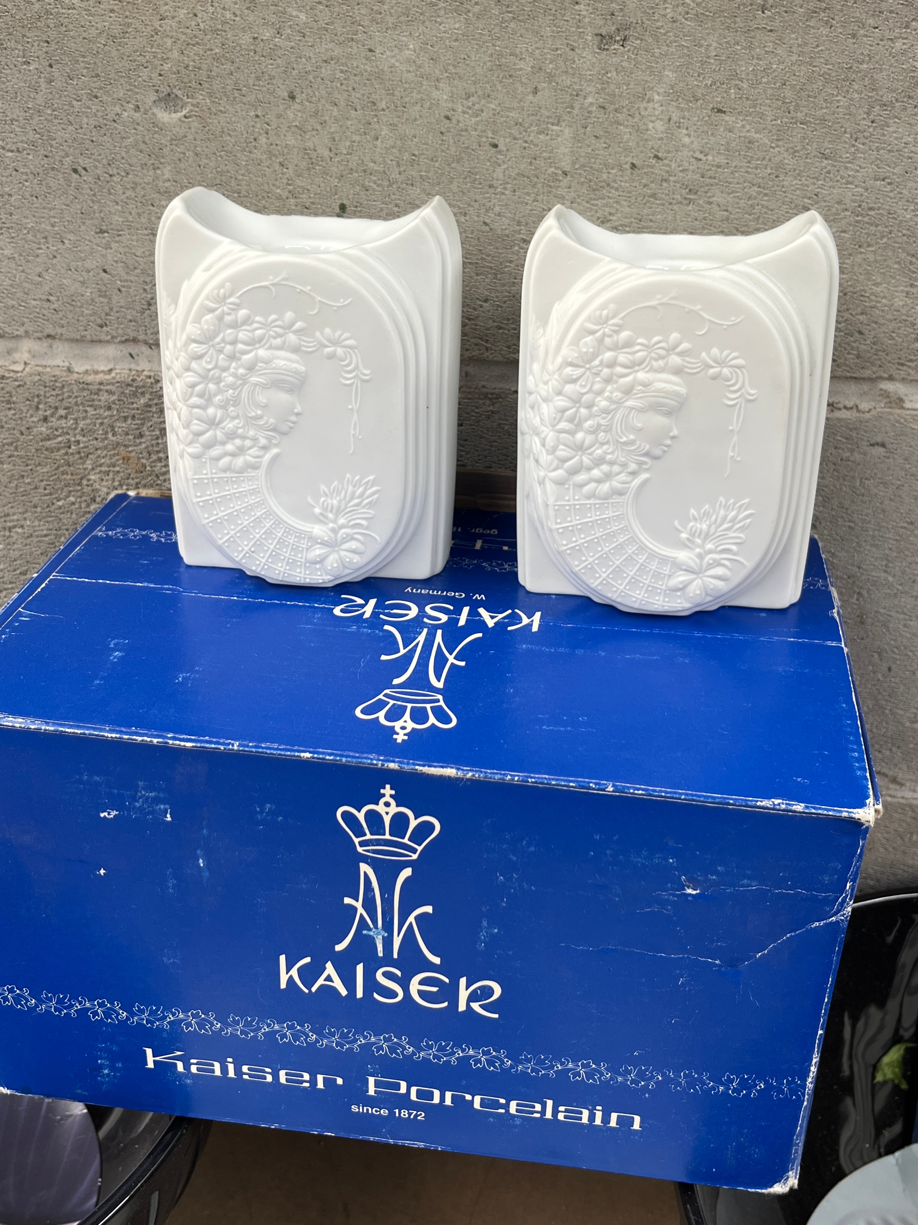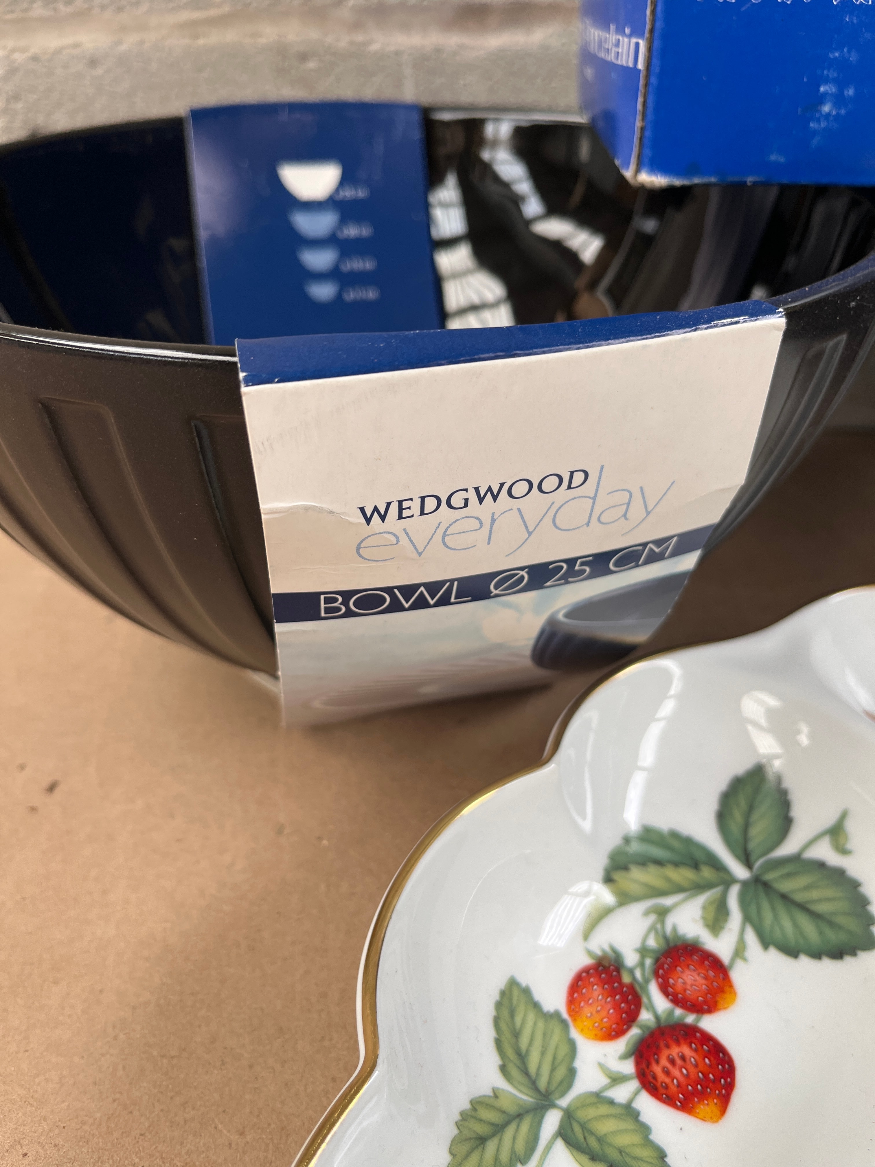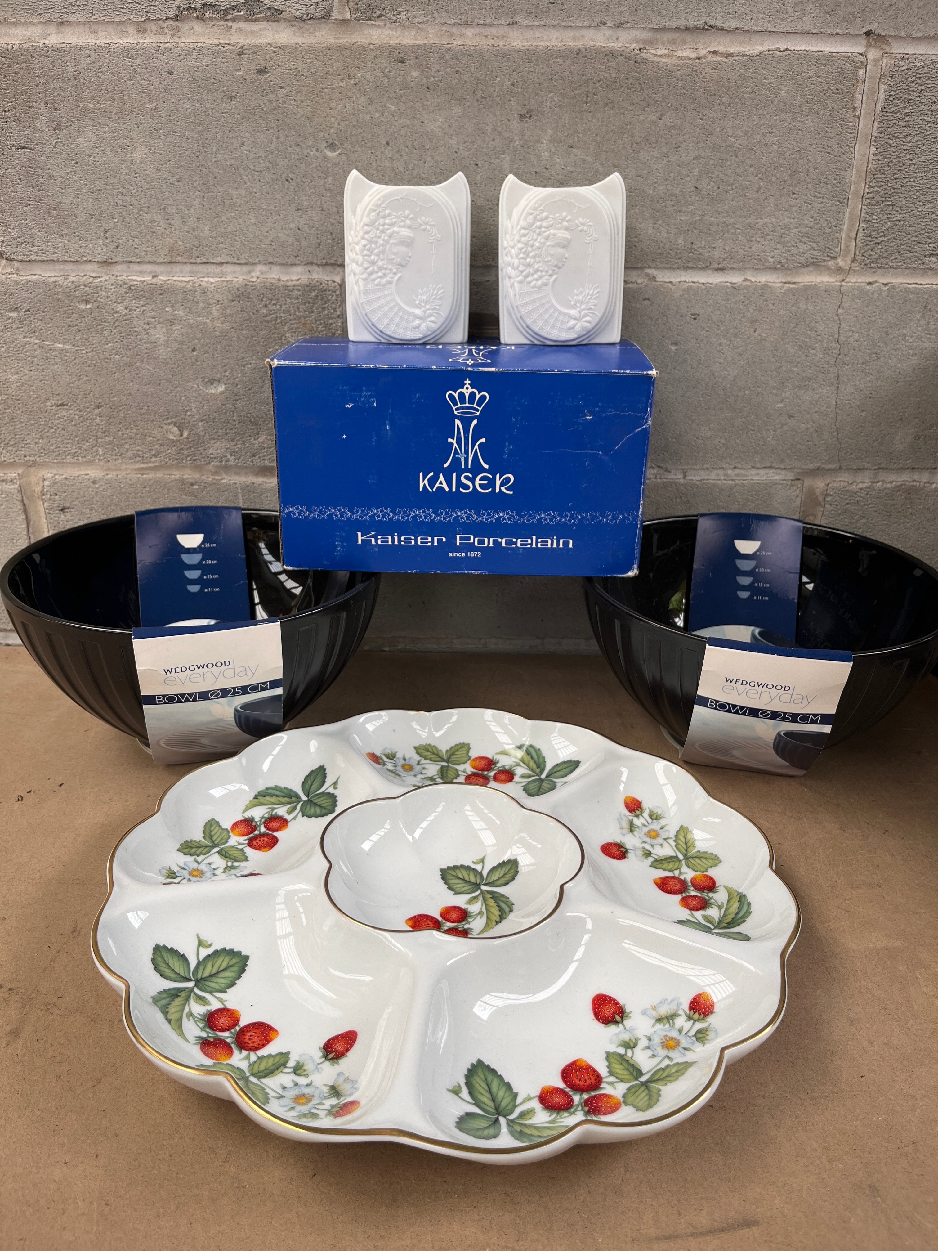 A collection of assorted porcelain and ceramic wares. The lot features a Royal Worcester fine porcelain multi-compartment serving dish in the ‘Strawberries’ pattern, dated 1996. This dish includes a central dip bowl surrounded by four sections, all with scalloped, gold-trimmed edges and vibrant strawberry decoration. Also included is a pair of matte white Kaiser porcelain rectangular vases, each displaying a raised classical profile of a woman’s head. These vases are presented in their original, albeit worn, ‘Kaiser Porcelain since 1872’ box, which bears a ‘W. Germany’ mark indicating pre-1990 manufacture. Completing the lot are two Wedgwood ‘everyday’ ceramic bowls, 25 cm in diameter, in black with a ribbed exterior, retaining their original tags.