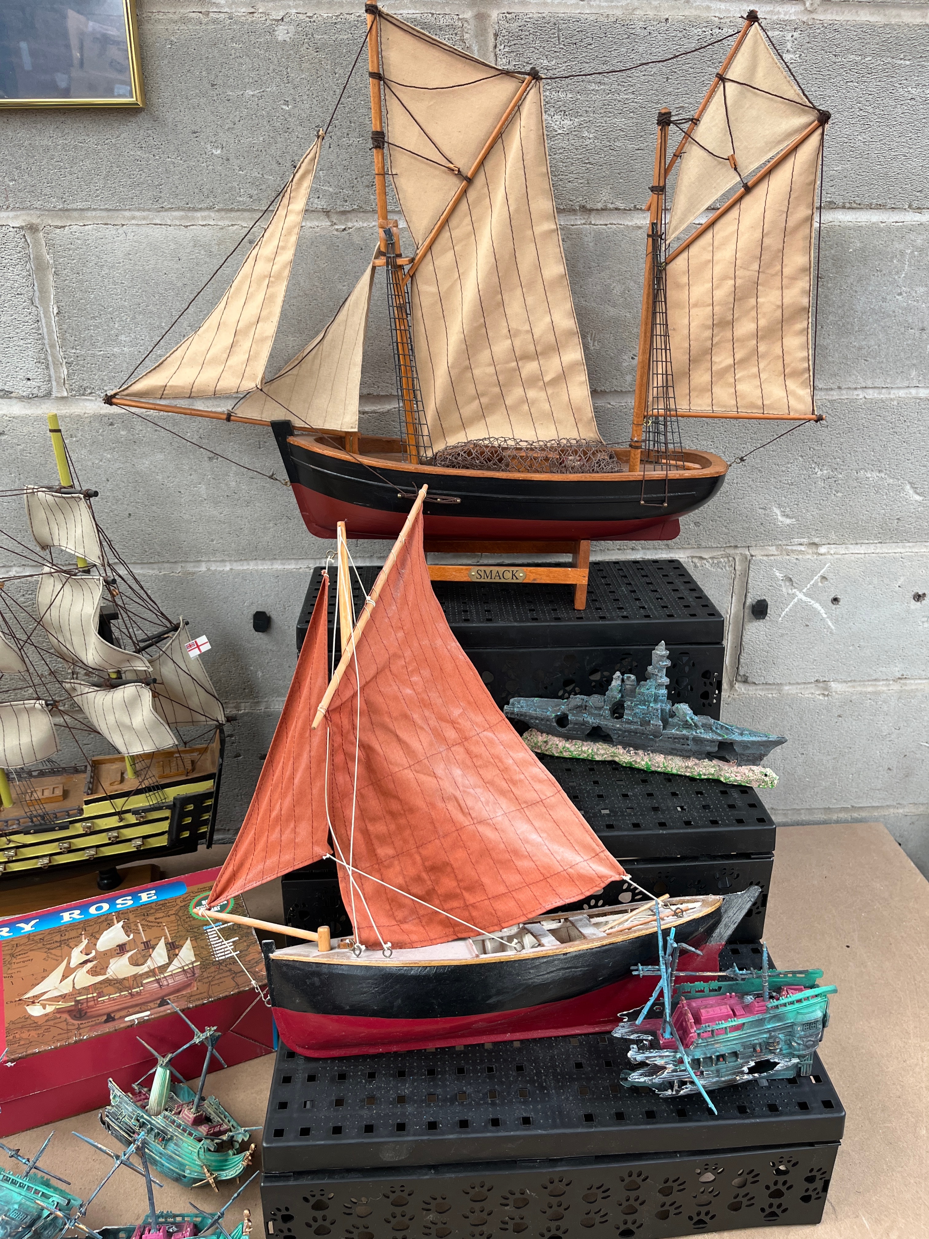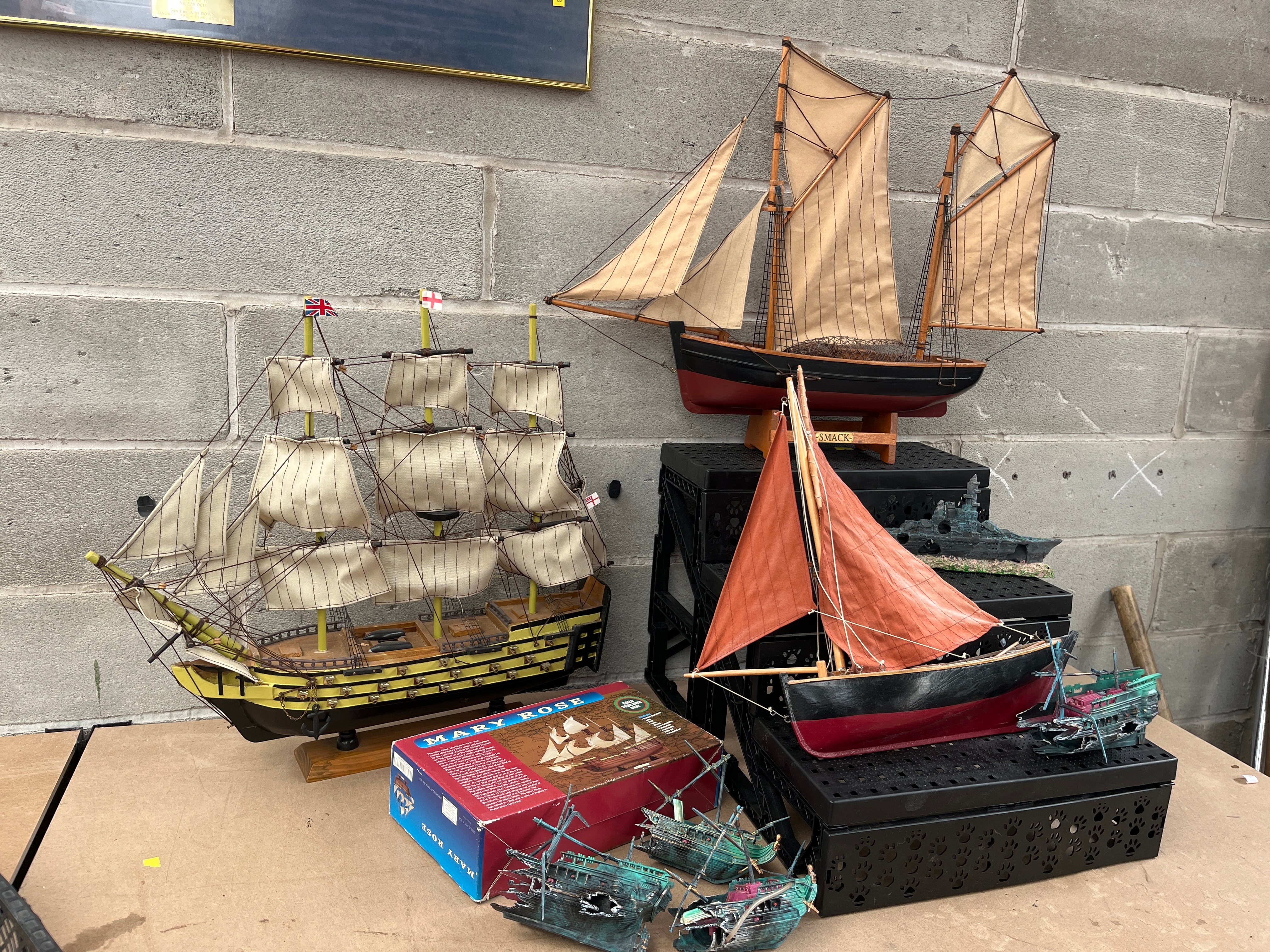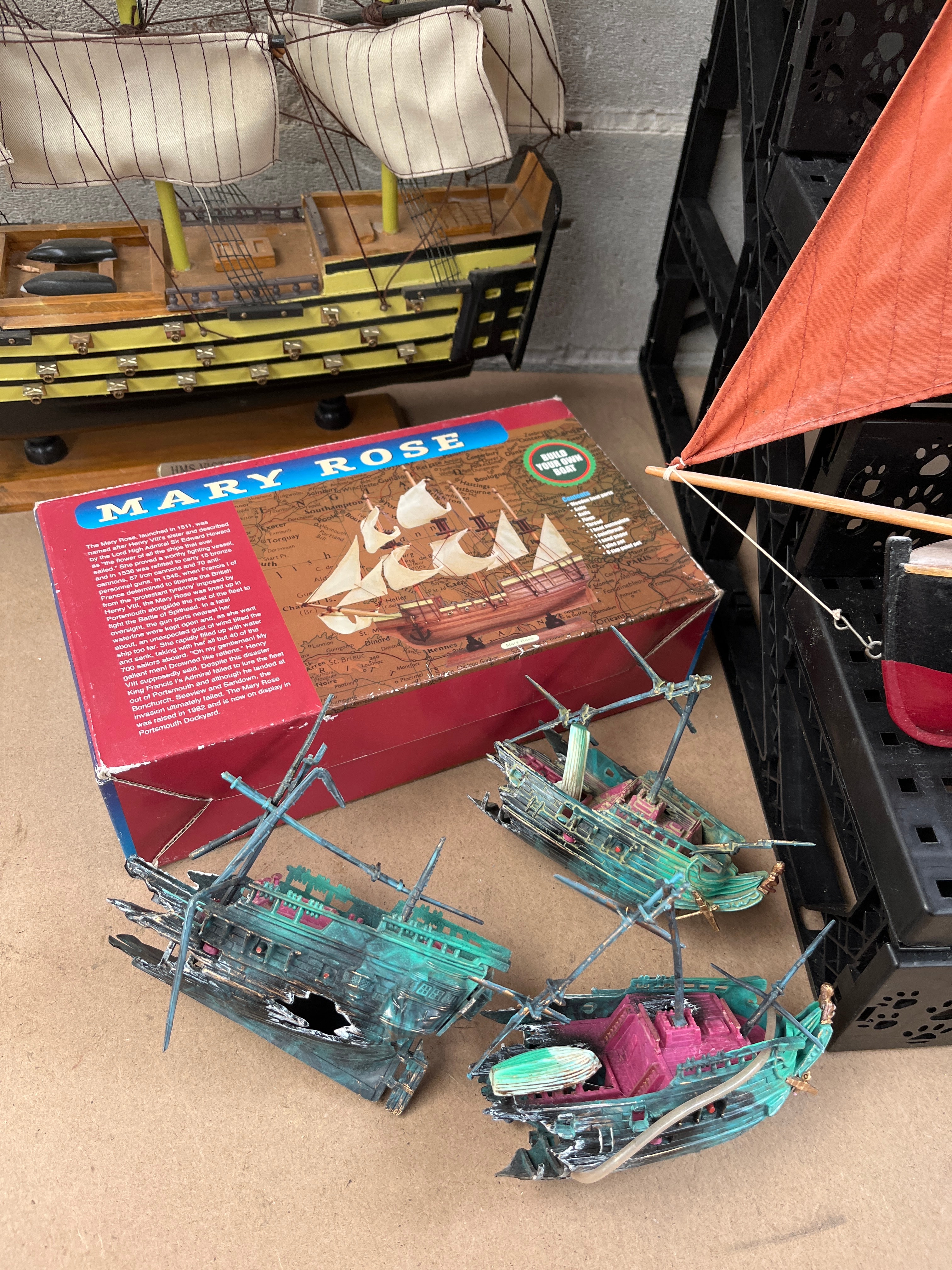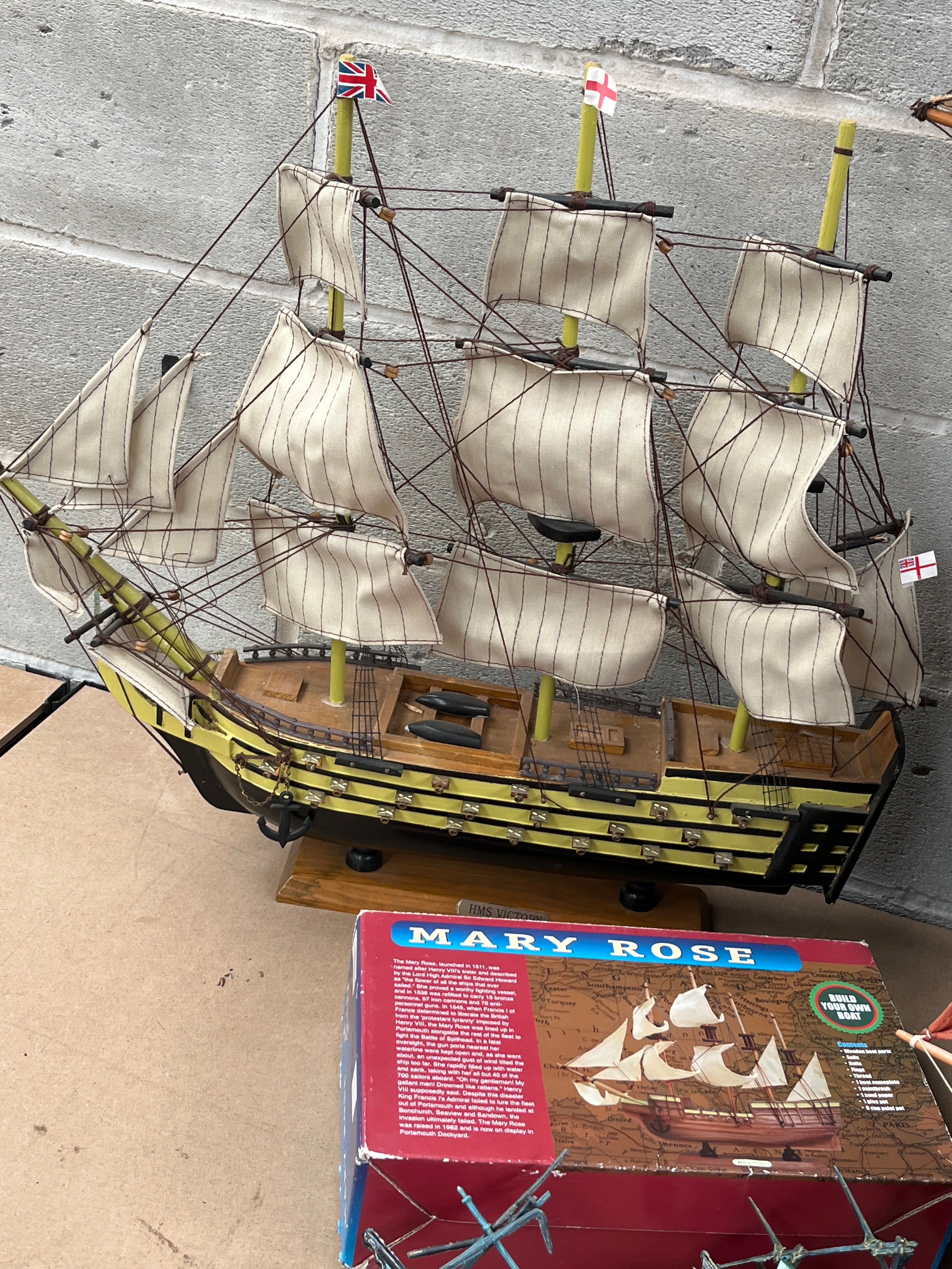 A diverse collection of model ships, primarily constructed from wood, fabric, and various other materials. The centerpiece is a large, fully rigged sailing warship model, identified by partially visible text on its stand as “HMS VICTORY,” adorned with British flags (Union Jack and White Ensign), and featuring a distinctive yellow and black hull with cream-colored sails. Also included are two smaller sailing vessel models: one with naturalistic brown sails on a stand marked “SMACK,” and another with a prominent reddish-orange sail. A dark grey model of a modern naval warship, resembling a battleship or cruiser, is also present. Additionally, several very small, highly distressed models depicting shipwrecks, characterized by their teal and pink accents and broken structures, are arrayed on the table. A red cardboard kit box, prominently labeled “MARY ROSE” and indicating a “BUILD YOUR OWN” model, details the history of the Tudor warship, which sank in 1545 and was recovered in 1982.