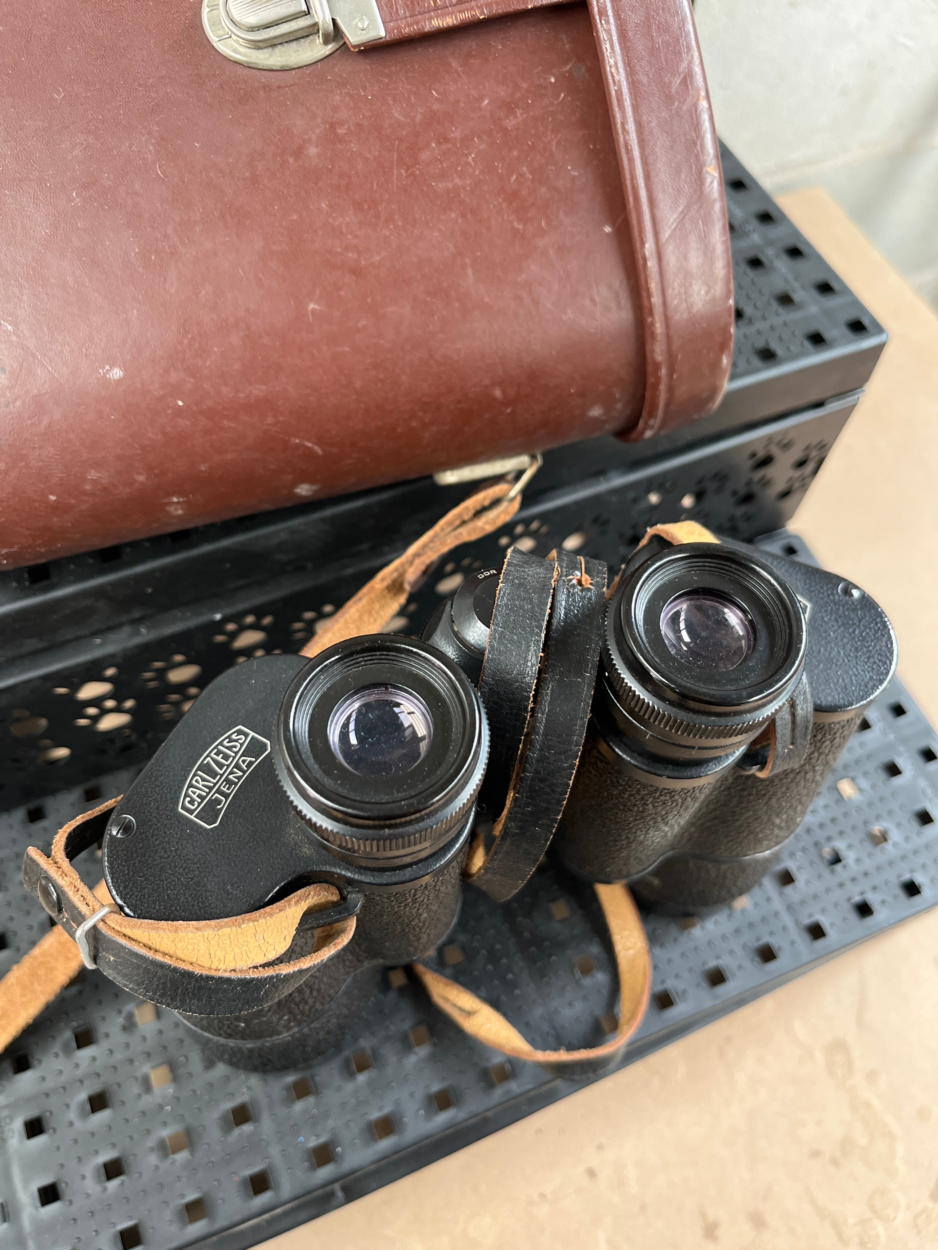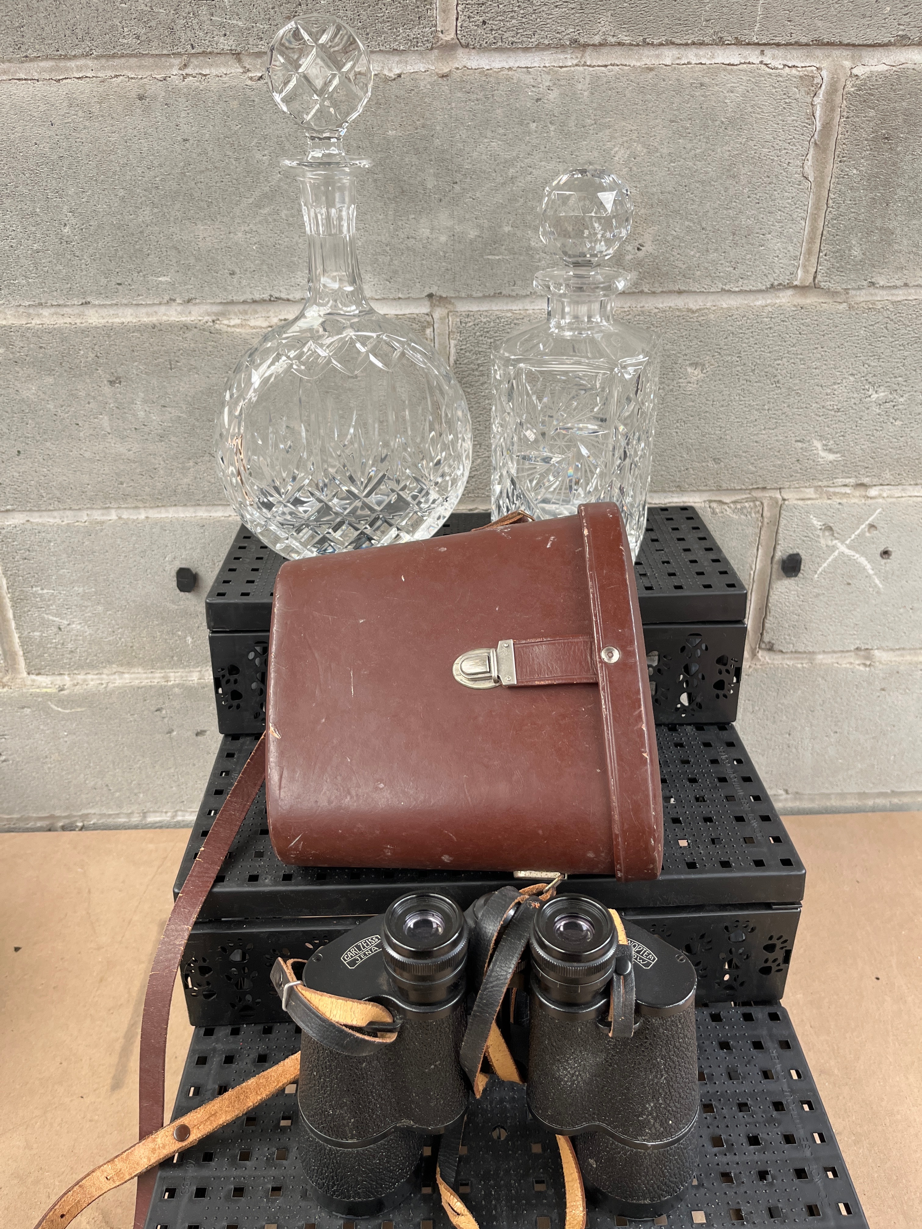 A pair of vintage black Carl Zeiss Jena binoculars, marked “CARL ZEISS JENA” on the left eyepiece housing. They are equipped with a worn brown leather neck strap and housed in a conforming brown leather carrying case with a metal clasp. Accompanying these are two clear cut-glass or crystal decanters, one globular and one rectangular. Both decanters feature traditional faceted patterns and matching faceted stoppers.