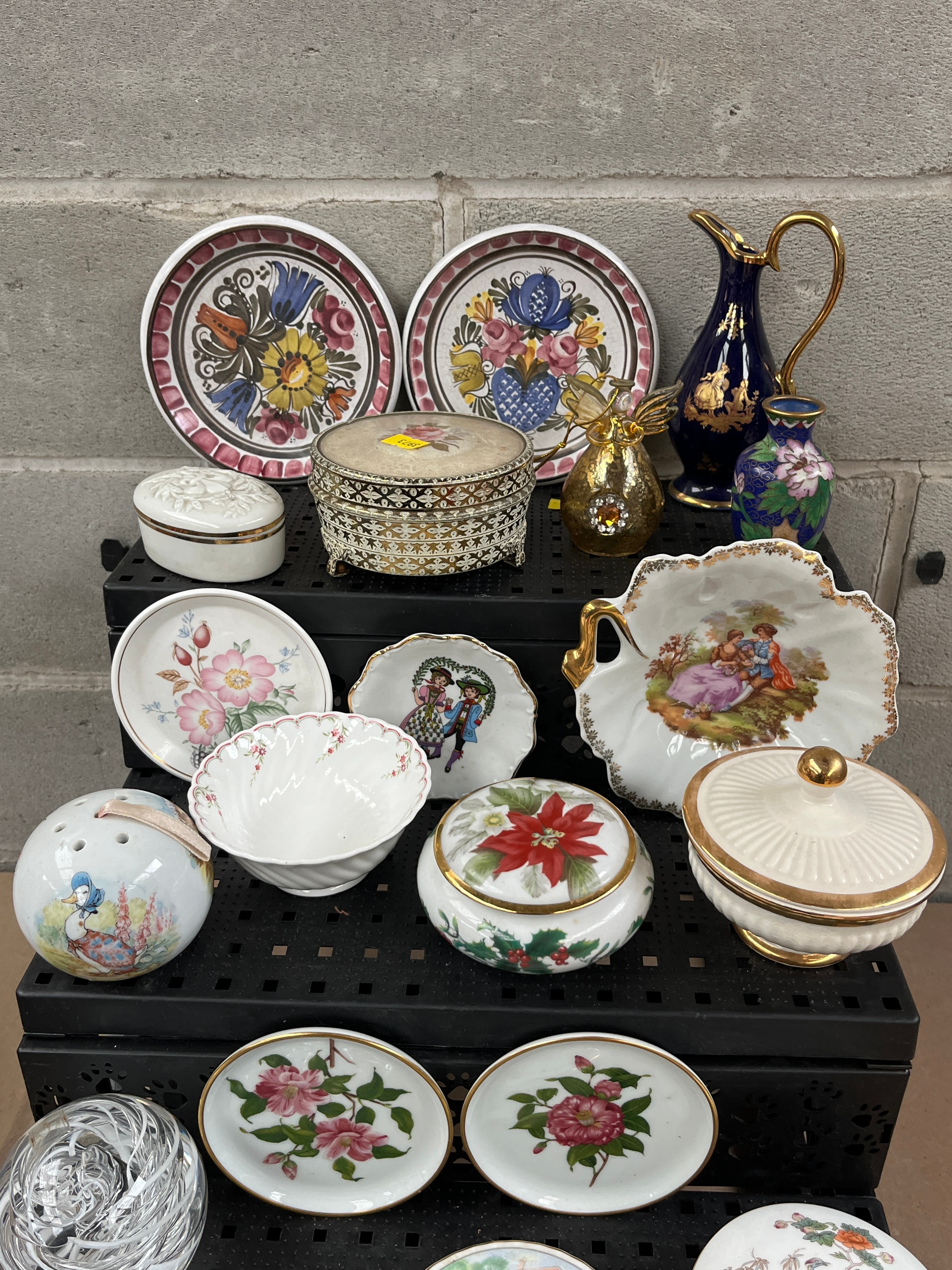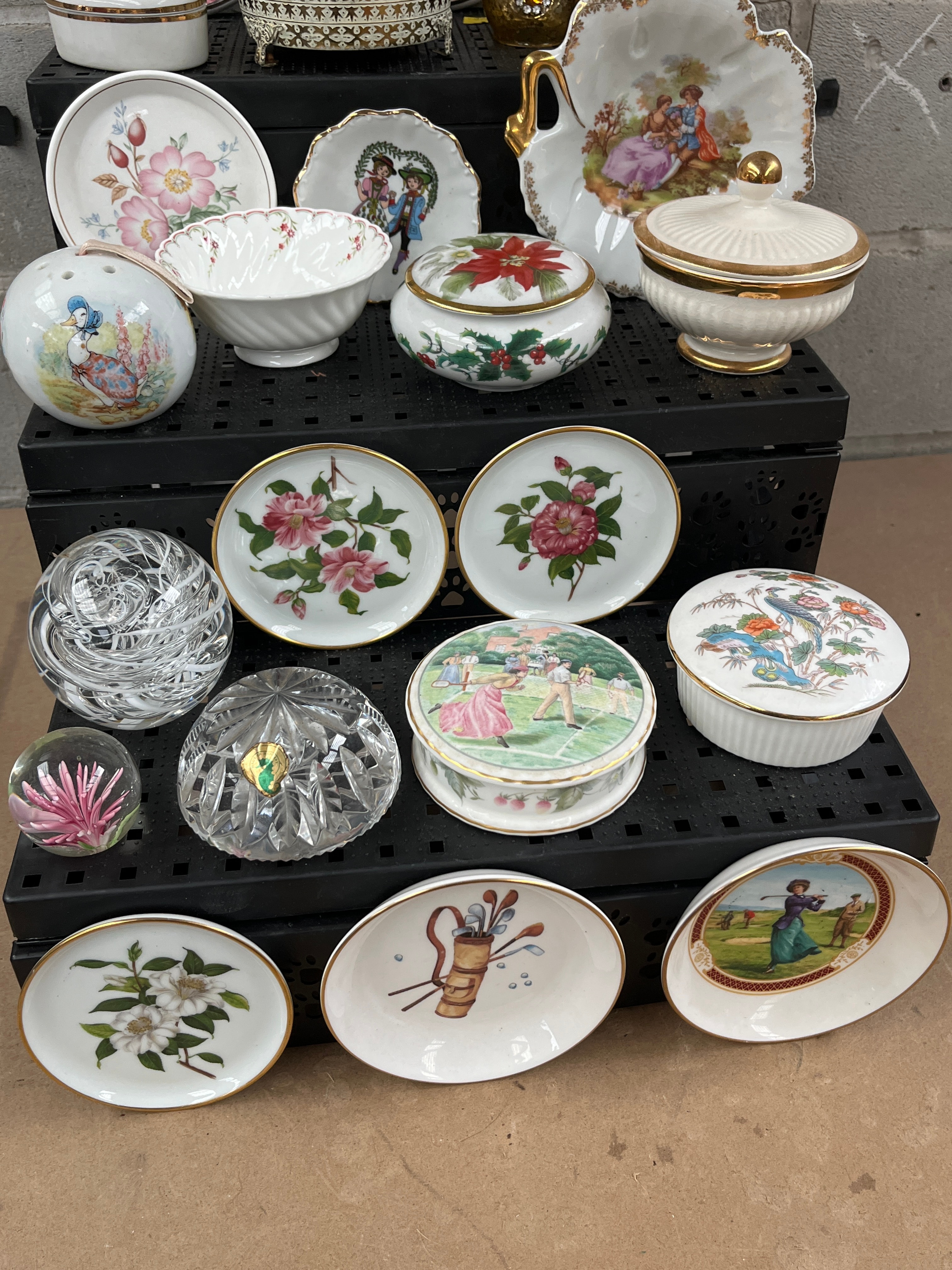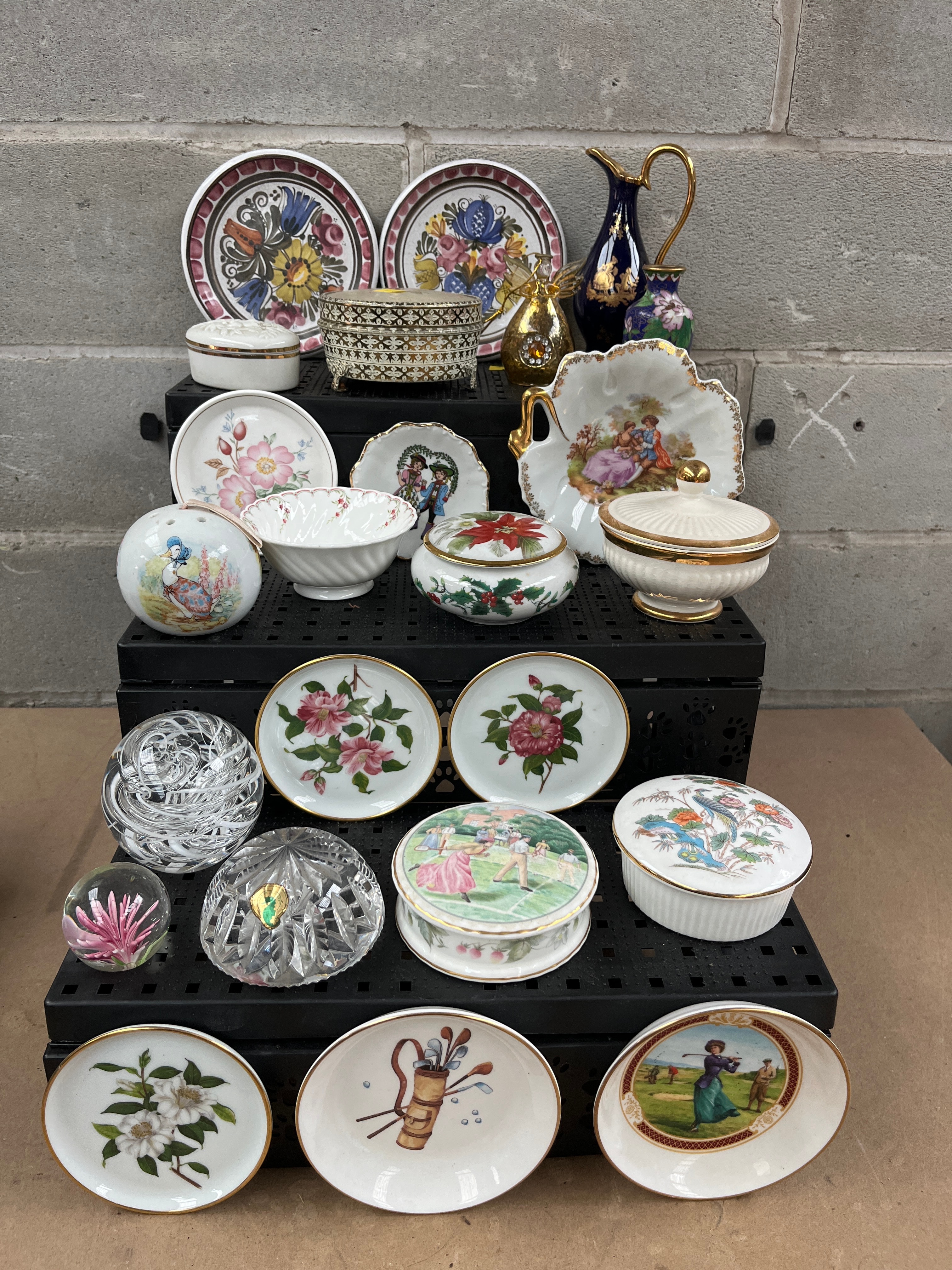 This collection comprises numerous decorative items, predominantly crafted from porcelain or ceramic, alongside a few clear glass pieces and a small gilt metal pitcher. The assemblage includes assorted plates, lidded boxes, small bowls, decorative spheres, a pitcher, and a vase, all showcasing varied decorative styles. Motifs range from traditional folk art patterns on the top plates to intricate floral designs, Rococo-inspired genre scenes featuring couples, and sporting themes such as golf. The aesthetic suggests a late 19th to 20th-century period, with many pieces accented by gold trim. While specific manufacturer’s marks are not discernible on all pieces, the collection includes items consistent with the styles of prominent English manufacturers such as Royal Worcester and Wedgwood, as suggested by market comparables for similar assorted china collections. A small, illegible yellow sticker is visible on one lidded box.