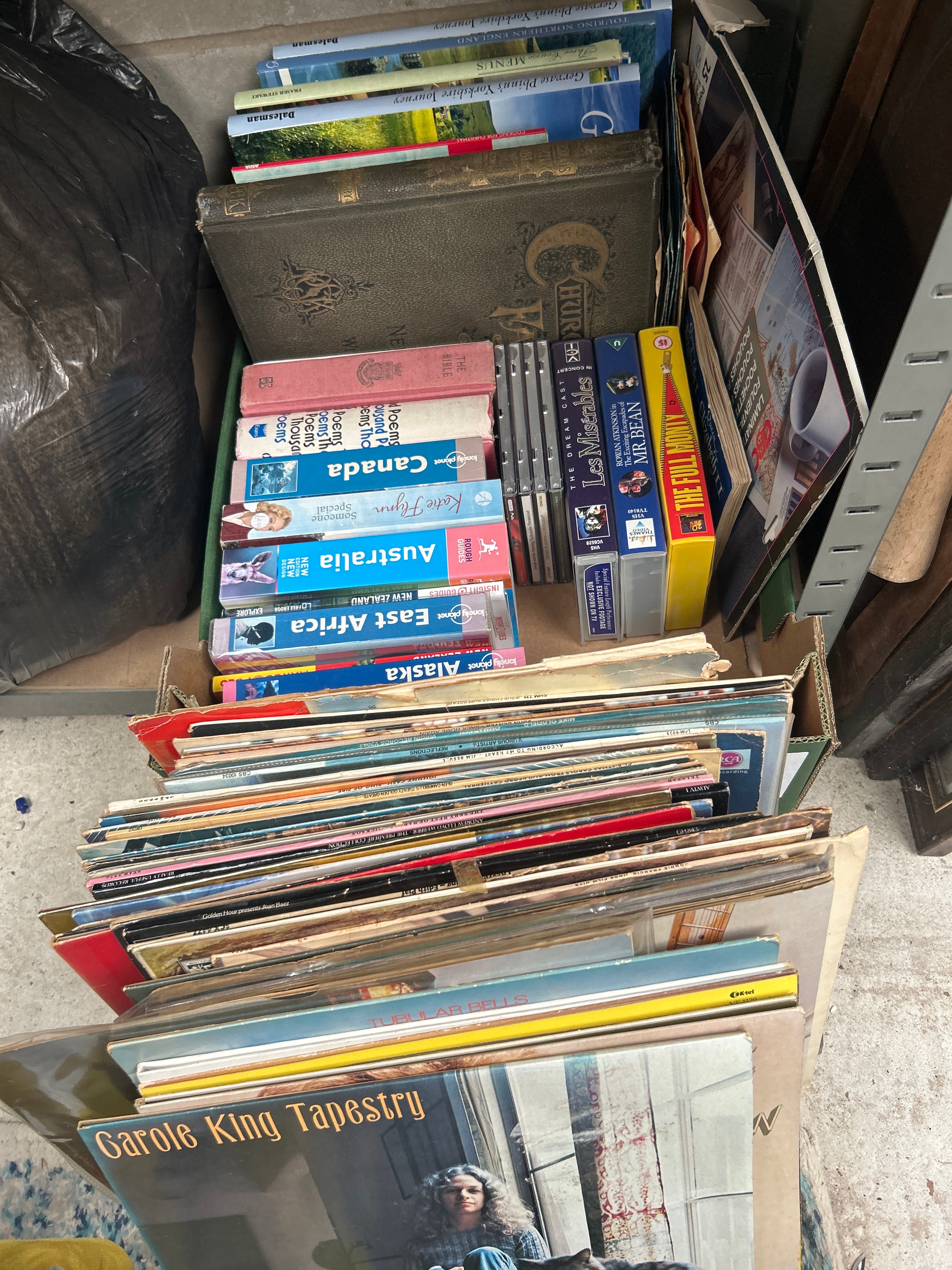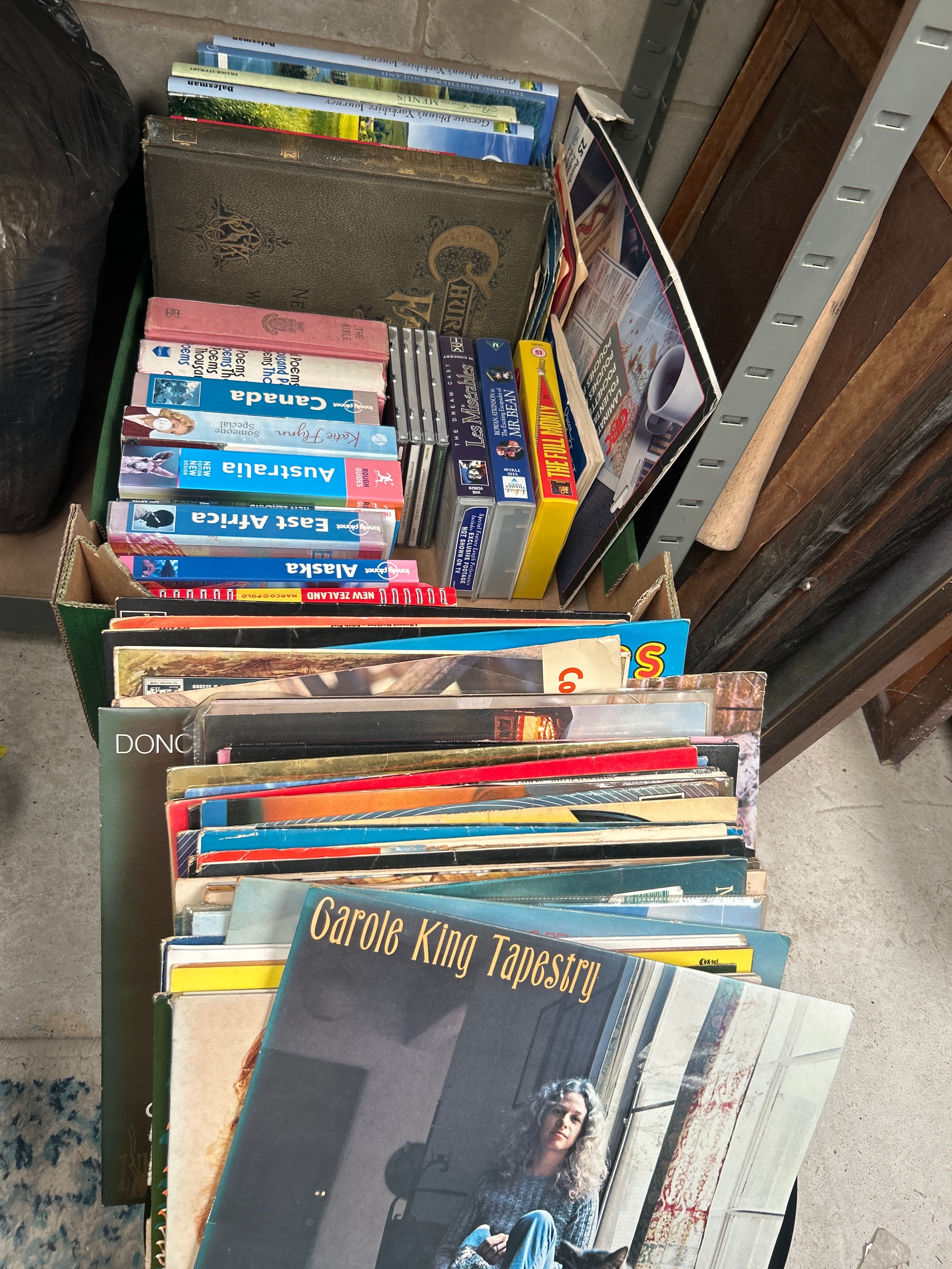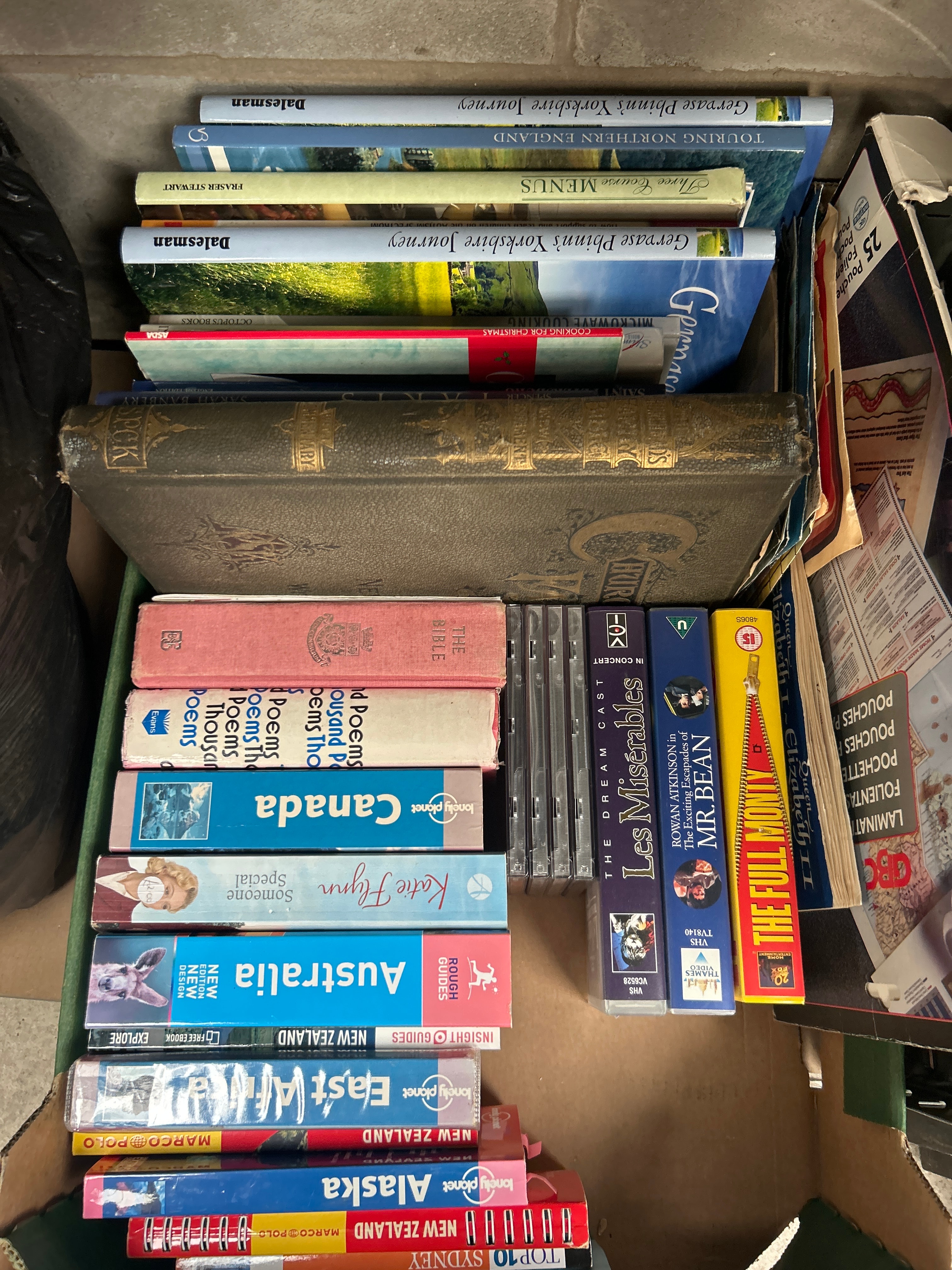 A varied collection of media, primarily featuring books, LPs, CDs, and VHS tapes. The books include modern travel guides such as ‘Canada,’ ‘Australia,’ ‘East Africa,’ ‘Alaska,’ ‘New Zealand,’ and ‘Sydney,’ literary titles including ‘THE BIBLE,’ and regional interest books like ‘Dalesman’ and ‘Gervase Phinn’s Yorkshire Journey.’ LPs include ‘Carole King Tapestry.’ VHS tapes feature titles such as ‘THE FULL MONTY,’ ‘MR BEAN,’ and ‘Les Misérables.’ CDs include one labeled ‘THE DREAM CAST.’ Materials comprise paper, cardboard, plastic, and vinyl.