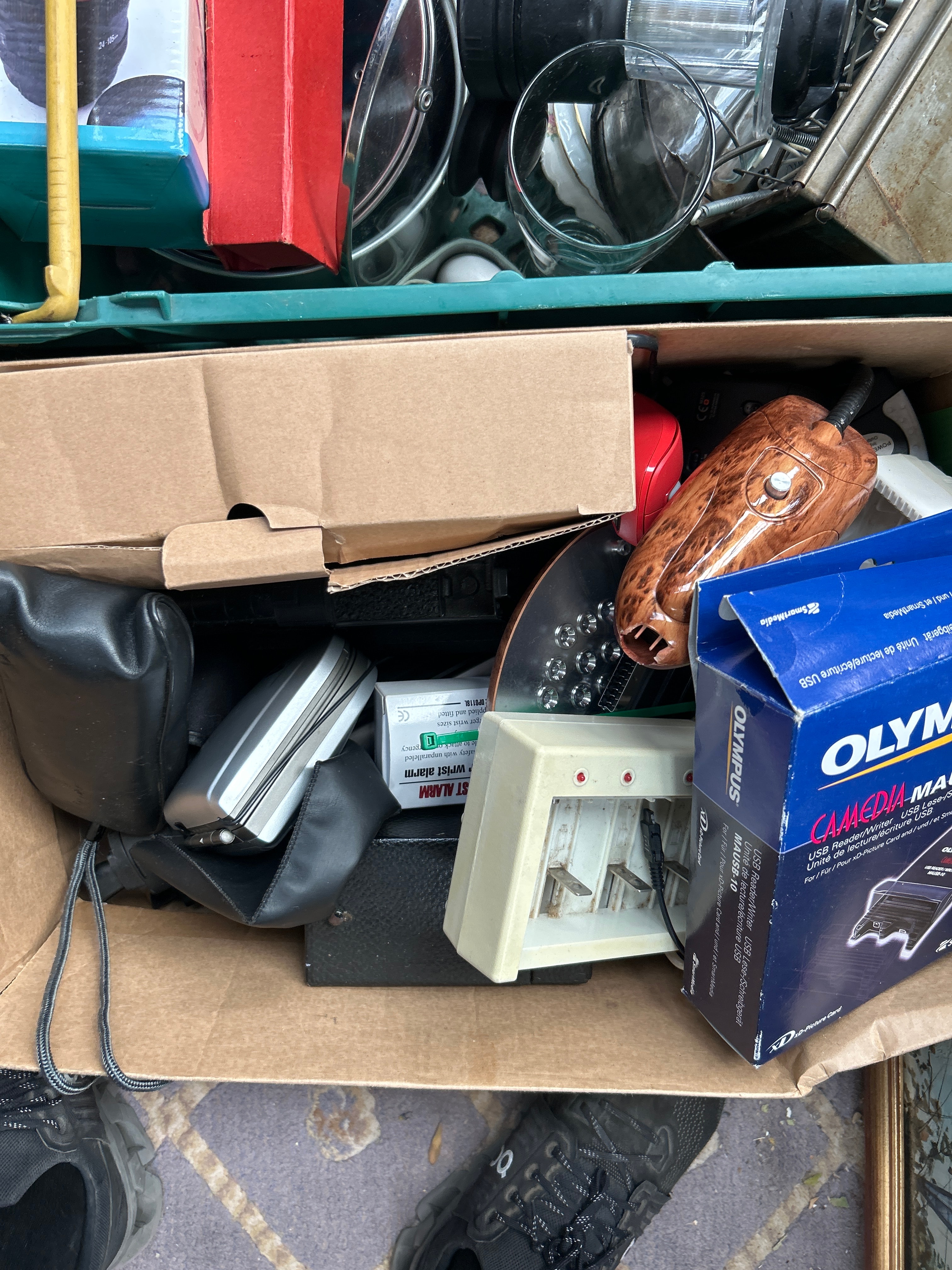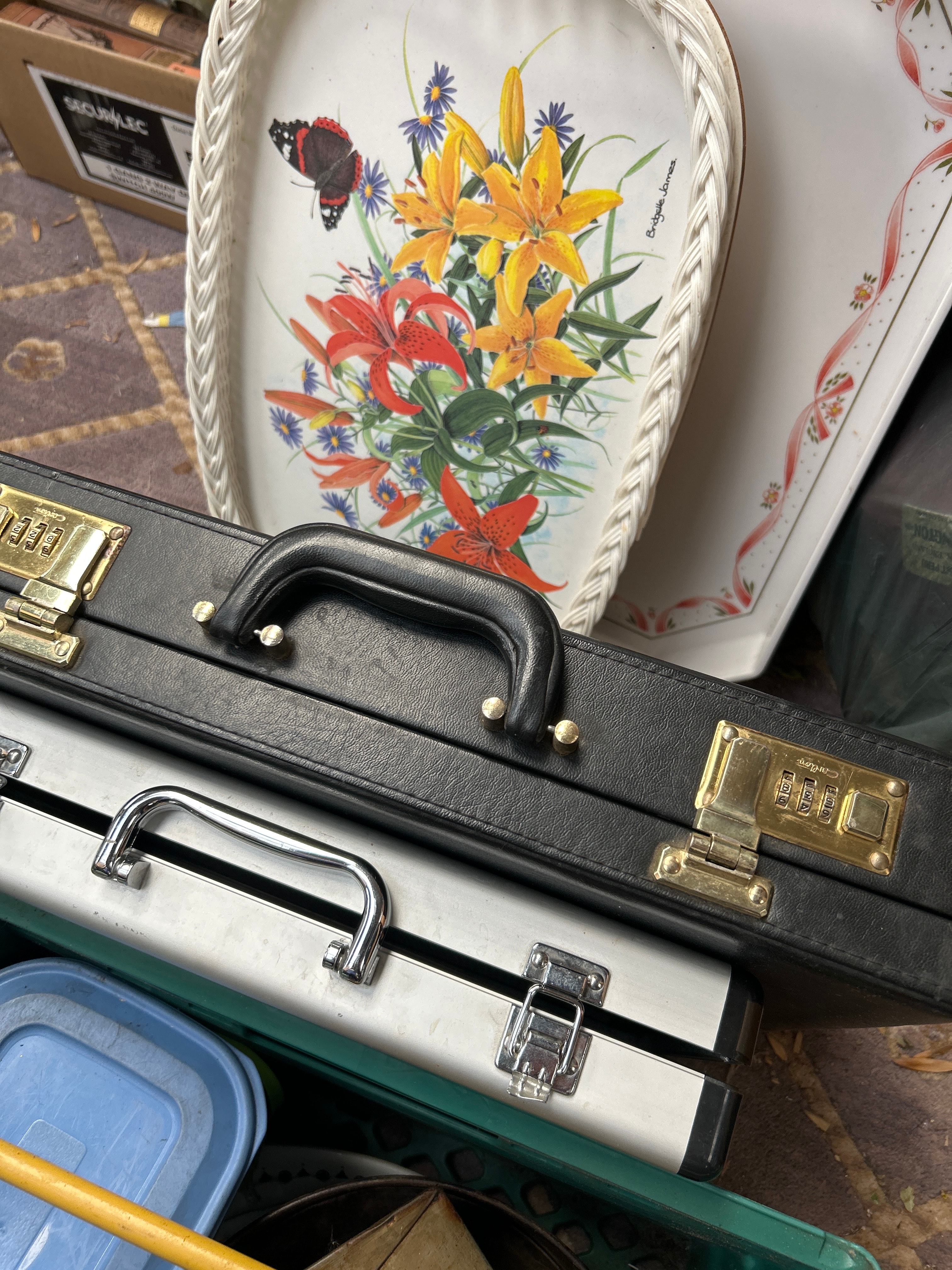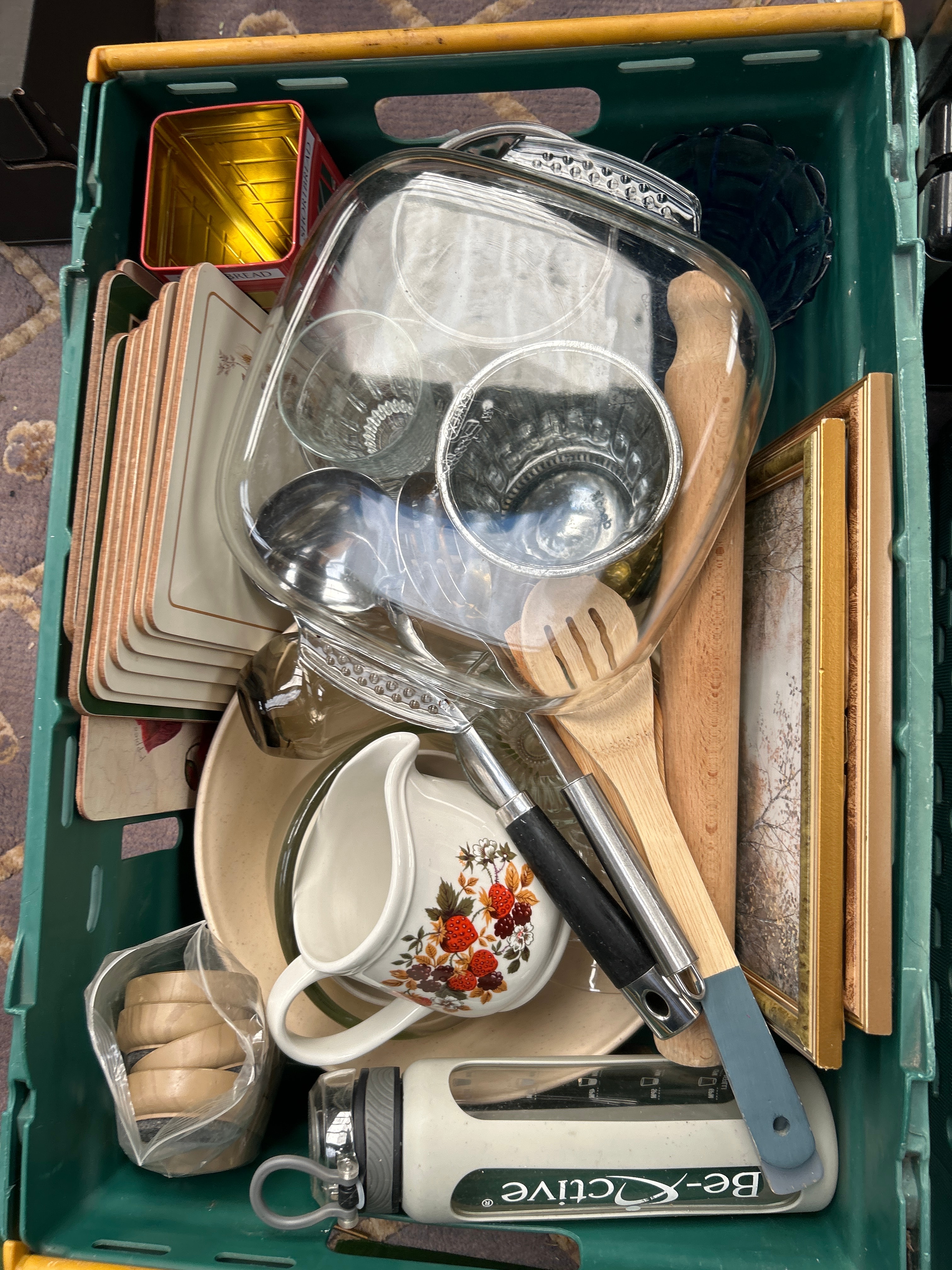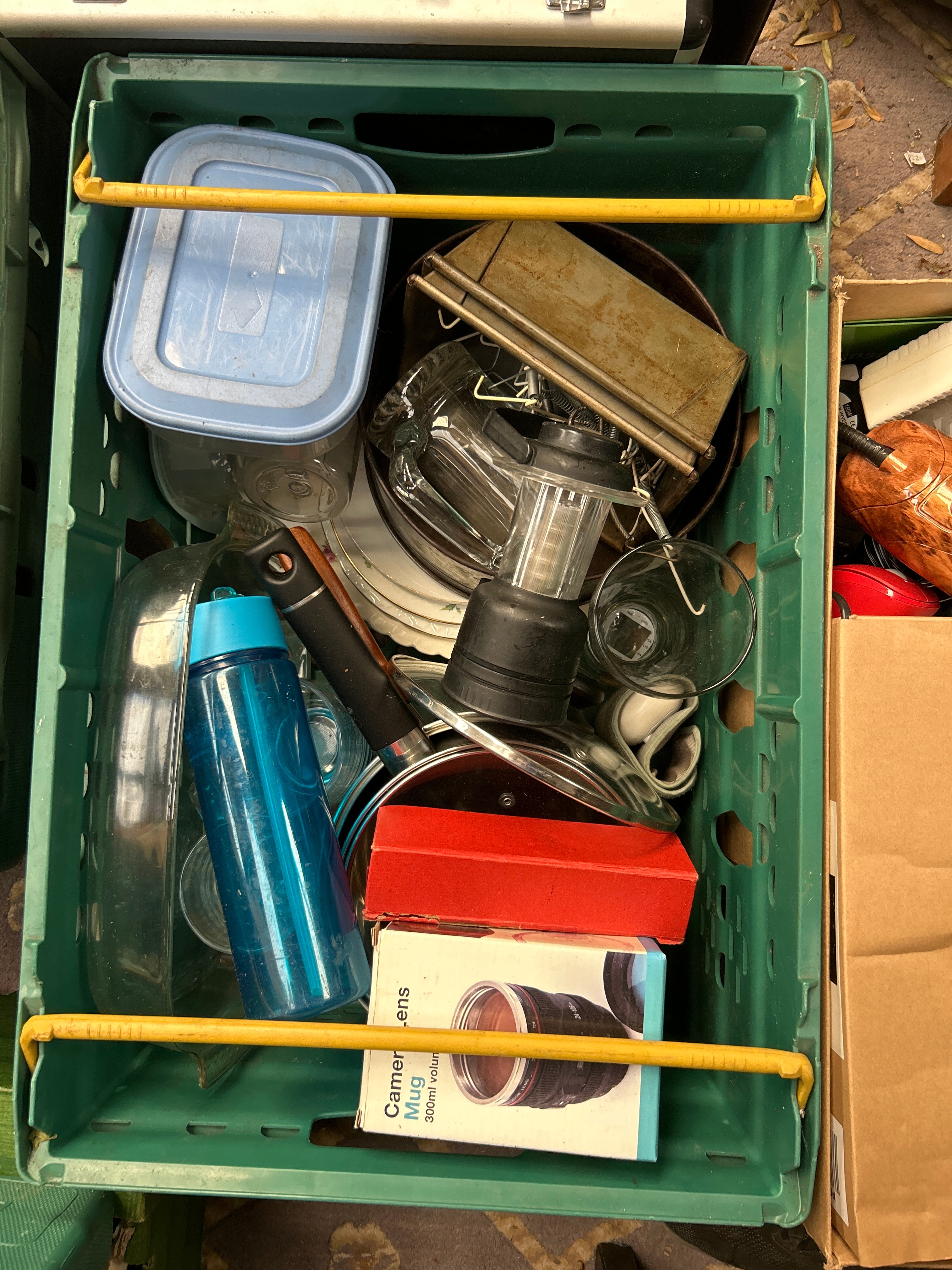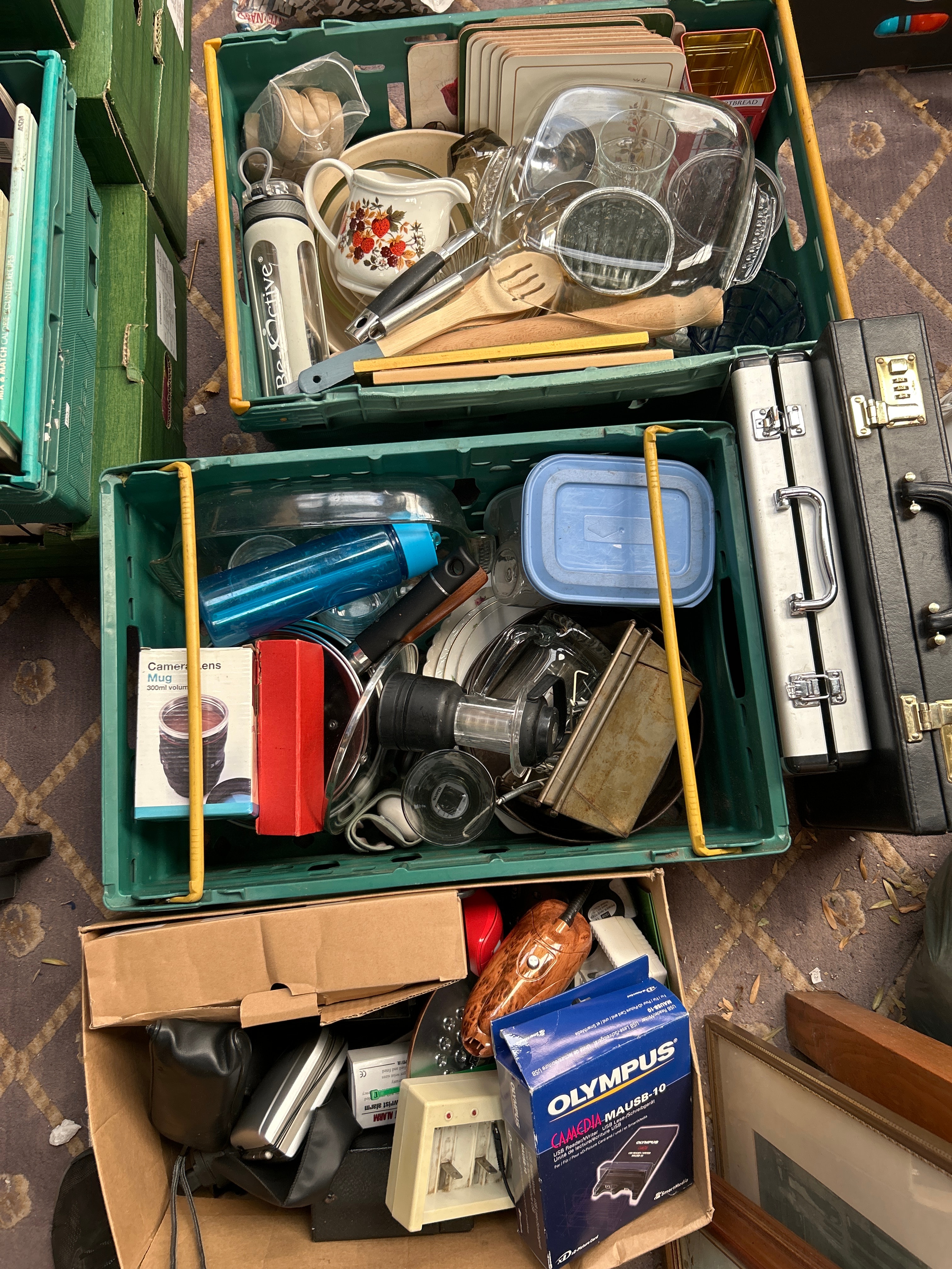 This lot comprises a diverse assortment of modern and vintage household goods, electronics, and kitchenware, presented in three green plastic utility crates and one cardboard box. Also included are two briefcases and two decorative trays. The black briefcase features gold-tone combination locks, while the silver briefcase below has chrome-tone clasps. One white oval tray is adorned with a vibrant floral and butterfly design, signed “Suzanne Bienne,” and is accompanied by a rectangular tray with a red floral border. Visible contents within the crates and box include various ceramic plates and mugs, glassware, metal and wooden kitchen utensils, plastic bottles and storage containers, a “Be-active” branded sports bottle, a “Camera Lens Mug” in its box, and an “OLYMPUS CAMEDIA MAUSB-10” USB reader/writer, whose packaging also notes “USB Reader/Writer / Disque Dur / Lecteur de mémoire / Lecture USB.” Further electronics present are a “FIRST ALARM” product box, a white charger, and a small brown wooden-look device.