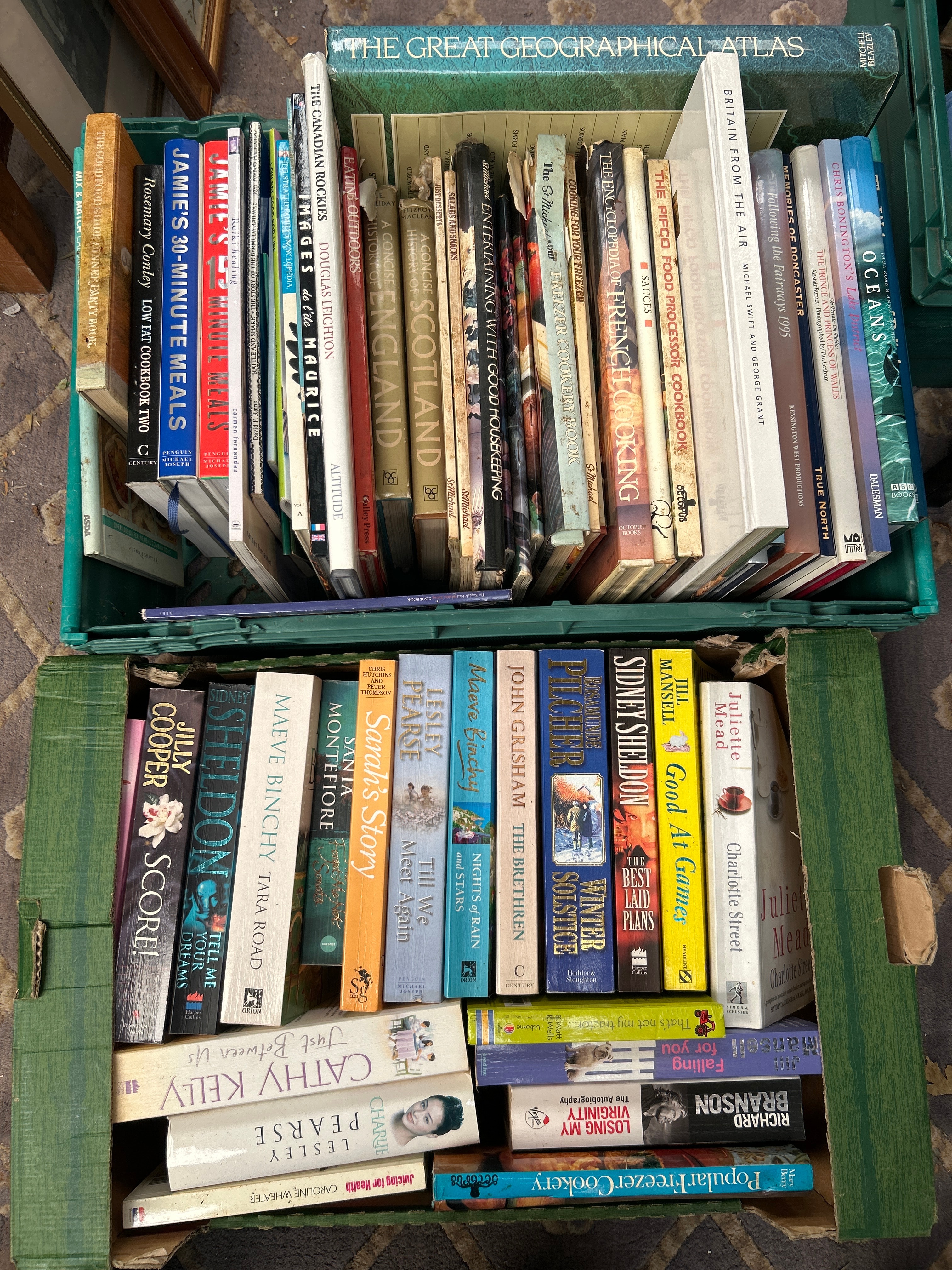 This lot comprises a substantial collection of approximately 80-100 books, predominantly late 20th to early 21st-century publications, stored in two worn, green-painted corrugated fiberboard crates. The collection is diverse, featuring a mix of popular fiction including titles by John Grisham, Maeve Binchy, Sidney Sheldon, and Jilly Cooper. Non-fiction titles include Richard Branson’s “Losing My Virginity,” alongside numerous cookbooks by authors such as Jamie Oliver, St Michael, and Rosemary Conley. The collection also contains large format atlases, exemplified by “The Great Geographical Atlas,” and various travel and regional interest books, such as “Britain From The Air” and “A Concise History of Scotland.” The books are constructed with typical modern materials, consisting of paper pages with cardboard or plasticized covers, often retaining their original dust jackets.