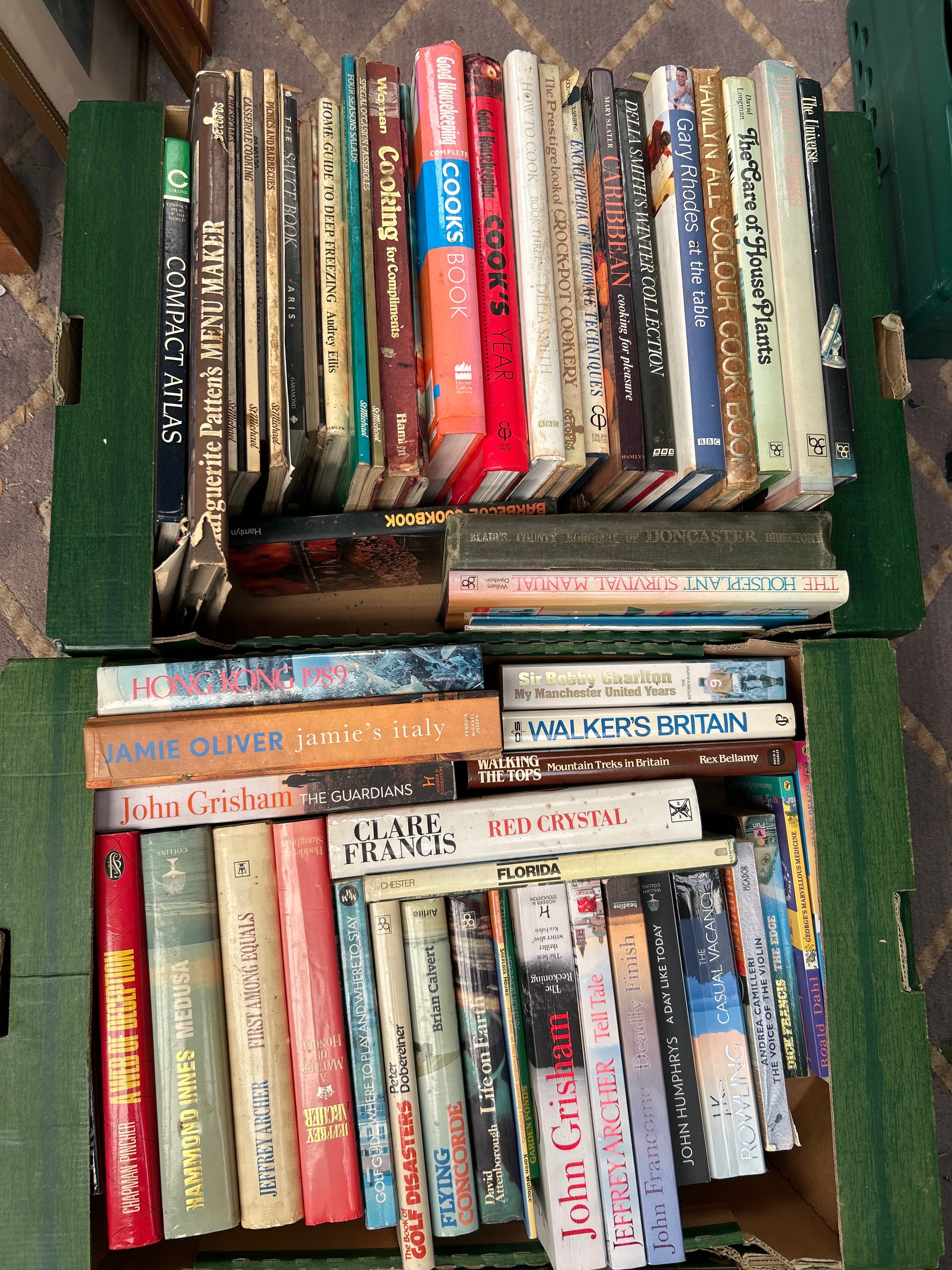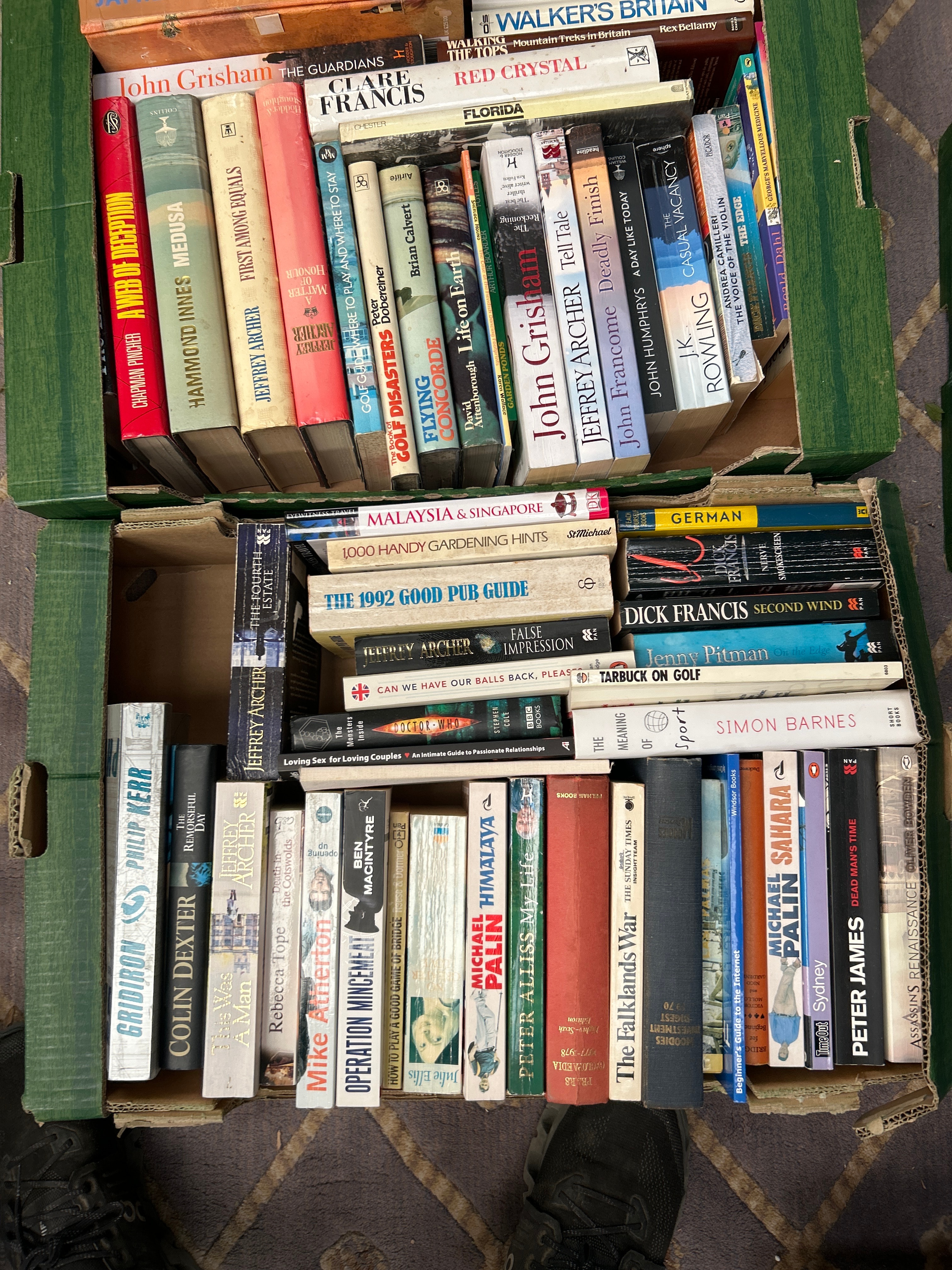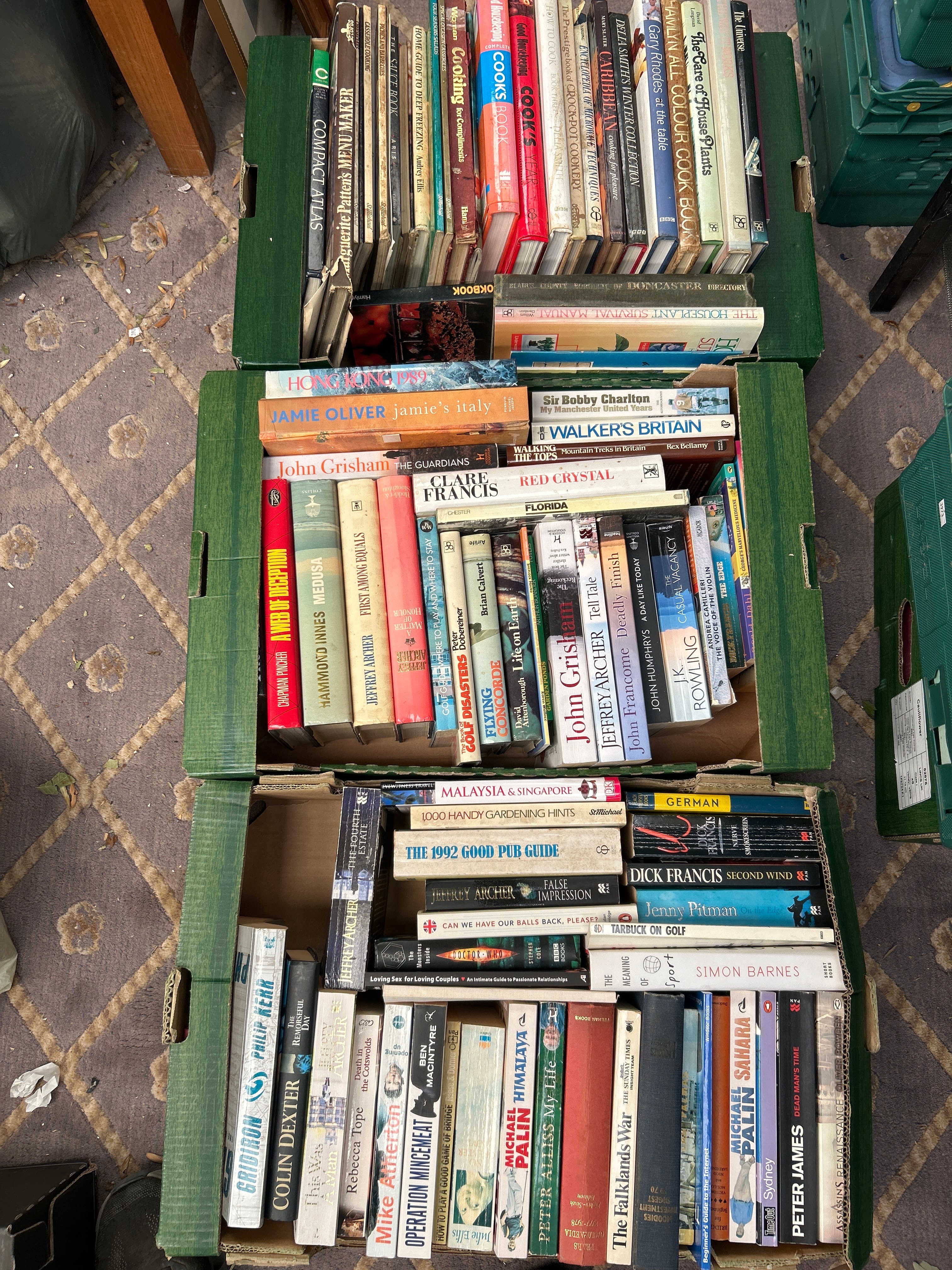 This collection comprises a substantial quantity of books, primarily stored in three green, corrugated cardboard boxes. The items are a mix of hardback and paperback editions, predominantly popular fiction and non-fiction from the 20th and 21st centuries. Visible authors include John Grisham, Jamie Oliver, J.K. Rowling, Dick Francis, Jeffrey Archer, Peter James, and Michael Palin, with identifiable titles such as *Jamie’s Italy*, *The Guardians*, *The 1992 Good Pub Guide*, and *Walker’s Britain*. The materials are standard paper and cardboard construction. English is the dominant language, with one spine clearly marked “GERMAN” and another indicating “MALAYSIA & SINGAPORE” as subject matter.