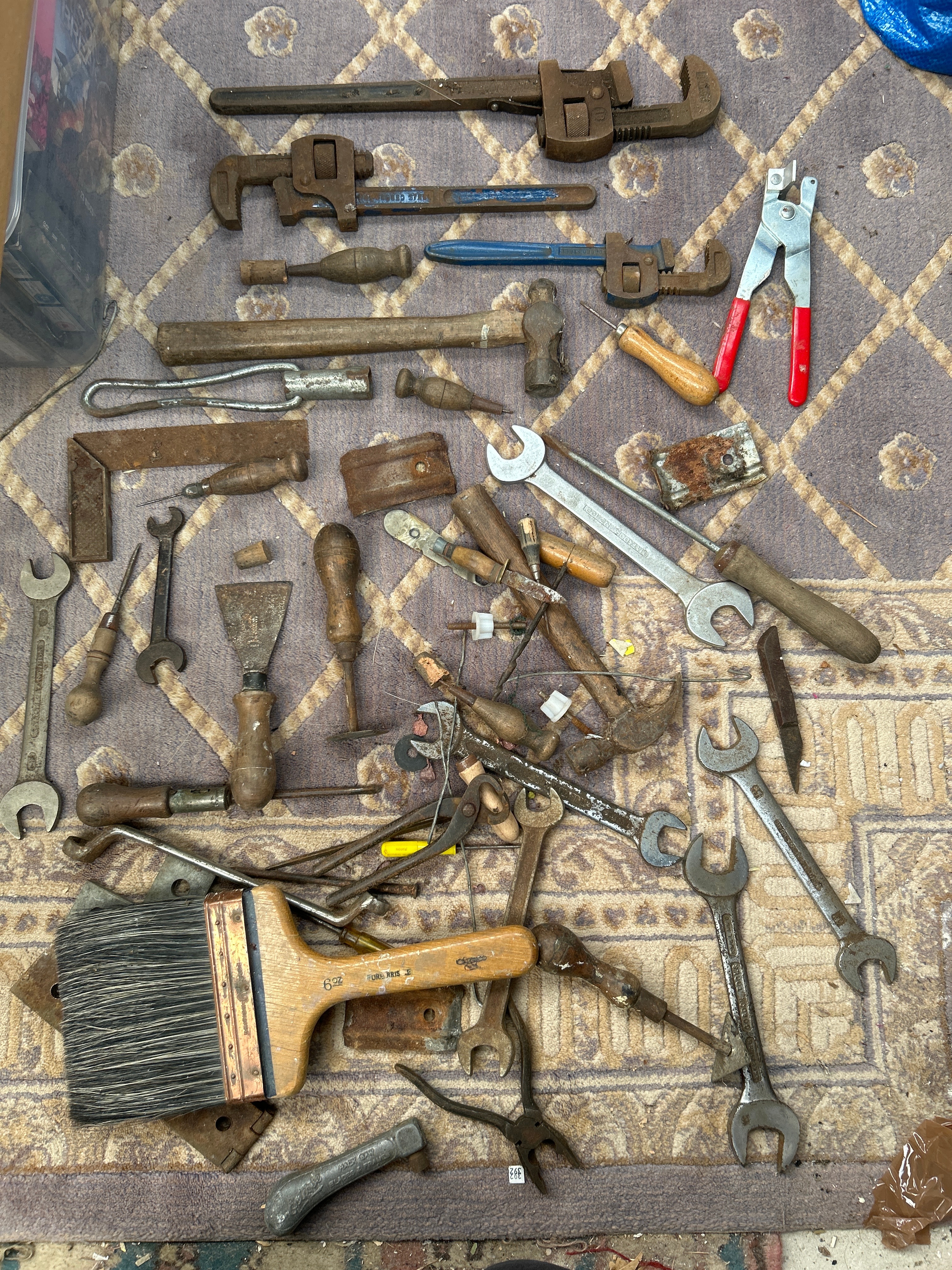 A diverse collection of approximately three dozen vintage and antique hand tools, predominantly fashioned from cast iron and steel, with many featuring wooden handles. The assortment includes various pipe wrenches, some with remnants of blue paint, adjustable wrenches, numerous open-end wrenches, hammers, pliers (one modern pair with red plastic handles), screwdrivers, wood chisels/scrapers, a framing square, and a large paintbrush. Notable visible markings include manufacturer details such as “THE RIDGE TOOL CO. ELYRIA, O. U.S.A.”, “TRIMONT MFG. CO. ROXBURY MASS. USA”, “GORDON TOOLS”, and a patent date “PAT. 1913. G.R.A.G.G.” on a blue-handled tool. The paintbrush is marked “PURE BRIS” (Pure Bristle).