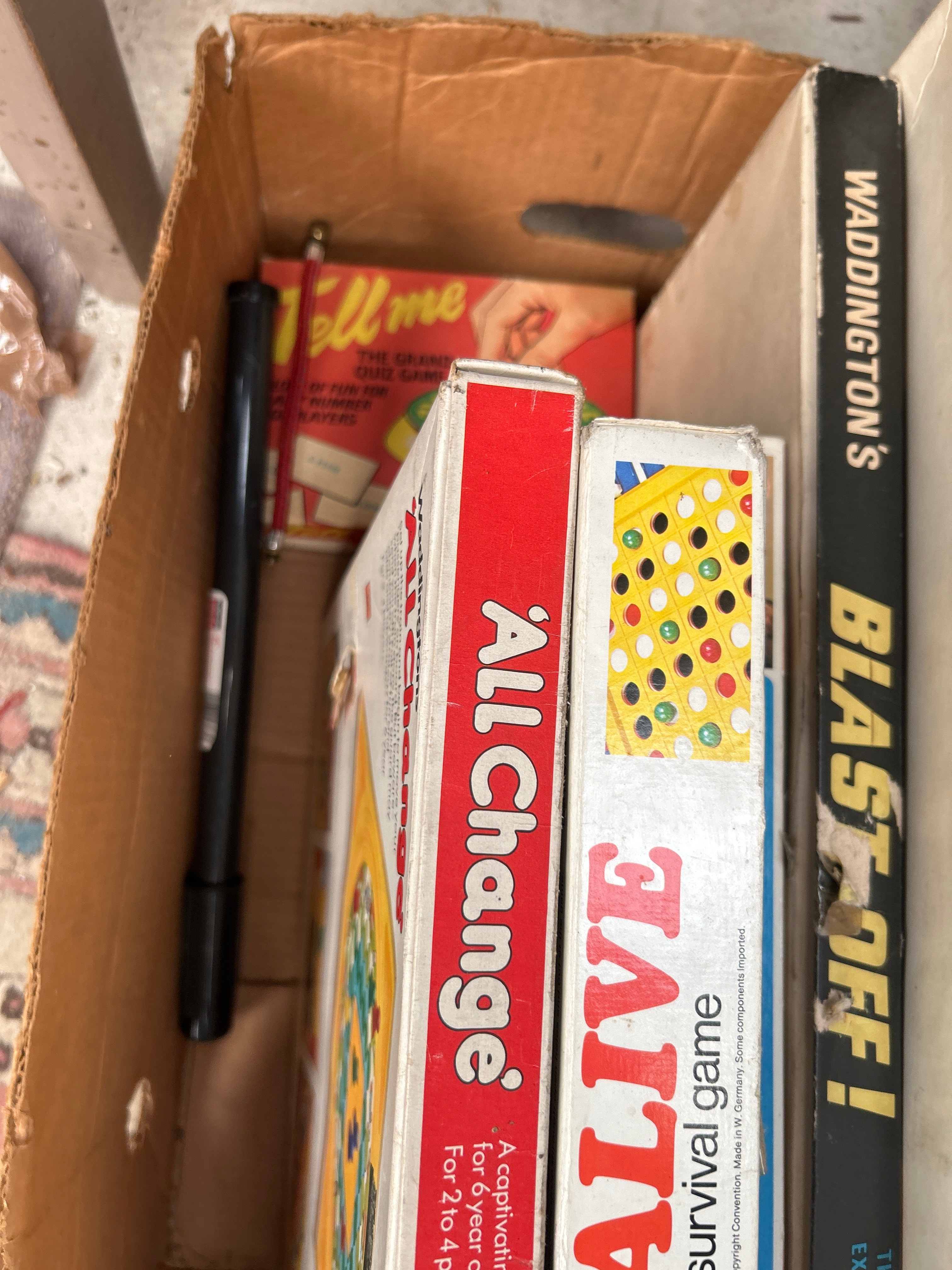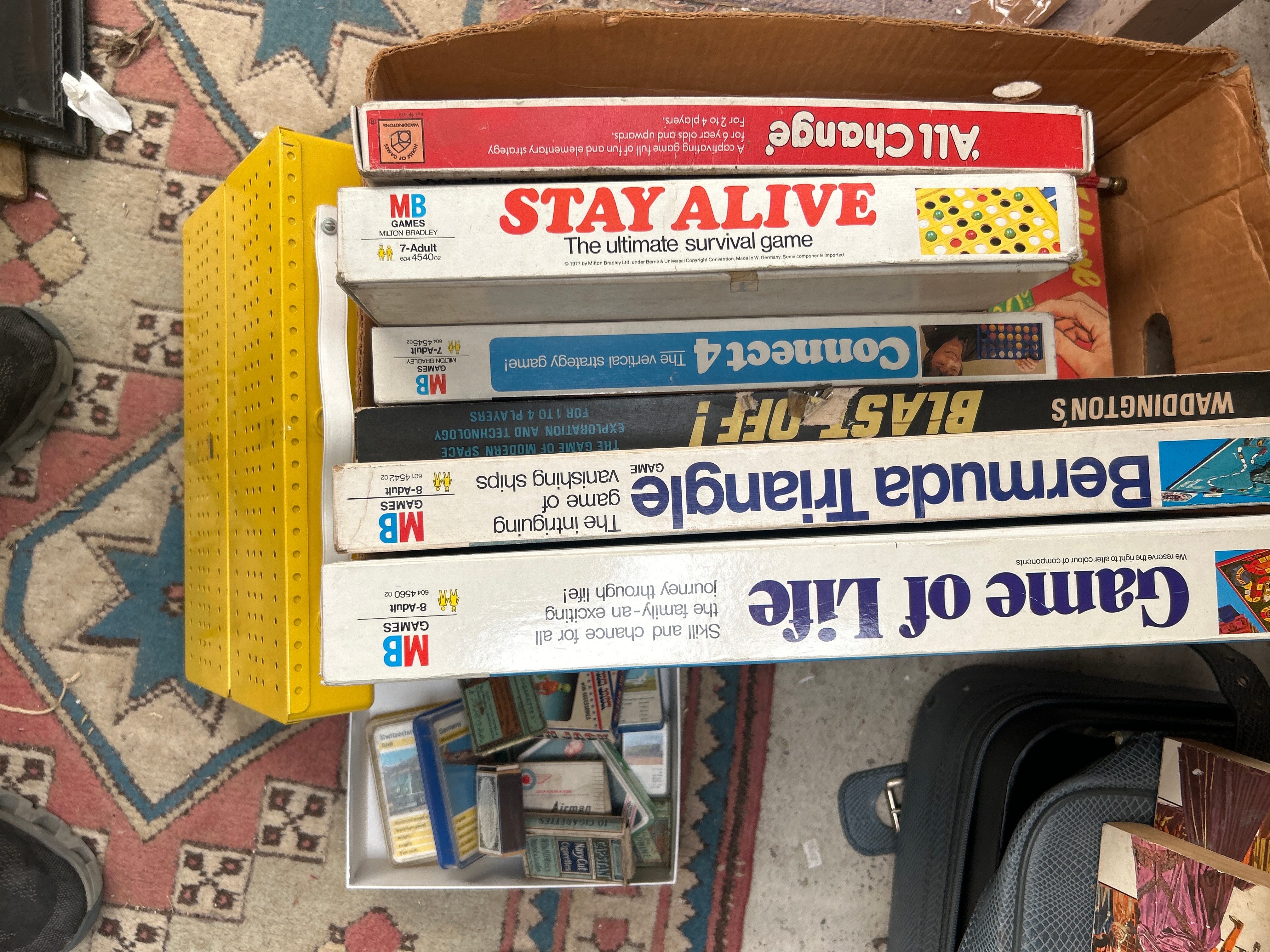 This lot comprises a collection of mid to late 20th-century board games, primarily by MB Games and Waddington’s, including titles such as “All Change,” “Stay Alive,” “Connect 4,” “Blast Off!,” “Bermuda Triangle,” and “Game of Life.” Also included are various early to mid-20th century small metal and tin boxes, some likely for tobacco products. Identified items include “Action Jack,” “Capstan Navy Cut Cigarettes,” “Airman,” and a “Grand Diploma of Honour” box for “Wild Woodbine” cigarettes, with visible markings such as “Germany” and “Switzerland.”
