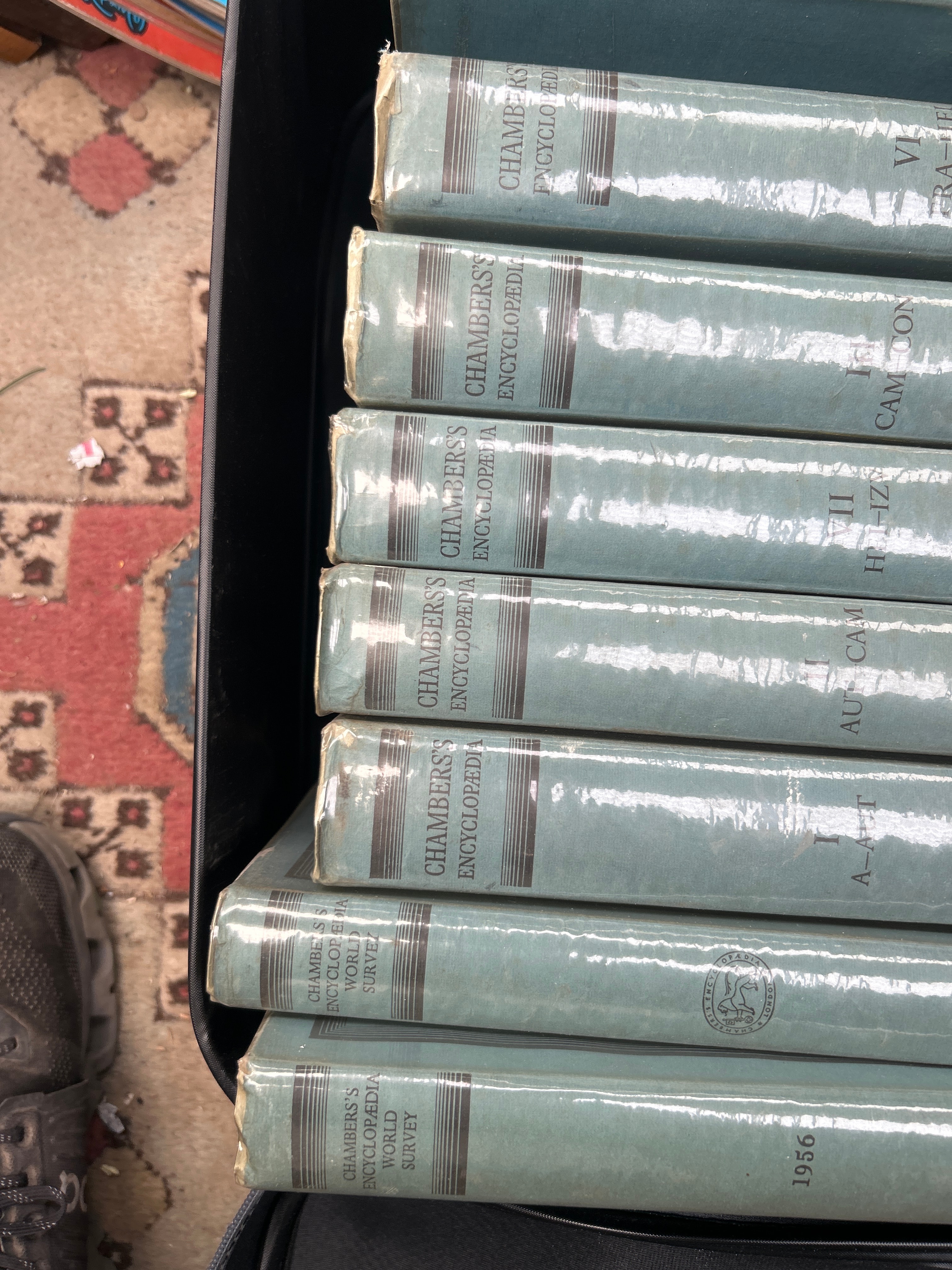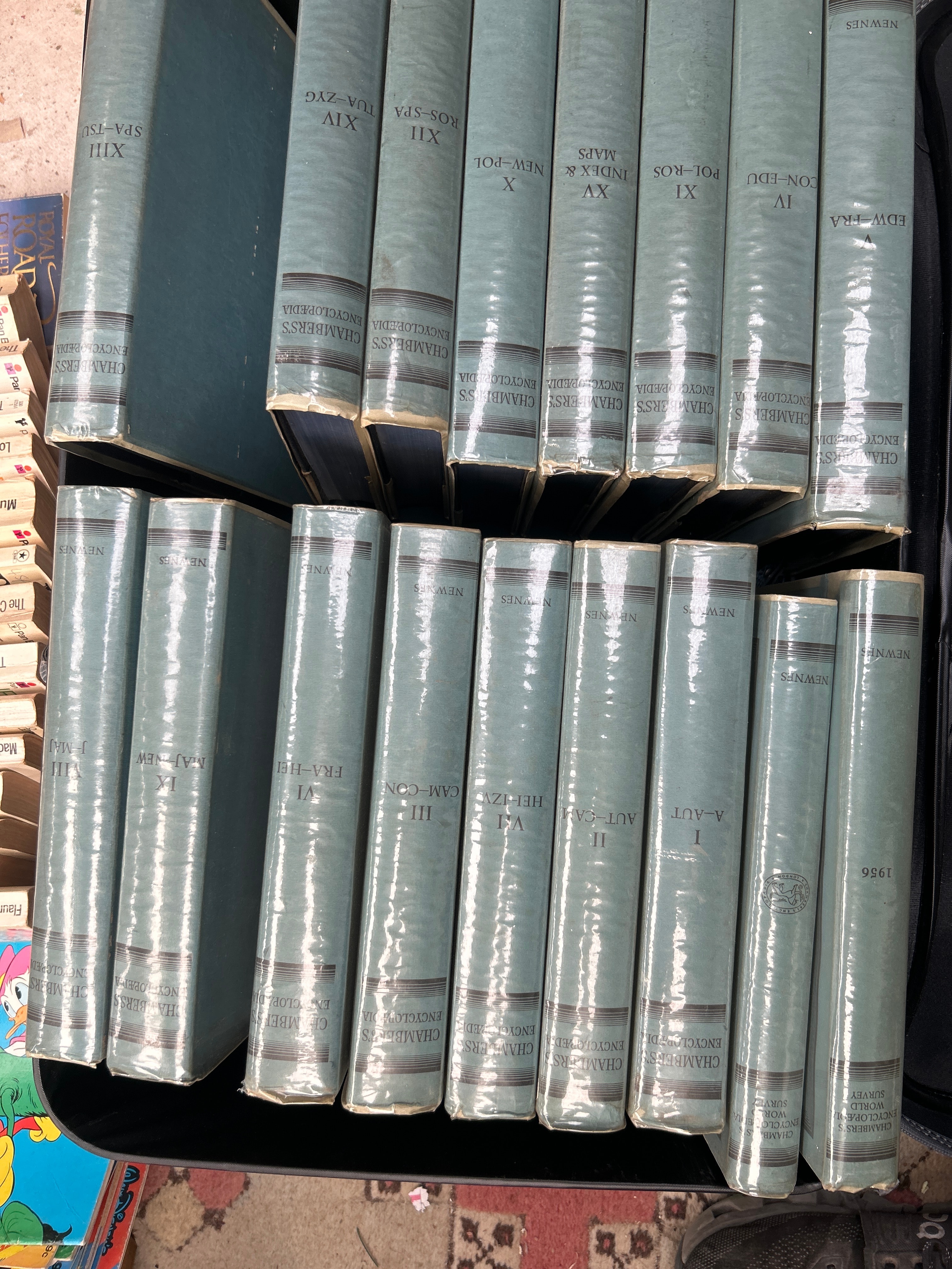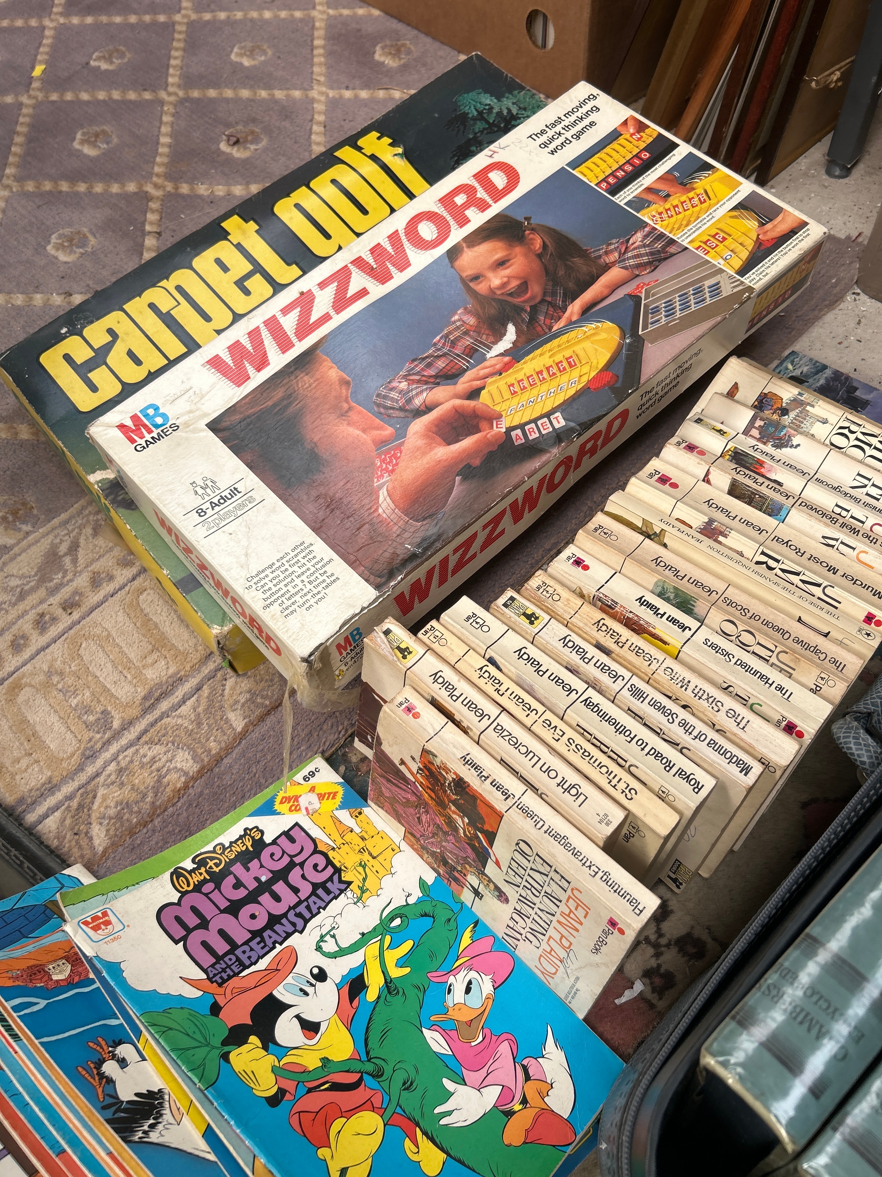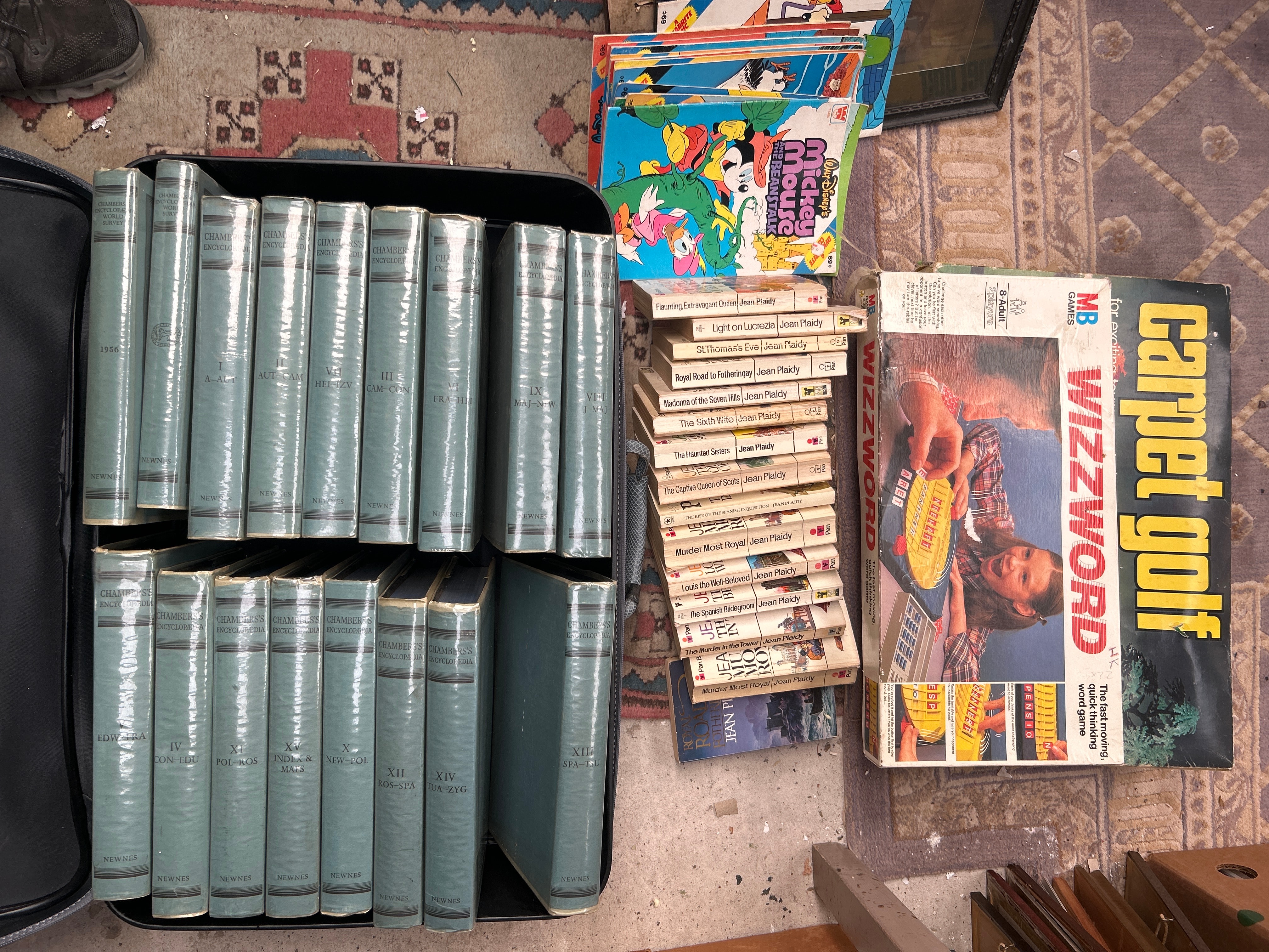 A multi-volume set of “Chambers’s Encyclopædia,” published by Newnes, identified by Roman numerals and alphabetical ranges such as A-AUT, SPA-ISL, and TUA-ZYG, alongside a “World Survey 1956” volume. These hardback books are uniformly bound in pale blue-green cloth. The collection also includes numerous paperback novels, predominantly historical fiction by Jean Plaidy, with titles such as “Light on Lucrezia,” “The Sixth Wife,” and “Haunting Extravagant Queen.” Additionally, two boxed board games, “Wizzword” and “Carpet Golf” by MB Games, are present. A group of “Walt Disney’s Mickey Mouse and the Beanstalk” comic books or magazines, one dated 1990, completes the visible items.