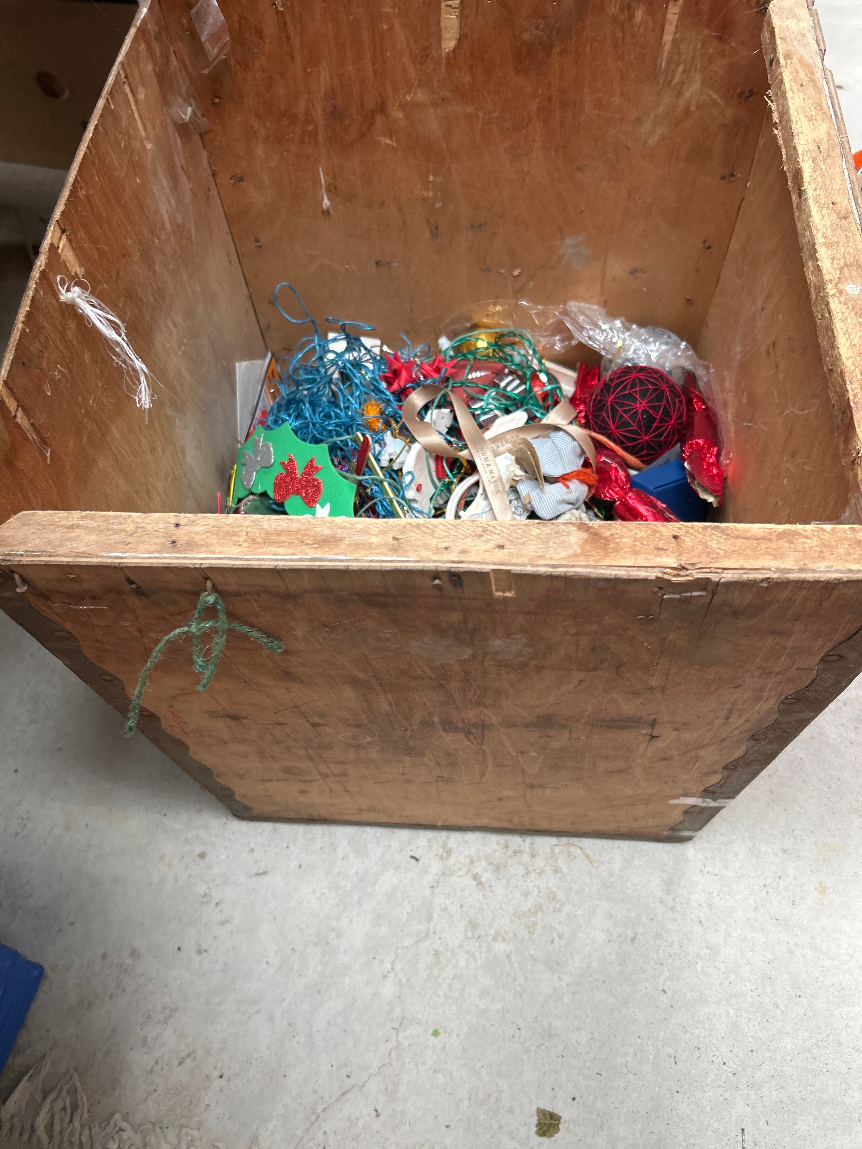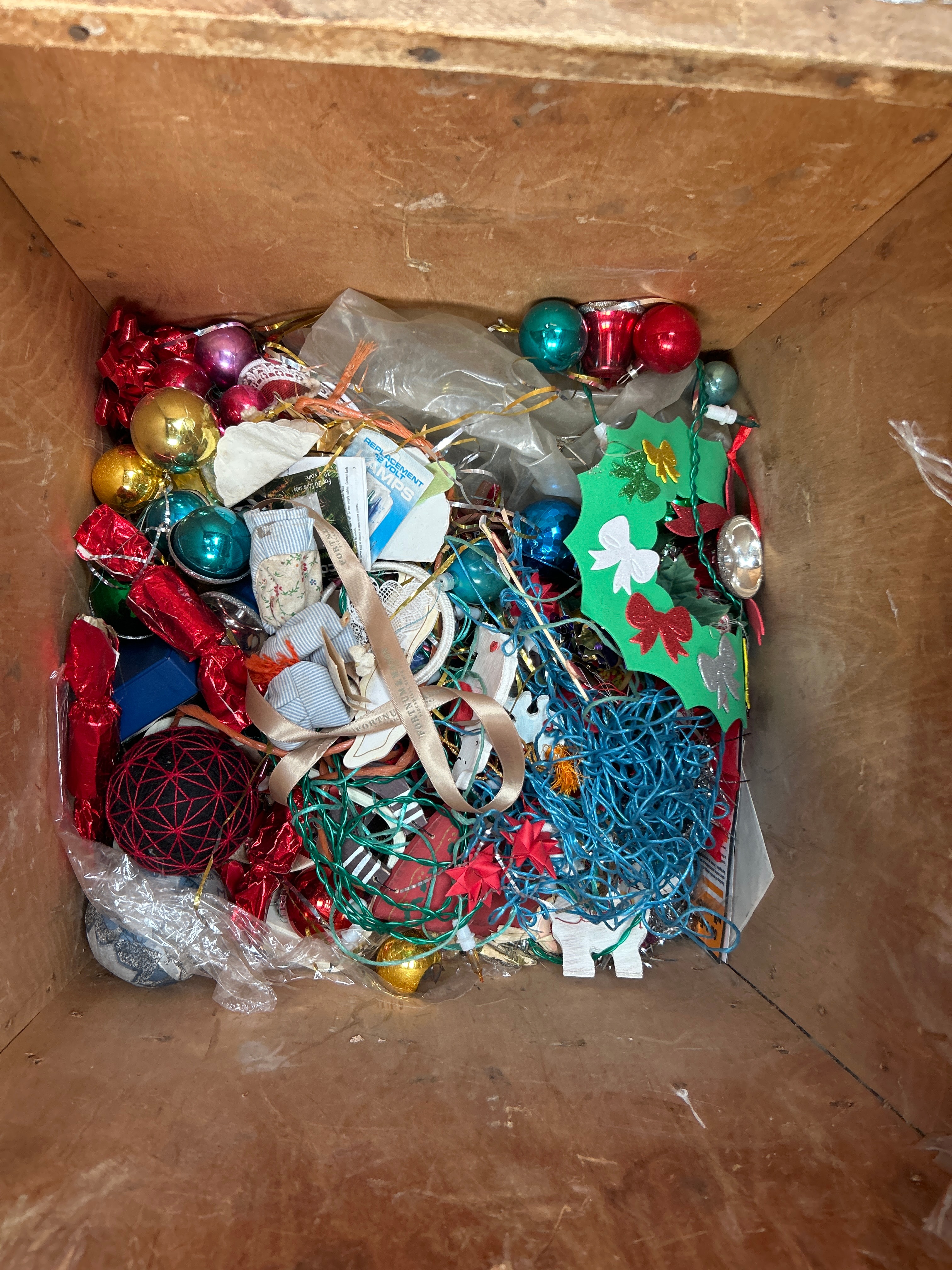 A large, unvarnished wooden crate, constructed from plywood, filled with a varied assortment of decorative items. The contents predominantly appear to be Christmas or holiday-themed, comprising numerous spherical ornaments in assorted colors including red, gold, teal, and pink, likely crafted from glass or plastic. Also visible are tangled lengths of blue and green tinsel or garland, fabric ribbons (one prominently displaying “MERRY CHRISTMAS” in gold text), glittered paper cut-outs, a small fabric doll, and various other small decorative elements and tags. The style is eclectic, suggesting a collection spanning from the late 20th to early 21st century.