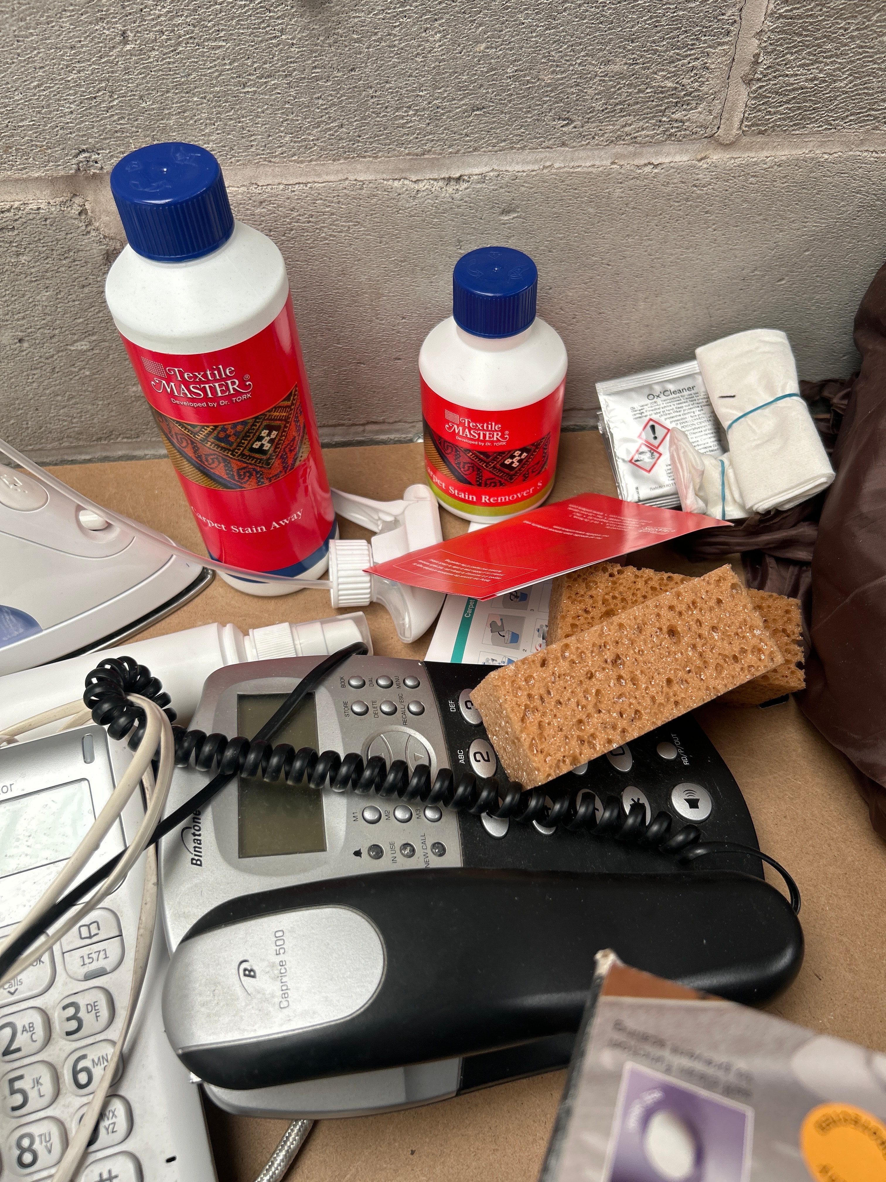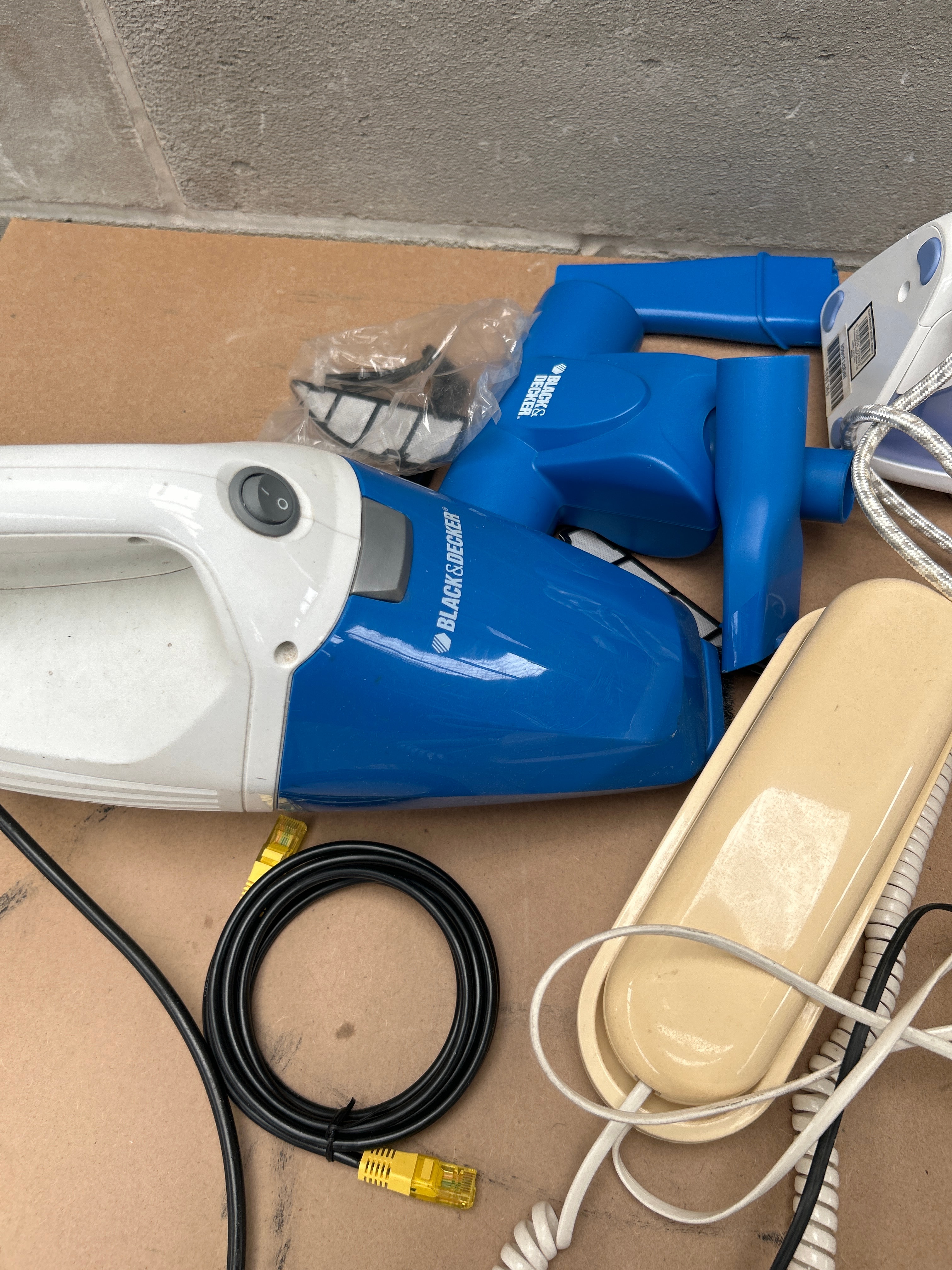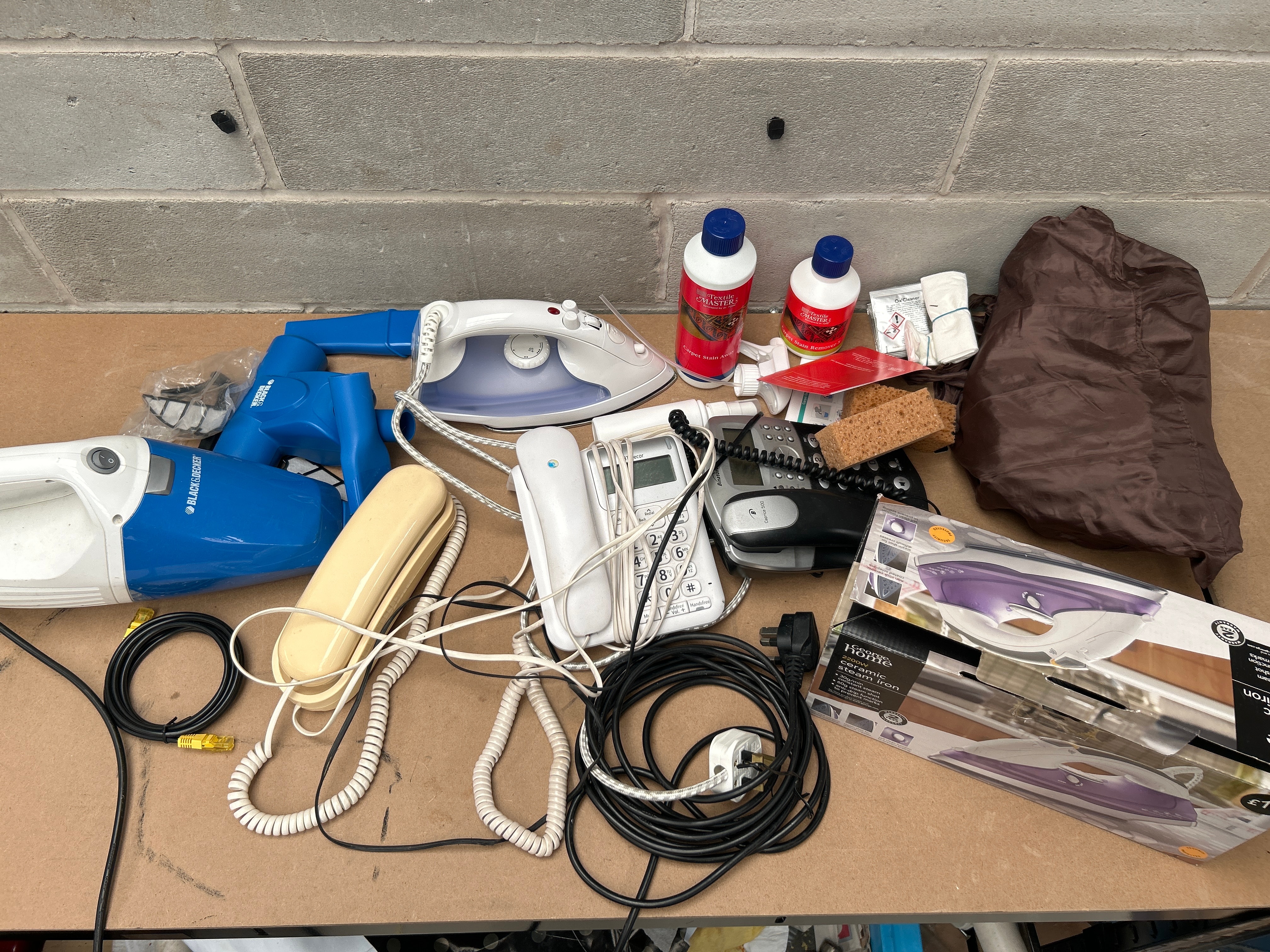 This lot comprises a diverse collection of household electrical appliances and cleaning essentials. It includes two blue and white BLACK+DECKER handheld vacuums, one white and blue steam iron, and three landline telephones (one cream-colored corded unit, one white corded phone, and a grey/black Binatone Caprice 500 cordless system). Also present are two bottles of ‘Textile Master’ brand ‘Carpet Stain Away’ / ‘Spot & Stain Remover’ liquids, a group of assorted electrical and network cables, and various small cleaning accessories including sponges and a folded brown textile. A new-in-box Beko Stirex EasyGlide Steam Iron (model SIM3122W) is also part of this lot.