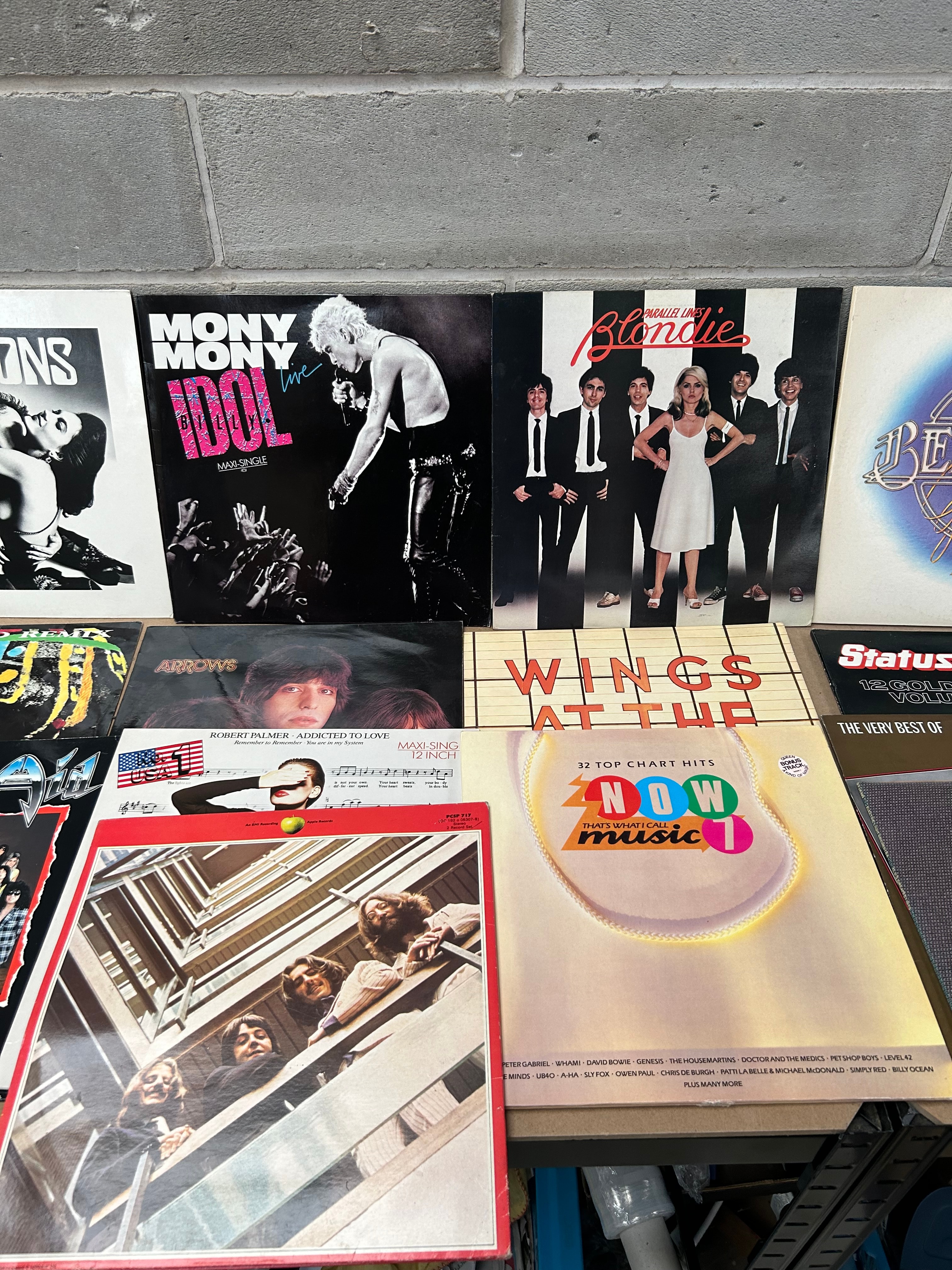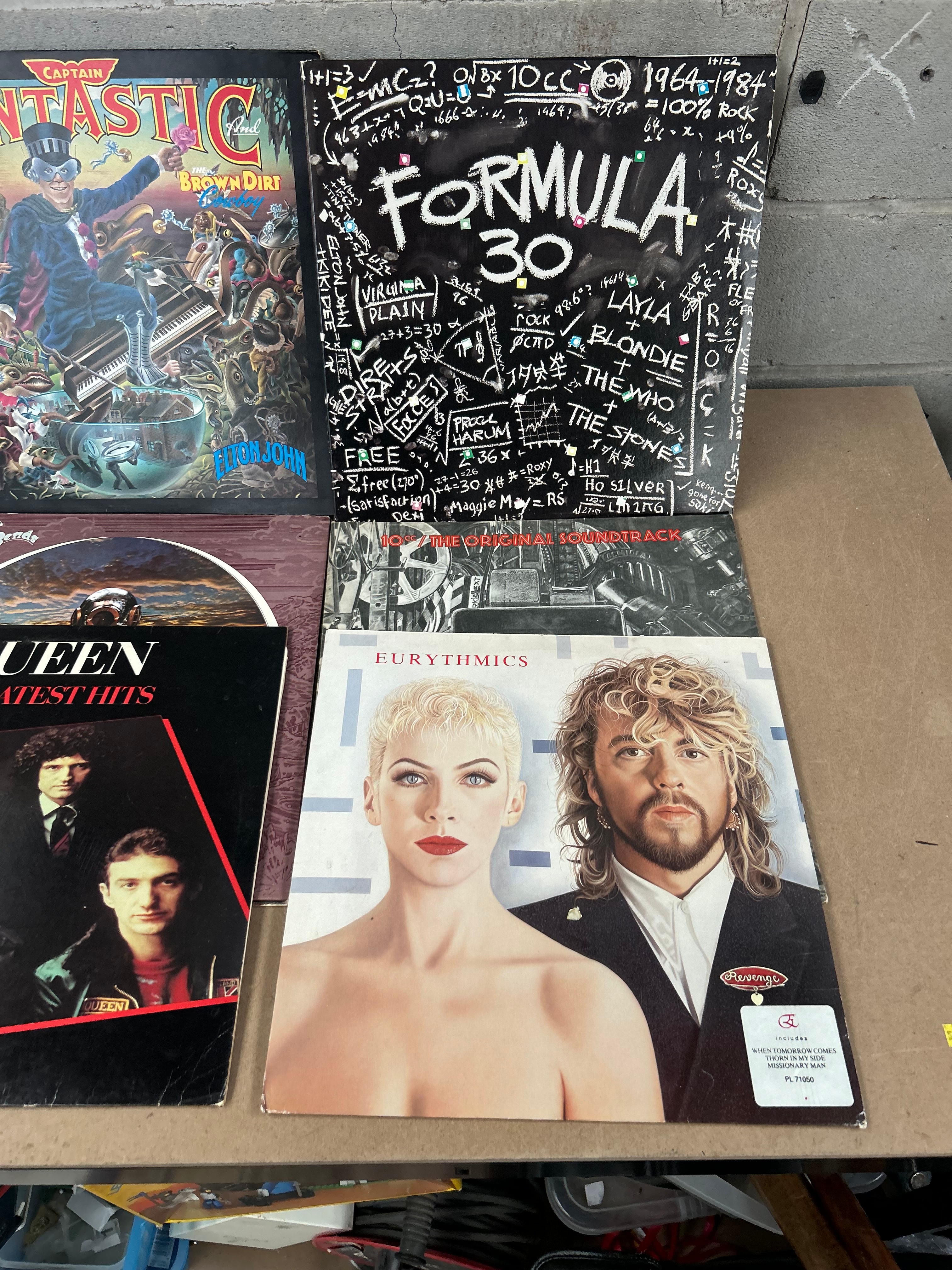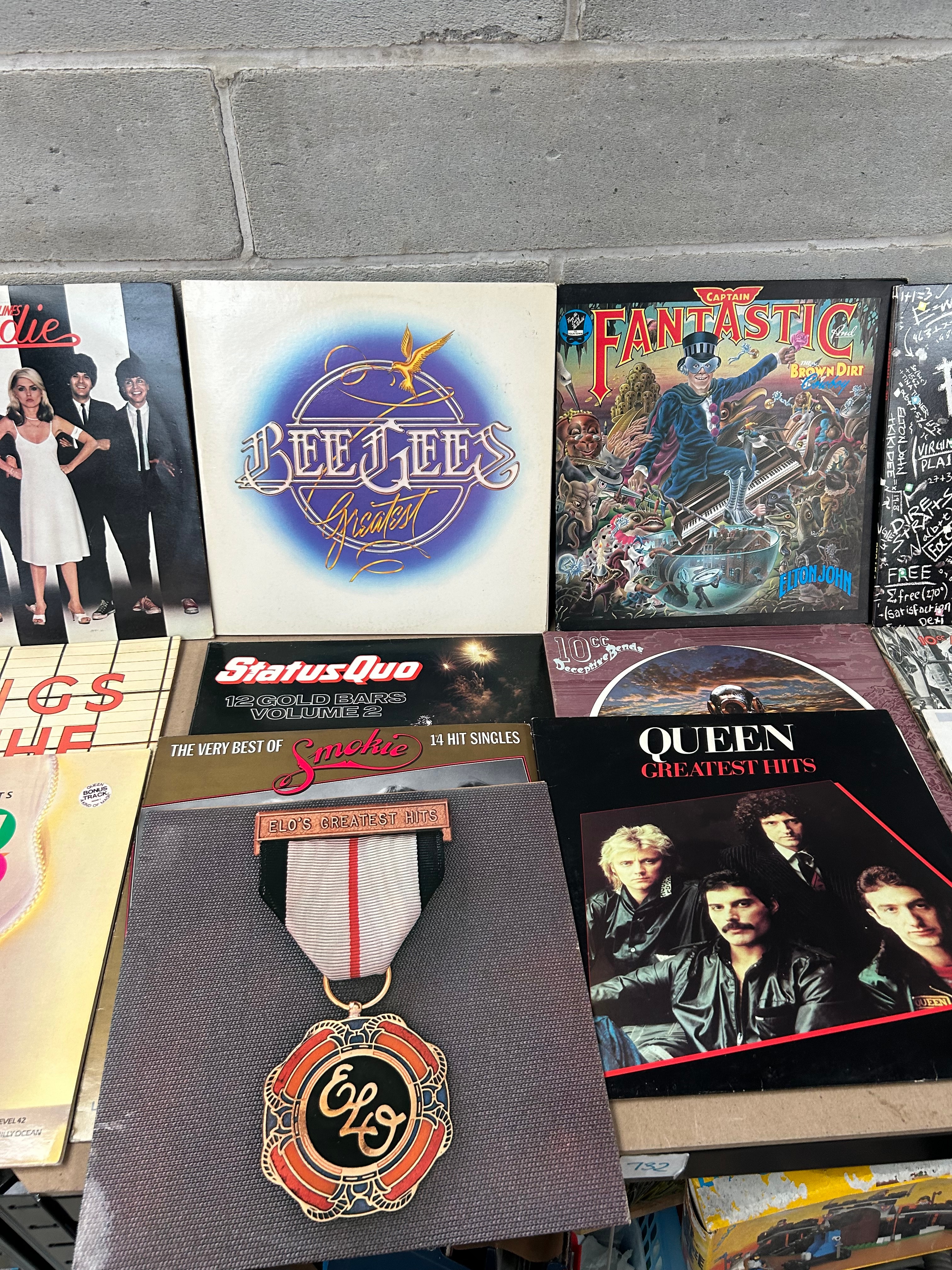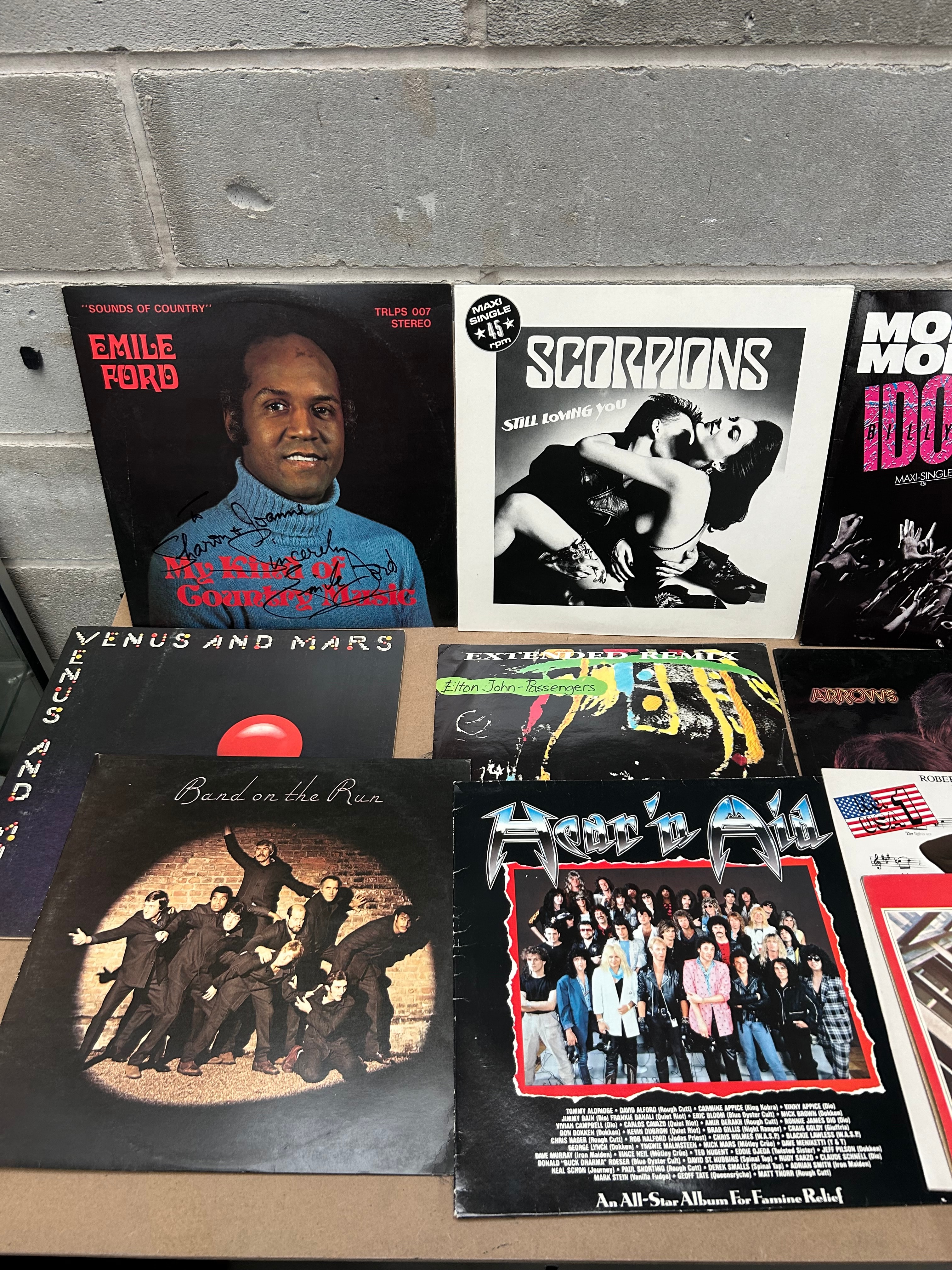 A collection of approximately 20-25 vinyl record albums and singles, primarily dating from the 1960s to 1980s. The lot encompasses a variety of genres including rock, pop, new wave, and country. Featured artists and albums include Emile Ford’s “Sounds of Country” album, which bears a visible signature; a Scorpions “Still Loving You” 45 RPM single; Billy Idol’s “Mony Mony” Maxi Single; Blondie; Bee Gees; Elton John’s “Captain Fantastic and the Brown Dirt Cowboy”; Eurythmics; Queen’s “Greatest Hits”; Status Quo; Smokie; Electric Light Orchestra’s “ELO’s Greatest Hits,” which has a decorative medal affixed to its sleeve; and Wings’ “Band on the Run” and “Venus and Mars.” Also present are a compilation album titled “Now 2000 Music” and an album labeled “FORMULA 30” with extensive handwritten artist names such as “Blondie,” “The Who,” and “The Stones.”