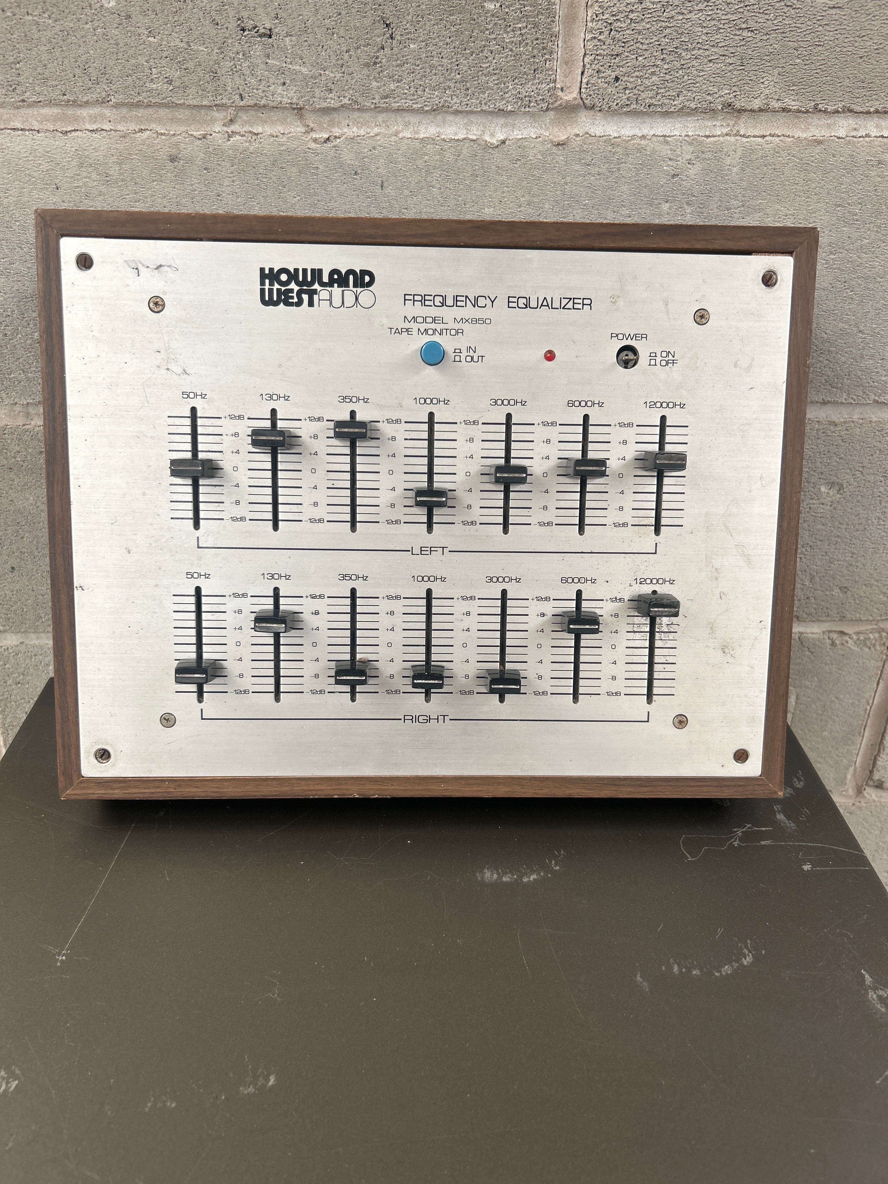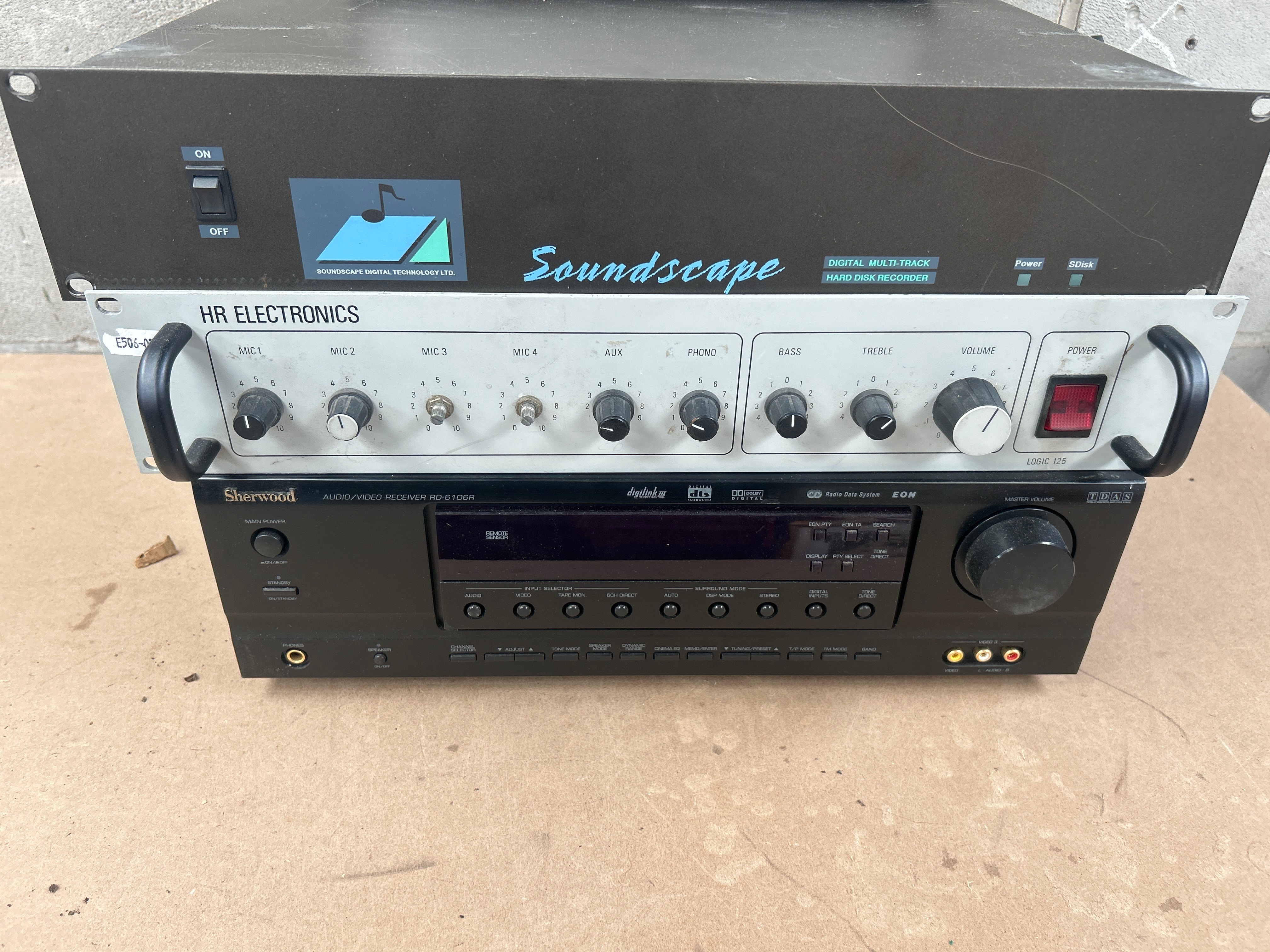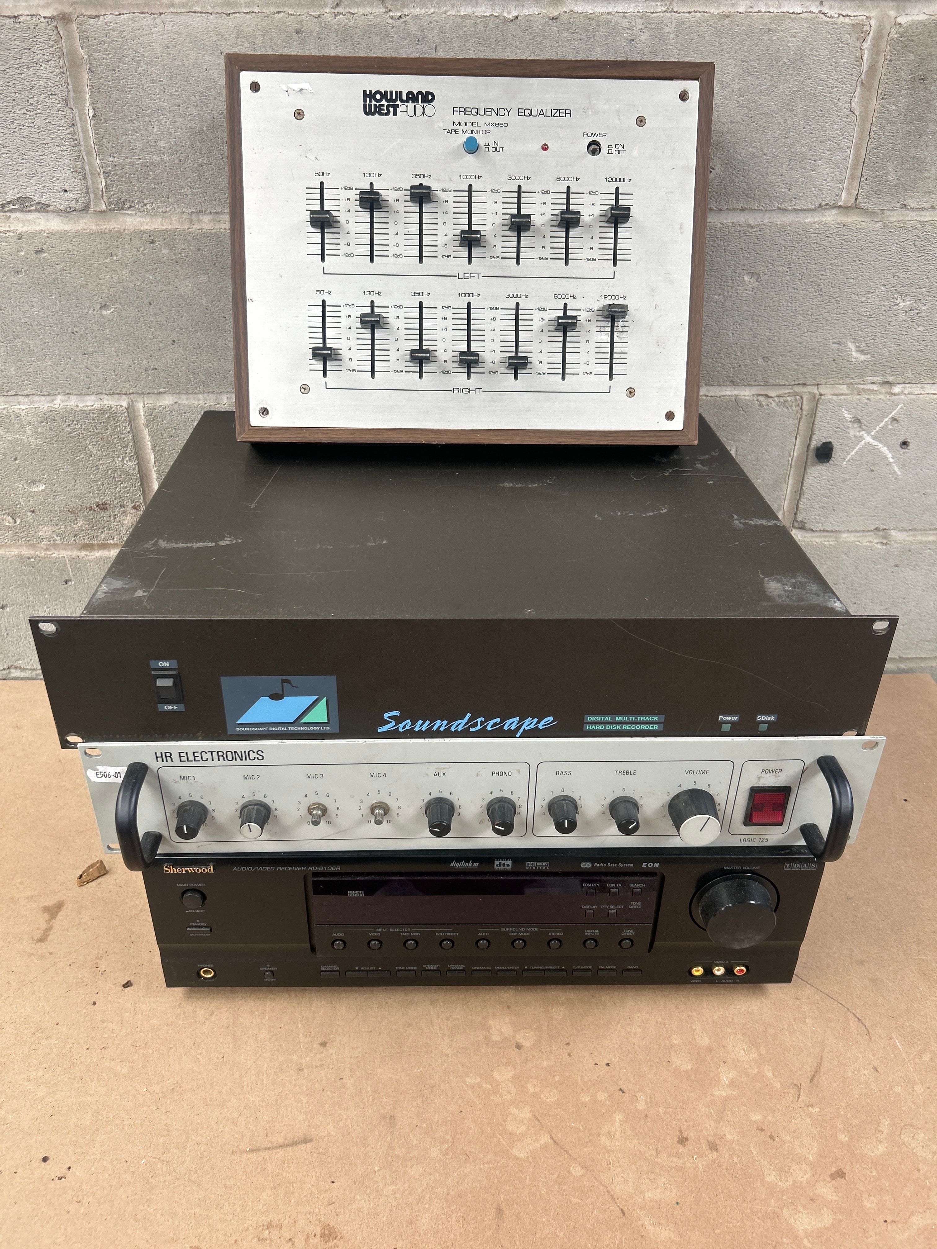 A group of four audio components, comprising a Howland West Audio EQ-300 Frequency Equalizer, a Soundscape Digital Multi-Track Hard Disk Recorder, an HR Electronics Logic 125 mixer/preamplifier, and a Sherwood RD-6108 Audio/Video Receiver. The Howland West EQ-300 features a wood-grain surround and brushed metal faceplate with stereo 7-band graphic sliders. The Soundscape unit is a dark grey Digital Multi-Track Hard Disk Recorder from Soundscape Digital Technology Ltd. with a front power switch. The HR Electronics Logic 125 is a lighter grey mixer/preamplifier with four microphone inputs, auxiliary, phono, bass, treble, and volume controls. The Sherwood RD-6108 is a black Audio/Video Receiver marked “Dolby Digital,” “dts,” and “Radio Data System,” with a master volume knob and various input/mode selection buttons. All units exhibit a rack-mountable design aesthetic, with the equalizer presenting a more vintage appearance due to its wood casing, suggesting a late 20th to early 21st-century period for the collection. These items are offered not tested.