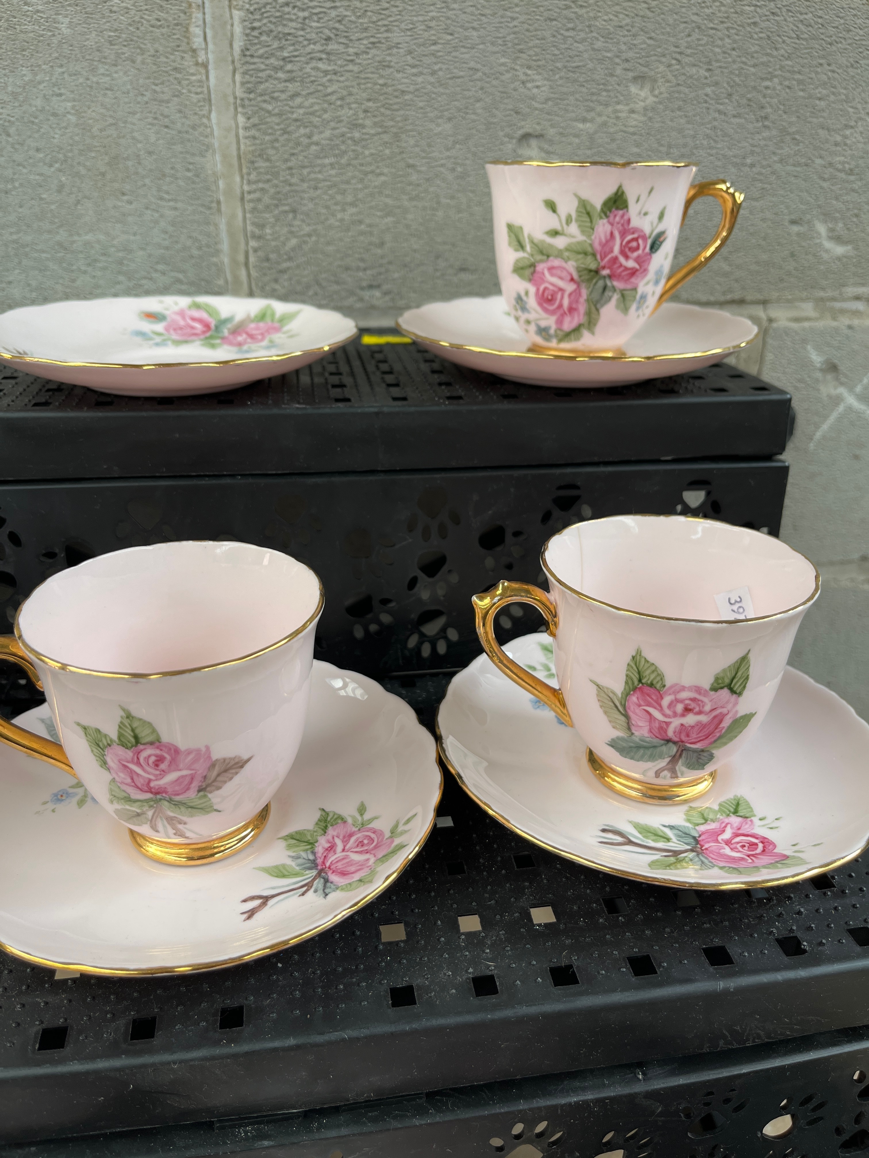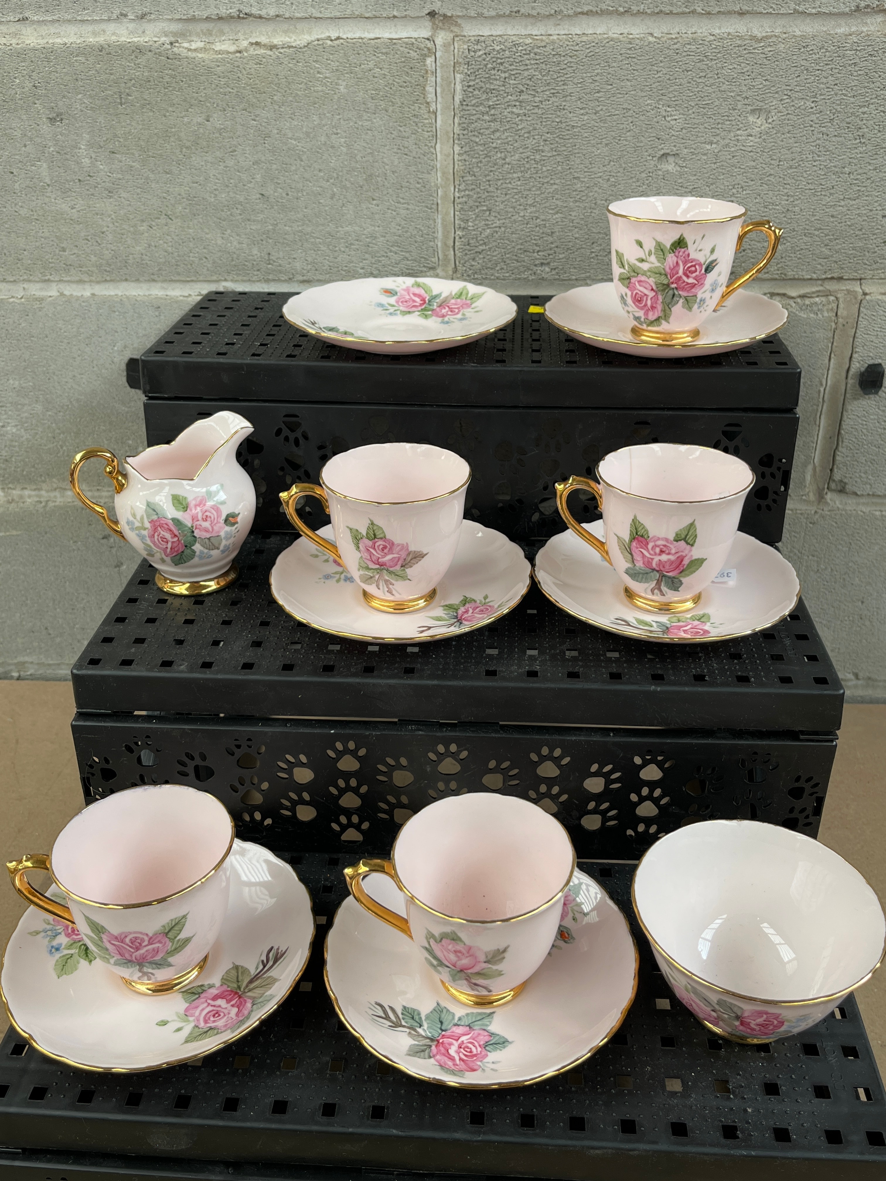 A collection of porcelain tea wares comprising six teacups, six saucers, two small plates, a creamer, and an open sugar bowl. Each piece features a light pink ground color with white interiors, adorned with a traditional floral motif of pink roses and green foliage. Extensive gold gilding is present on the rims, handles, and bases of all items, presenting an elegant and delicate style.