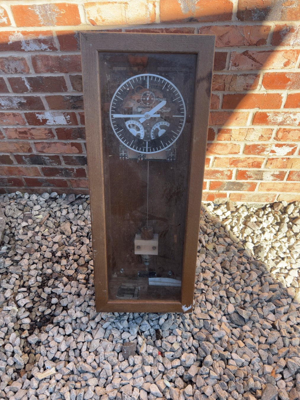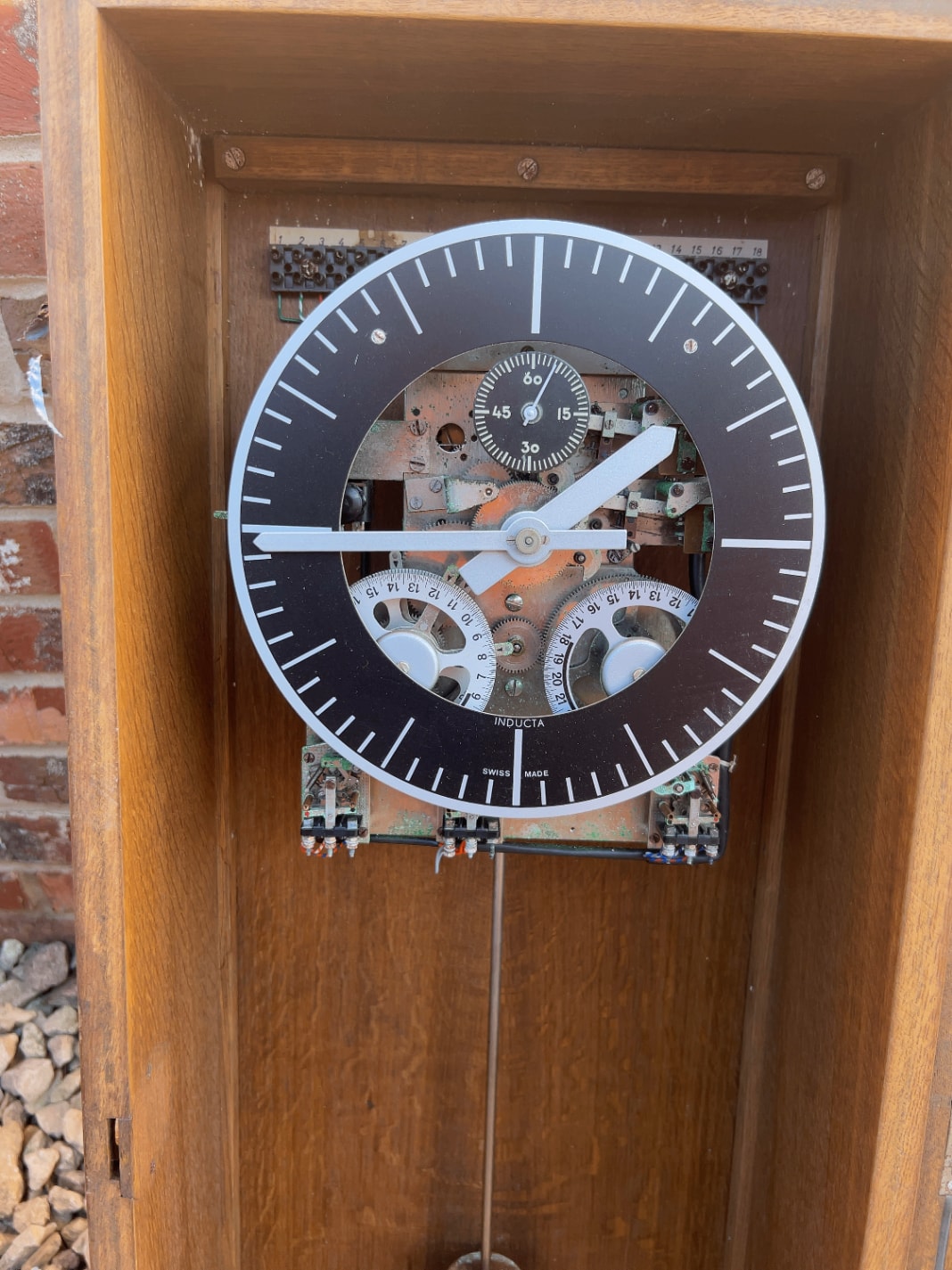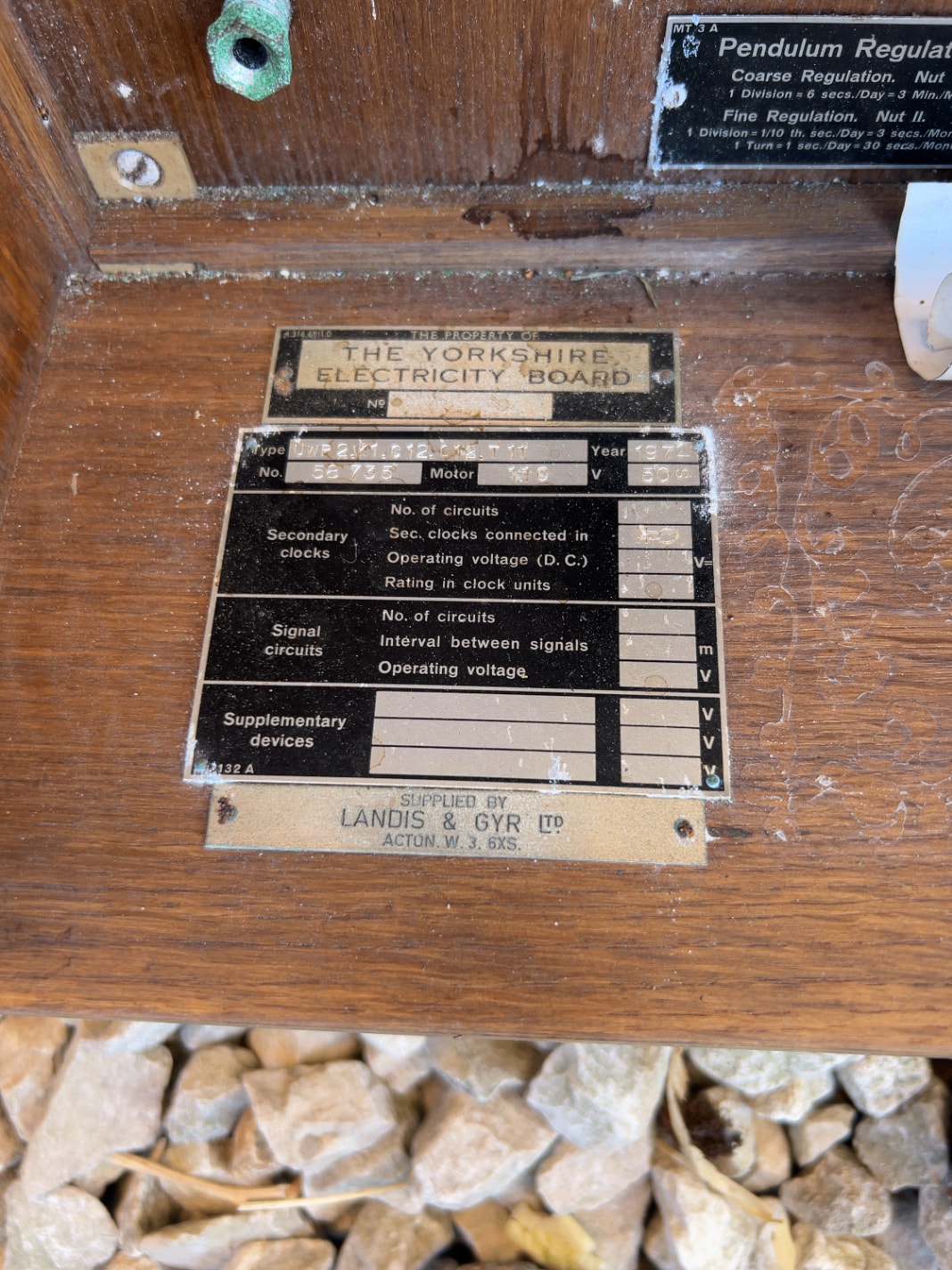 A vintage industrial master clock, housed in a rectangular wooden case with a glass front, revealing a pendulum and internal clockwork mechanism. The functional black and white dial, marked “INDUCTA” and “SWISS MADE,” features a main minute/hour track, a 60-second sub-dial, and two smaller geared indicator dials. Visible metal plaques inside confirm it was “THE PROPERTY OF THE YORKSHIRE ELECTRICITY BOARD” and “SUPPLIED BY LANDIS & GYR LTD ACTON W3. 8XS.,” with additional labels providing instructions for “PENDULUM REGULATION” and specifications for “Secondary clocks connected in” and “Signal circuits.” The clock exhibits an aged, utilitarian style likely from the mid-20th century.