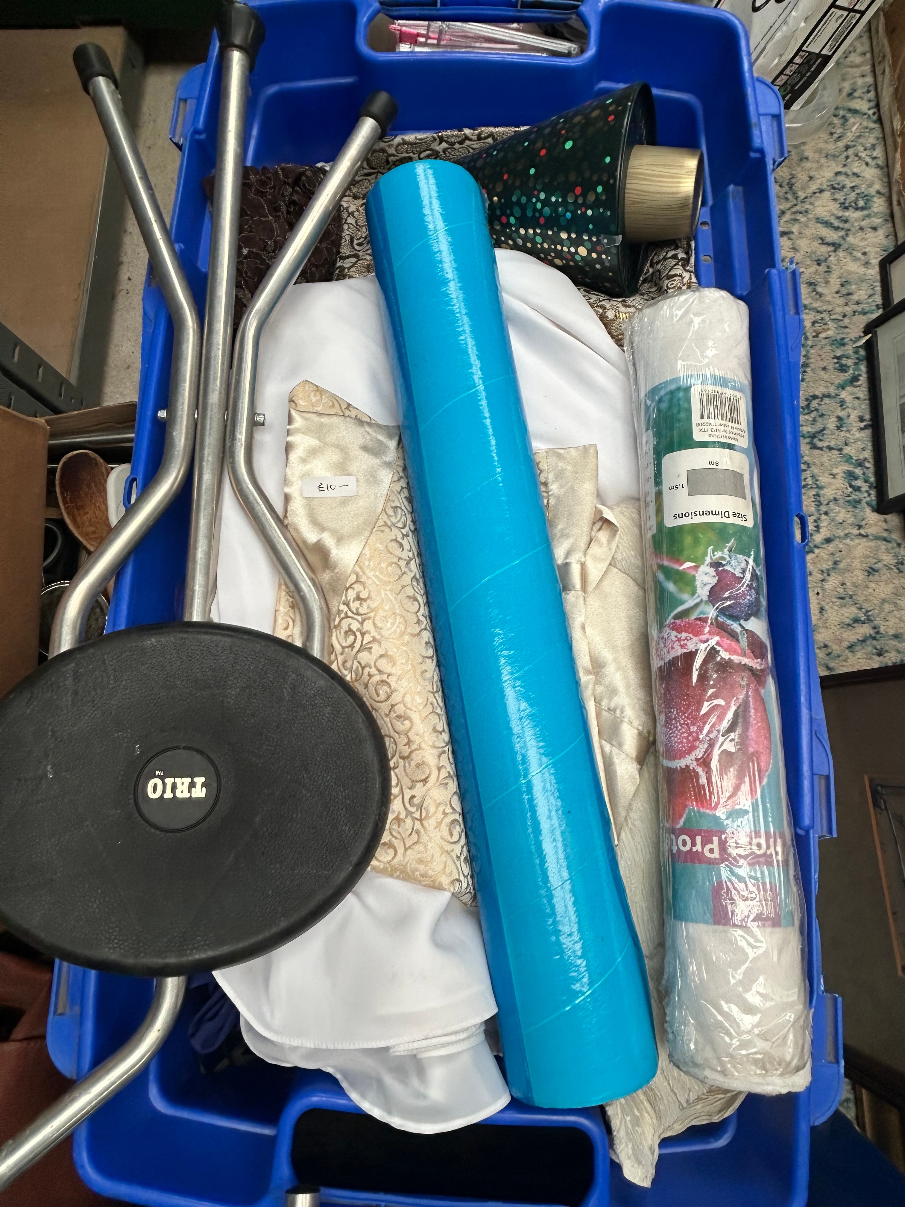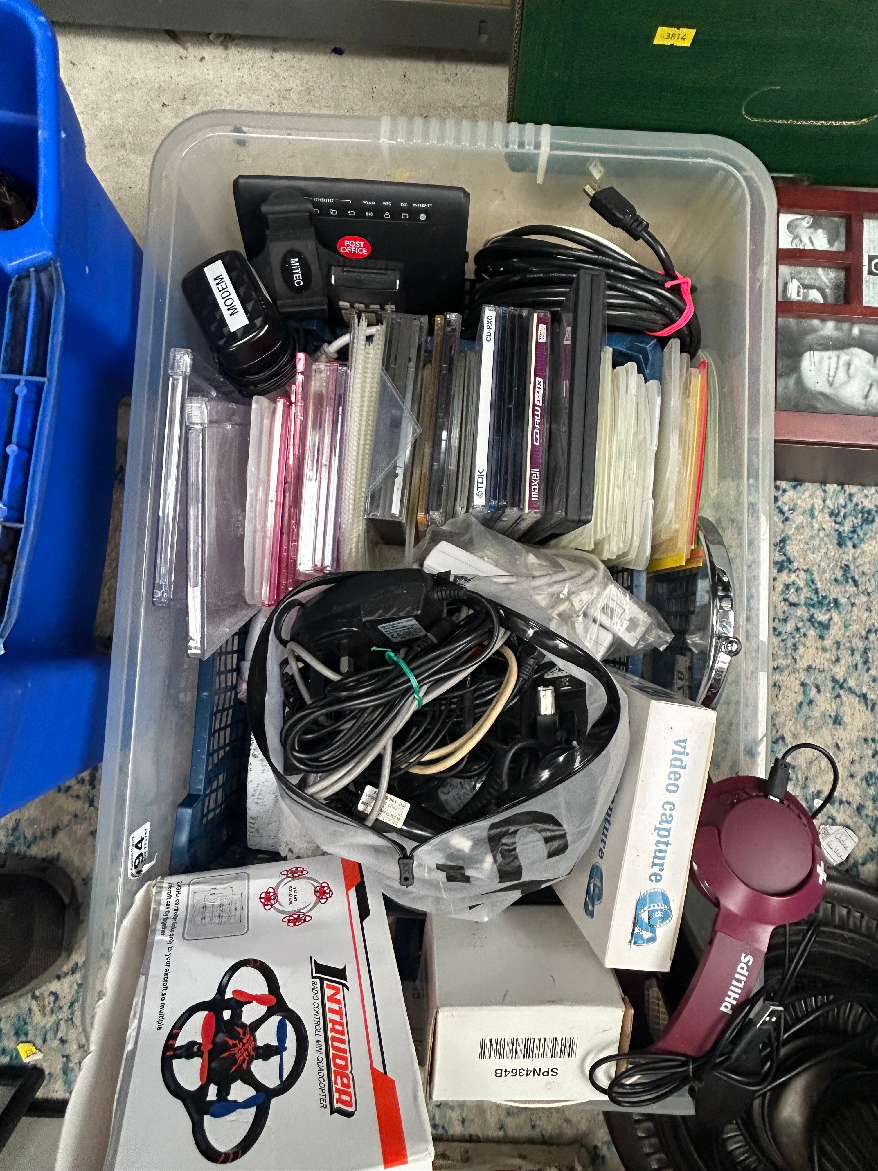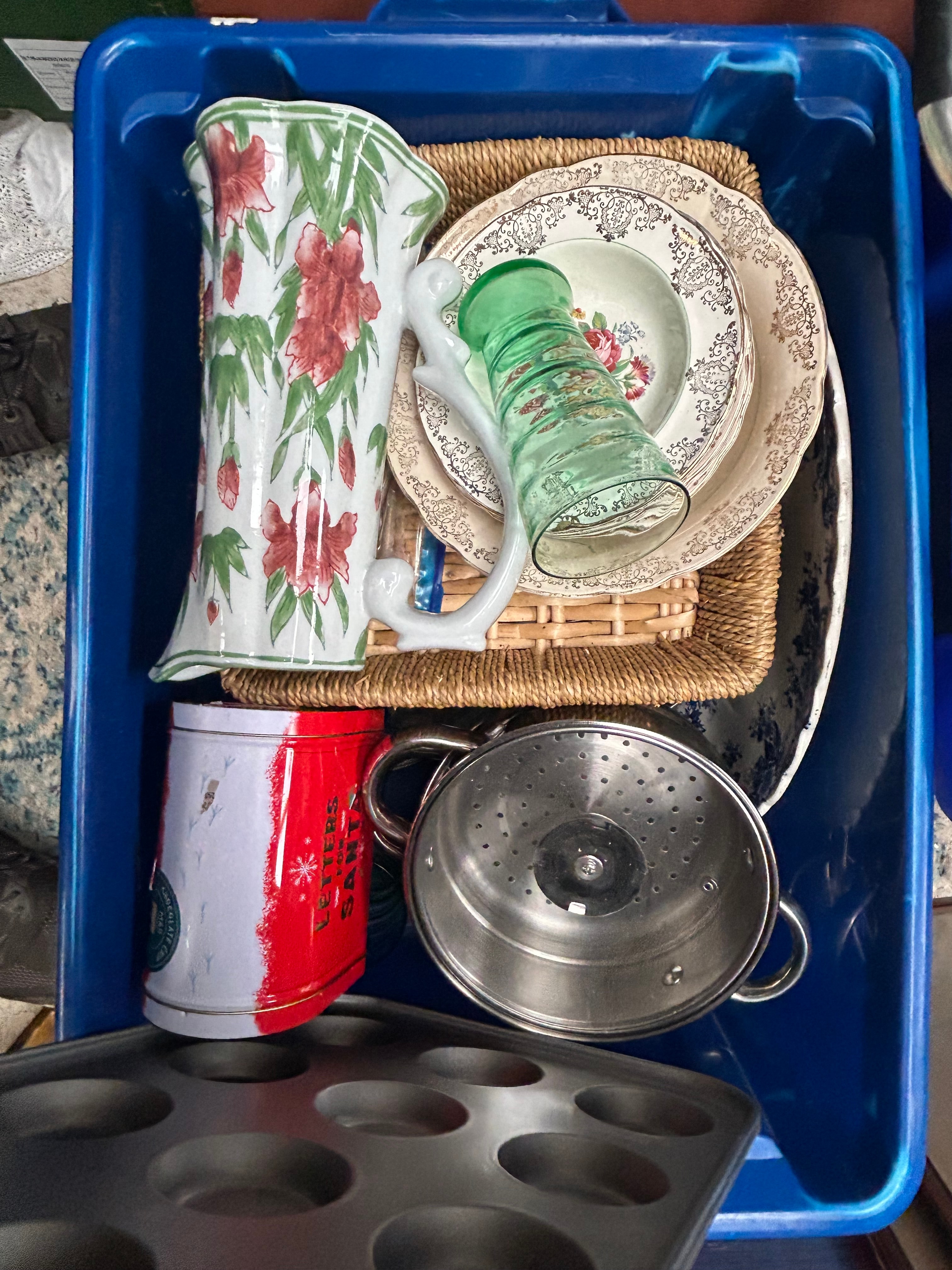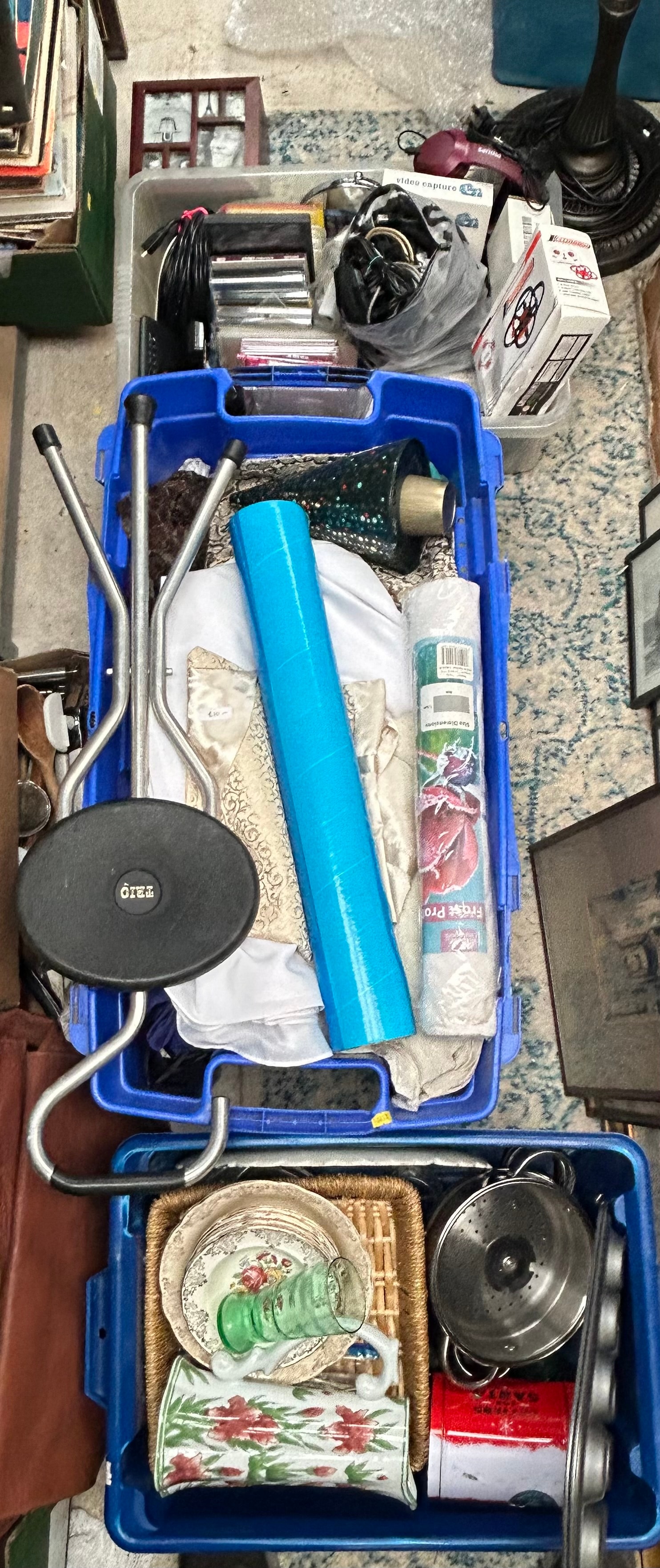 This lot presents a diverse collection of used household goods contained within multiple plastic storage bins, featuring predominantly ceramic, glass, metal, plastic, and fabric items. The assortment includes kitchenware such as a white ceramic vase with a prominent red floral design, an assortment of ceramic plates (some gilded, some with floral motifs), a green embossed glass, a stainless steel colander, and a red and white “LETTERS TO SANTA” metal tin. Textiles include white fabric, a cream and gold patterned vest bearing a “£10.-” price tag, and a wrapped roll of material marked “Pro” and “Site Dimensions”. General utility and electronics items consist of a “THIO” branded folding stool, a blue rolled mat, a green and black glittered cone, a “Post Office” branded modem, various cables, a “Philips” hairdryer, and packaged items identified as “video capture” equipment and an “INTRUDER quadrocopter” drone. This collection represents a mix of styles, from potentially vintage decorative objects to contemporary electronics.