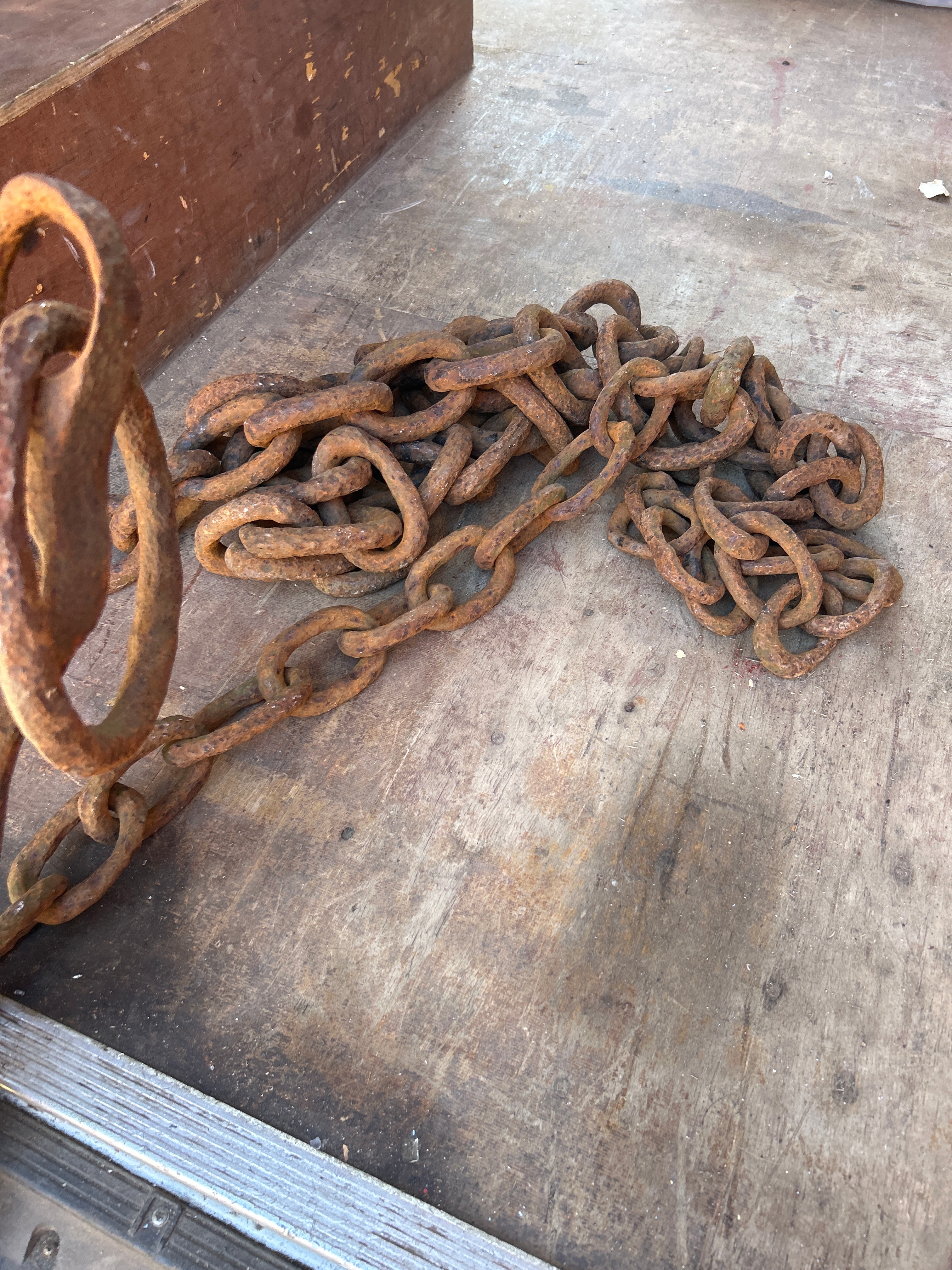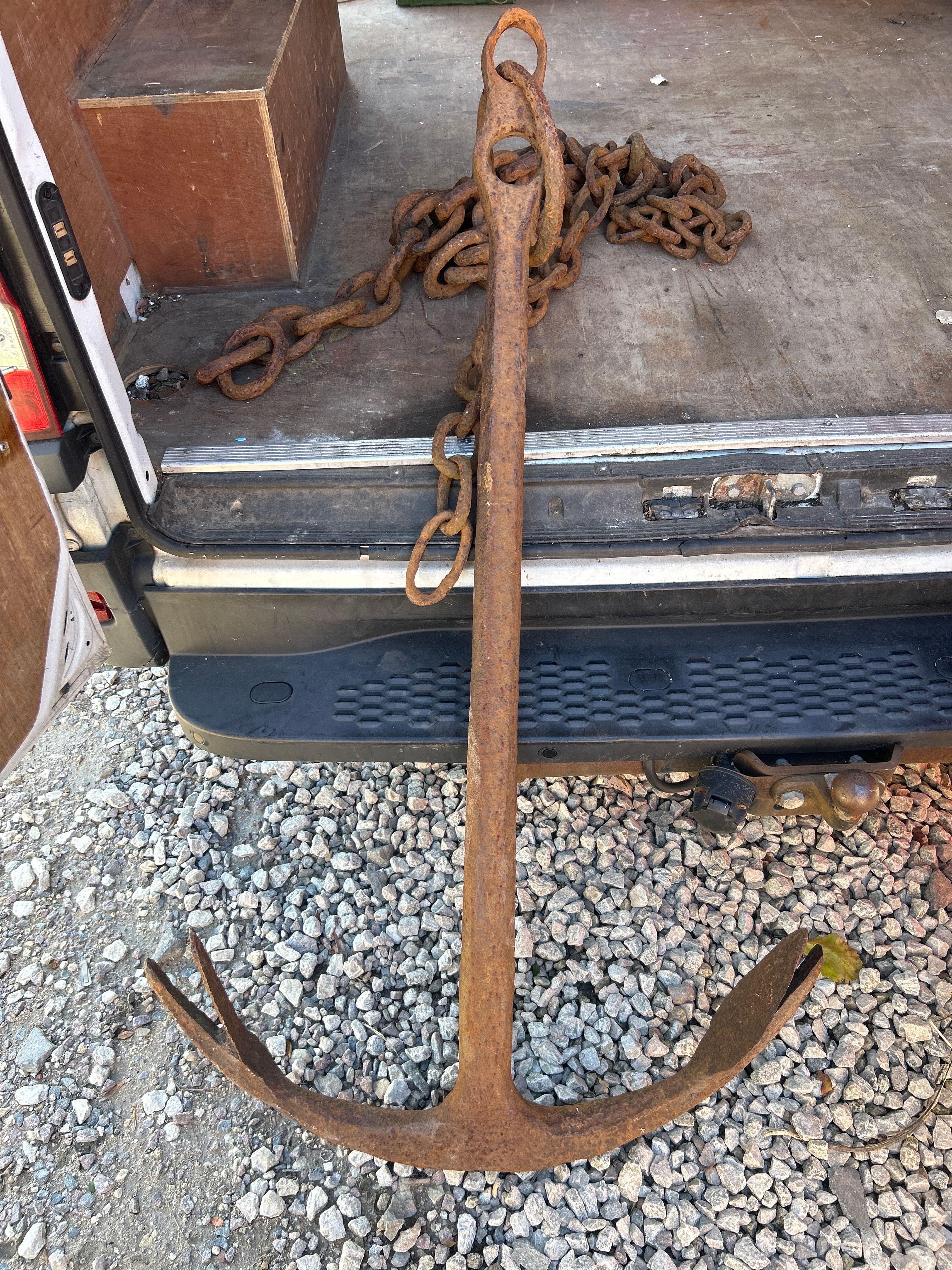 An antique nautical anchor of traditional two-fluke pattern, featuring a long shank with an integral ring at the top and two substantial, fixed flukes at the base. It is accompanied by a considerable length of similarly heavy-gauge metal chain, likely iron or steel, consistent with marine or industrial use.