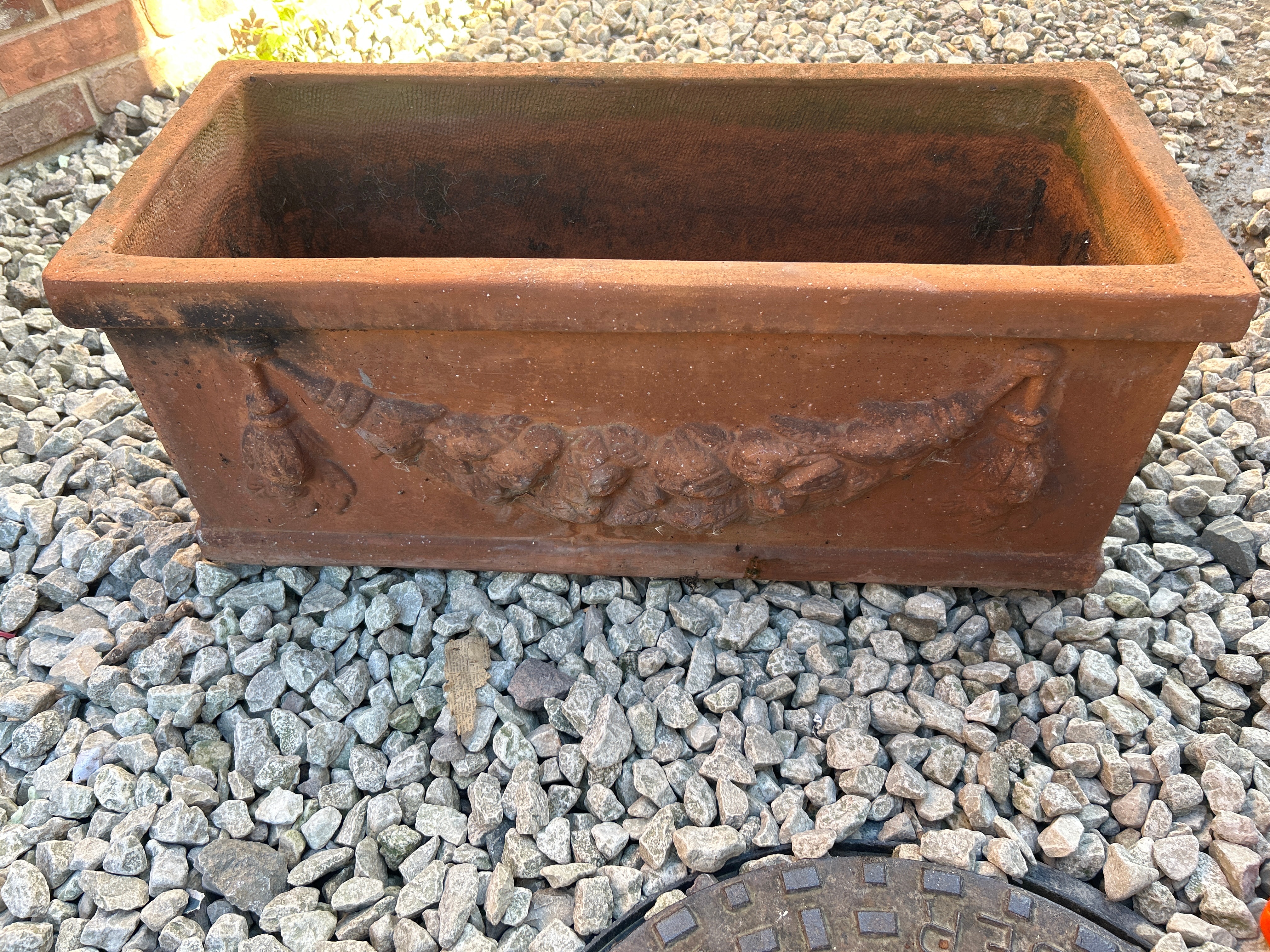An Italian Tuscan Terracotta rectangular box planter, constructed from unglazed terracotta or a similar ceramic material, exhibiting a reddish-brown base color. The front face features a continuous, low-relief decorative frieze depicting a classical-style swag or festoon motif with elements resembling tassels or fruit at the ends.