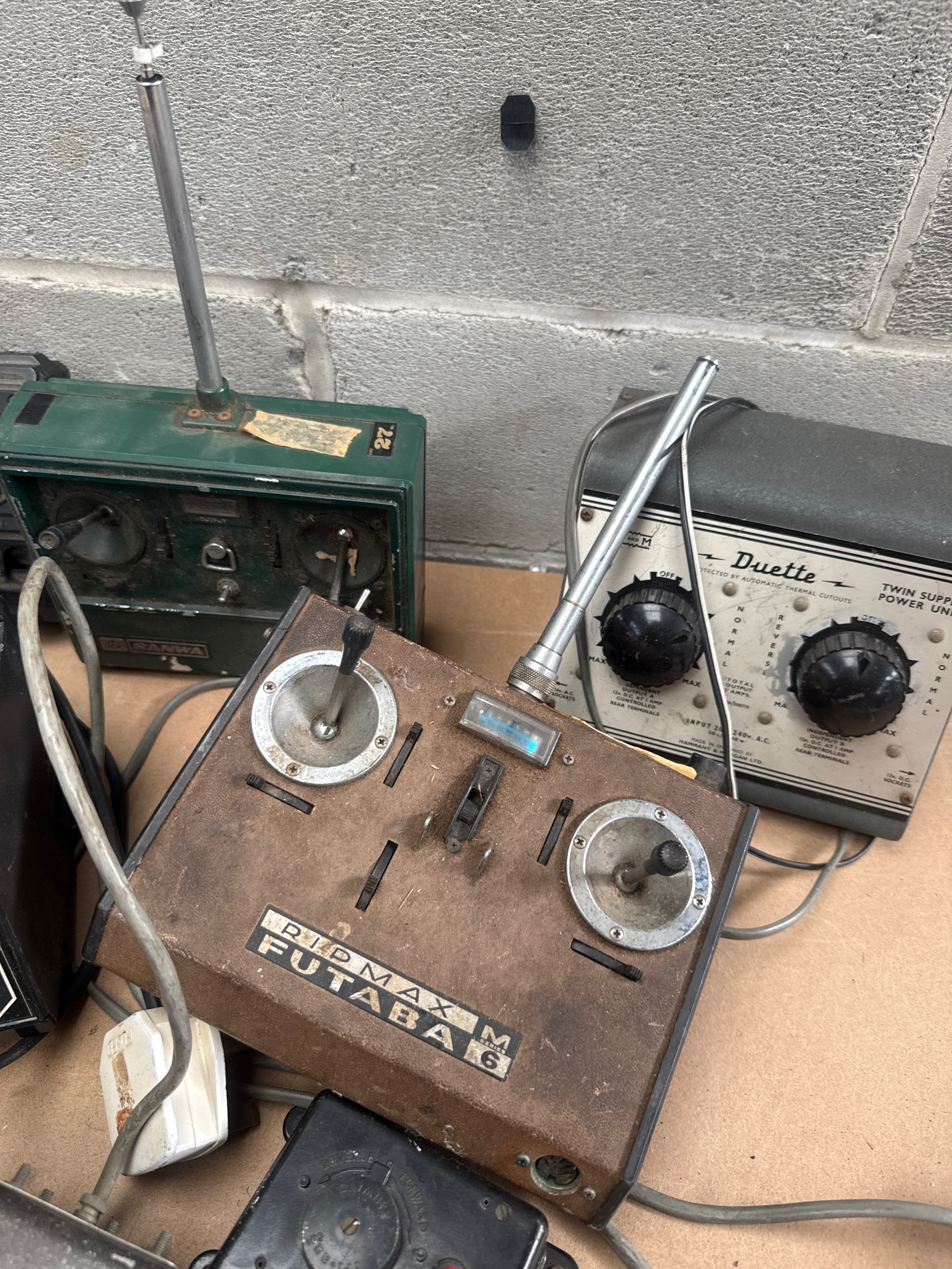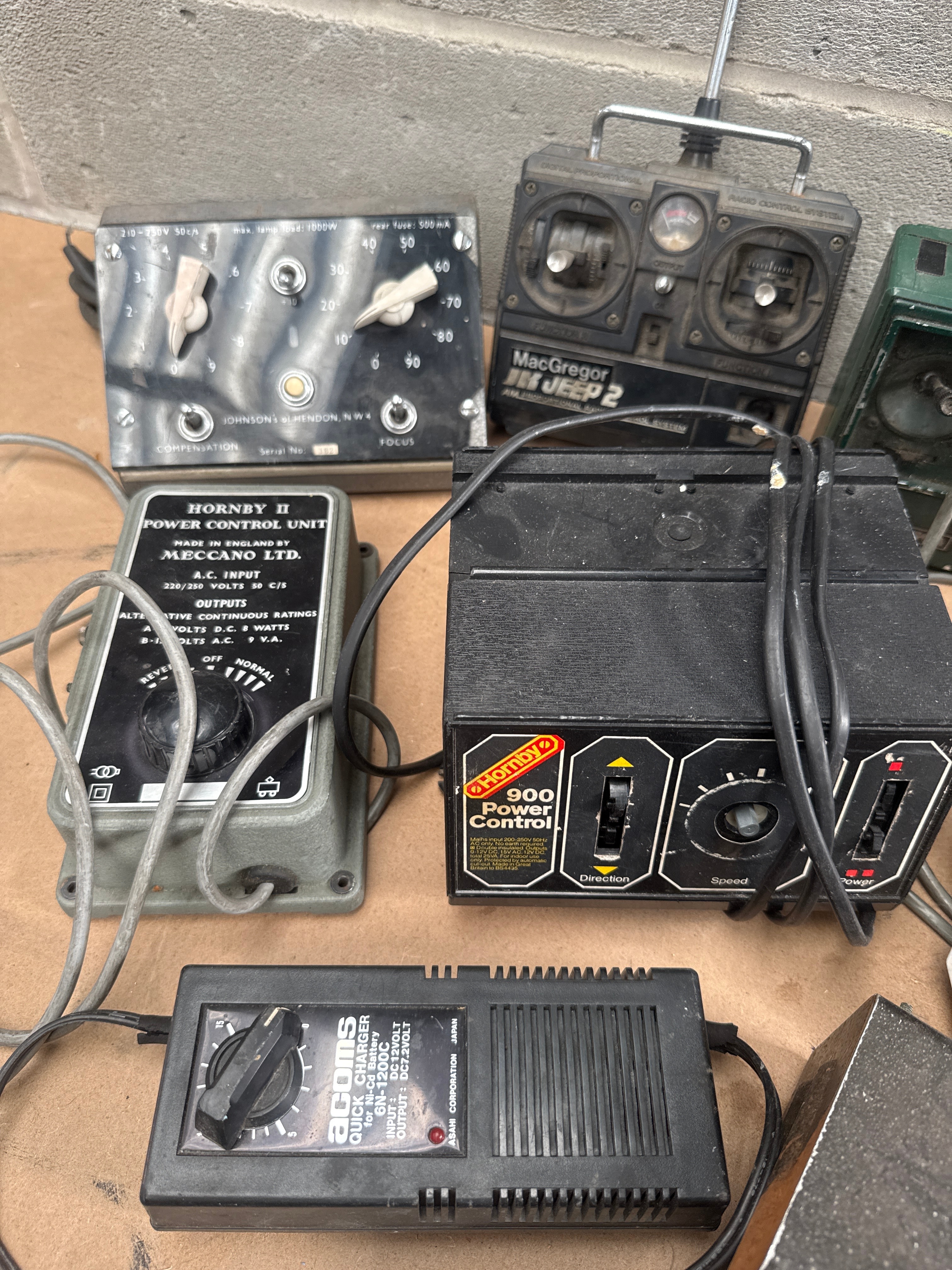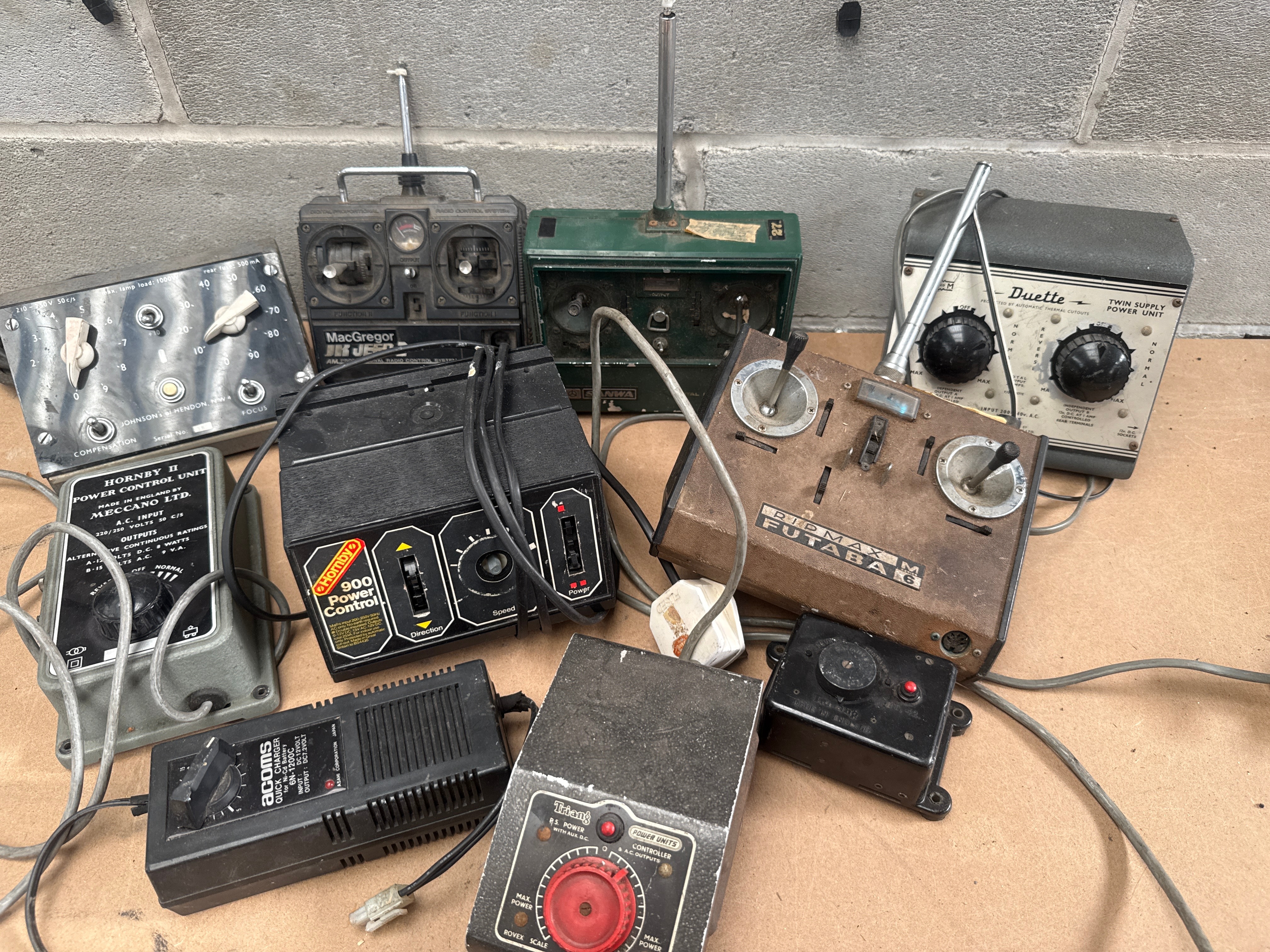 A group of vintage electronic control units, predominantly model railway power controllers and radio control (RC) transmitters, consistent with a mid-to-late 20th-century aesthetic. The items are constructed from various materials including painted metal and plastic casings, with one RC transmitter featuring a textured, possibly phenolic resin or wood-grain surface. Visible brand names and markings include “HORNBY II POWER CONTROL UNIT MECCANO LTD.,” “HORNBY 2000 Power Control,” “Triang POWER UNITS ROVEX SCALE MODELS LIMITED,” “DUETTE TWIN SUPPLY CONTROL UNIT,” “MacGregor JEEP 2,” “FUTABA M FUTABA 6,” and an “ACOM A.C. ADAPTOR” labeled “MADE IN JAPAN.” Additionally, a unit marked “JOHNSON’S of HENDON, N.W.4” with “DURATION” and “FOCUS” controls suggests a photographic enlarger timer. Approximately eleven units are included in the lot.