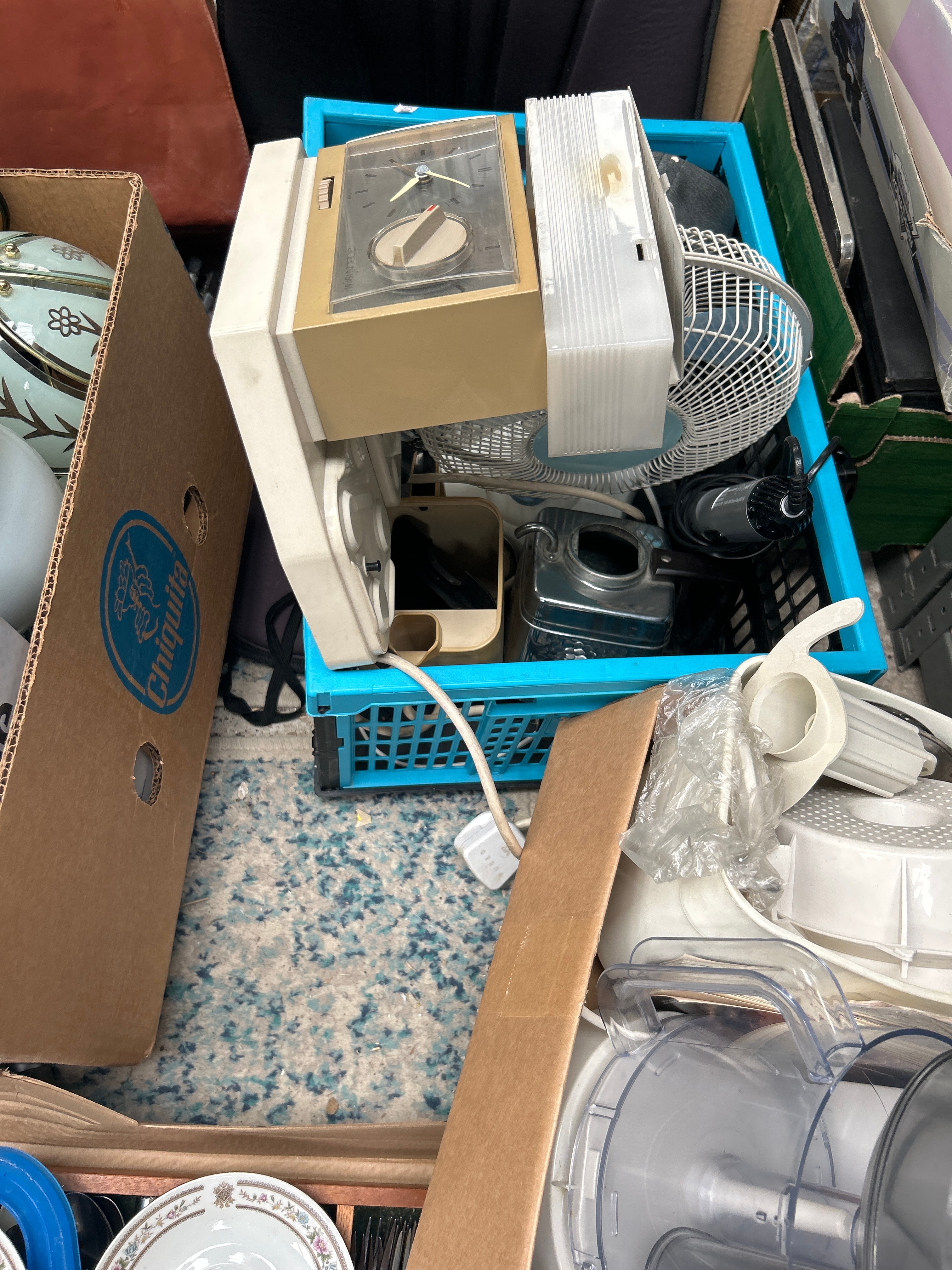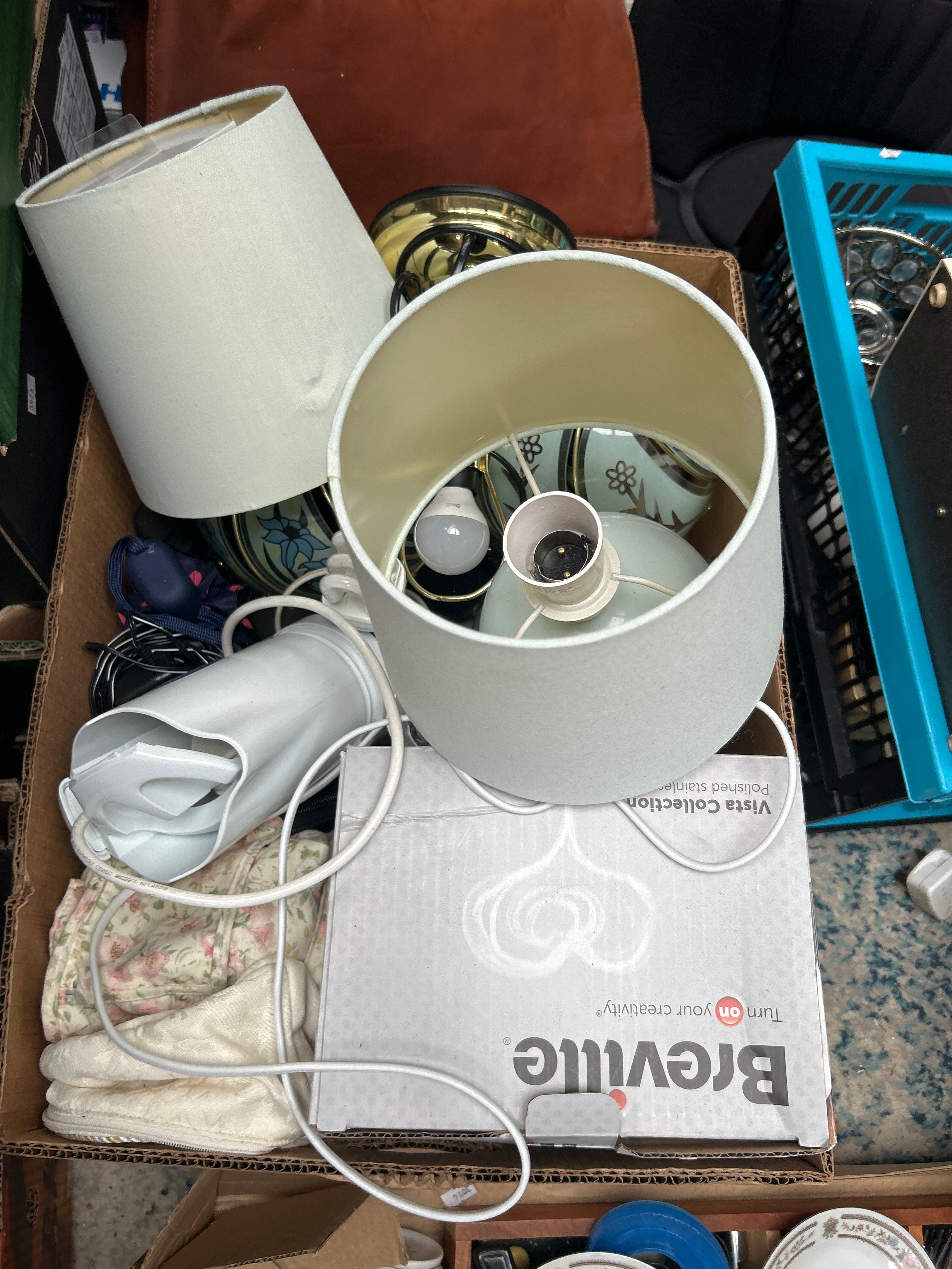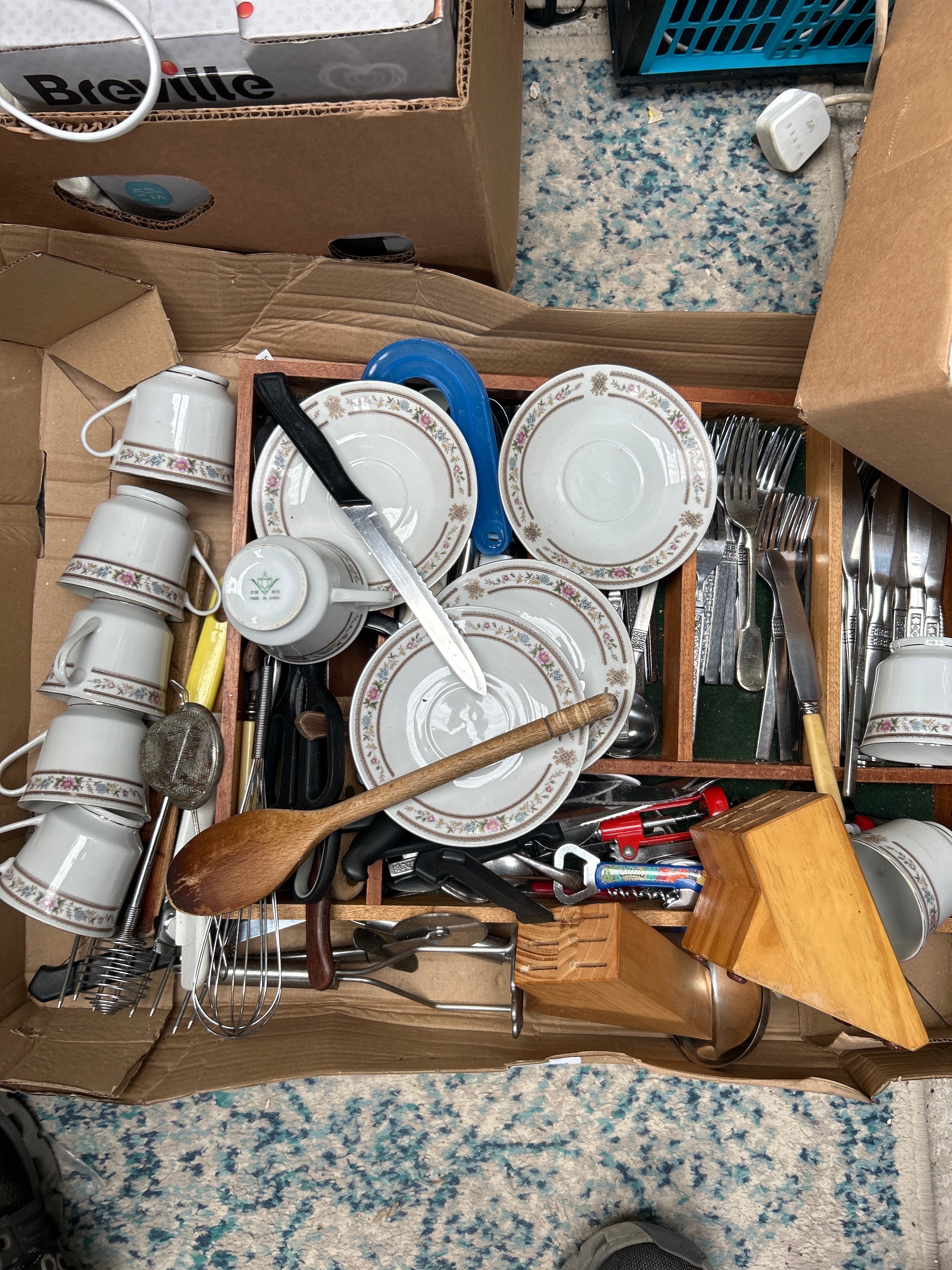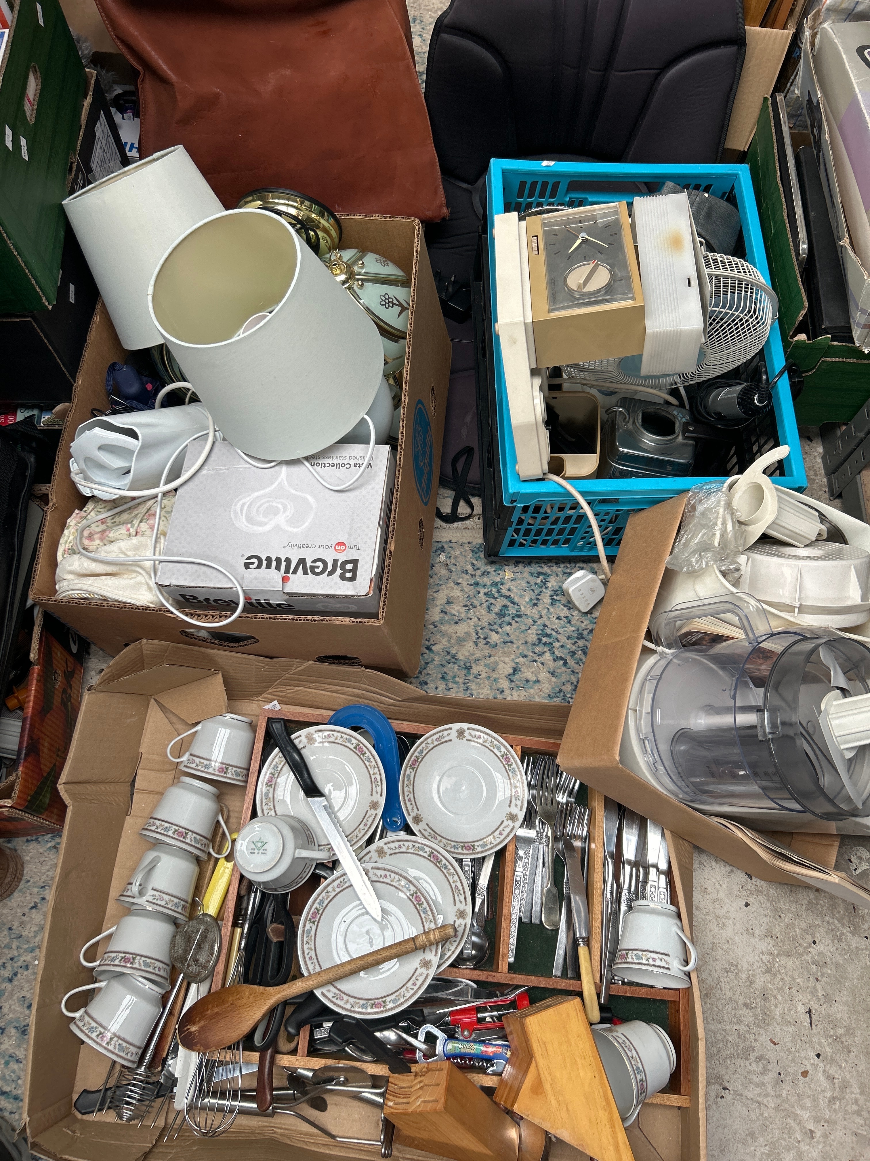 This lot comprises a varied collection of household goods, primarily kitchenware, small appliances, and lighting components, presented in cardboard boxes and a plastic crate. The kitchenware includes multiple white ceramic teacups and saucers with floral patterns, one marked “JAPAN” on the underside, alongside a diverse array of stainless steel cutlery, wooden utensils, a knife block, and clear plastic food processor components. Small electrical appliances visible are a small white fan, a beige clock-like unit with a partially visible “Vent” marking, and other small kitchen electrics, with one product box indicating “Breville Vista Collection Polished stainless steel.” Lighting elements consist of two fabric lamp shades and a gold-toned, ornate metal lamp base.