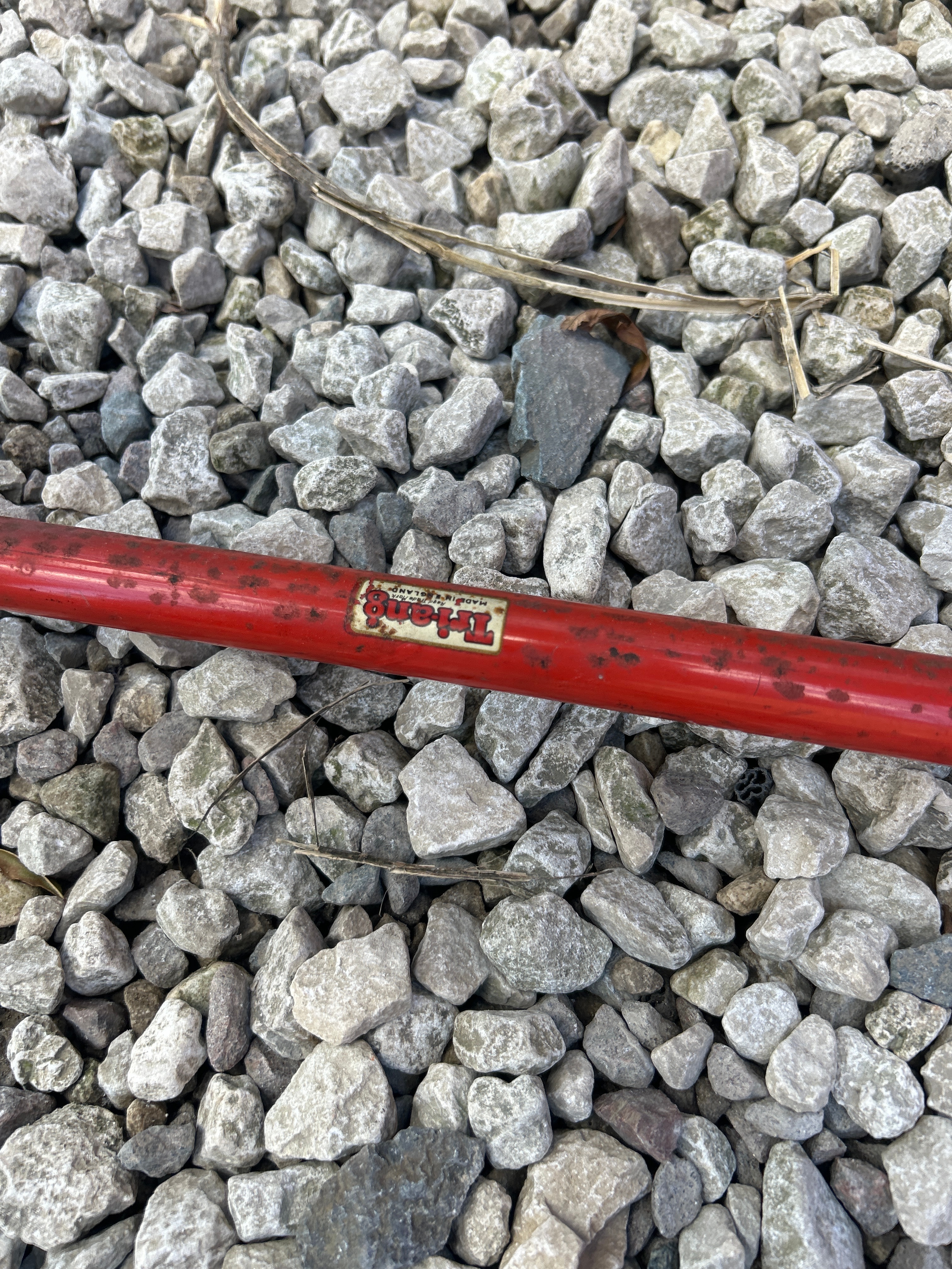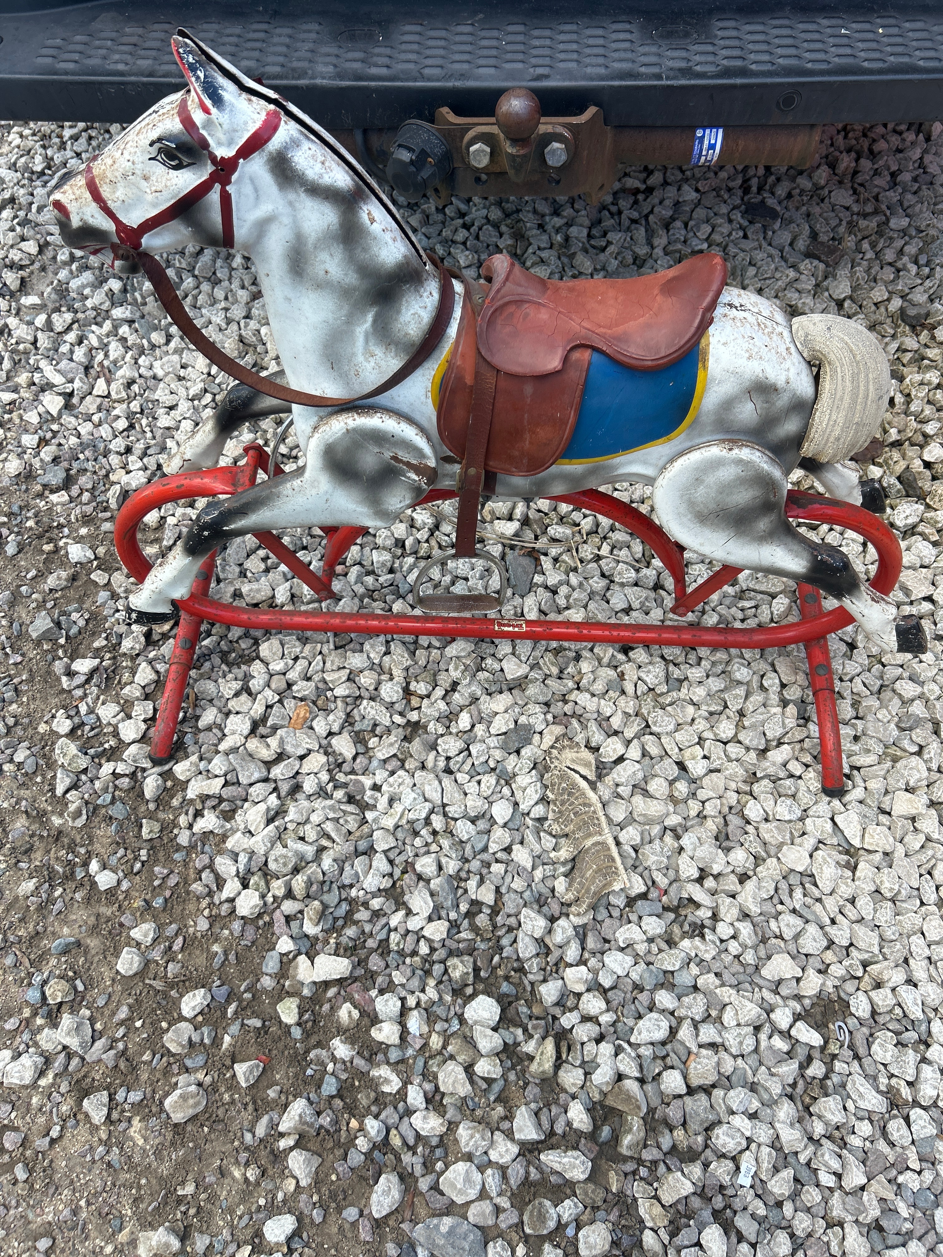 A Triang mid-century child’s rocking horse, made in England. The toy features a molded plastic or composite body, painted in a dapple grey and white finish with black hooves and bridle accents. It has a fibrous, light-colored mane and tail. The horse is fitted with a brown, possibly faux leather, saddle with a blue and yellow base. It is mounted on a red-painted tubular metal rocking stand. A label on the red frame reads “Trio Toys” and “MADE IN ENGLAND”.