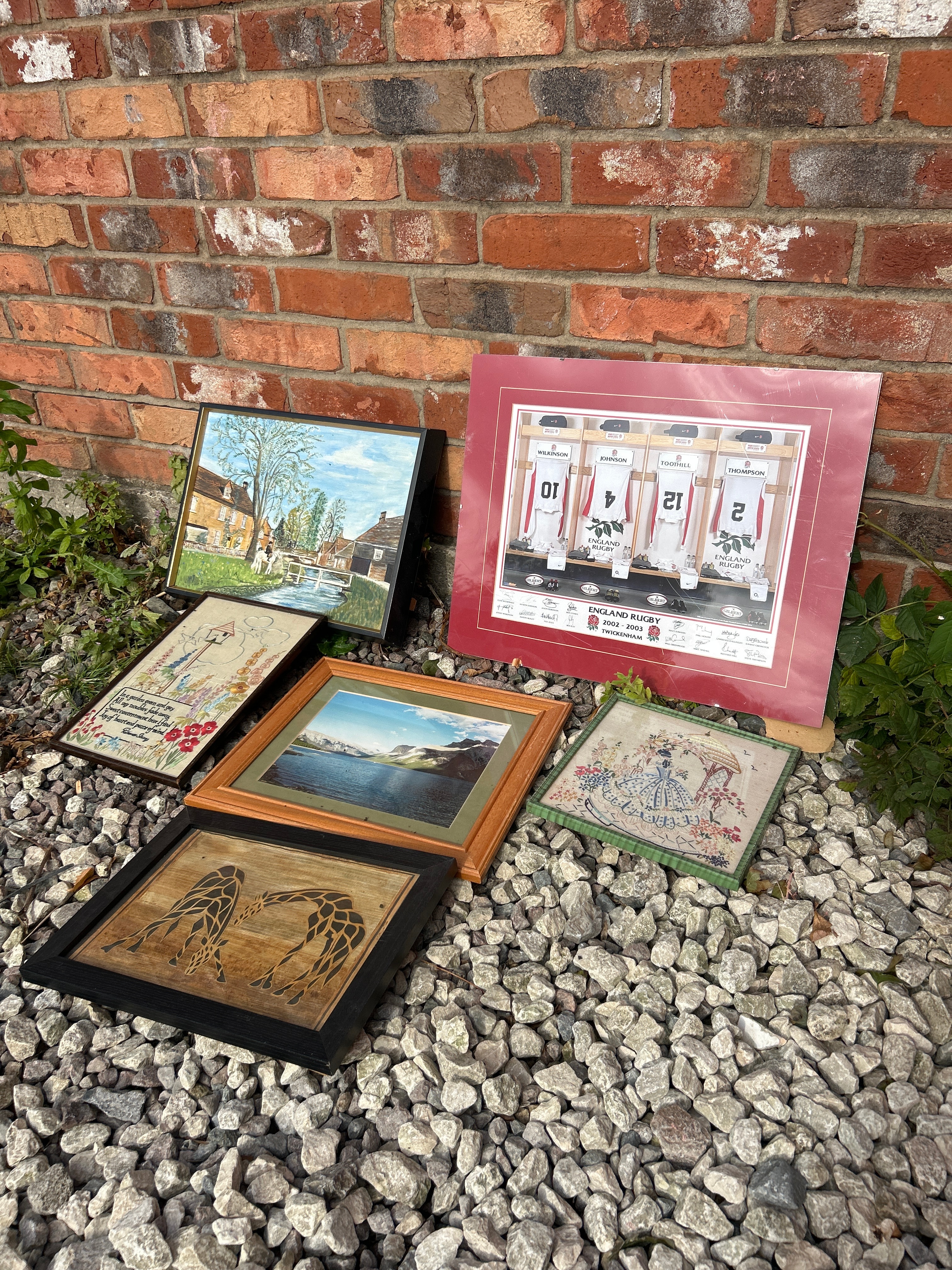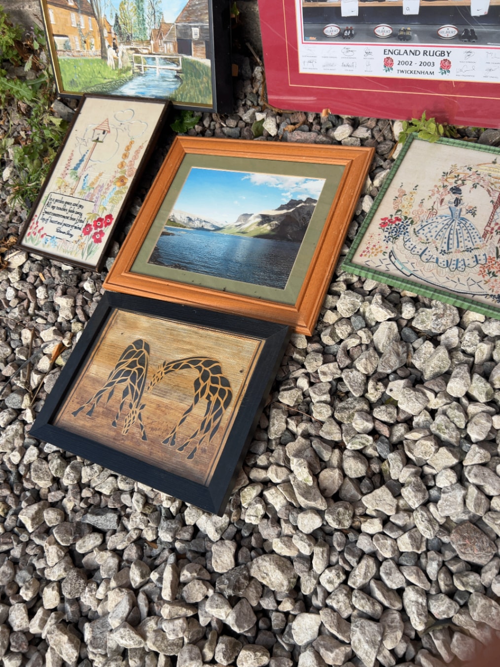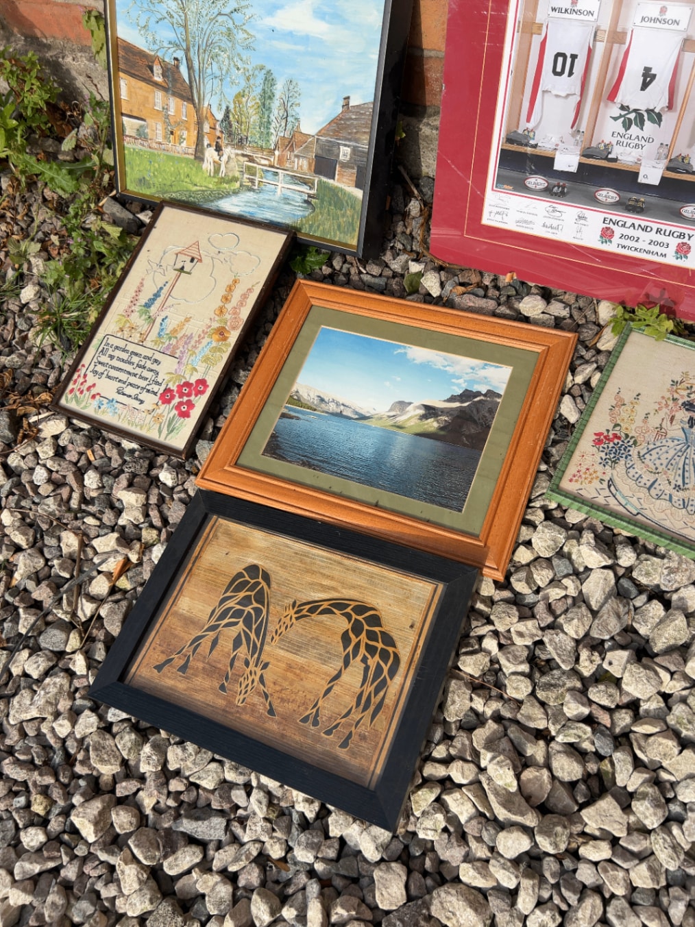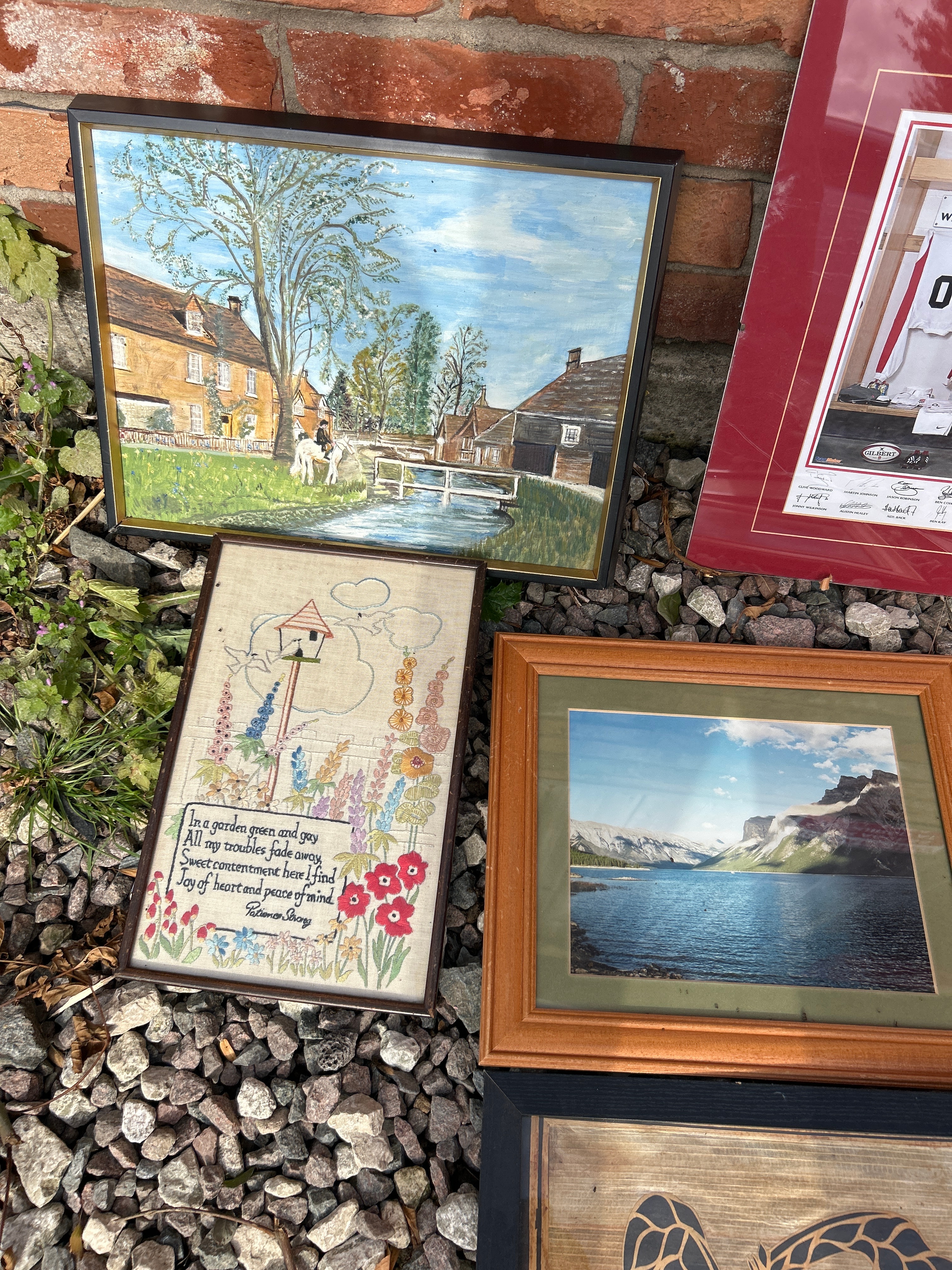 Materials vary across paintings, embroidery, photography, and possibly wood art, all housed in various wood or composite frames.