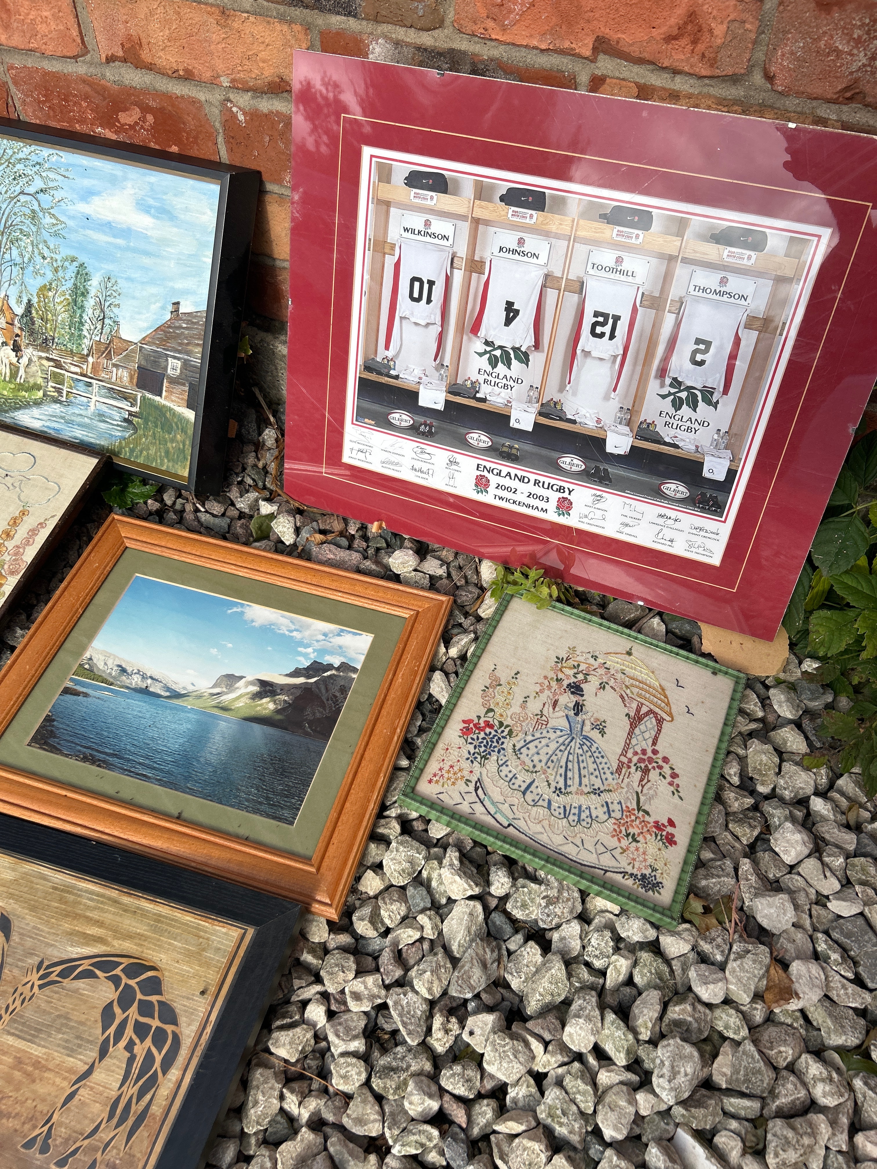 1. A framed commemorative display for “ENGLAND RUGBY 2002 – 2003 TWICKENHAM,” featuring printed images of four rugby jerseys with player names “WILKINSON,” “JOHNSON,” “TOOTHILL,” and “THOMPSON,” and numbers “01,” “4,” “21,” “2,” set in a red mat.