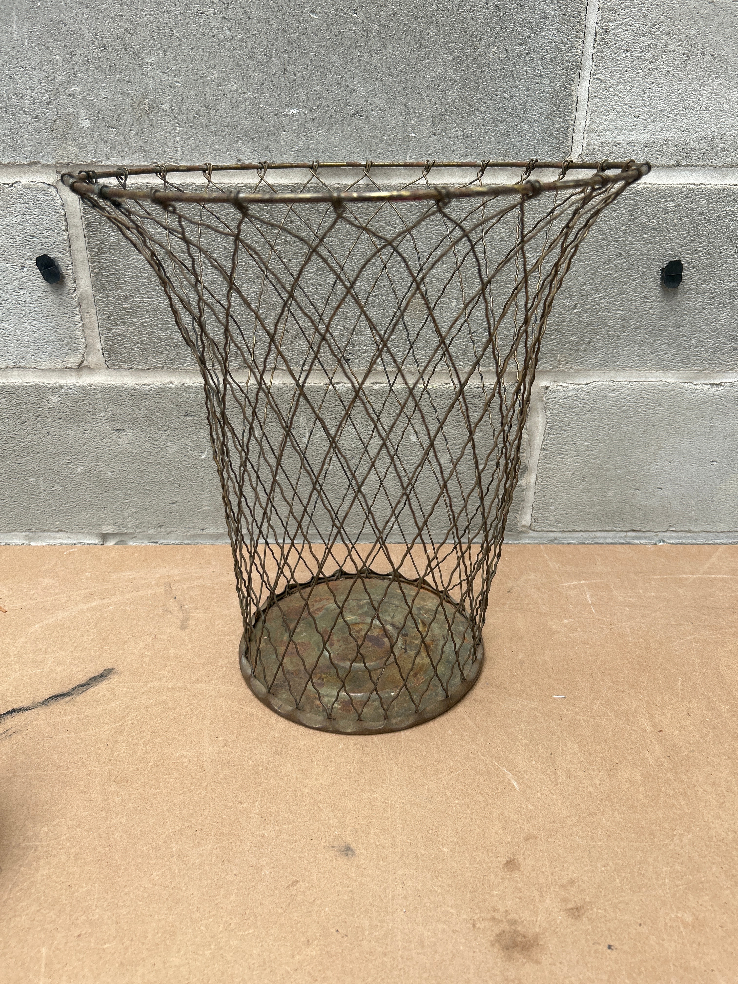 A conical-shaped wire basket, possibly for waste or storage, constructed from interwoven metal wire forming a crisscross pattern, set on a solid, circular metal base. The item is made from metal wire and a solid metal base. There are no visible text, markings, or manufacturer’s stamps.