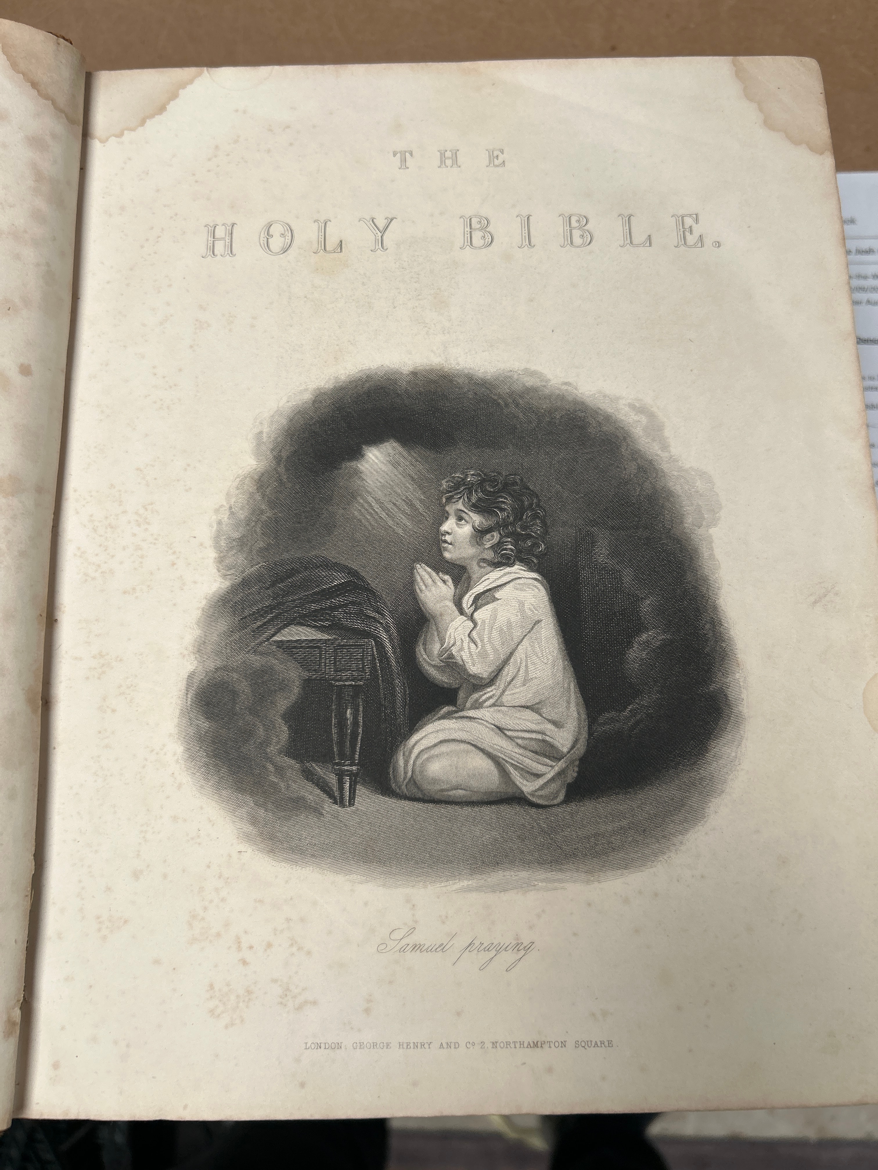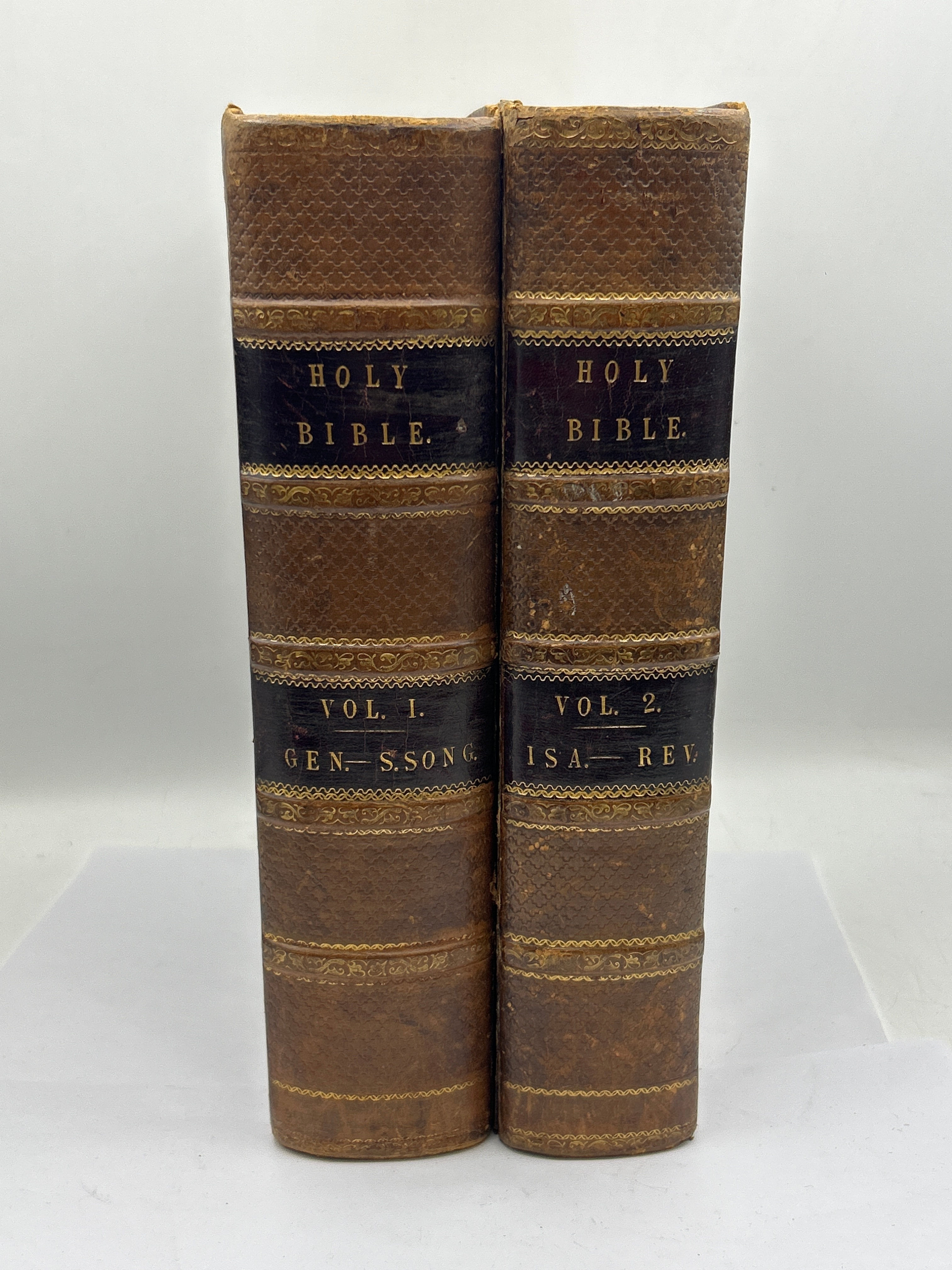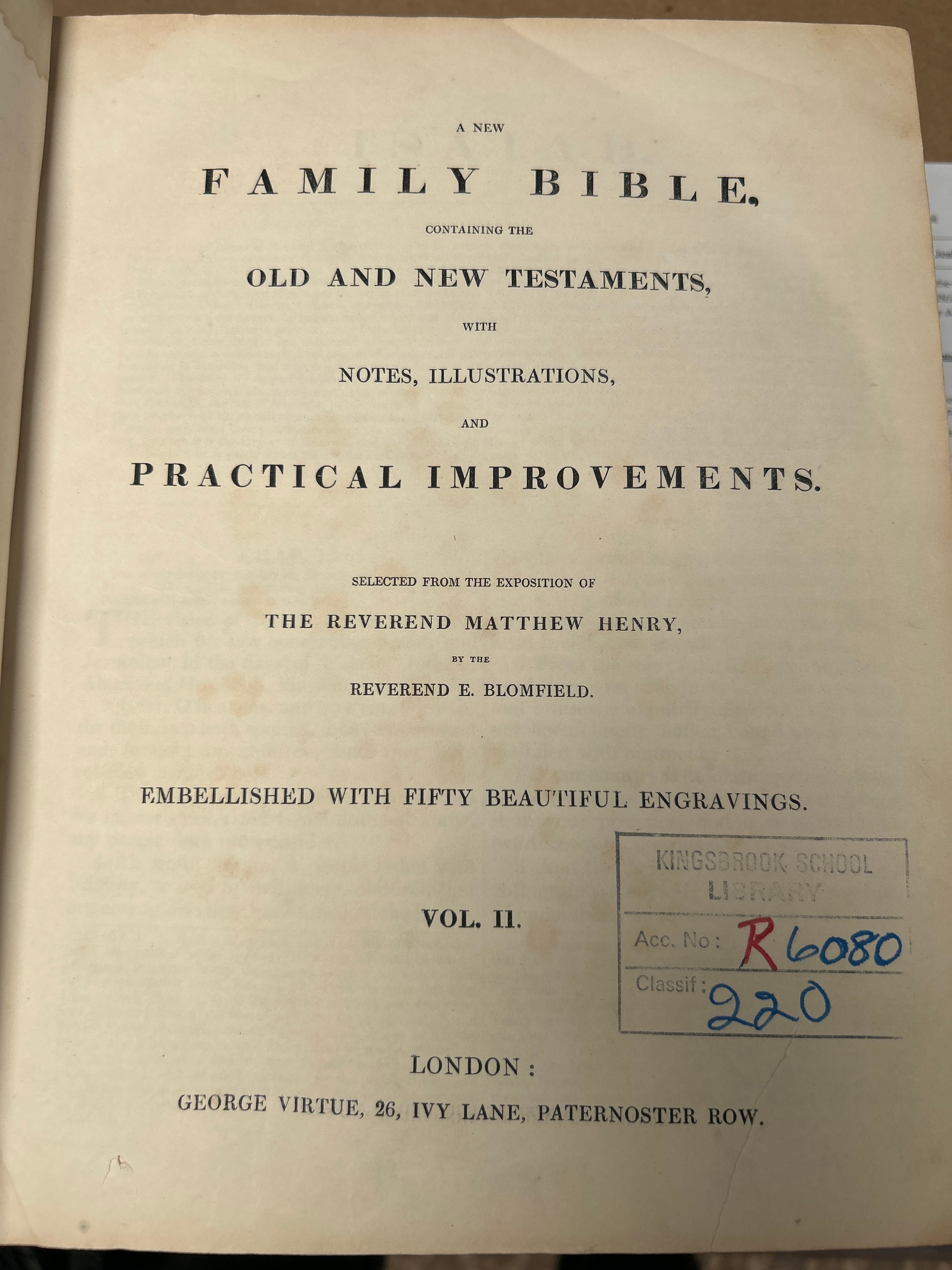 A two-volume set of “A New Family Bible,” containing the Old and New Testaments, selected from the exposition of the Reverend Matthew Henry, by the Reverend E. Blomfield, published circa 1850. The edition is embellished with fifty engravings, one of which depicts “Samuel praying.” Volume 1 covers Genesis through Song of Solomon (“GEN—S SONG”), and Volume 2 covers Isaiah through Revelation (“ISA—REV”). Publishers noted include George Henry and Co and George Virtue of London. Volume II bears a “KINGSBROOK SCHOOL LIBRARY” stamp with accession number R6080 and classification 220. The books are bound in brown leather or similar material with ribbed spines, dark title labels, and gilt lettering.
