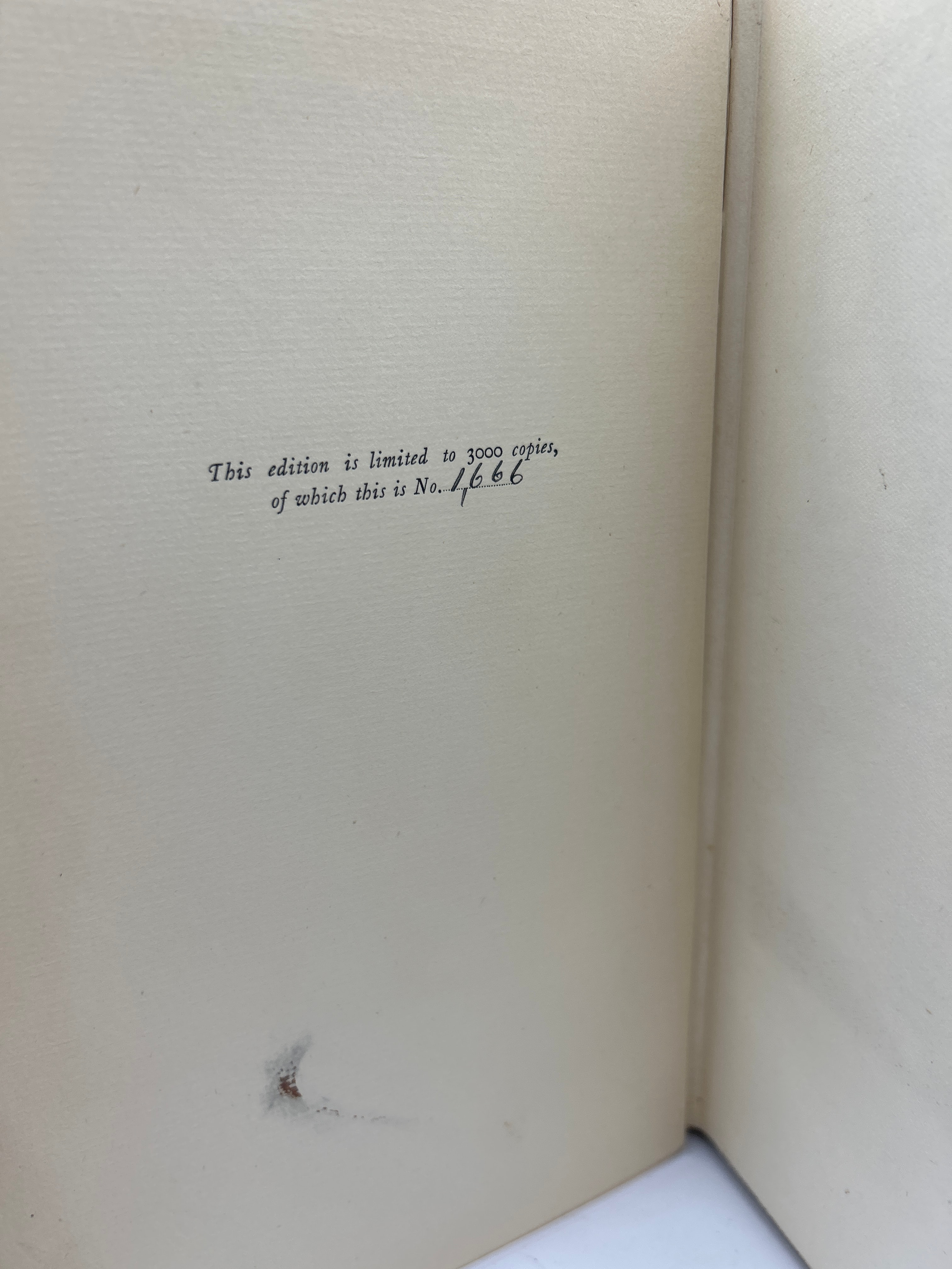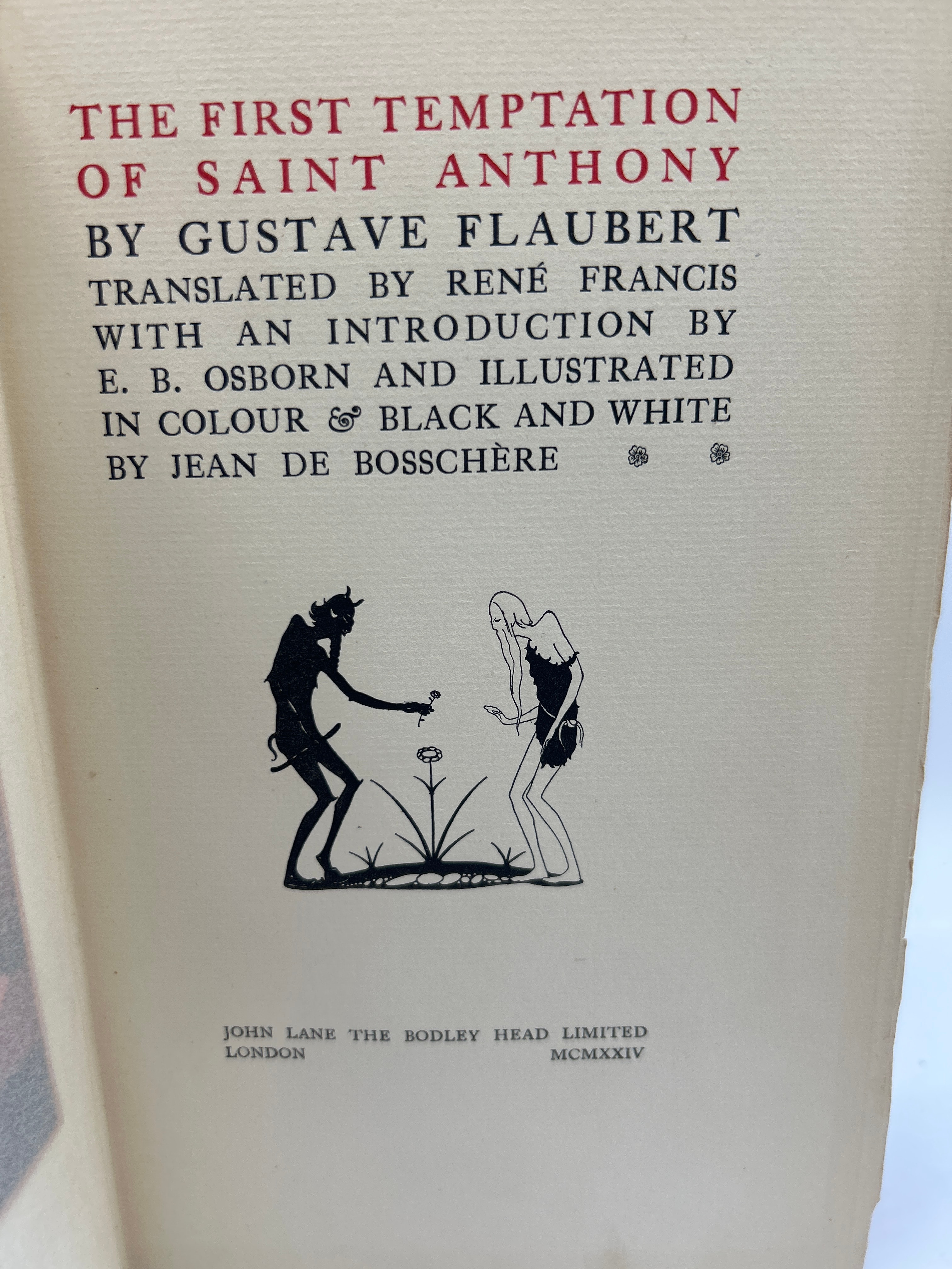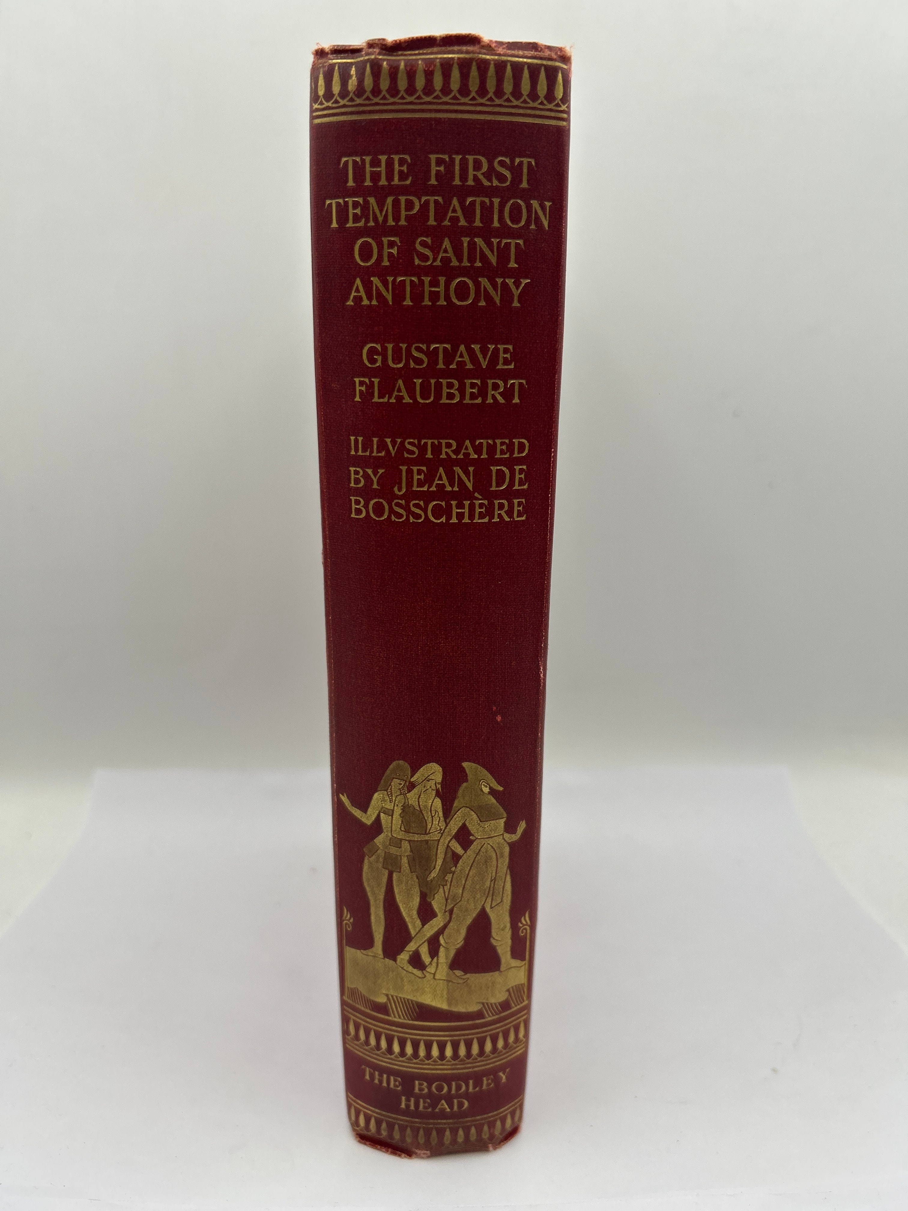 Gustave Flaubert, *The First Temptation of Saint Anthony*, Limited Edition, published by John Lane The Bodley Head Limited, London, 1924. Translated by René Francis and illustrated by Jean de Bosschère. This red cloth-bound hardcover book features an Art Deco aesthetic with gold gilt illustrations. The front cover displays a central circular gold gilt motif of a dancing figure, complemented by decorative elements in the corners. The spine is adorned with the title, author, illustrator, and publisher in gilt lettering, along with a lower gilt illustration depicting three figures. An internal limitation page states, “This edition is limited to 3000 copies, of which this is No. 1,666.” The title page includes a small black and white illustration of a horned figure presenting a flower to another figure.