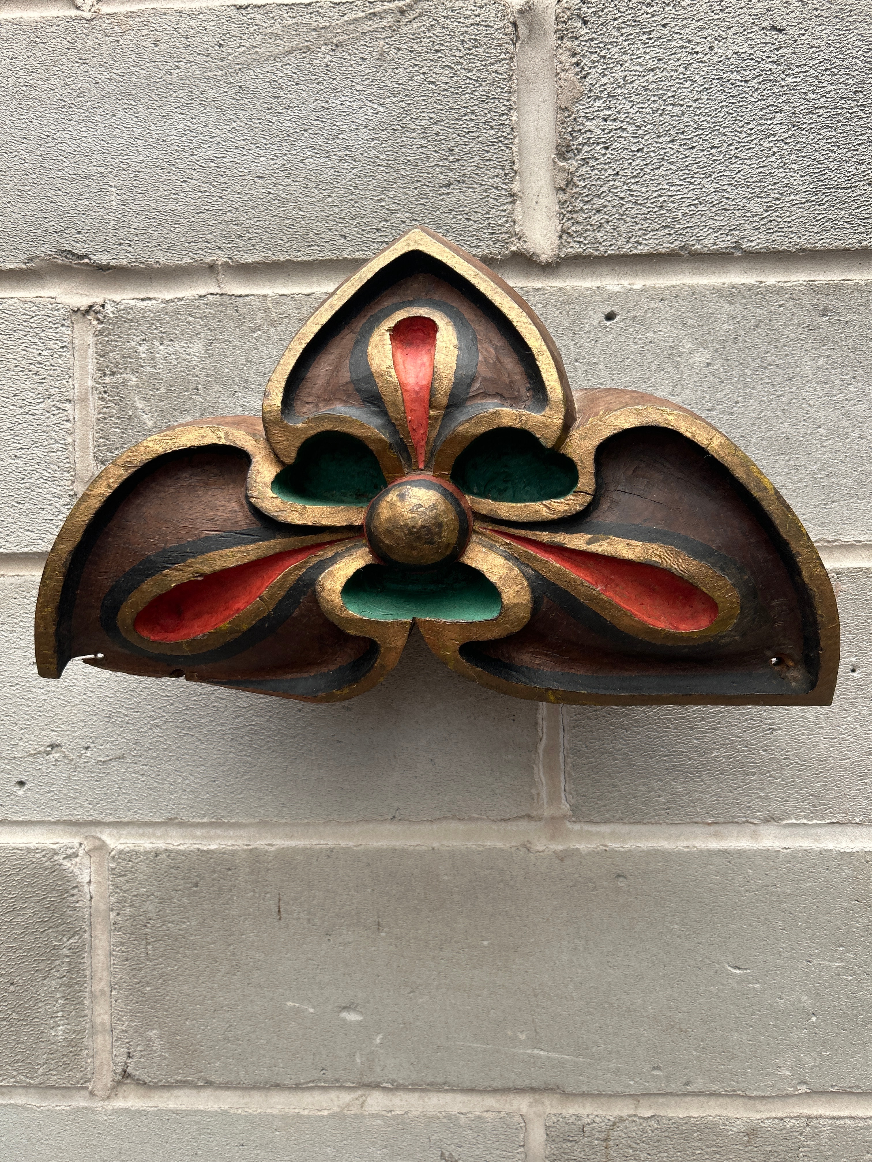 A carved and polychromed wooden decorative architectural element, possibly a bracket or frieze fragment, featuring a symmetrical, stylized foliate or floral motif resembling a fleur-de-lis. The design incorporates carved details outlined with gold gilding or paint, accented with sections of vibrant red and deep green pigment, set against a dark brown or black background and the natural wood grain. No discernible text or markings are visible.