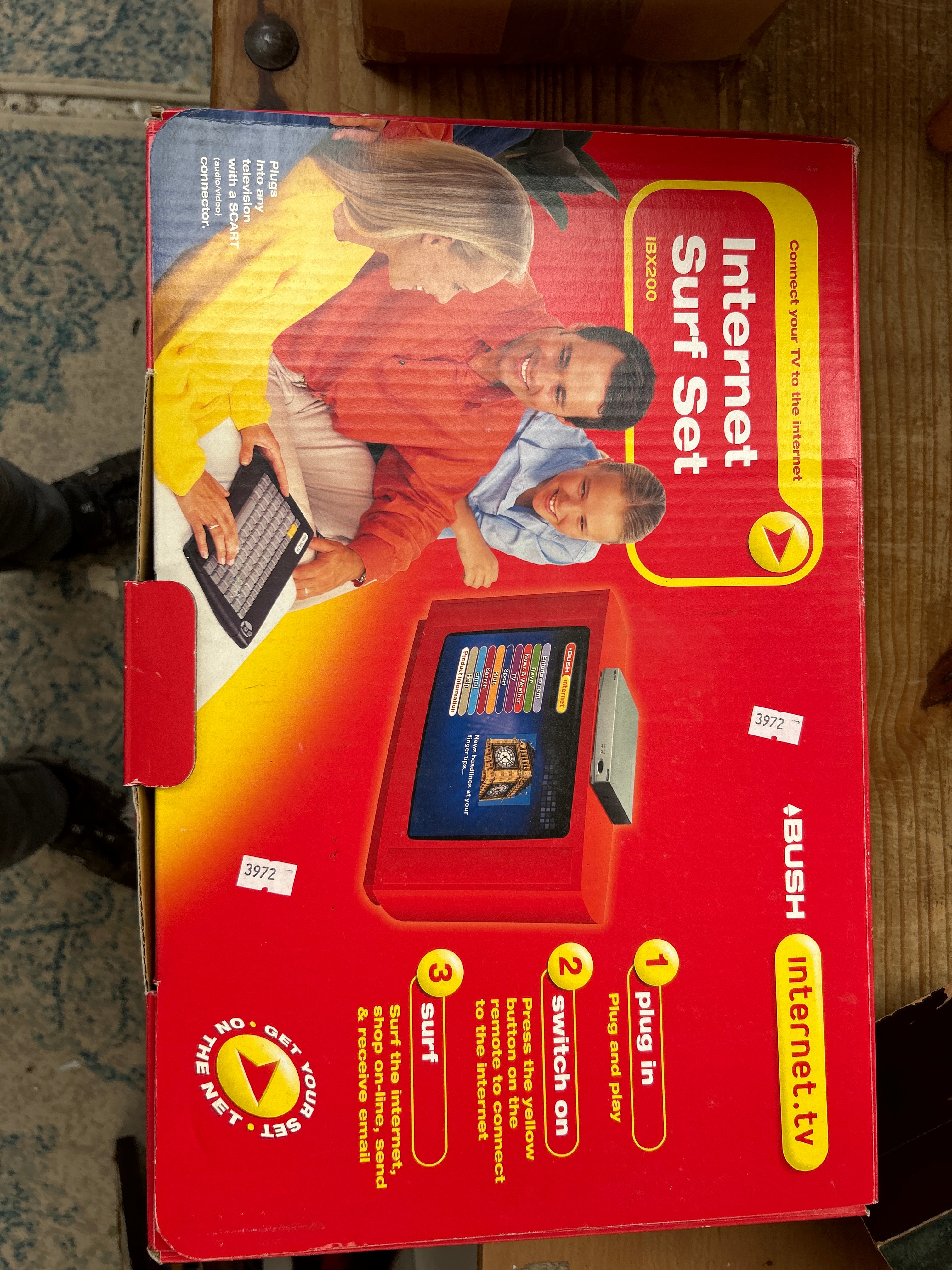 A Bush Internet Surf Set, model IBX200, presented in its original, full-color printed cardboard packaging. This device, released in 2000 with a modem speed of 33.6k, is designed to connect a television via a SCART connector to the internet, facilitating browsing, online shopping, and email. The packaging features a vibrant red and yellow color scheme, depicts a family, and illustrates the device alongside a compact keyboard. Prominent text on the box states “Connect your TV to the internet” and “BUSH internet.tv.” Visible instructions guide the user with “1 Plug in,” “2 Switch on,” and “3 Surf.” A white label bearing the number “3972” is affixed to the front.