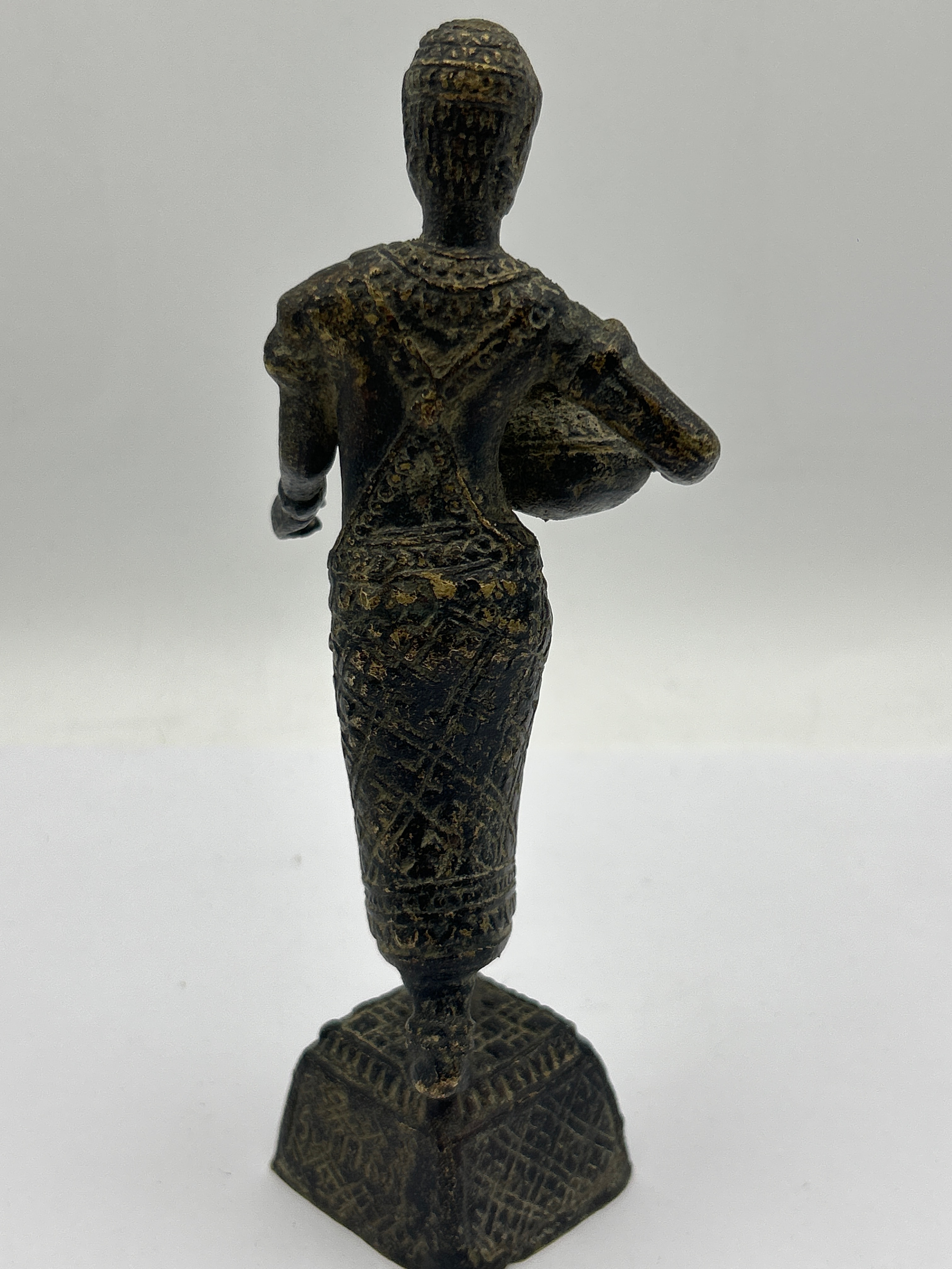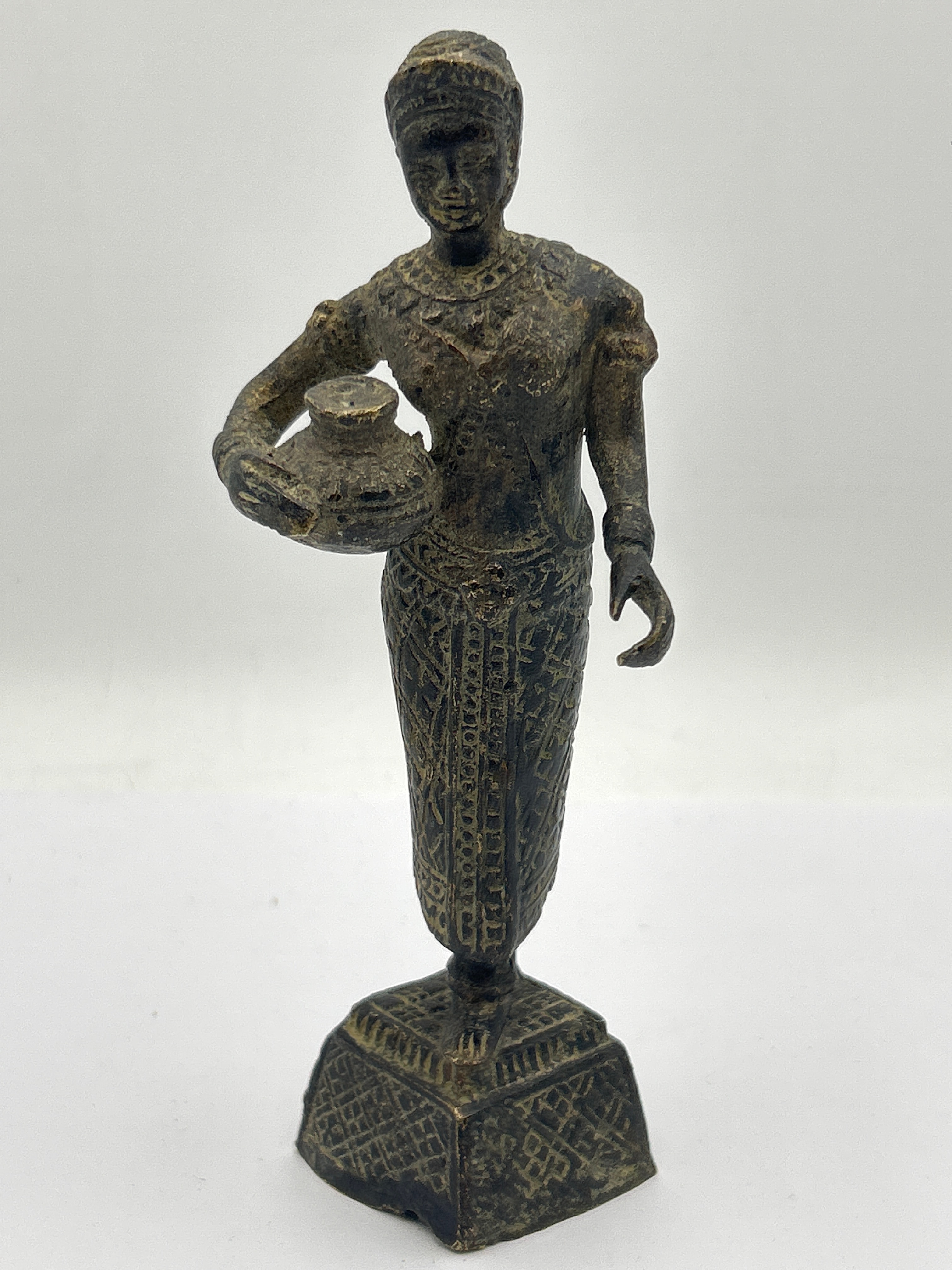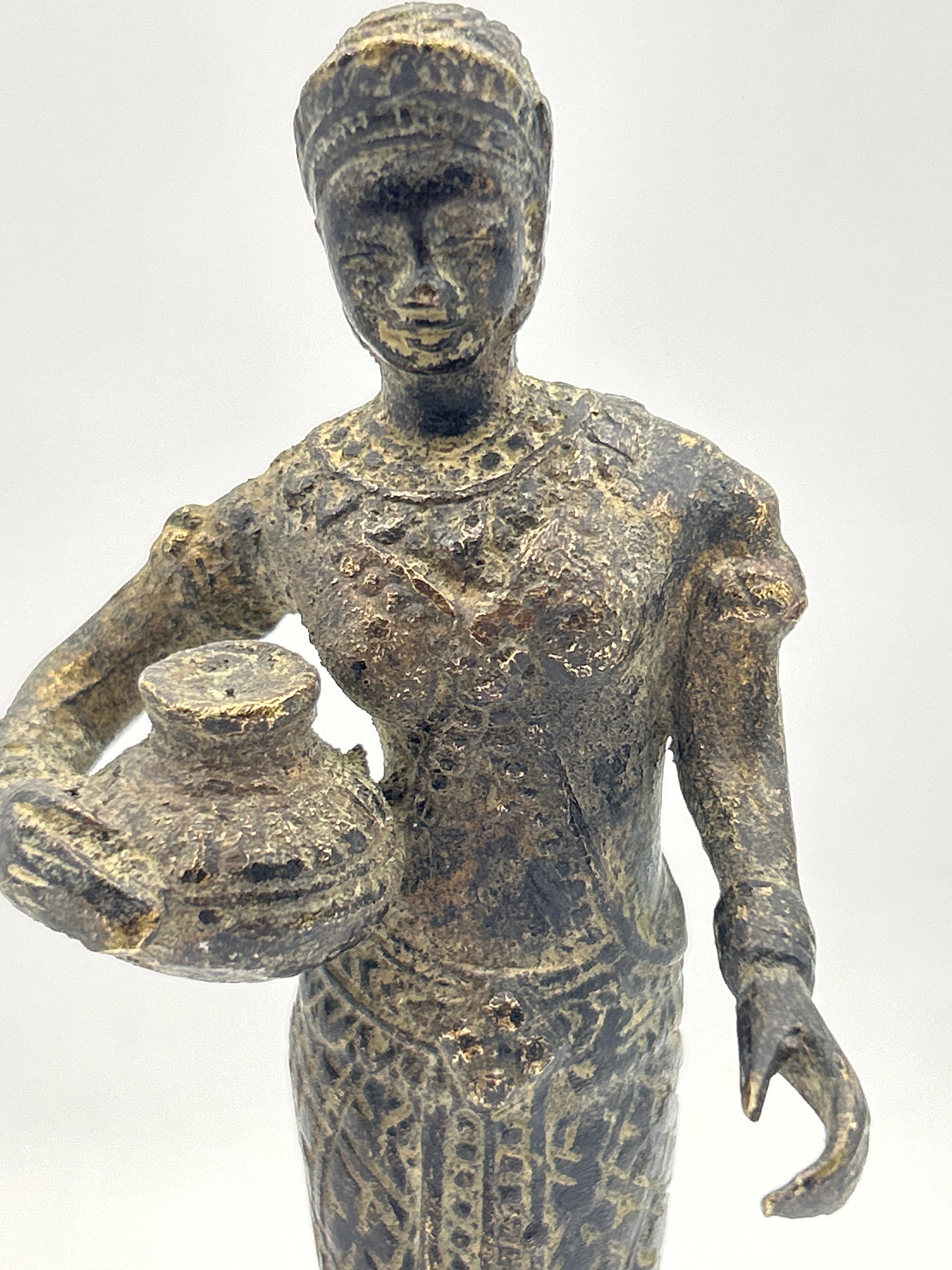 A Khmer style bronze standing female deity figure, depicting a female figure holding a small, lidded pot in her left hand. The figure wears an elaborate headdress, necklace, and highly patterned garments, including a long skirt and decorative top, characteristic of a Southeast Asian aesthetic. It rests on a squared, stepped base with incised geometric patterns. The material displays a dark, uneven patination with areas of lighter metallic tones, consistent with age, wear, or an intentional antique finish. No visible text or maker’s marks are apparent.