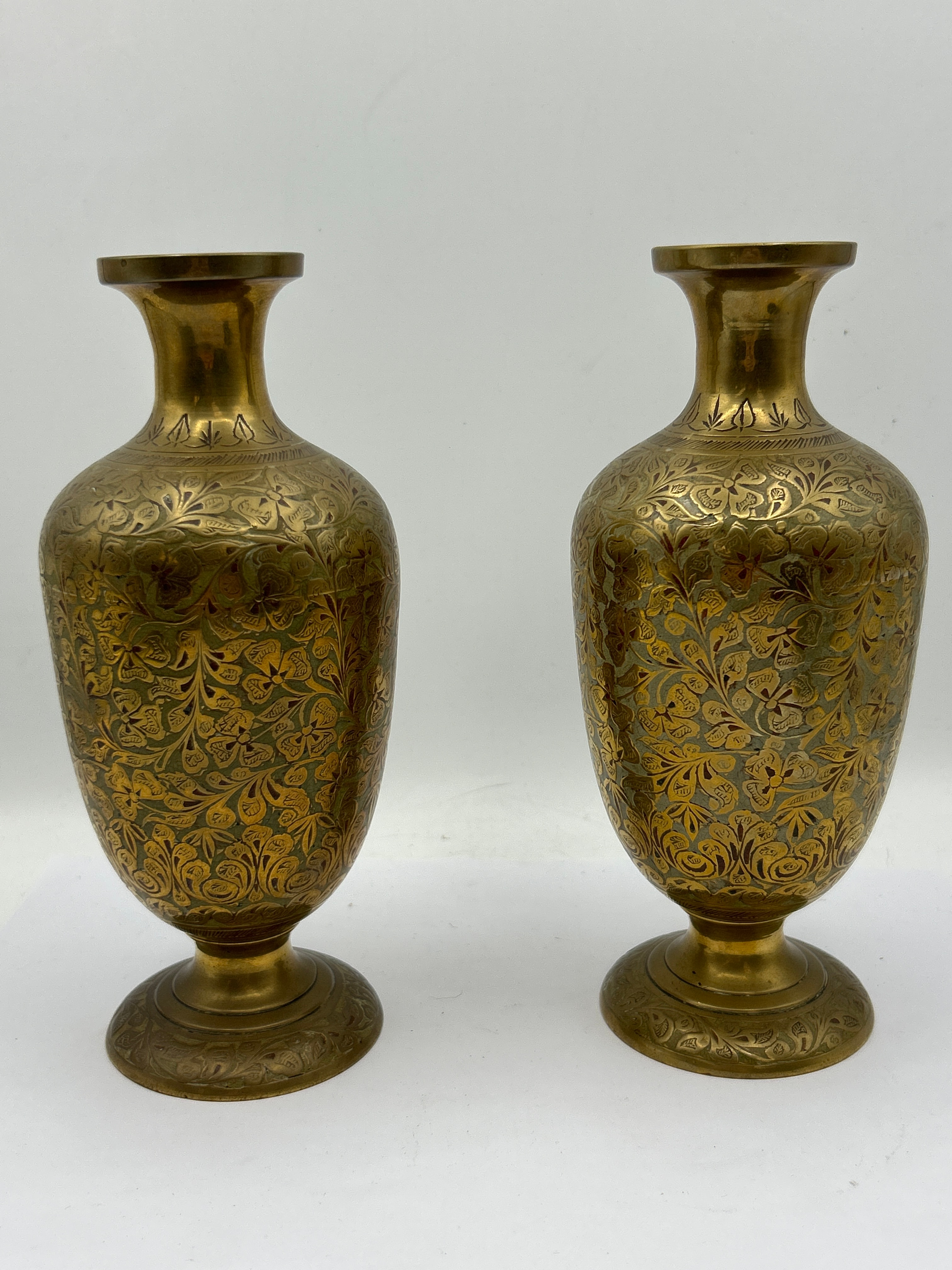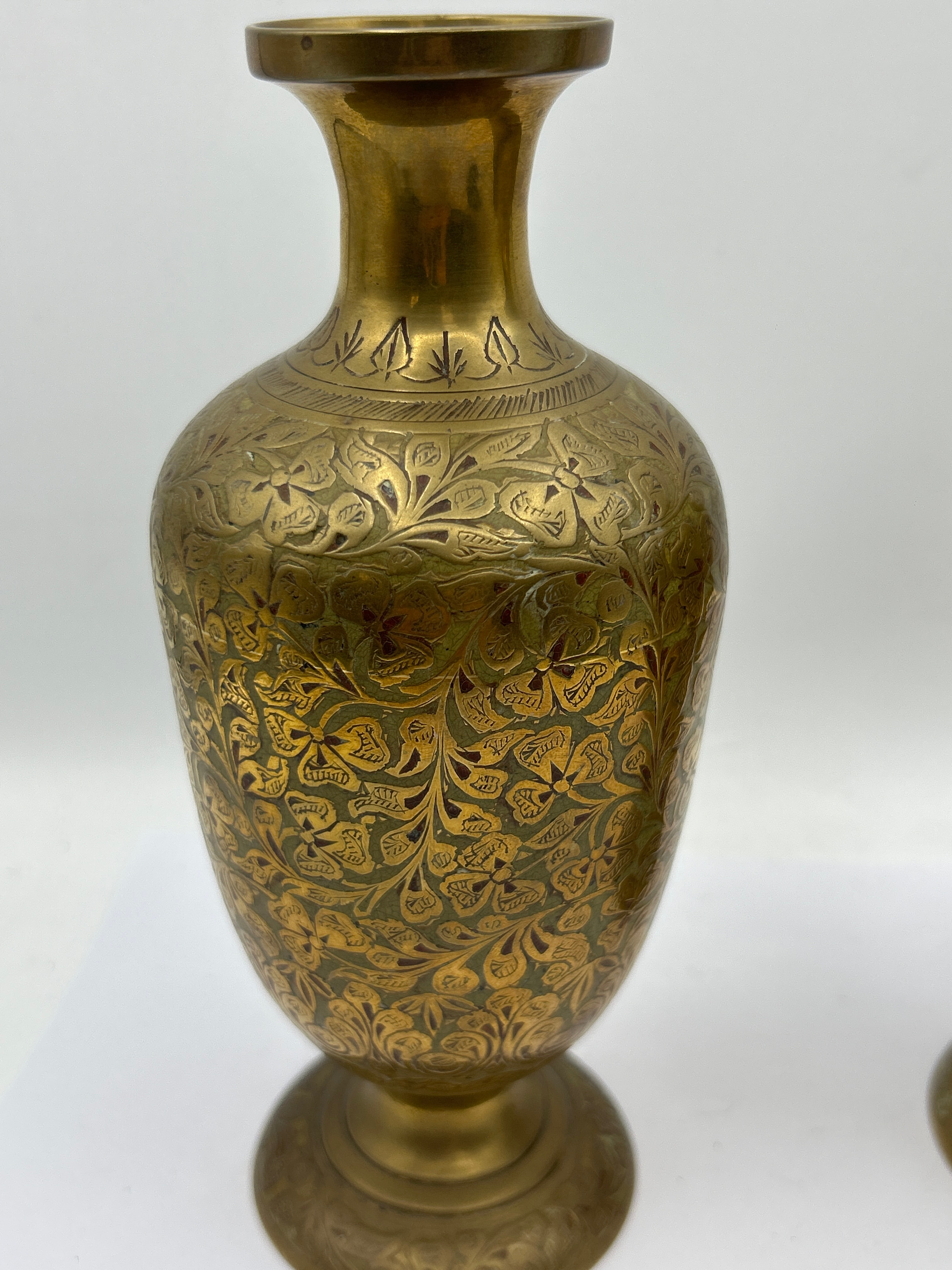 A pair of Indian engraved brass vases. Crafted from brass, each vase features a flared rim, a slender neck, a bulbous body, and a stepped circular foot. Their surfaces are extensively adorned with intricate etched or engraved floral and foliate patterns, exhibiting contrasting areas of darker patina or infill.