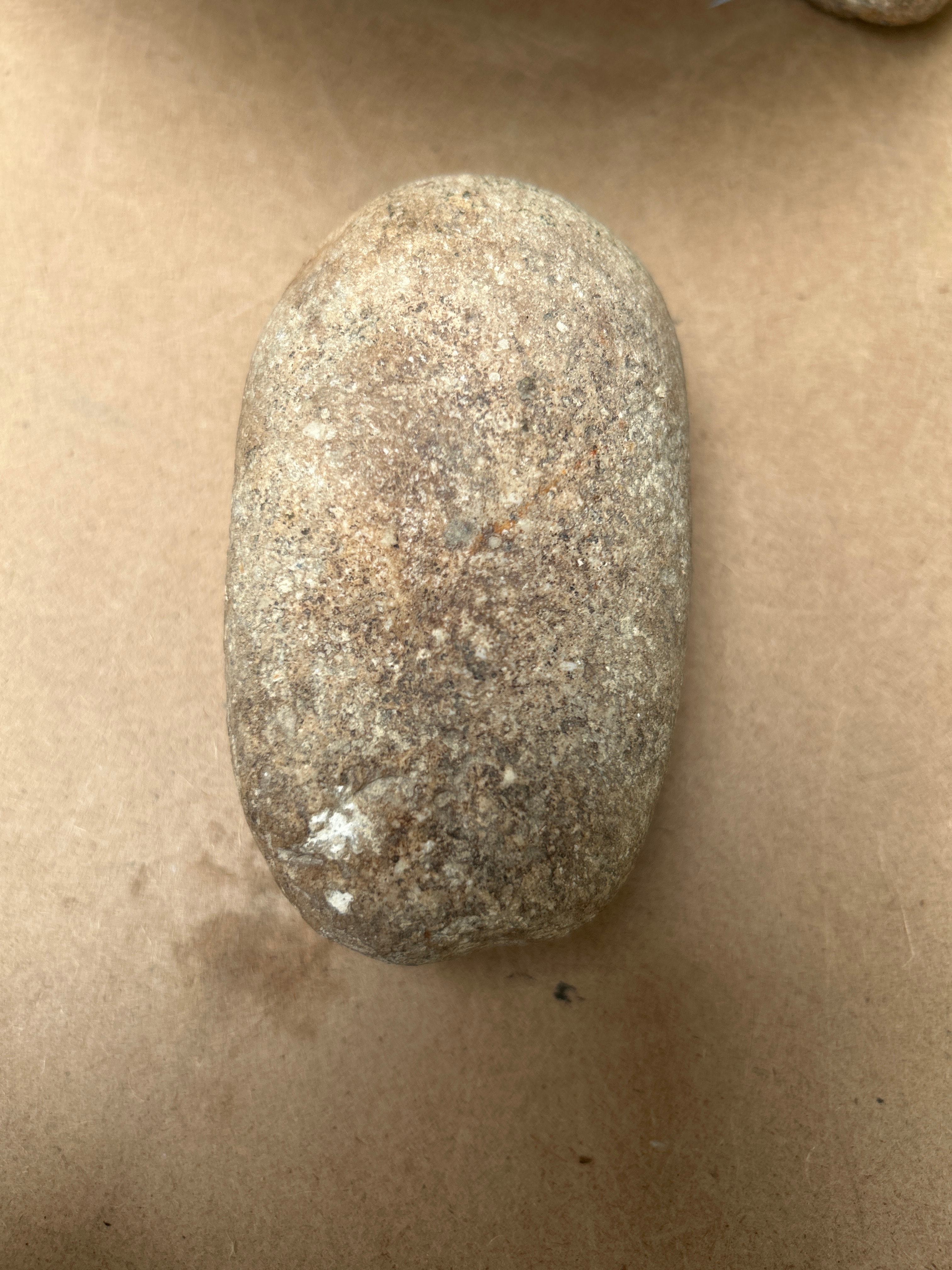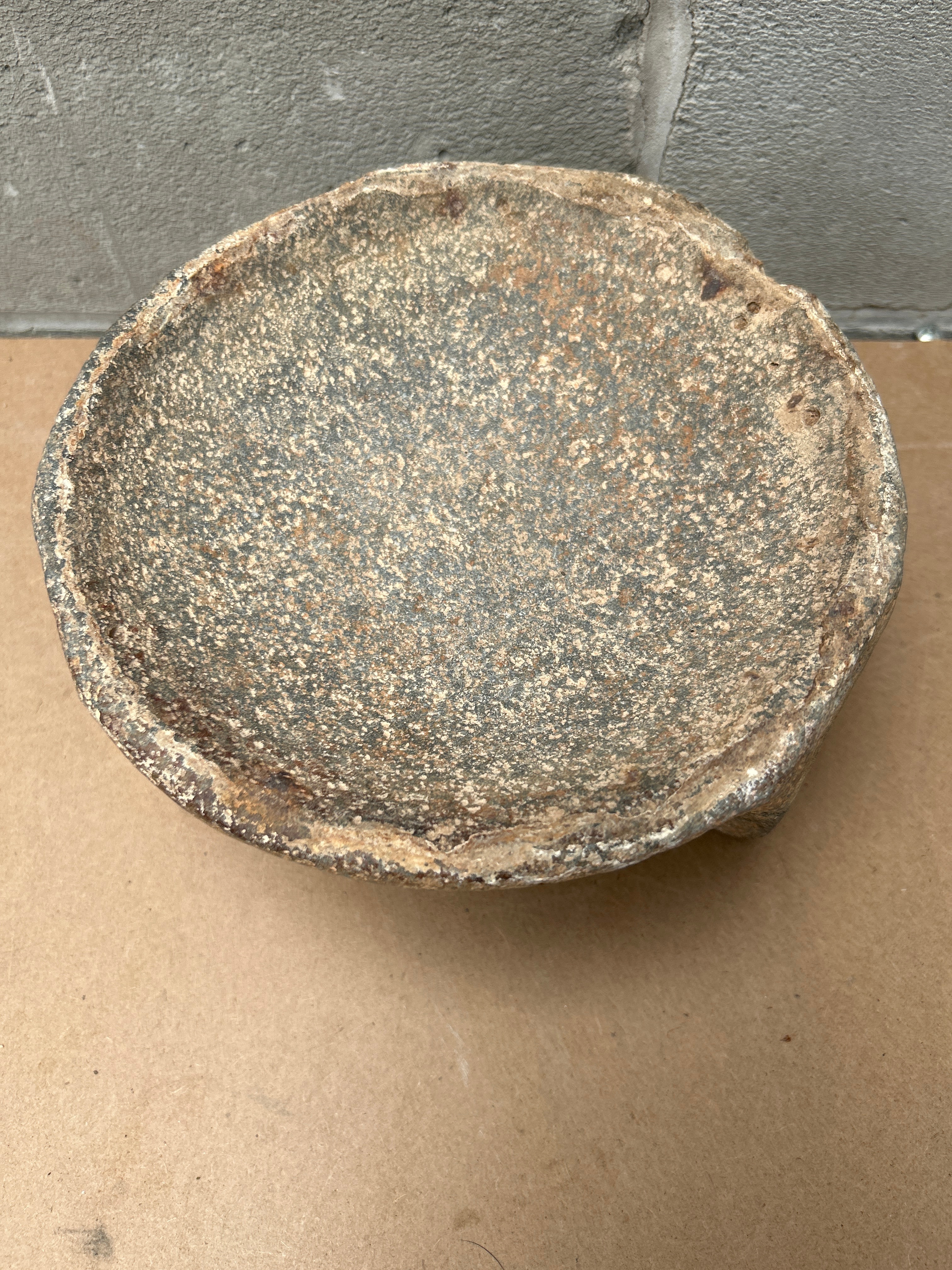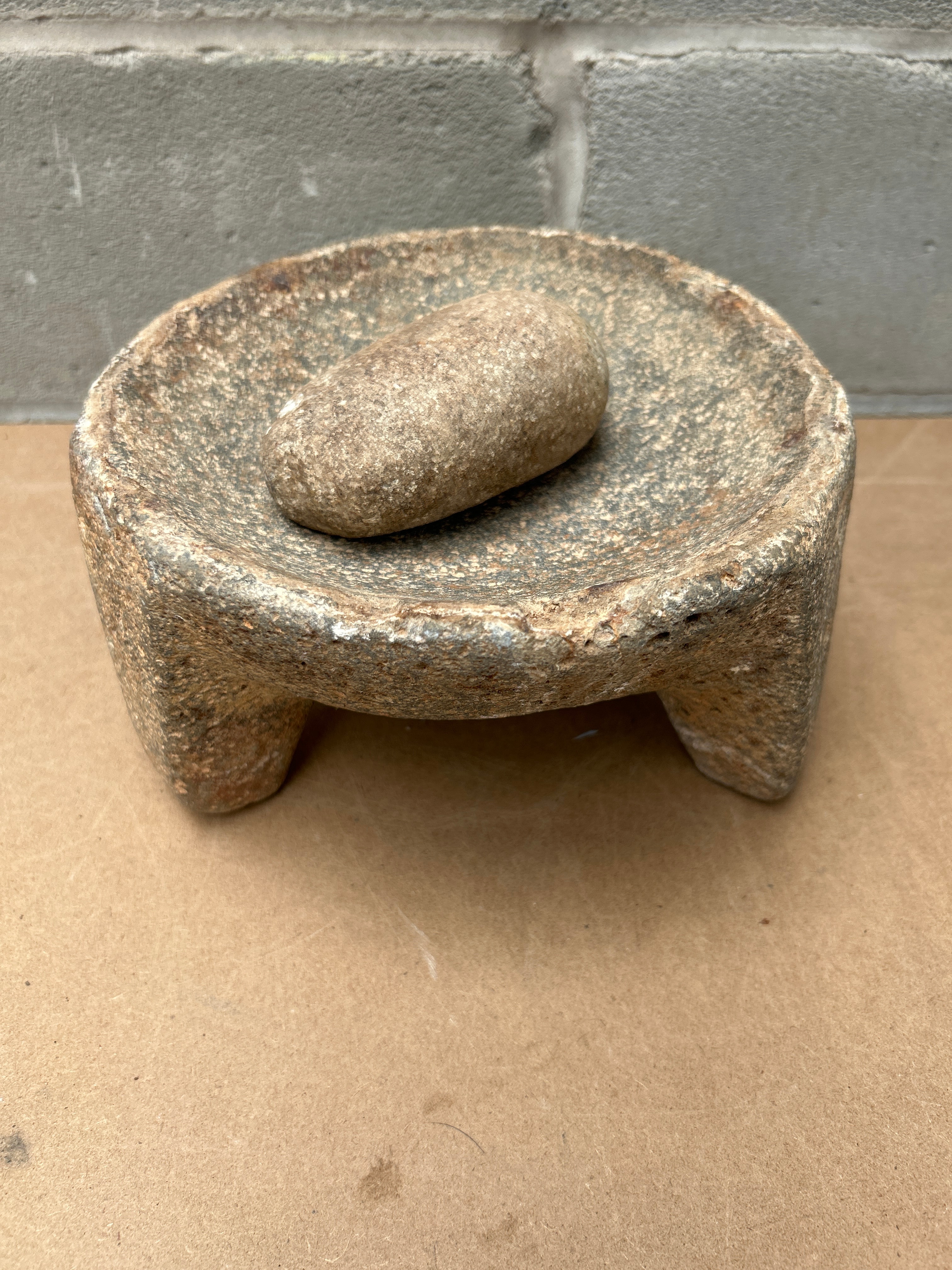A Vintage Mexican Molcajete (Mortar & Pestle) crafted from Stone. The set comprises a rustic mortar and an accompanying pestle. The mortar is a shallow, irregularly circular bowl, supported by three short, integrated legs forming a tripod base. Its interior surface is highly textured, consistent with its intended use for grinding. The pestle is an elongated, naturally rounded stone, matching the mortar in material and texture. Both pieces exhibit a robust, utilitarian appearance.