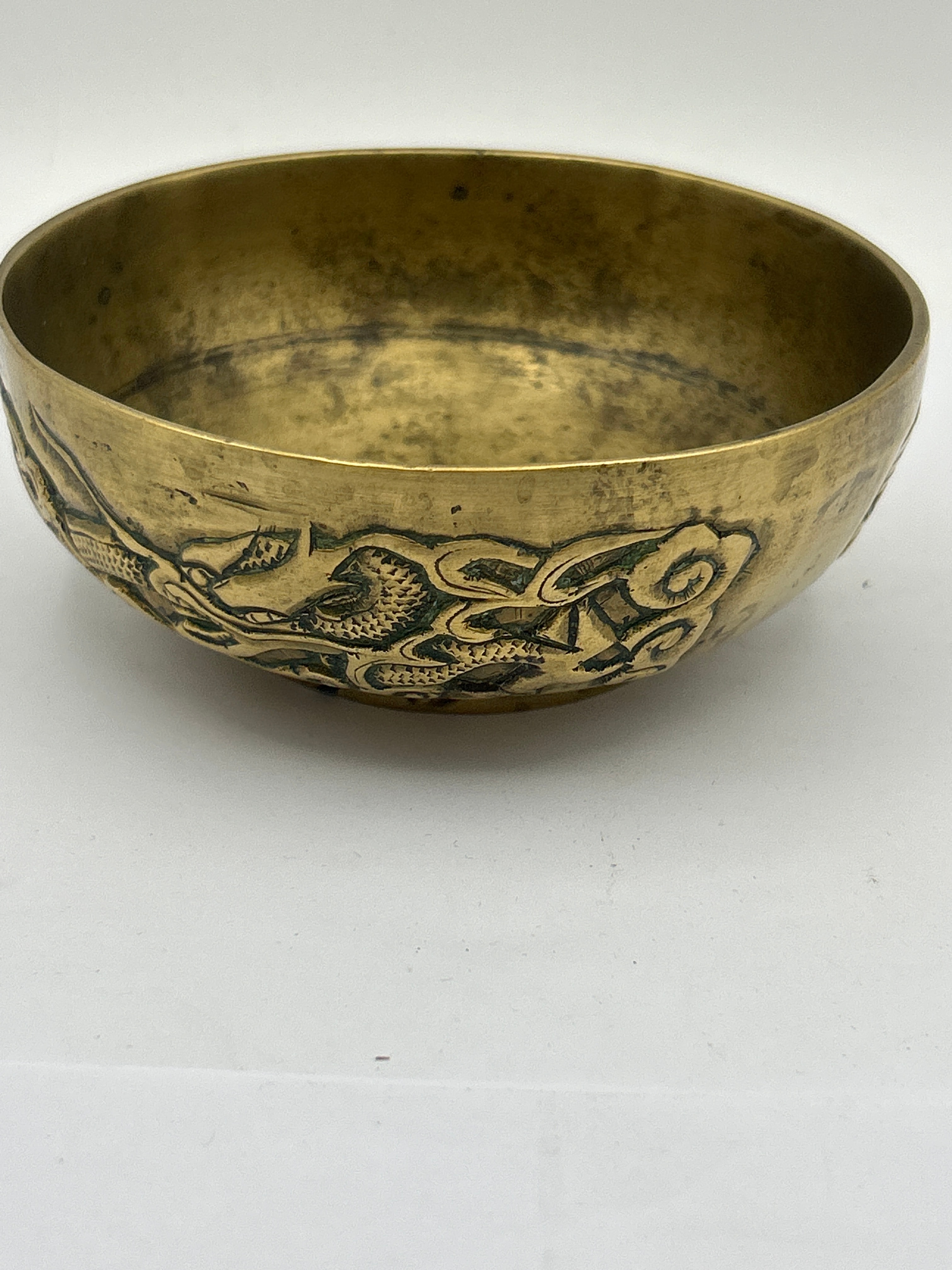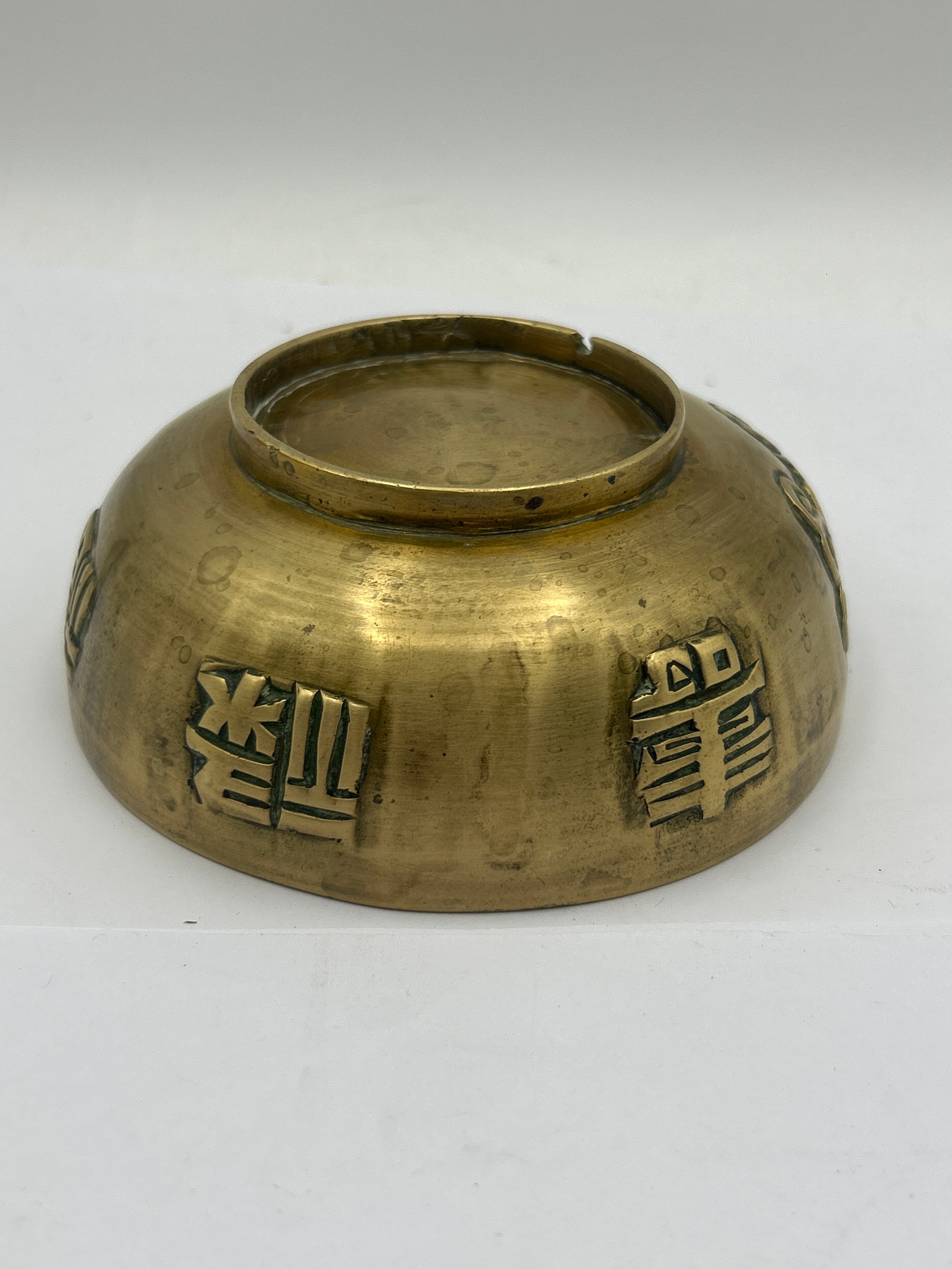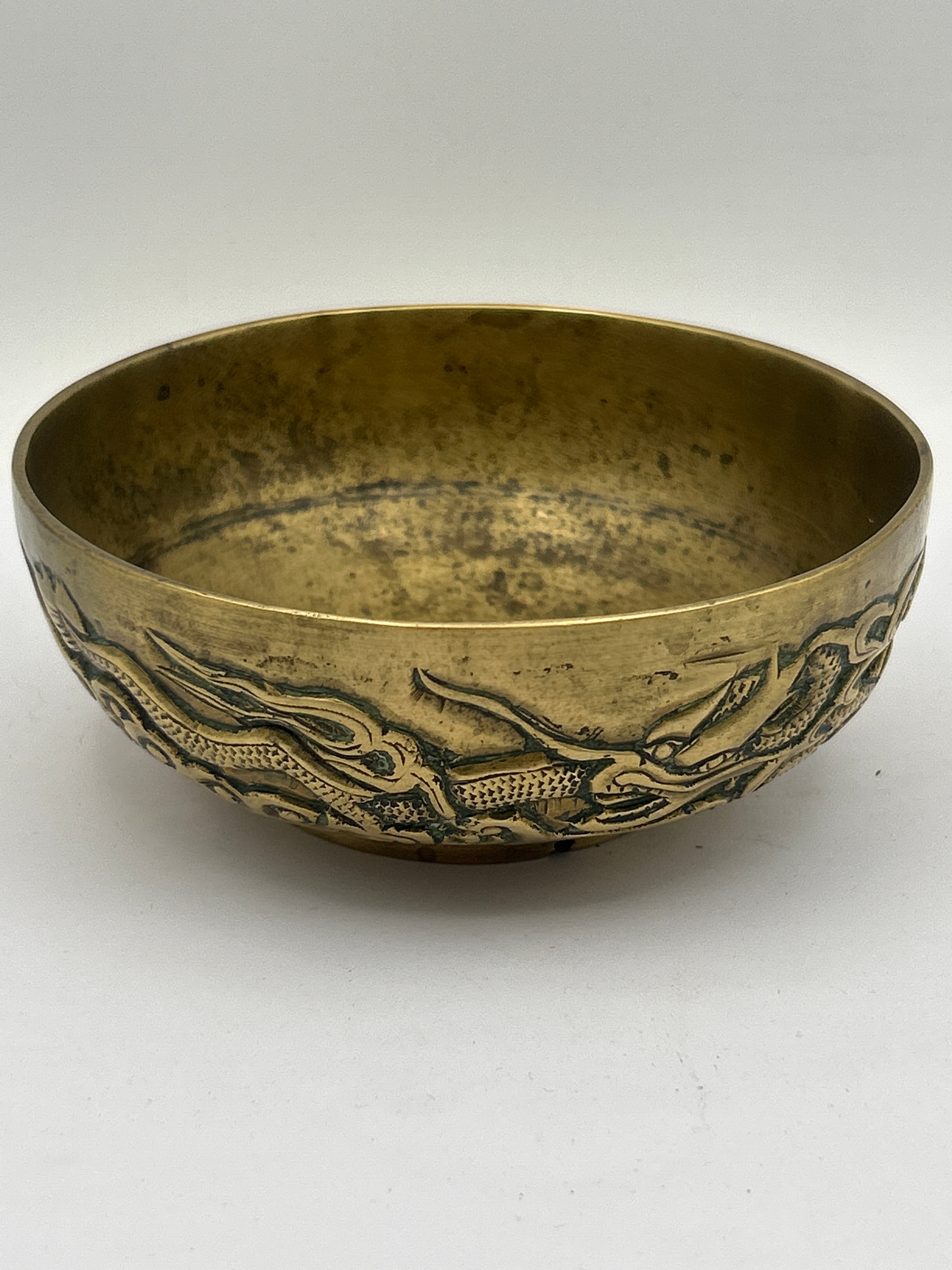 A small, heavy Bronze bowl, exhibiting a rich golden-brown patina with darker accents in its recessed areas. The exterior is adorned with a detailed, high-relief decoration depicting stylized East Asian dragons amidst swirling clouds or waves. The underside of the bowl features four raised Chinese characters, ‘鑒寶珍藏’ (Jiàn bǎo zhēn cáng), meaning ‘Appreciate Precious Treasure Collection.’