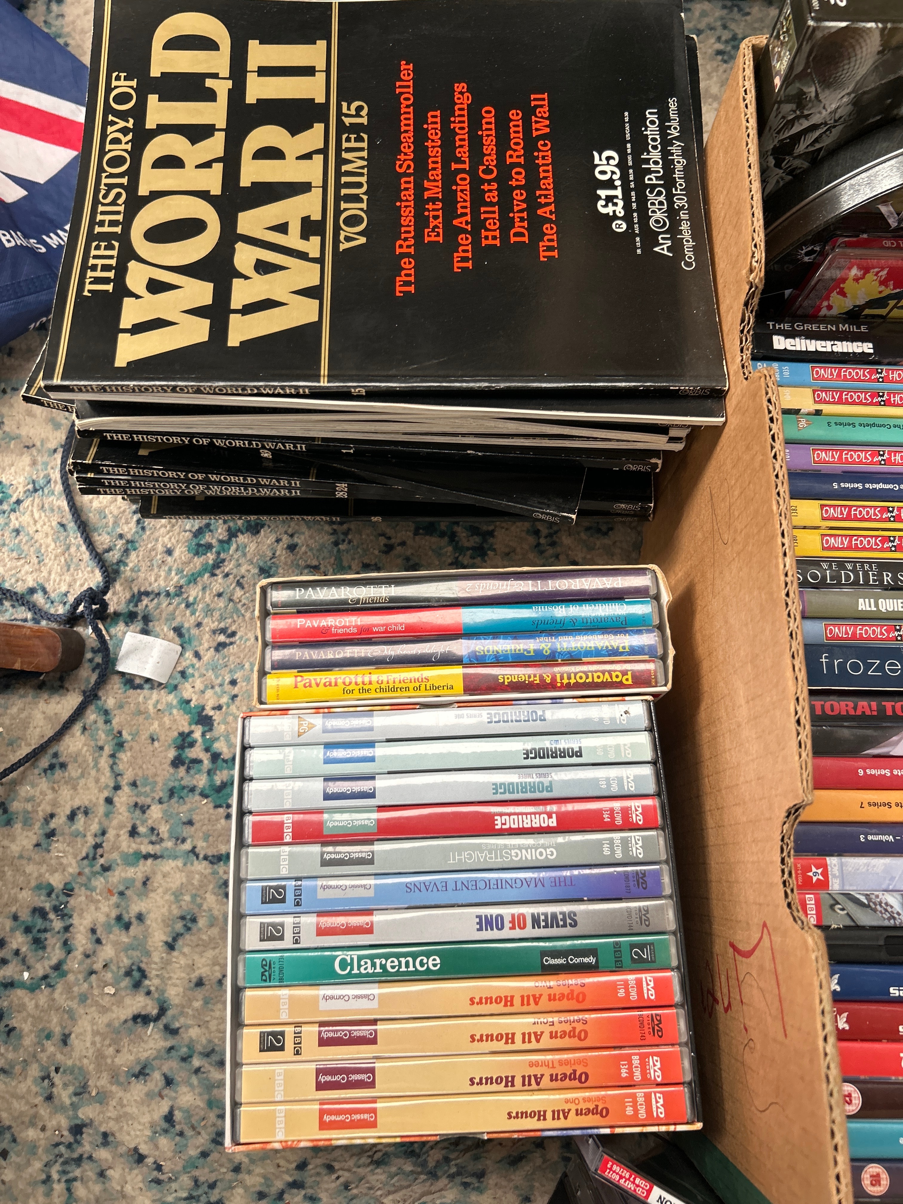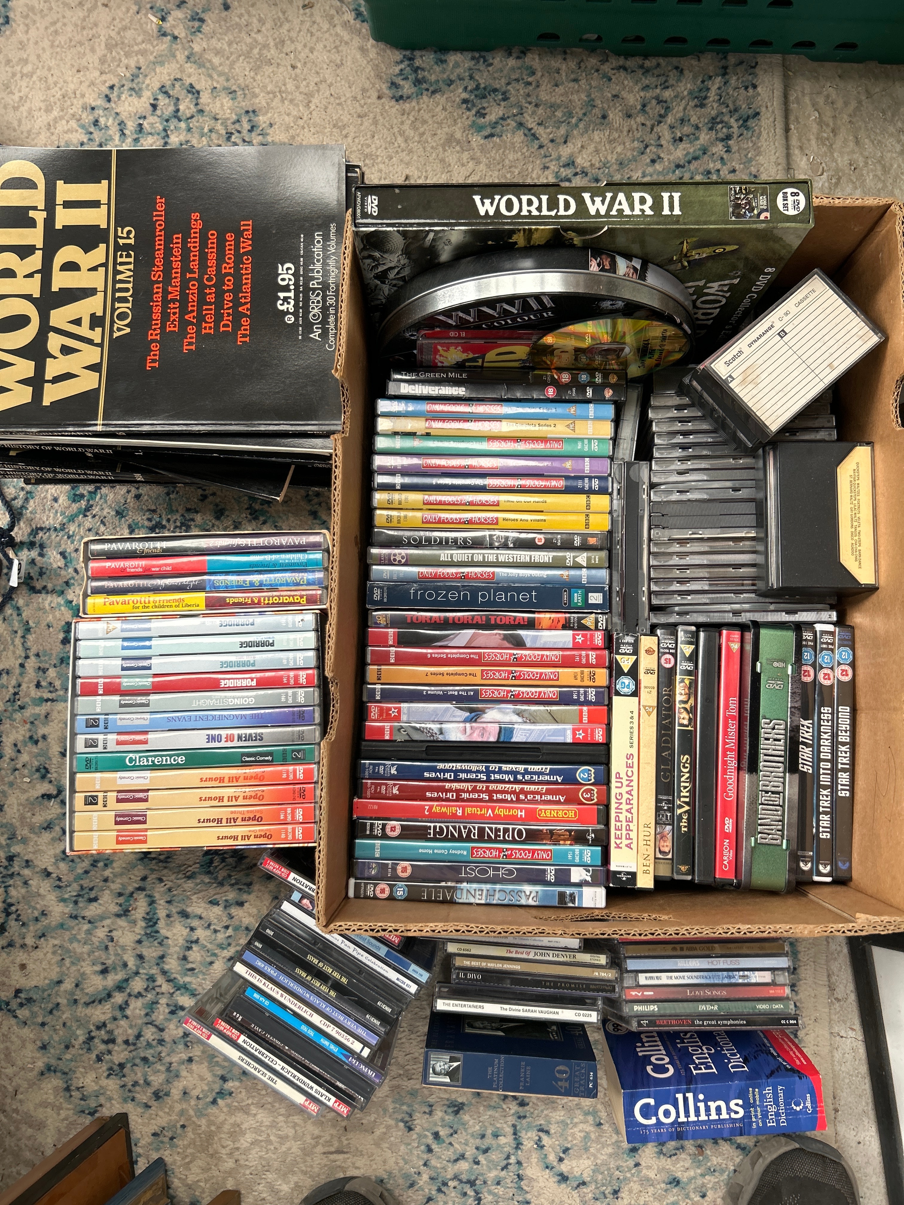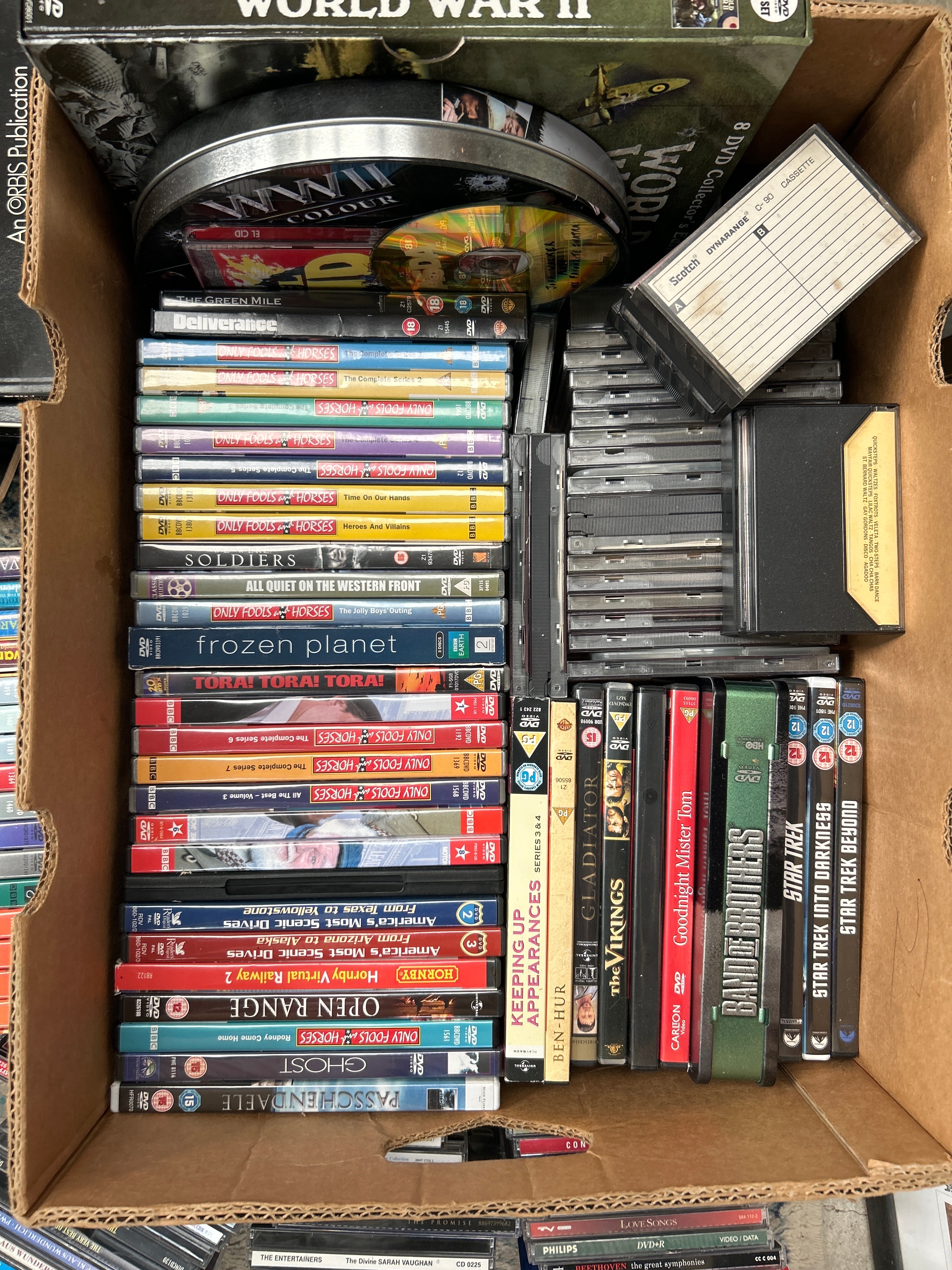 A diverse collection of mixed media, predominantly DVDs, alongside several books and a few audio cassette tapes. The collection encompasses a wide range of content, including historical non-fiction such as “The History of World War II Volume 15” (an ORBIS Publication, detailing topics like “The Russian Steamroller,” “Exit Manstein,” “The Anzio Landings,” “Hell at Casino,” “Drive to Rome,” and “The Atlantic Wall”), and numerous films and television series across various genres. Visible titles include popular series and films such as “Only Fools and Horses,” “Gladiator,” “The Vikings,” “Band of Brothers,” “Star Trek,” “All Quiet on the Western Front,” “Frozen Planet,” “Porridge,” and “Open All Hours.” The items are primarily constructed from plastic (for DVD cases), paper/cardboard (for book covers and DVD sleeves), and magnetic tape (for cassettes).