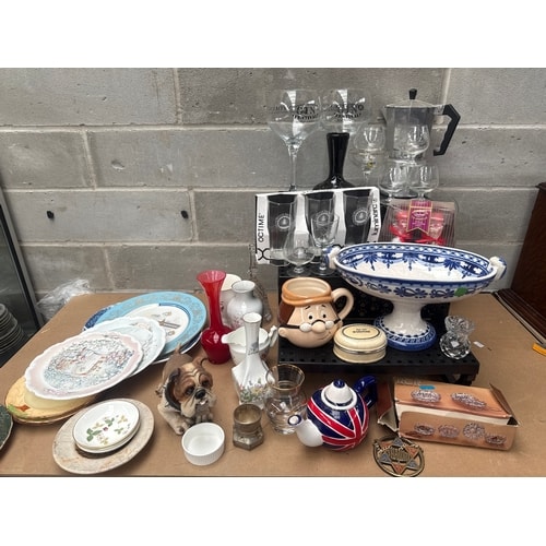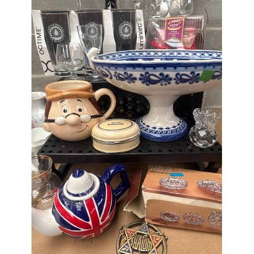 A varied collection of household items, predominantly dating from the late 20th to early 21st century. The lot comprises various glassware, including stemmed wine glasses, tumblers, and cordial glasses, with some examples branded “STRATHMORE” and “Luminarc OCTIME.” Also present is an aluminum Moka pot, a small brass-toned lidded container, and a metal medallion inscribed “SHALOM” (שלום). Ceramic and porcelain items include decorative dinner plates, a large blue and white footed serving bowl, a novelty character mug, a small red vase, a Union Jack-patterned teapot, various small dishes, and a ceramic bulldog figurine. Several items retain their original “Luminarc” or “Candles” packaging.