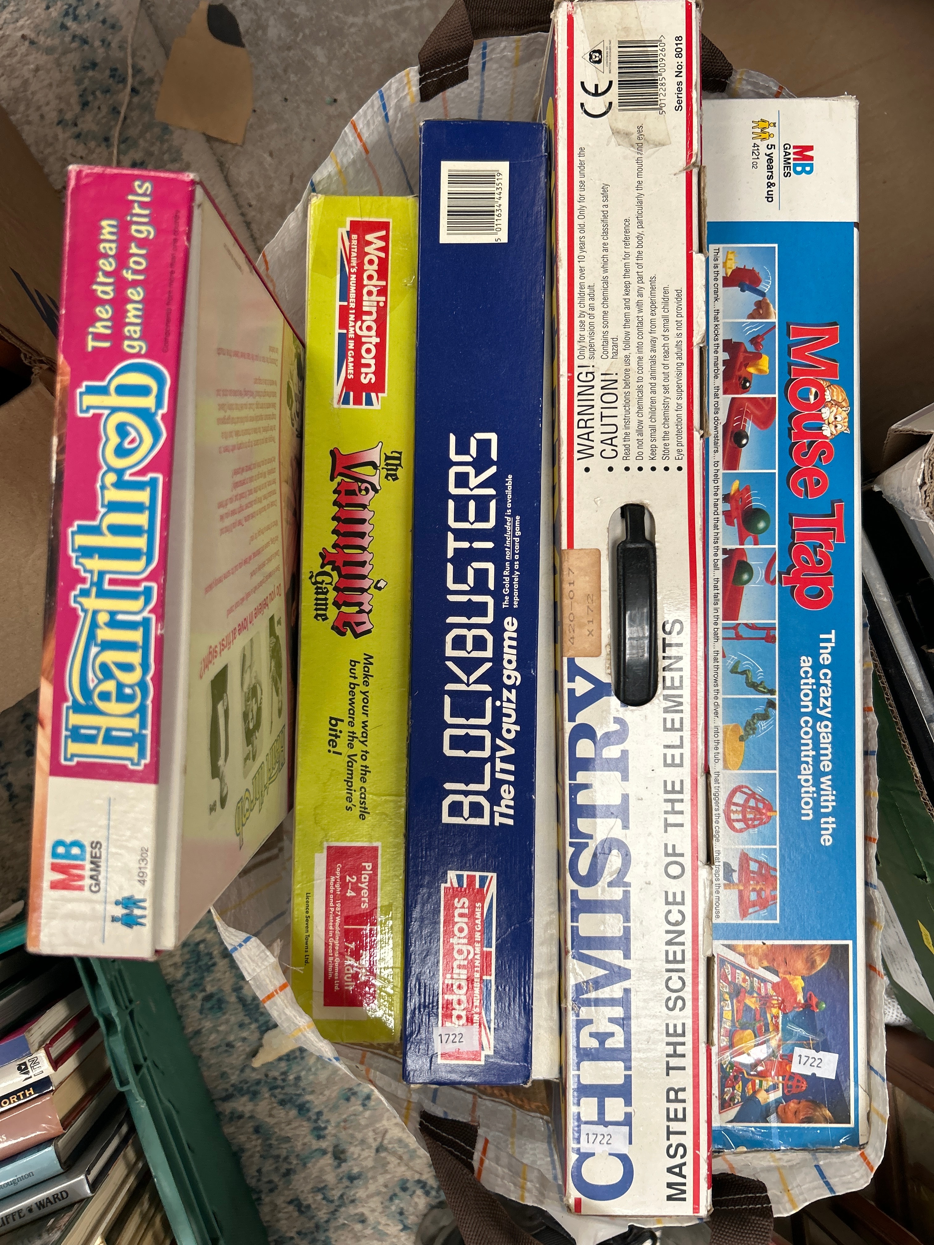 This lot comprises five boxed games and a science kit, predominantly from the late 20th century, likely 1980s-1990s, with a visible 1987 copyright on one item. The collection includes “Heartthrob” (MB Games, “The dream game for girls”), “The Vampire Game” (Waddingtons, “Britain’s Number 1 name in games”), “Blockbusters: The ITV Quiz Game” (Waddingtons), “Chemistry: Master the Science of the Elements” (Series No: 8018, bearing a CE mark and safety warnings), and “Mouse Trap” (MB Games, “The crazy game with the action contraption,” for “5 years & up”). All items are packaged in cardboard. Several boxes feature “1722” stickers, suggesting a common inventory or lot number.
