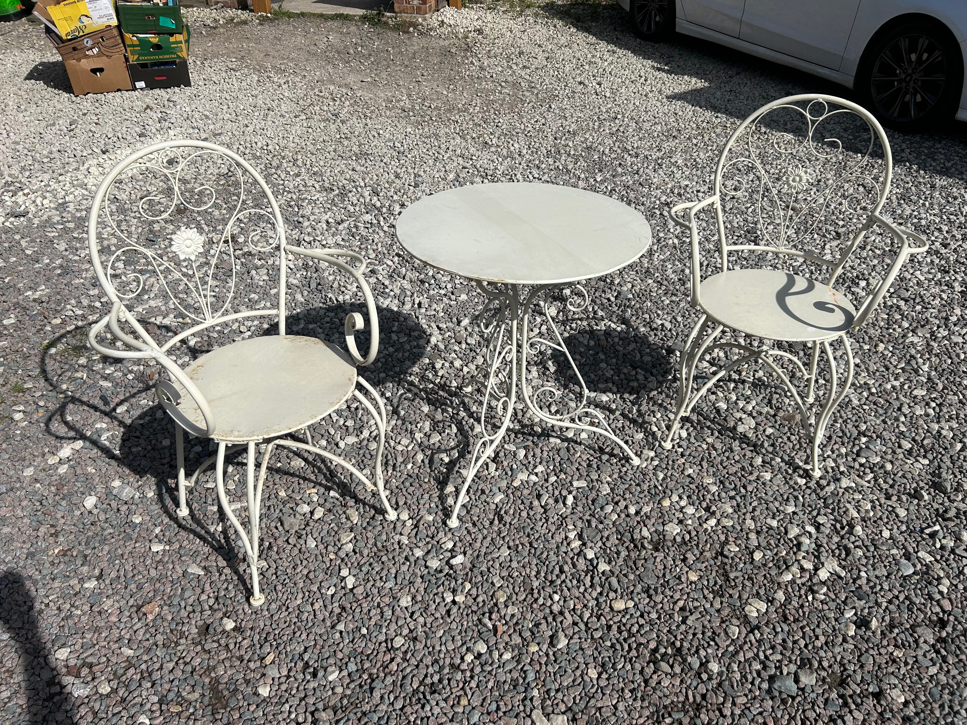 A three-piece outdoor patio set, consisting of two armchairs and a round table, crafted from off-white painted metal, likely wrought iron or cast aluminum. The set features a rococo-inspired aesthetic with extensive scrollwork throughout the chairs and table base. The left armchair’s backrest incorporates a distinct central floral motif. The seats of the chairs and the table top are solid panels. No manufacturer’s marks or discernible text are visible on the furniture itself.