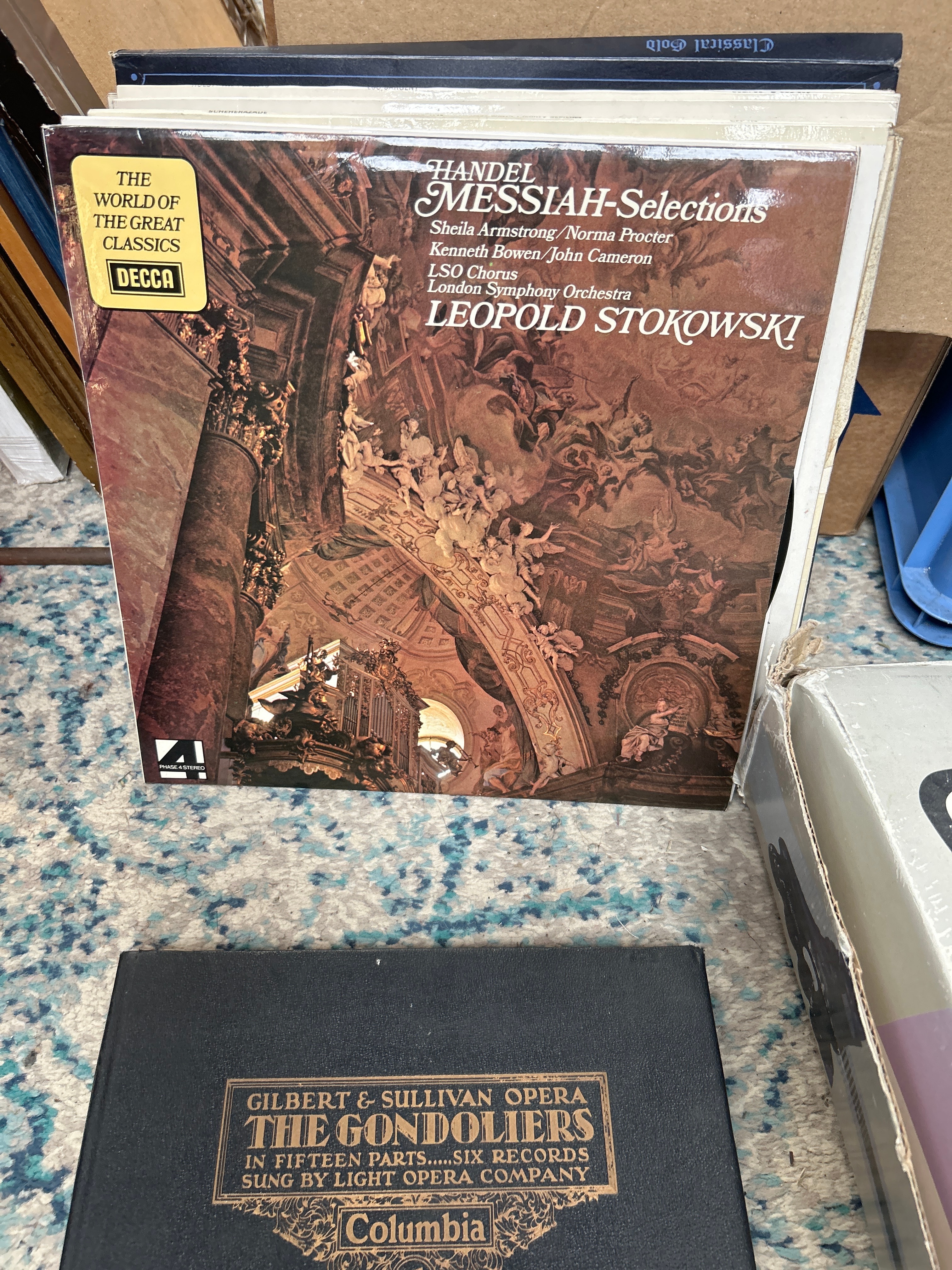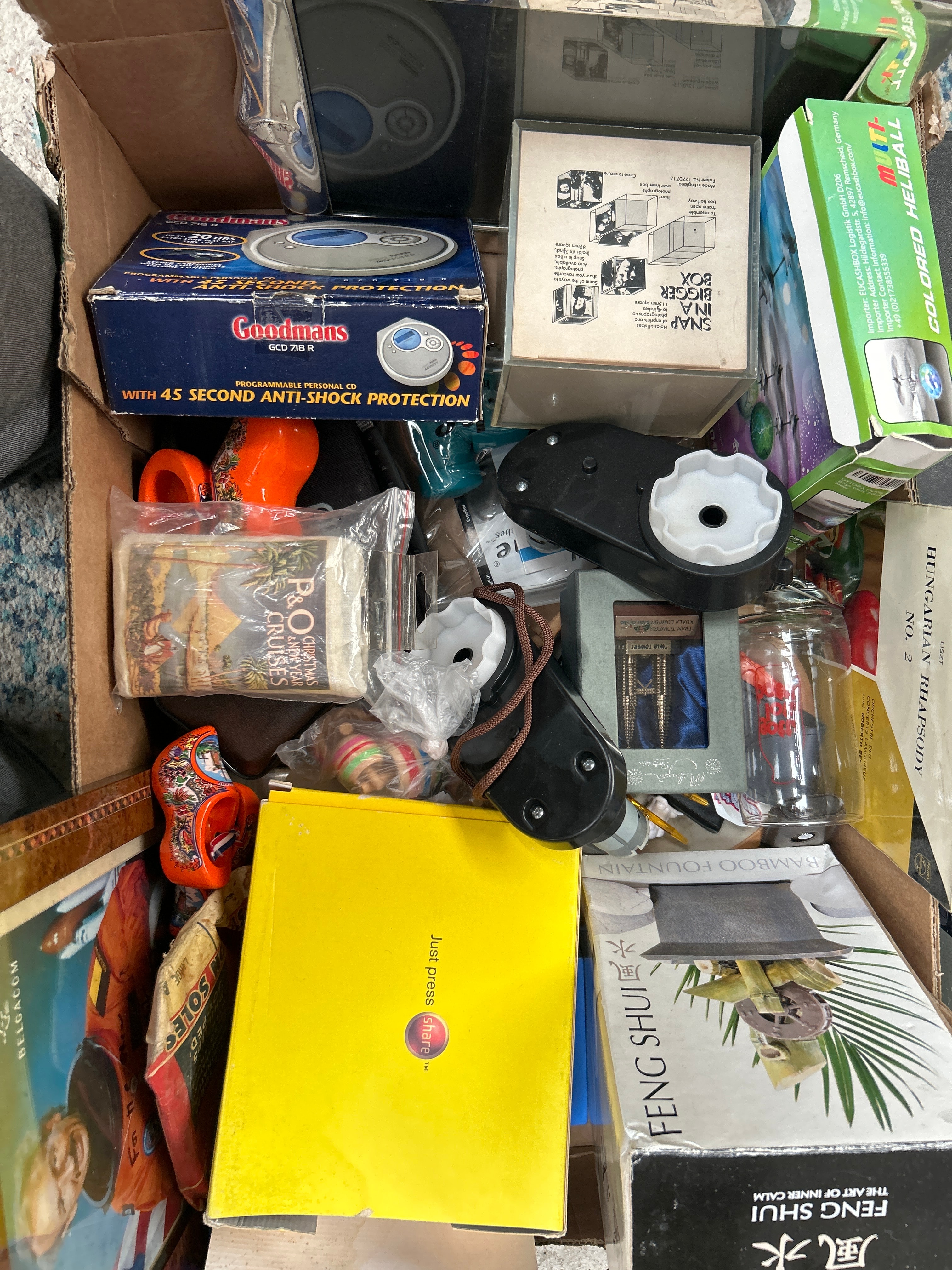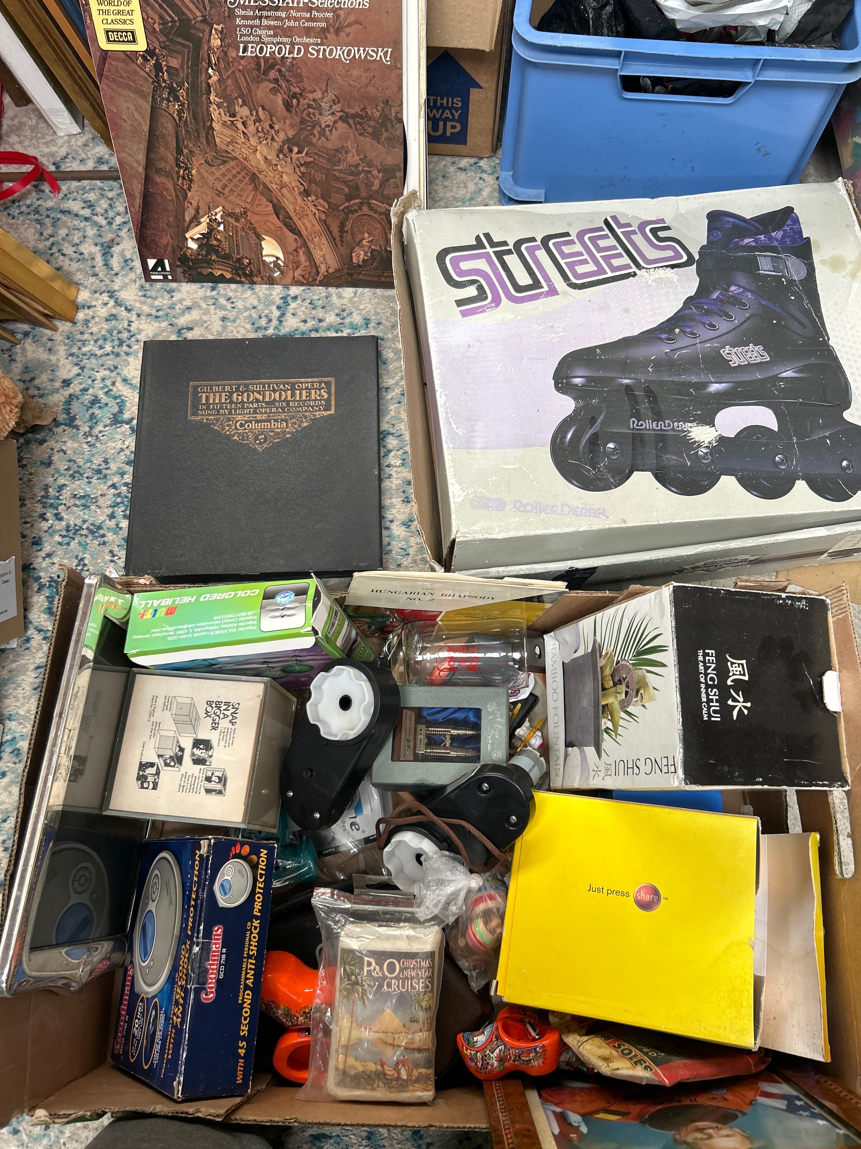A pair of Roller Derby ‘Streets’ Series inline skates, black with purple accents. Also included is a Goodmans programmable personal CD player featuring “45 Second Anti-Shock Protection.” The lot further comprises a group of classical vinyl records, including “HANDEL MESSIAH – Selections” on the Decca label and a “Gilbert & Sullivan Opera THE GONDOLIERS” set by Columbia. Additional items in this mixed lot include a box labeled “FENG SHUI,” a “SNAP IT BIGGER BOX,” a “COLORED HELLBALL,” various P&O CRUISES branded items, and a yellow book or box titled “Just press start.” The items are made from various materials including plastic, vinyl, paper, and cardboard.