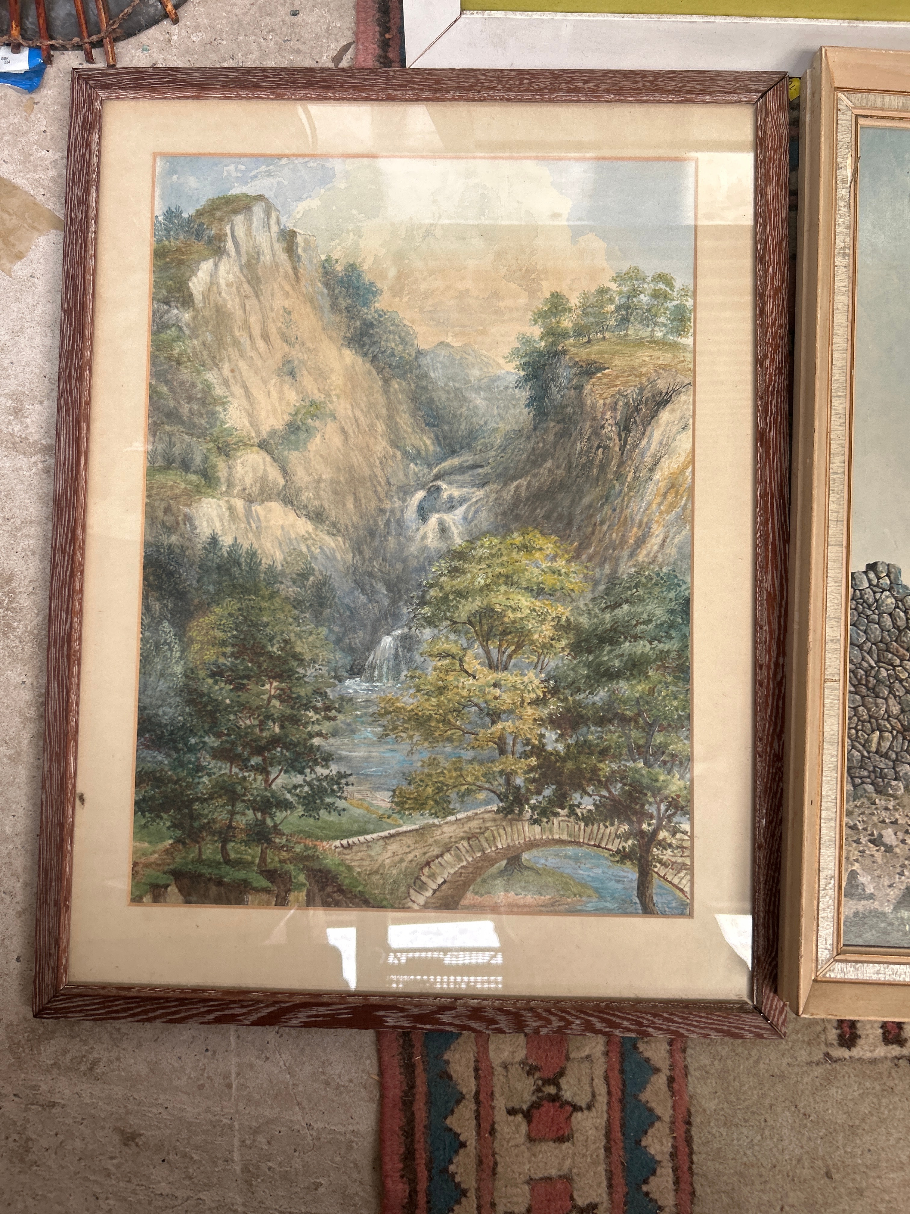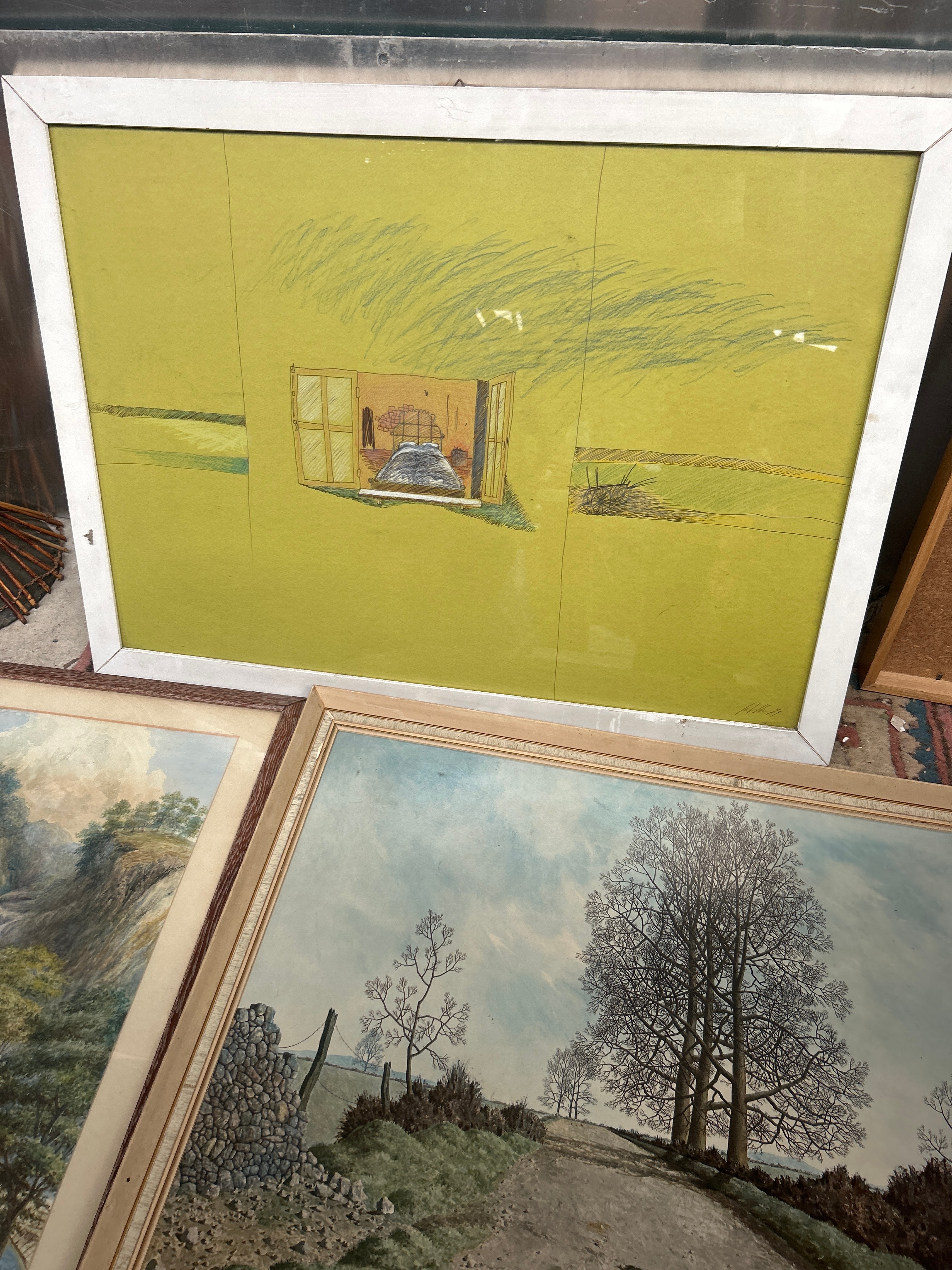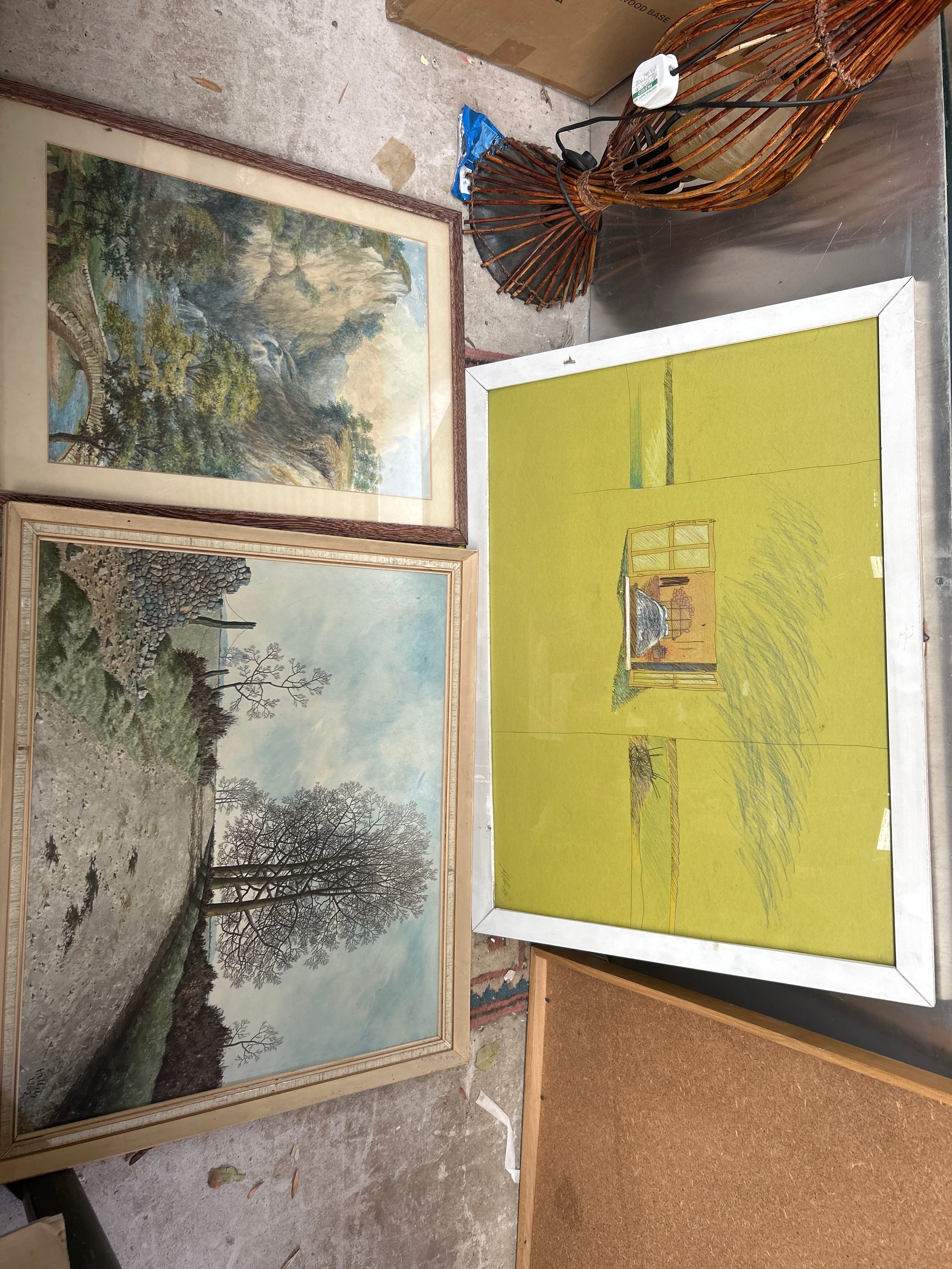 This lot comprises three framed artworks and one woven decorative object. The first artwork, presented in a brown wooden frame, is a traditional watercolor landscape depicting a mountainous waterfall, a river, and a stone bridge, surrounded by trees. The second artwork, in a lighter wooden frame, is a traditional landscape, possibly a painting or print, featuring a winding path, bare trees, and a stone wall. The third artwork is a modern piece, possibly a drawing or mixed media, on a bright yellowish-green ground with a central architectural-like element and abstract linear patterns. It is set in a wide, flat, light-colored frame, with a faint, unidentifiable signature visible in the lower right corner. All three framed pieces are presented under glass. The fourth item is a large, tall, woven wicker or rattan decorative object with an organic form, containing an apparent electrical cord and bulb fixture, suggesting it functions as a lamp.