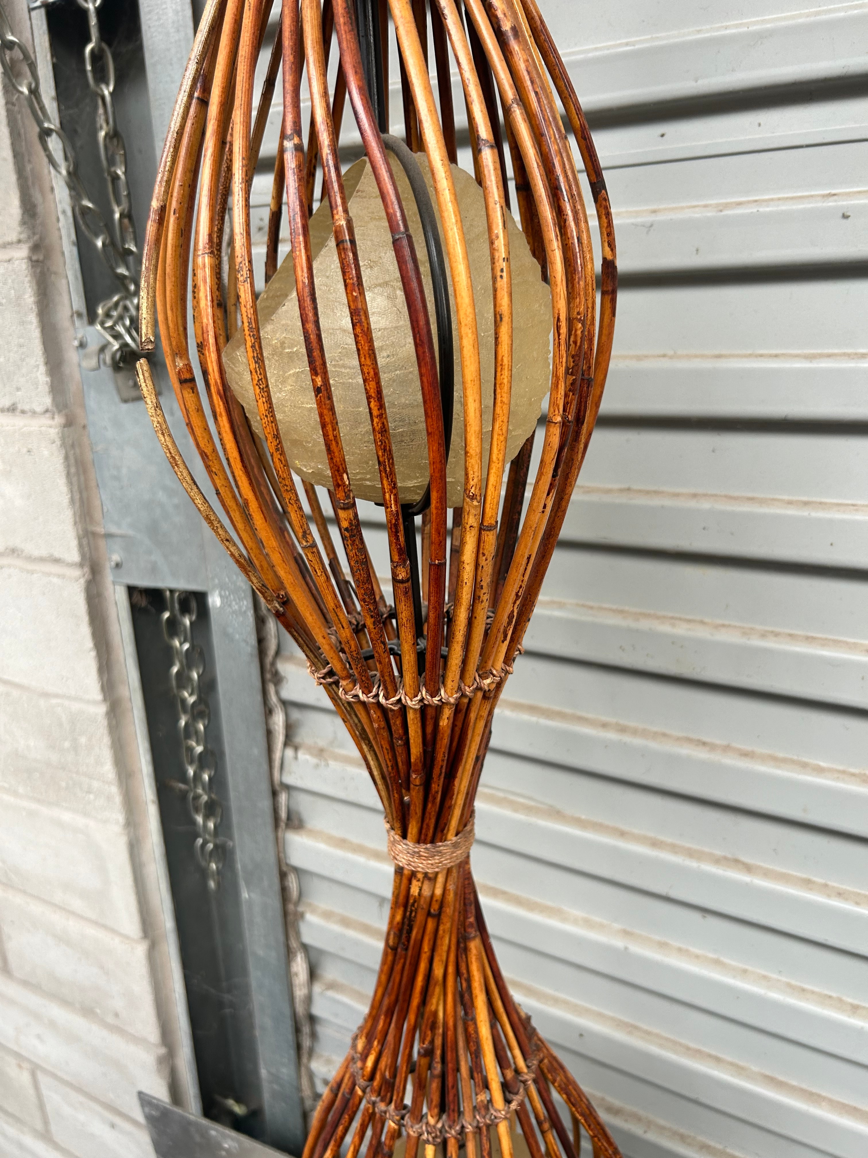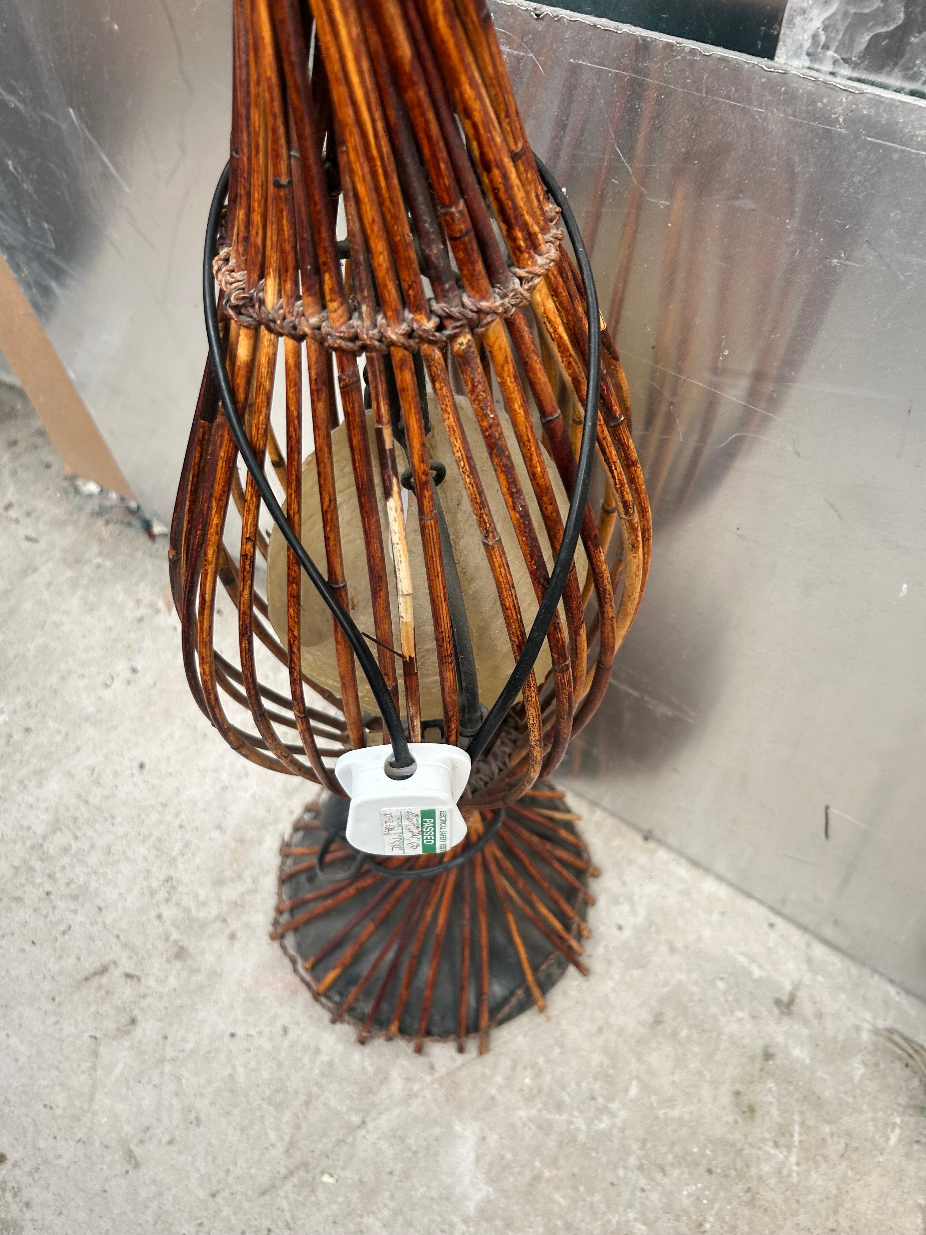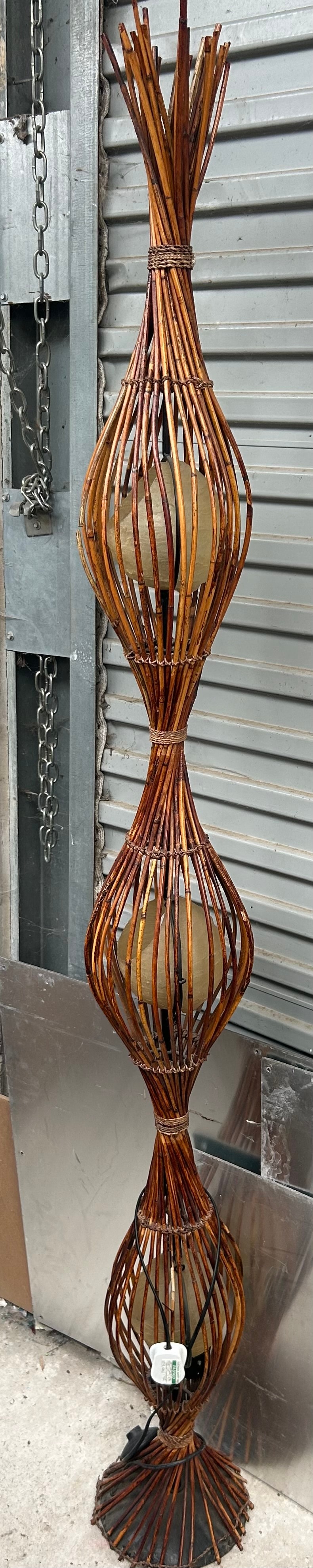 Rattan Floor Lamp. This tall, organic-style floor lamp is constructed from numerous individual dark brown and tan-colored natural branches or sticks, likely bamboo or rattan, bound together to form three vertically stacked, cage-like sections. Each section encloses a translucent, light-colored, globe-like shade, possibly frosted glass or plastic. Black electrical wiring is visible, terminating in a white three-pin plug marked “BS 1362,” “3A FUSE,” and “SGS,” indicating a British Standard plug with a 3-amp fuse and SGS certification.