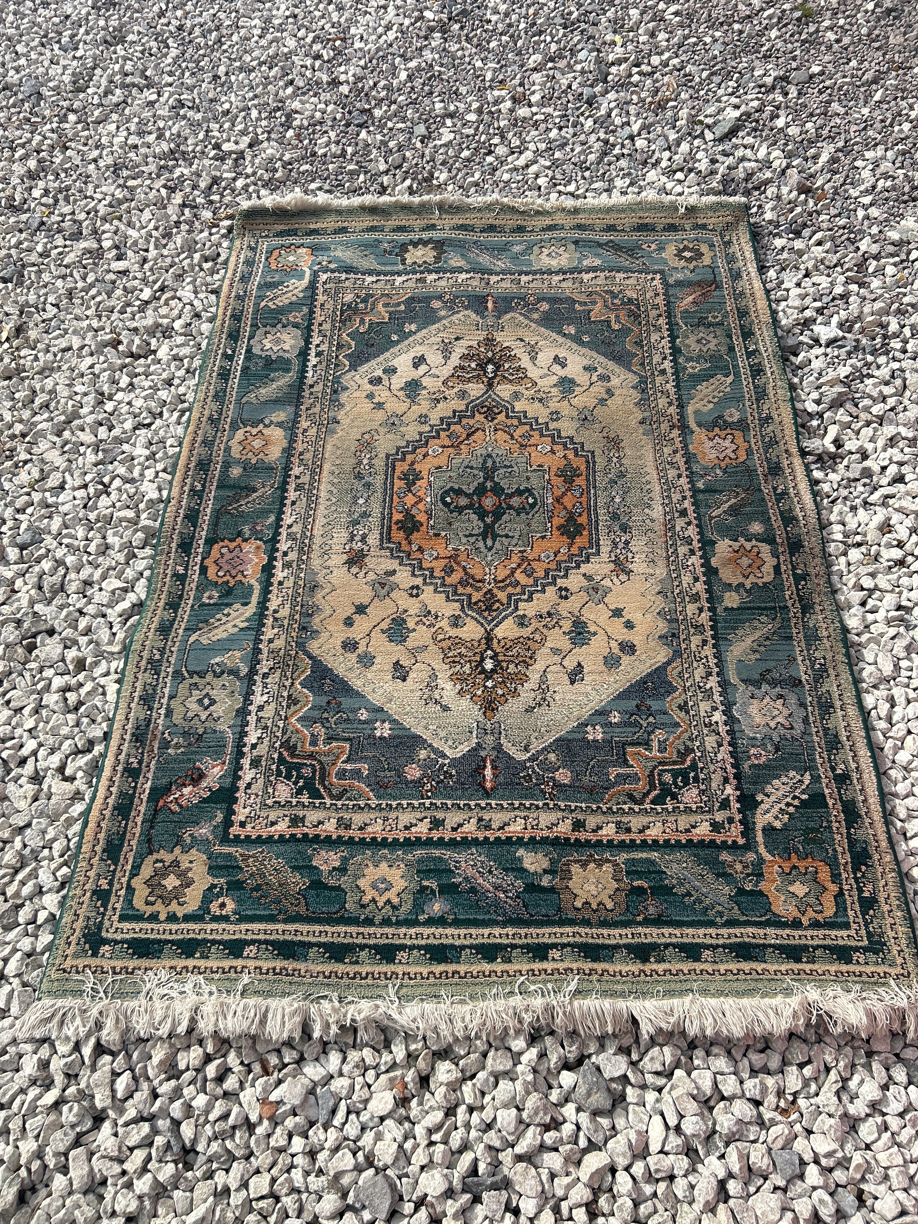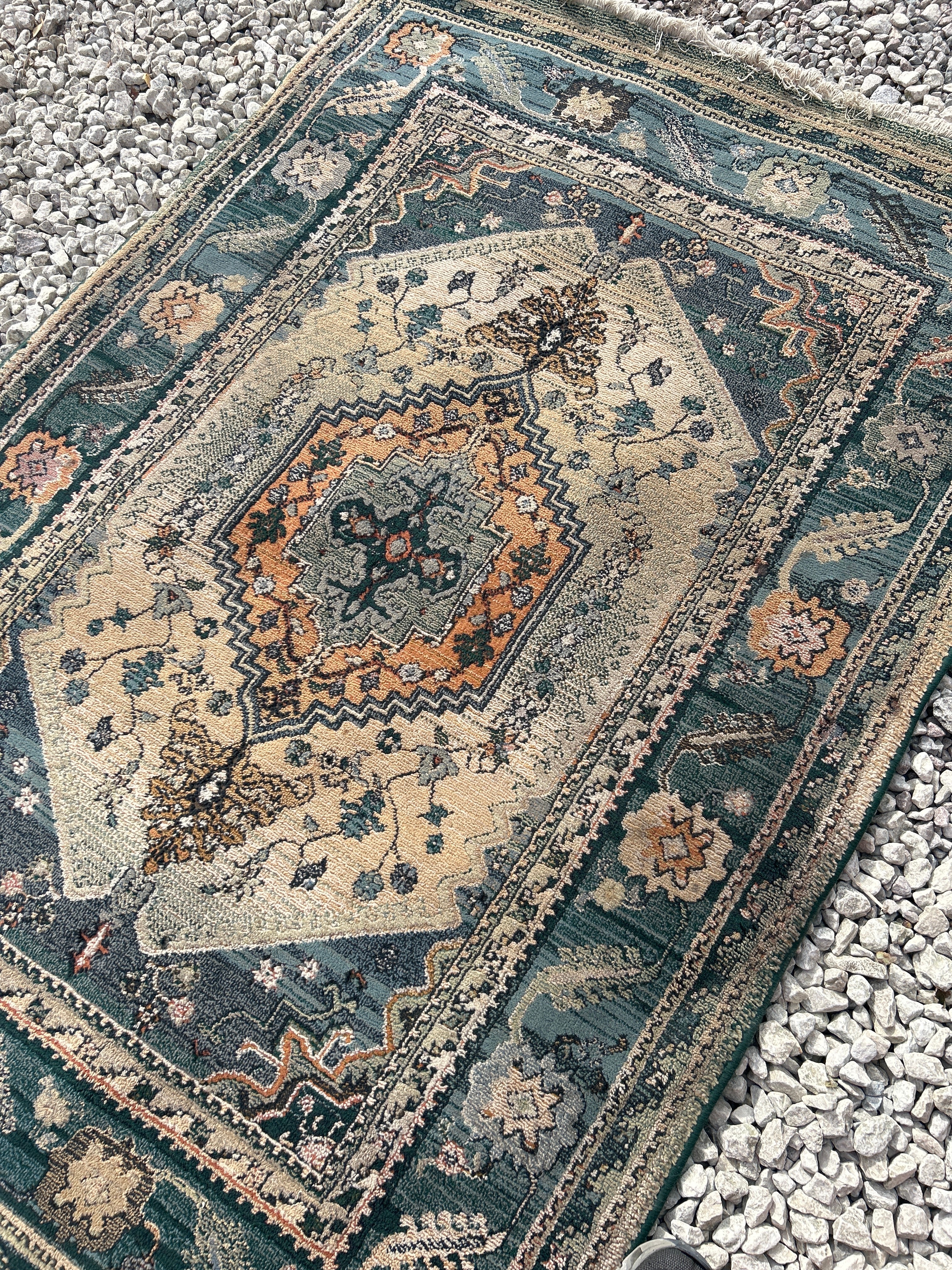 A vintage hand-knotted wool rug, exhibiting a traditional Oriental or Persian-style design. The rug features a prominent central medallion in shades of tan, cream, and orange, set within a field of similar tones. It is framed by multiple borders primarily in dark teal and forest green with floral and geometric motifs. No visible text or markings are apparent.