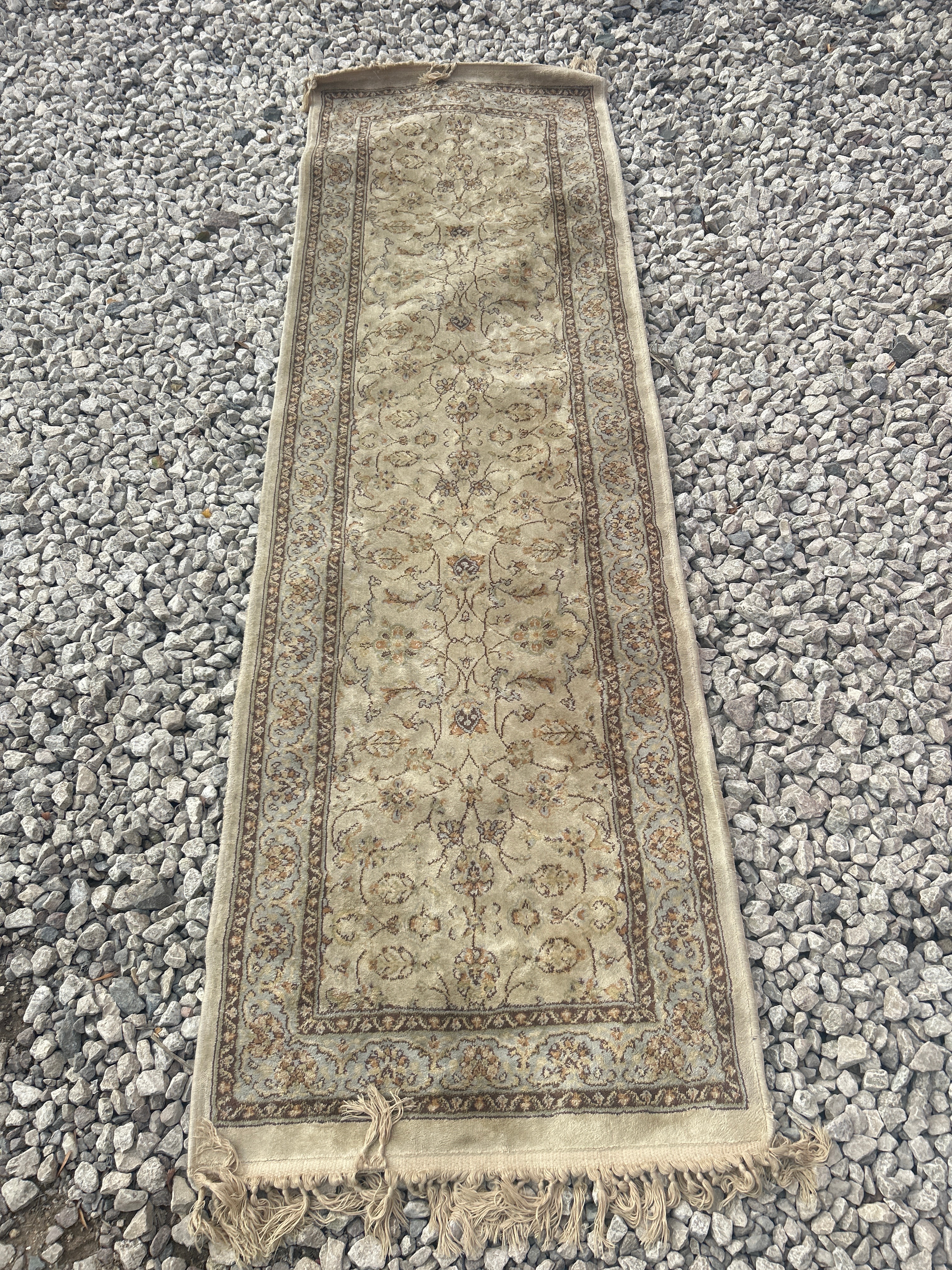 A Well Woven Asha Rome Vintage Oriental Floral hallway and stair runner. This rectangular, pile-woven textile features a central field with an all-over floral and vine design in muted tones of beige, brown, and light blue-grey. It is bordered by multiple bands with complementary floral motifs. Constructed from natural fibers, likely wool, with tasseled fringe ends. No visible text, labels, or maker’s marks are present.