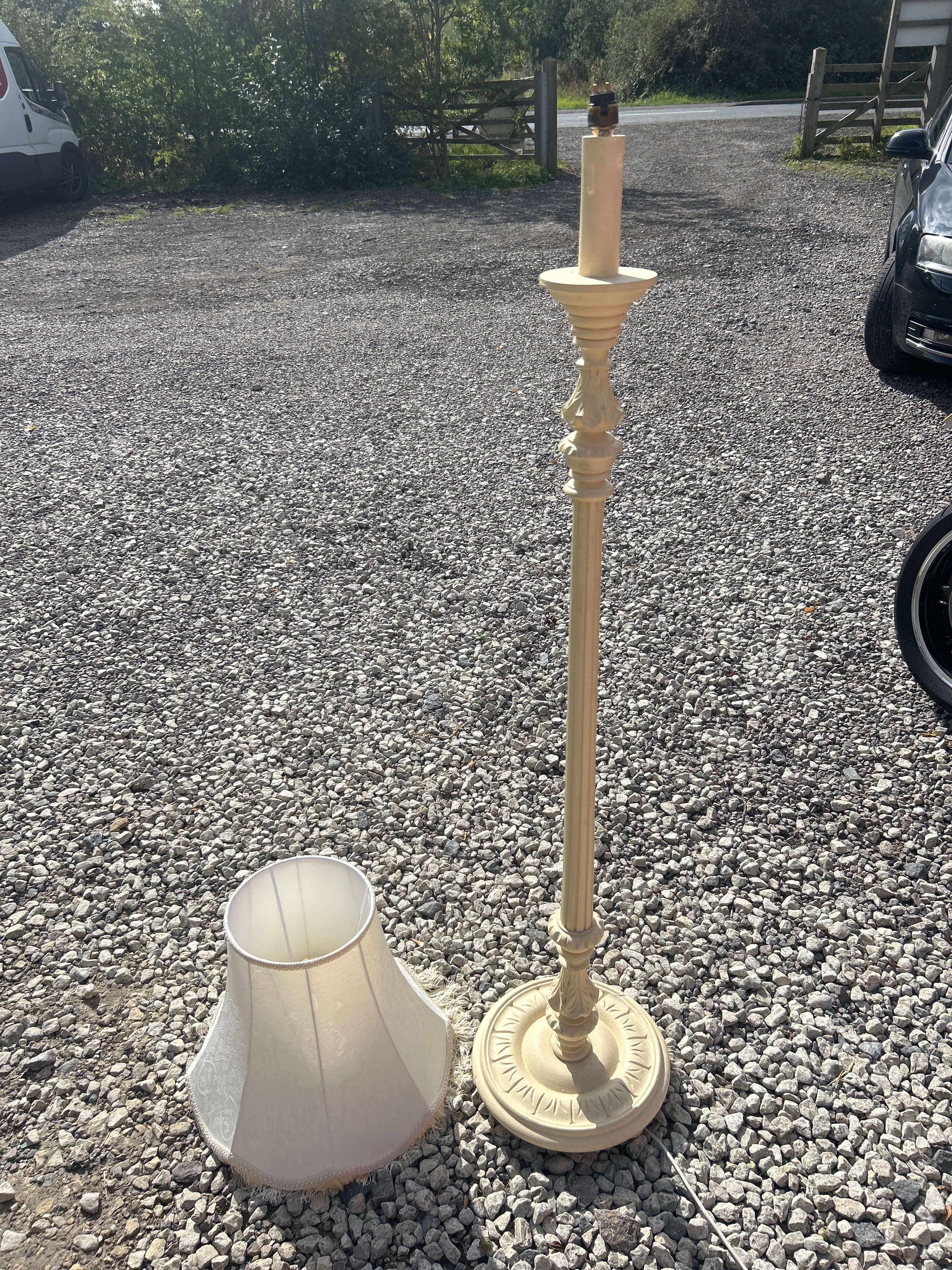 A traditional-style cast iron floor lamp, presenting in a cream/pale yellow painted finish. The standard features a fluted column, turned sections, and a circular, molded base with classical-inspired decorative motifs. It is accompanied by a separate, bell-shaped fabric lampshade with a visible fringe.