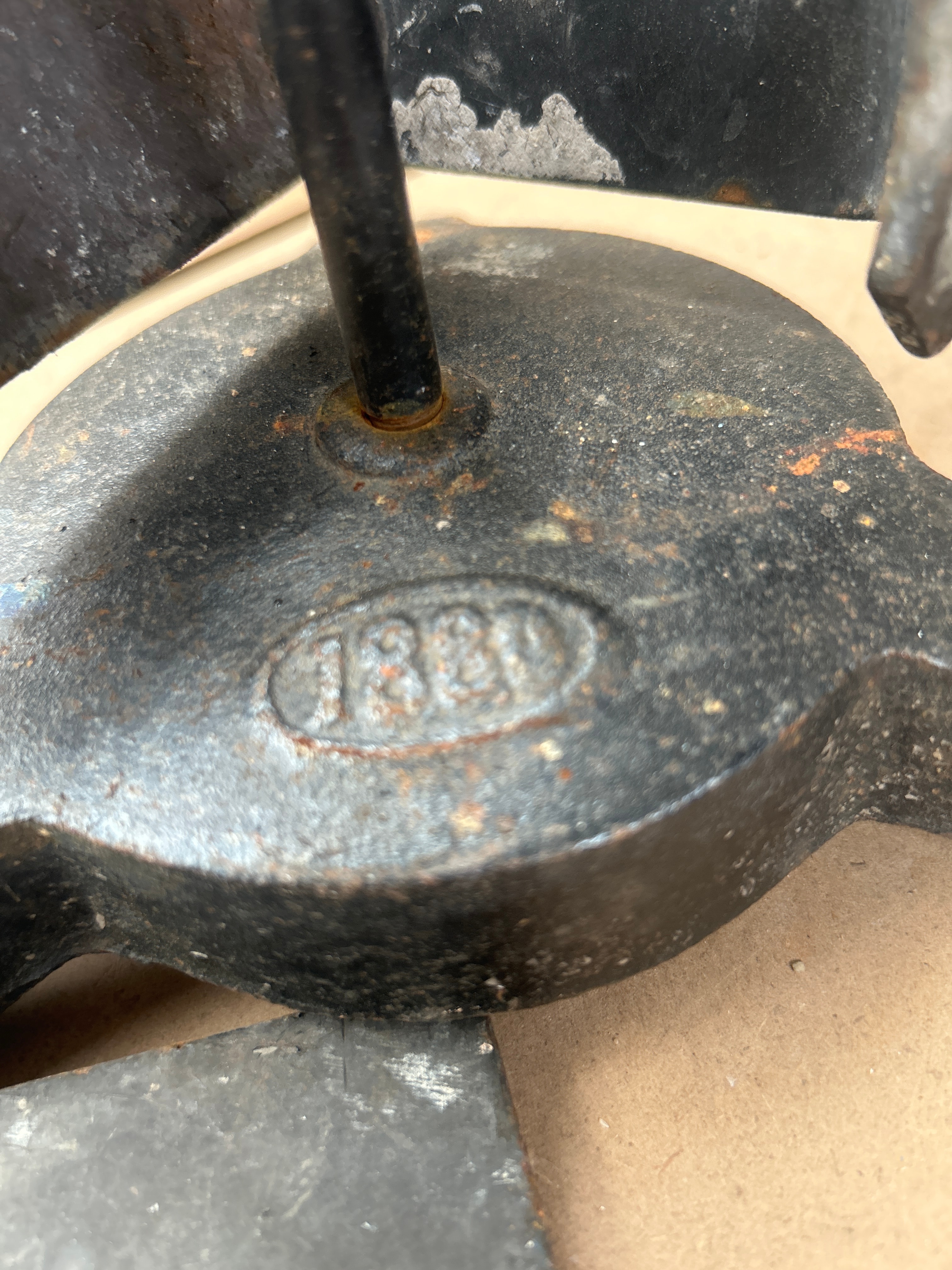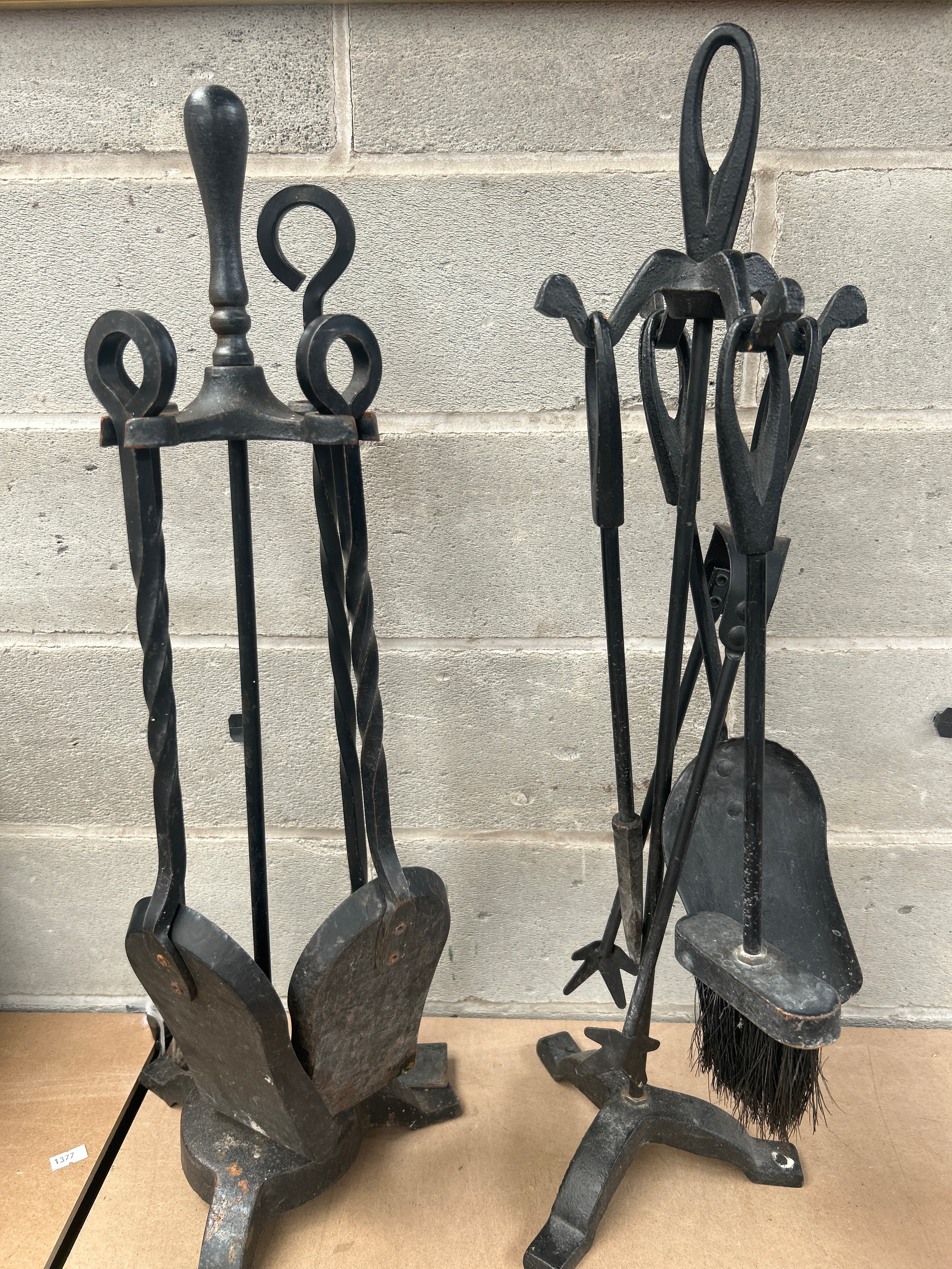 Comprising two distinct traditional-style fireplace tool sets, each crafted from dark, cast iron with a well-worn, blackened finish. Both sets include a stand, poker, tongs, and shovel. The right-hand set additionally features a brush. One stand is prominently inscribed ‘1830’ within an oval.
