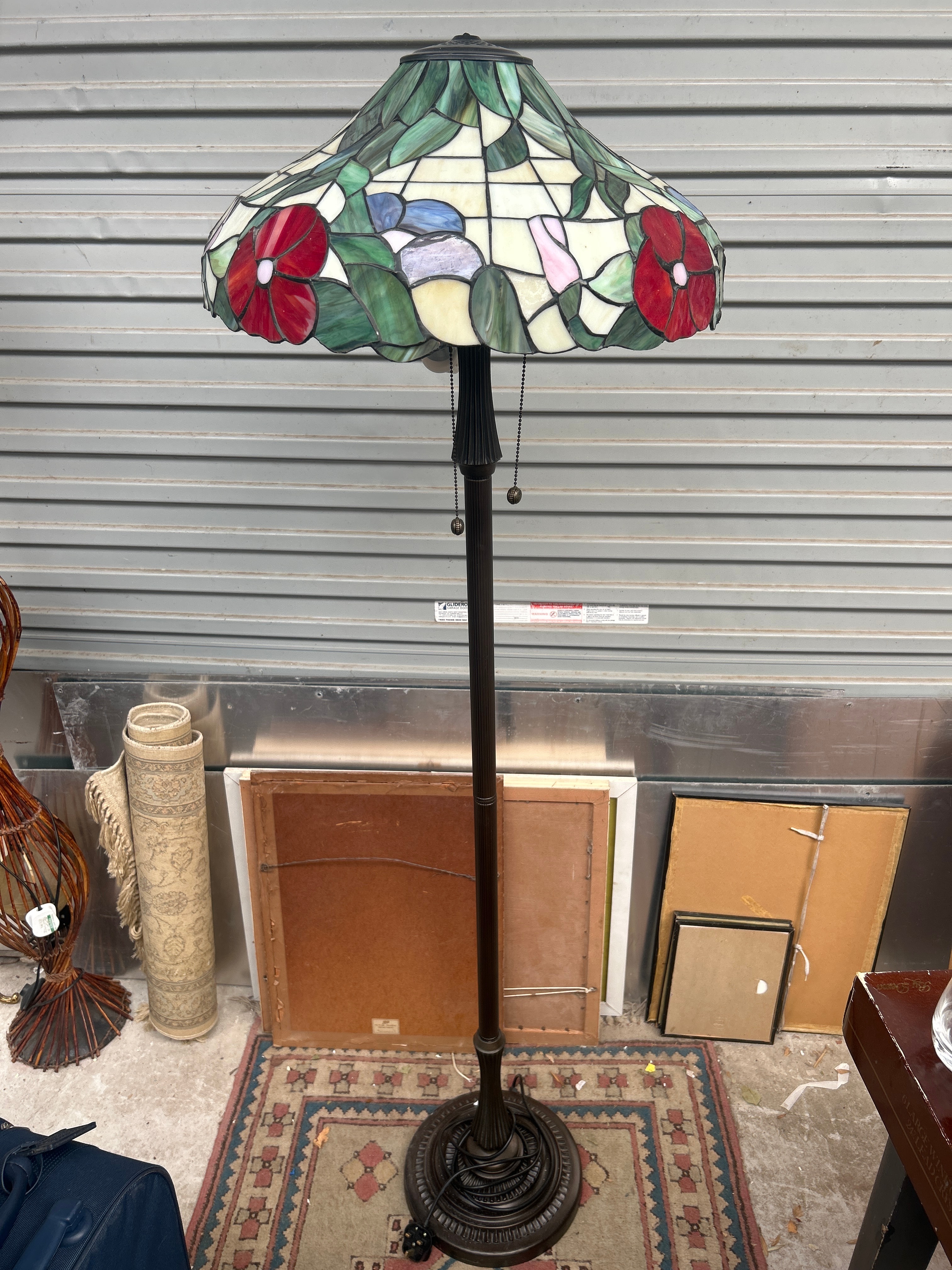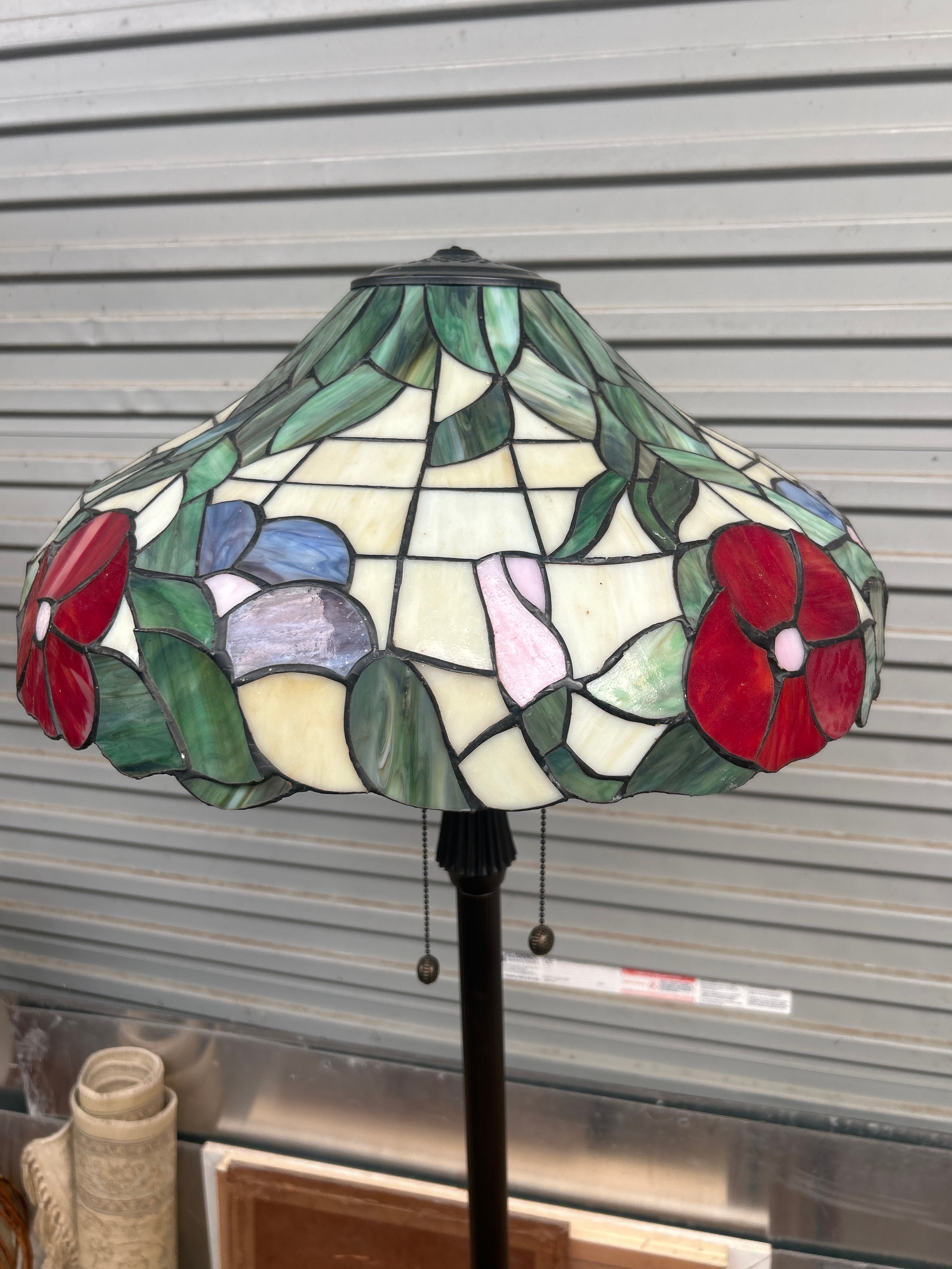 A Tiffany-Style Floor Lamp with ‘Hollyhock’ Stained Glass Shade. This vintage or reproduction Art Nouveau-style floor lamp features a domed, multi-panel stained glass shade. The shade’s design incorporates a vibrant floral motif with prominent red blossoms and green foliage, set against a background of cream, blue, and pink glass pieces, all joined by dark leading. The lamp stands on a dark-toned metal shaft, which appears to be fluted, leading down to a decorative circular cast metal base. Two pull chains for operation are visible beneath the shade. No discernible manufacturer’s marks or inscriptions are visible on the lamp itself.