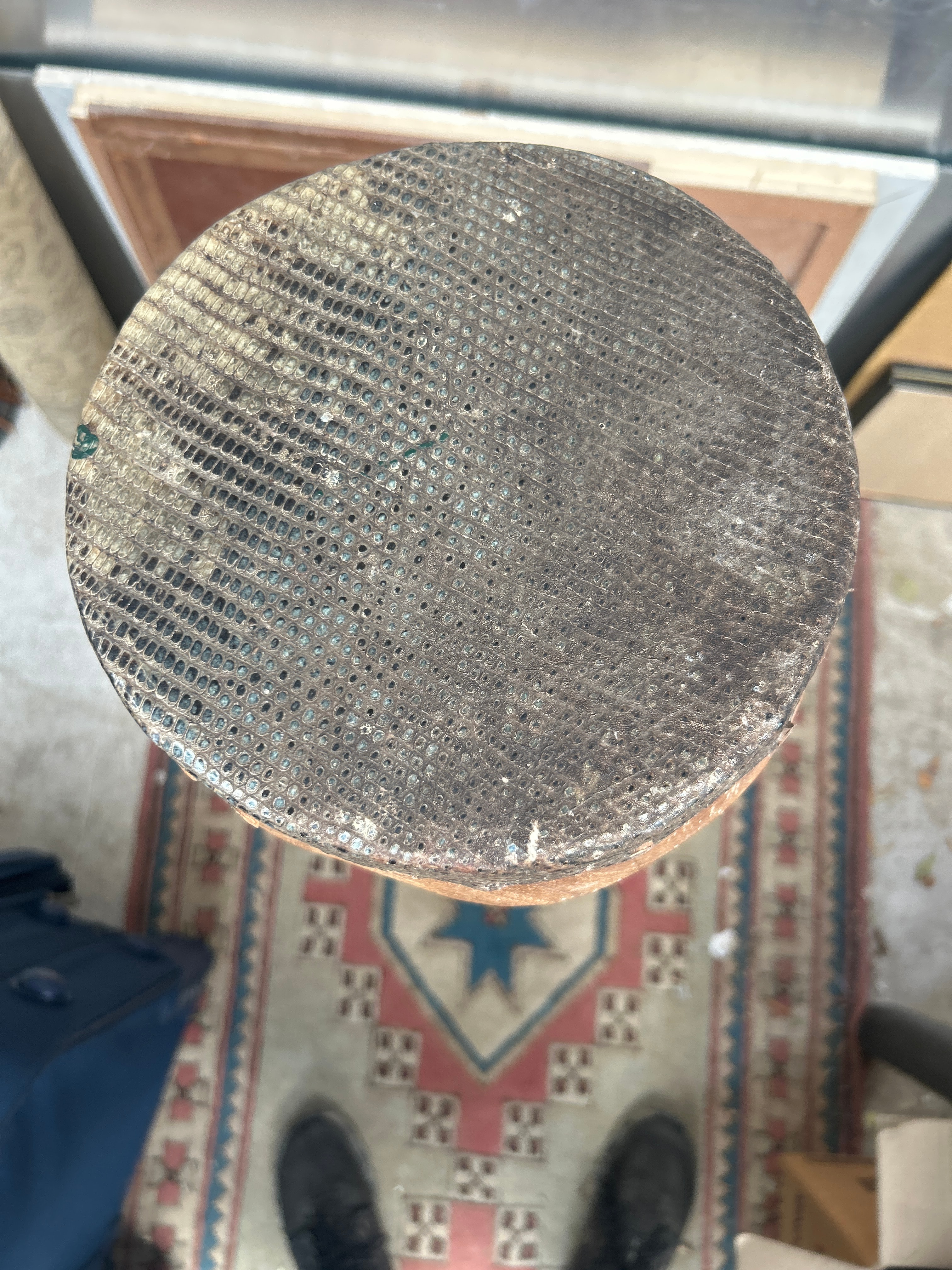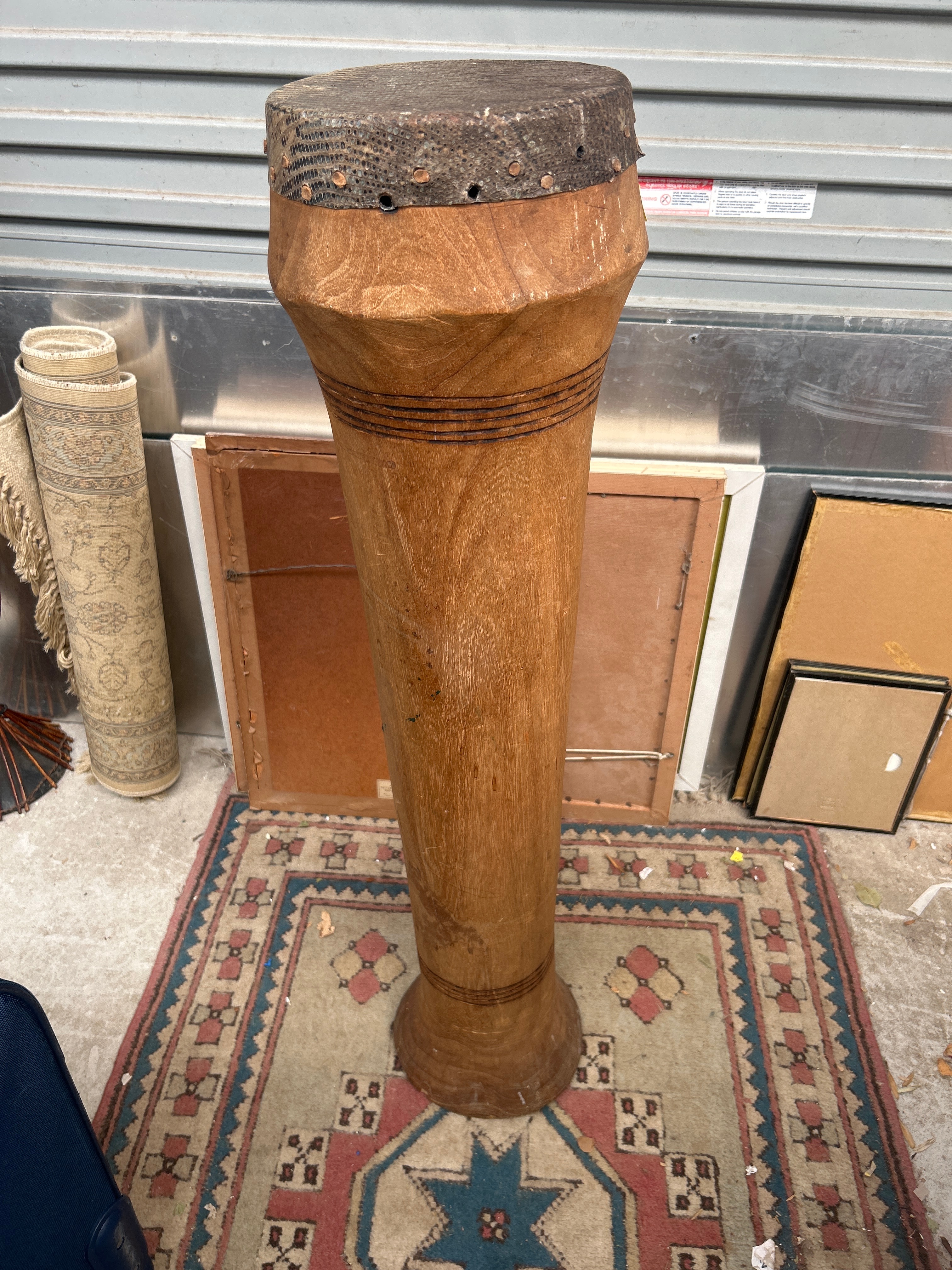 A traditional-style goblet drum, crafted primarily from wood. Its body features a multi-faceted upper section that tapers down to a cylindrical shaft, which then flares out to a stable, footed base. The drumhead, composed of a dark, textured material, likely animal hide, is secured to the wooden rim with numerous small metal tacks. The wooden body exhibits horizontal incised rings around its upper-middle section. The wood shows an aged patina with visible grain.